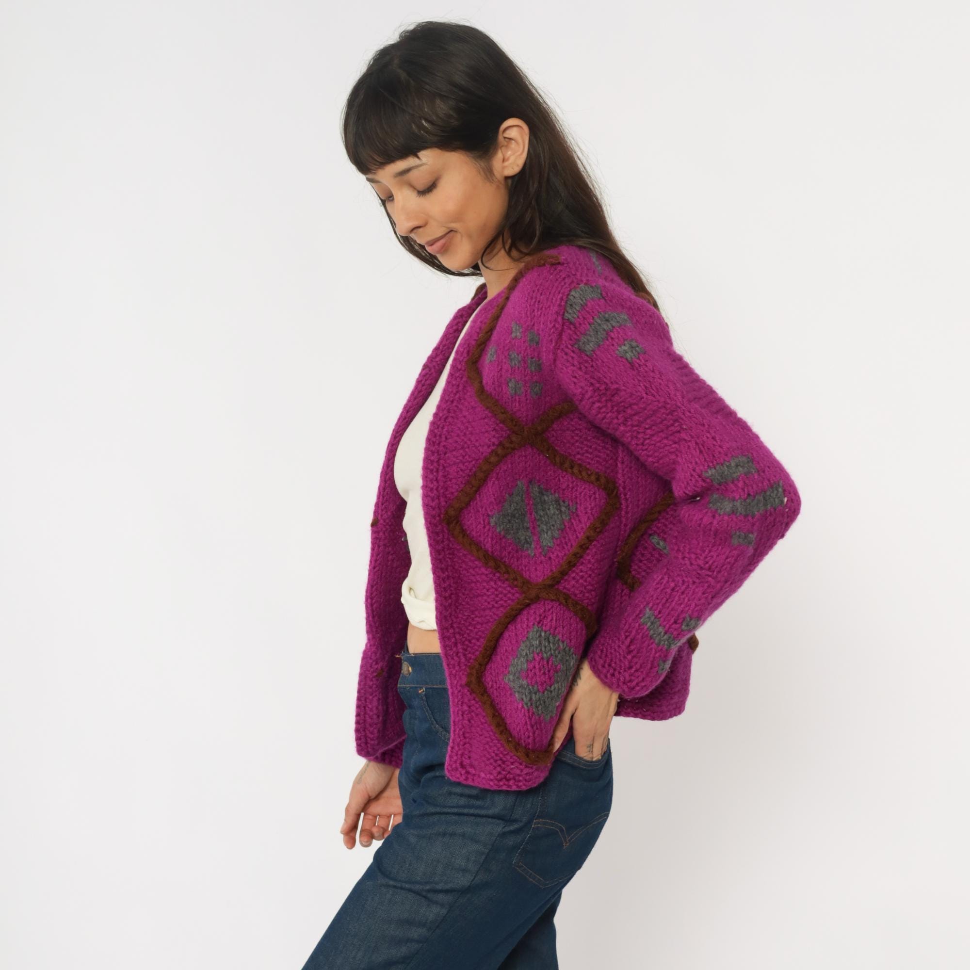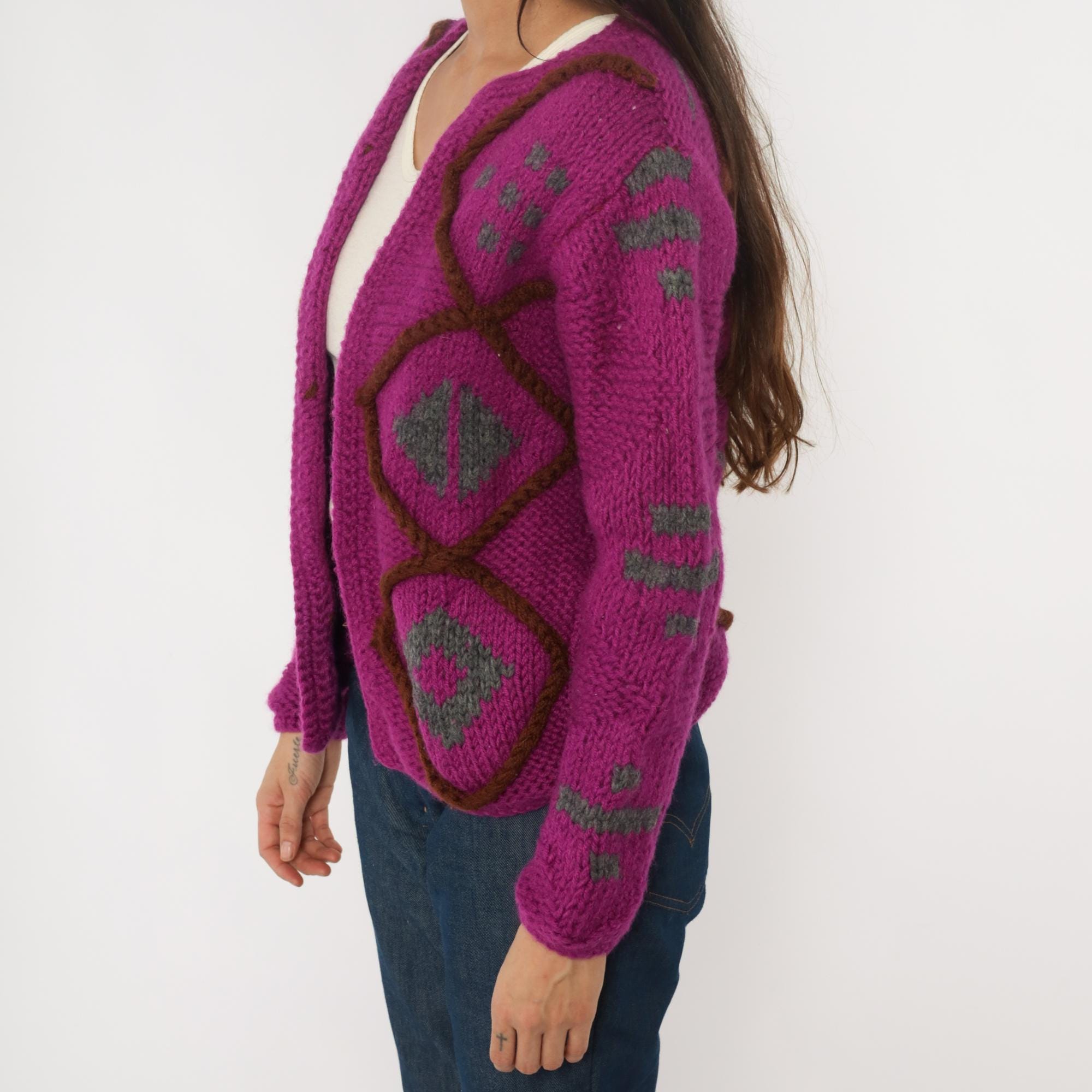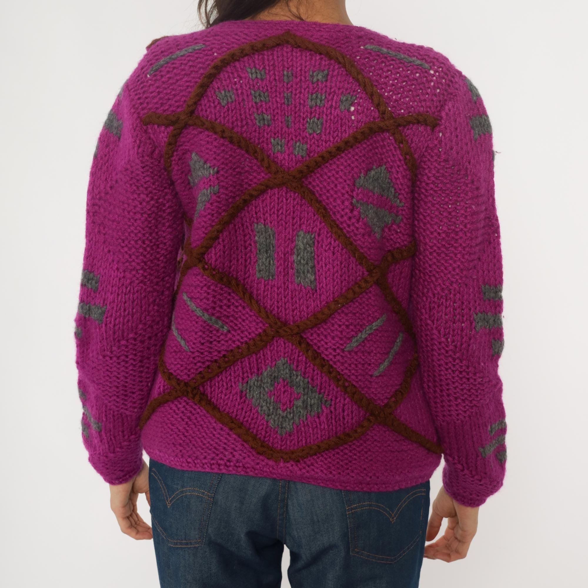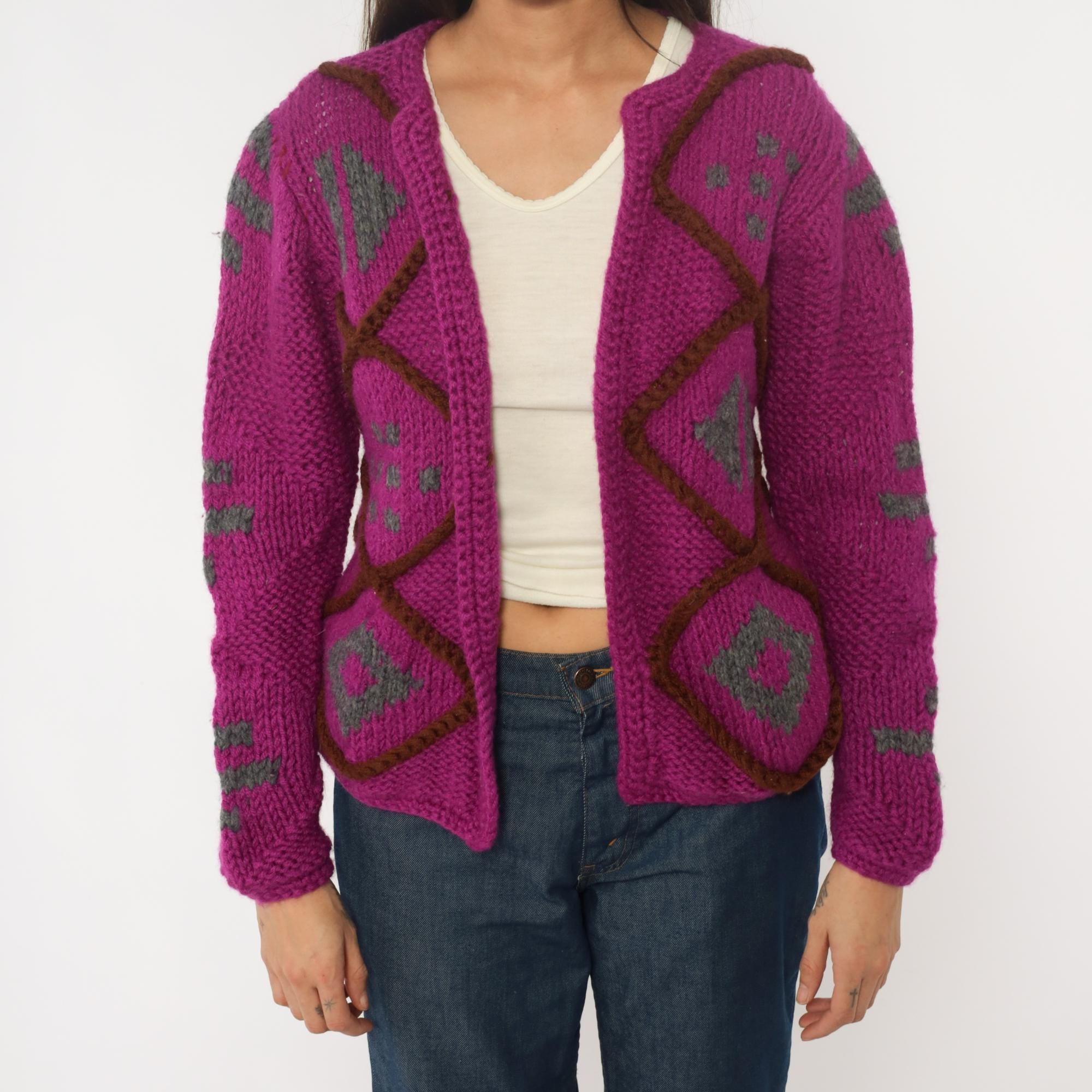 90s magenta cardigan sweater with geometric diamond lattice design in brown and gray. Open front with no closure, chunky hand-knit texture throughout. Long sleeves with matching diamond pattern on sleeves and back.