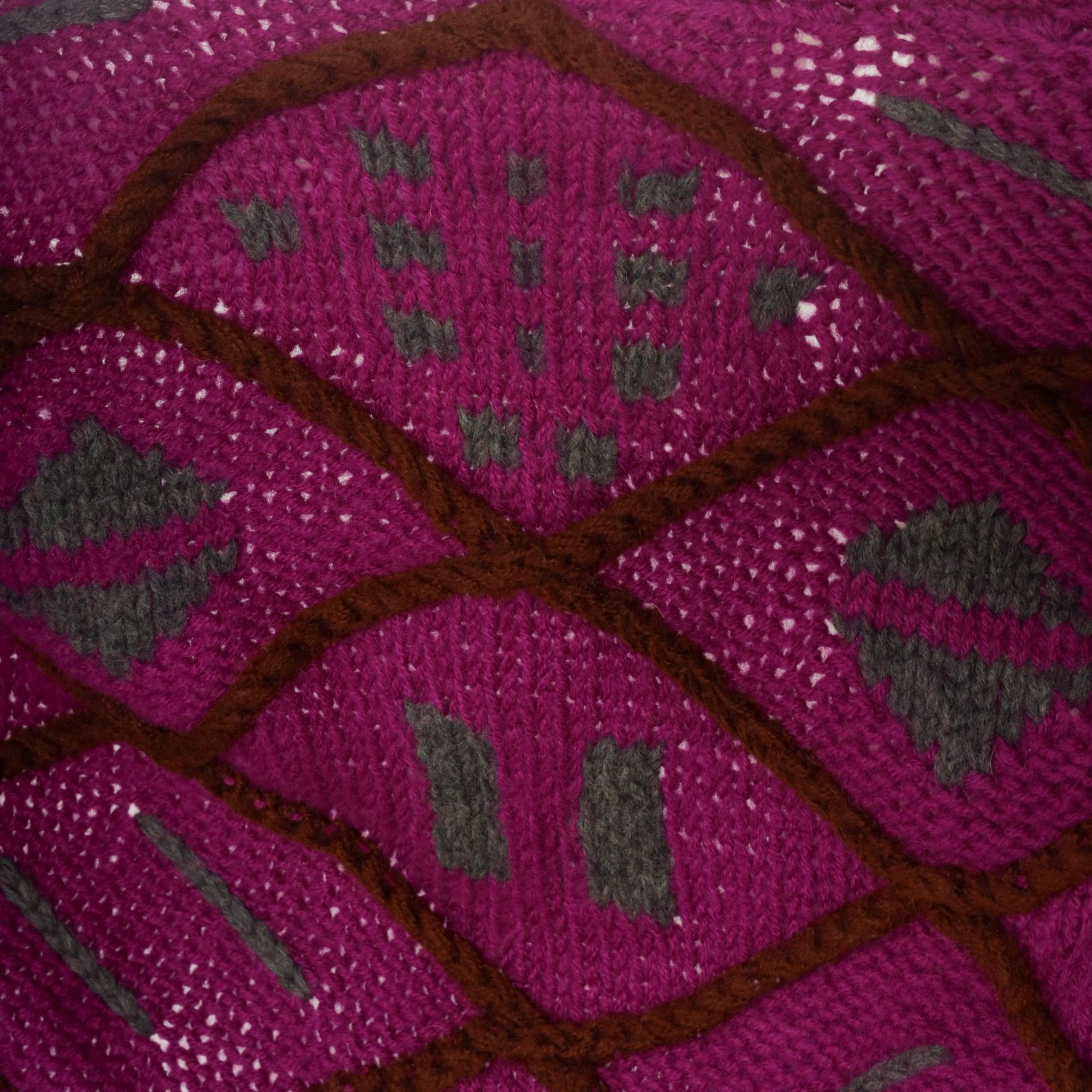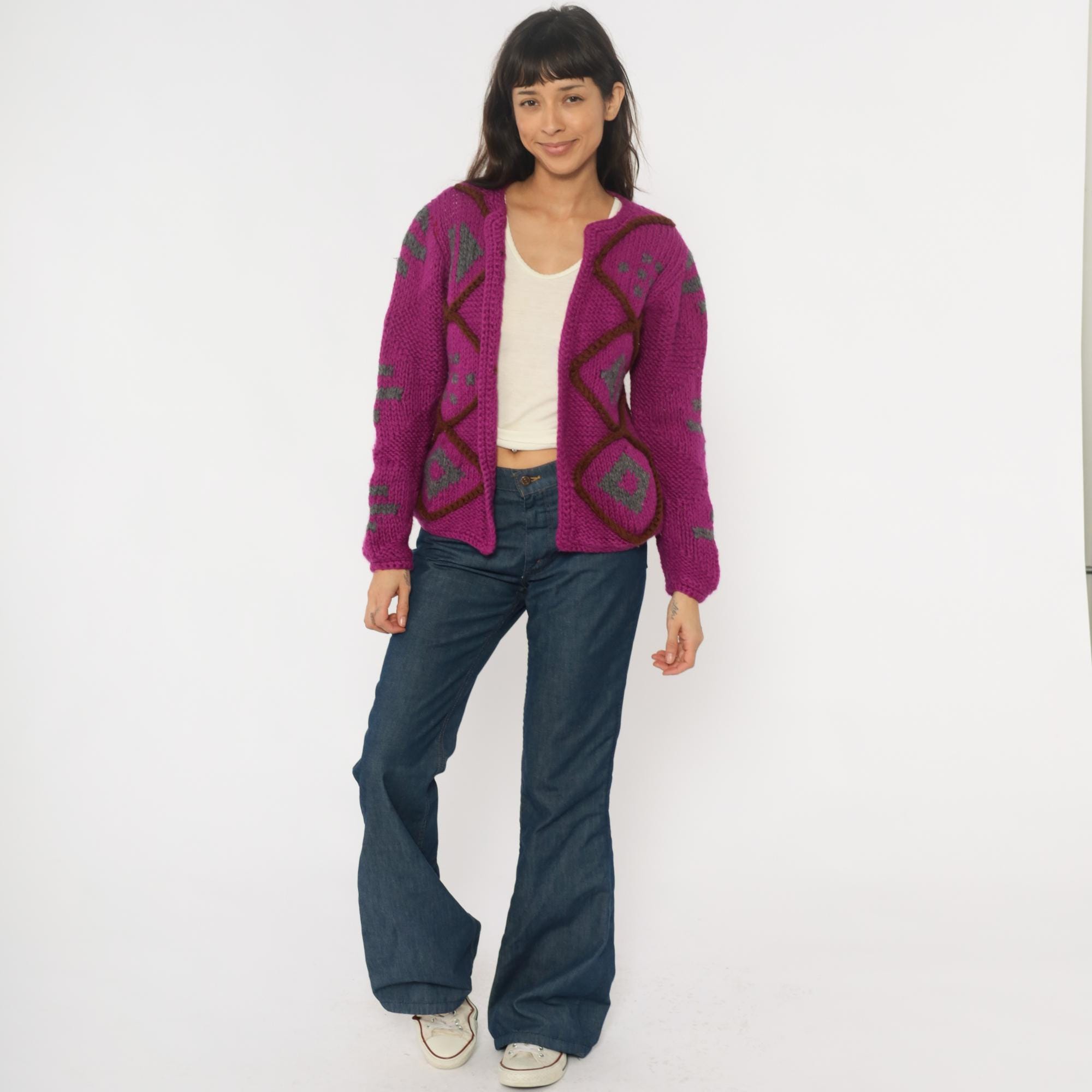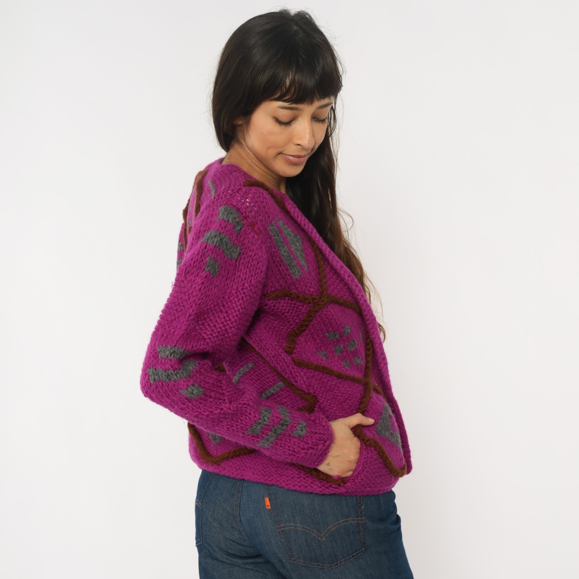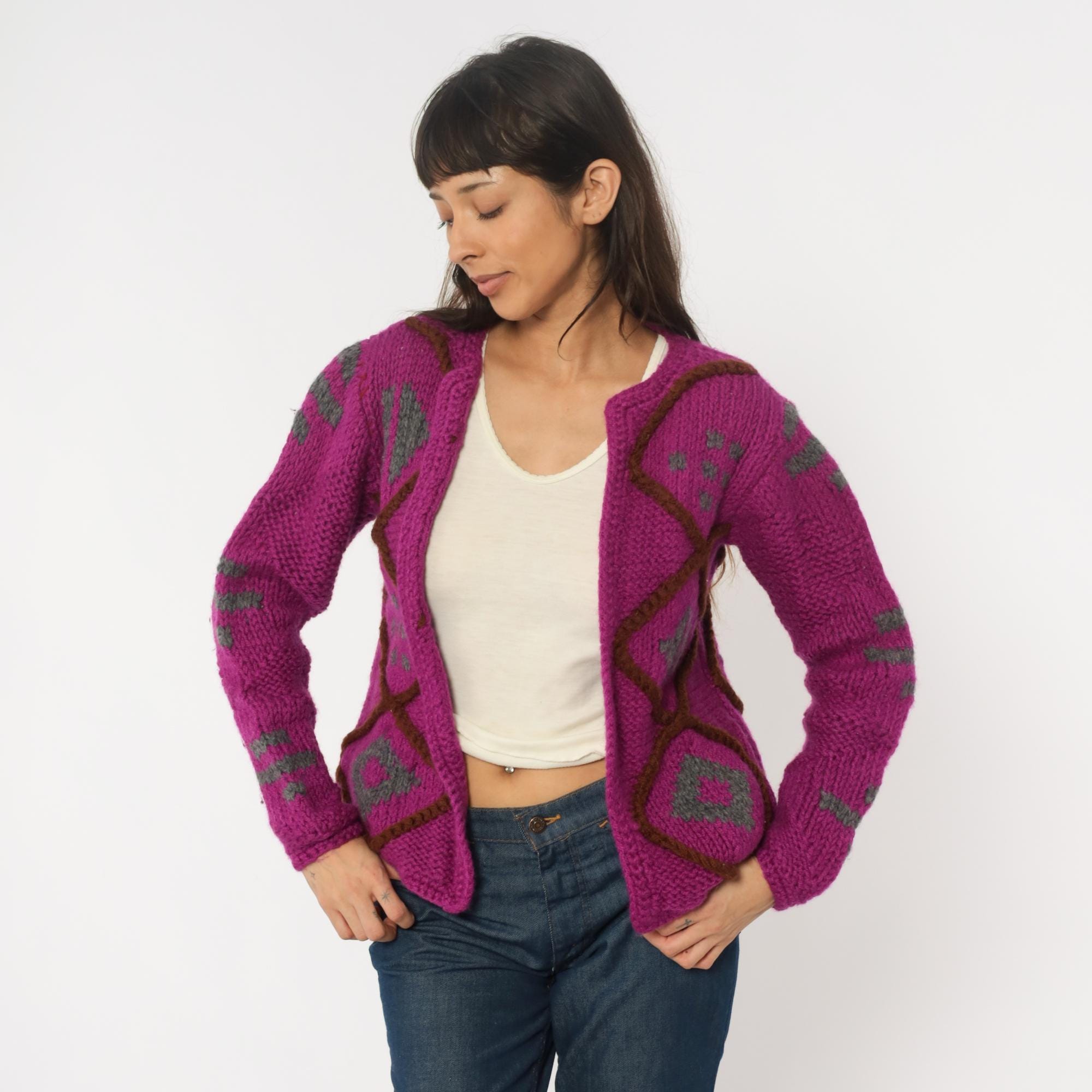 90s magenta cardigan sweater with geometric diamond lattice design in brown and gray. Open front with no closure, chunky hand-knit texture throughout. Long sleeves with matching diamond pattern on sleeves and back.