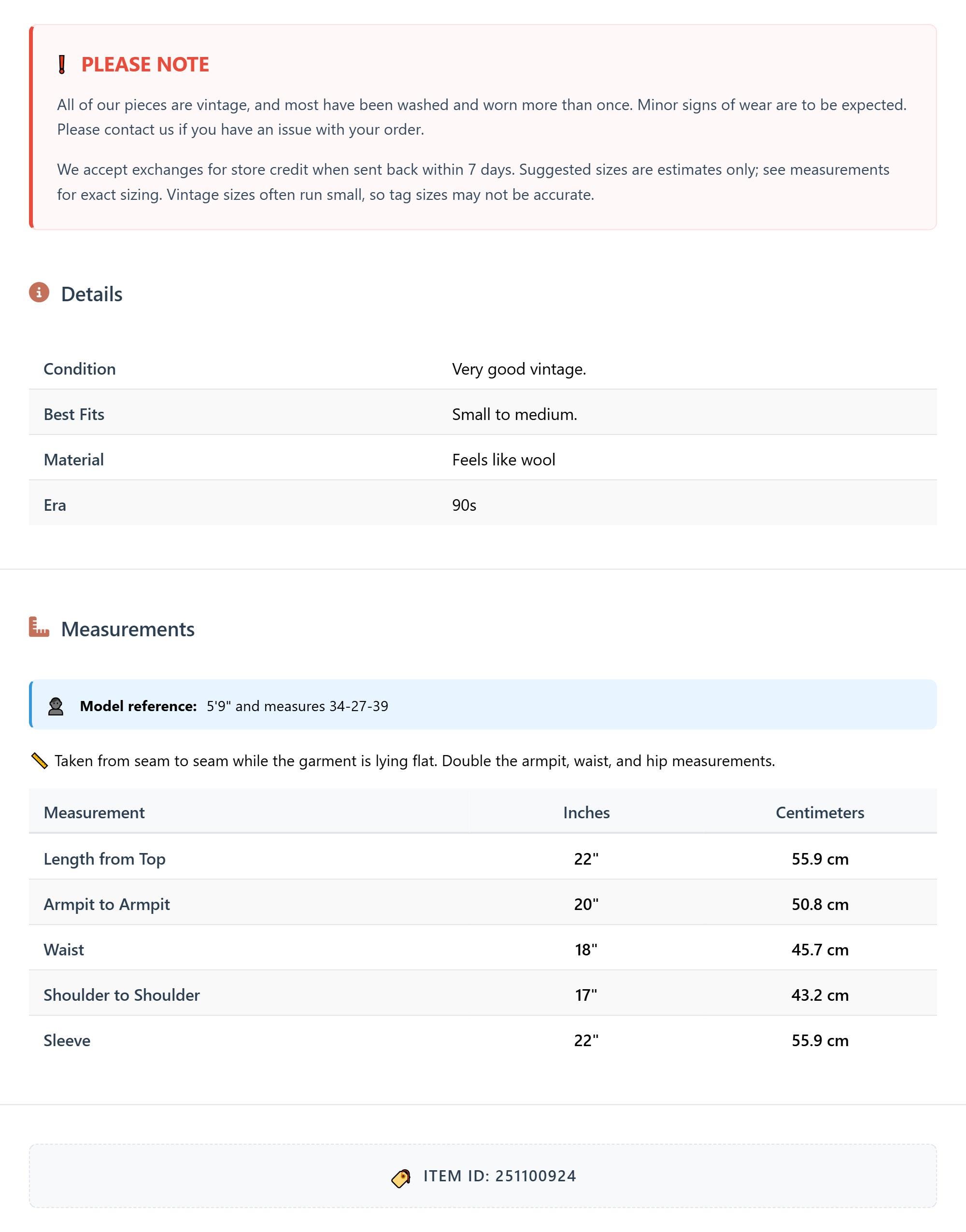 All of our pieces are vintage, and most have been washed and worn more than once. Minor signs of wear are to be expected. Please contact us if you have an issue with your order. We accept exchanges for store credit when sent back within 7 days.