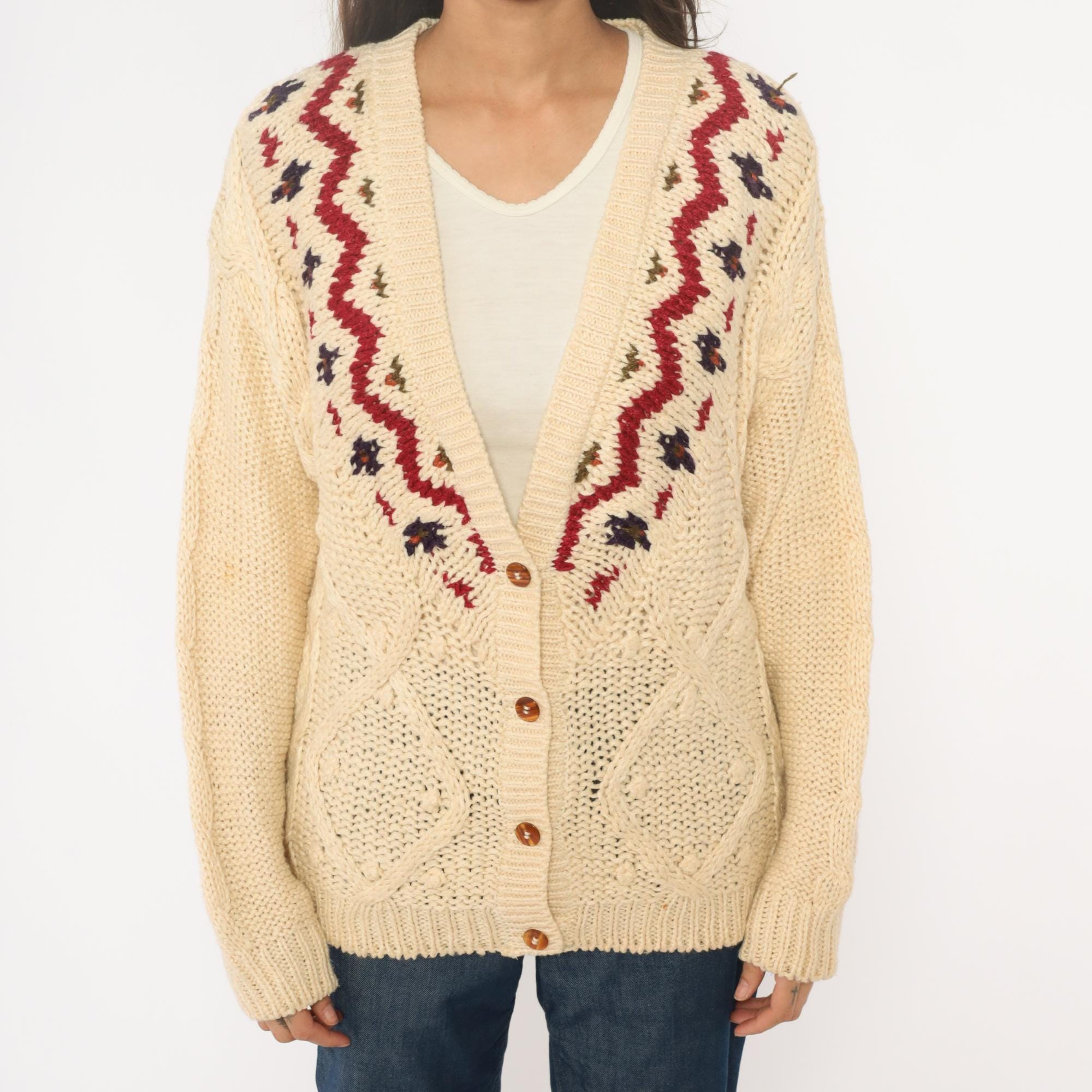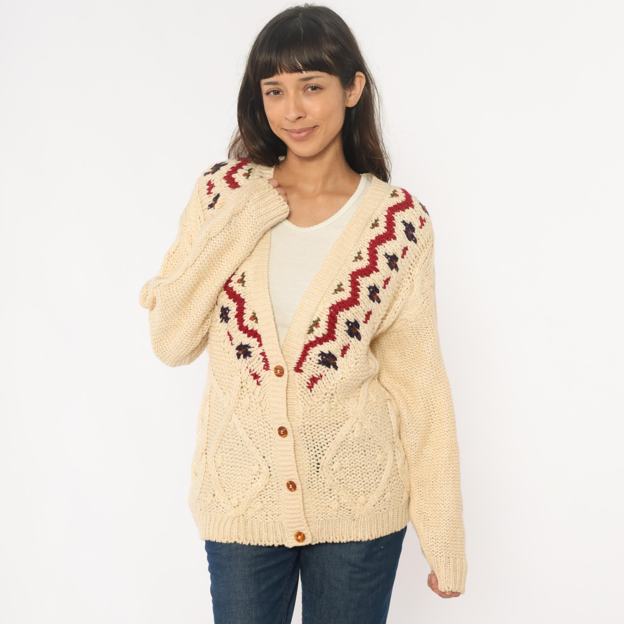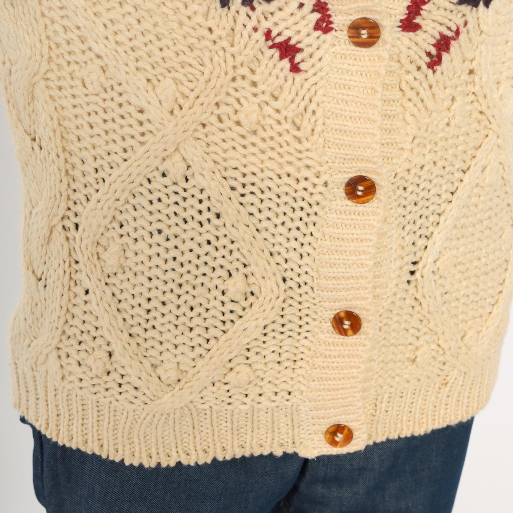 90s cream cardigan with Fair Isle zigzag pattern in red, navy, and brown across the neckline and shoulders. Button front closure with brown buttons, cable knit panels on bodice, long sleeves with ribbed cuffs and hem.
