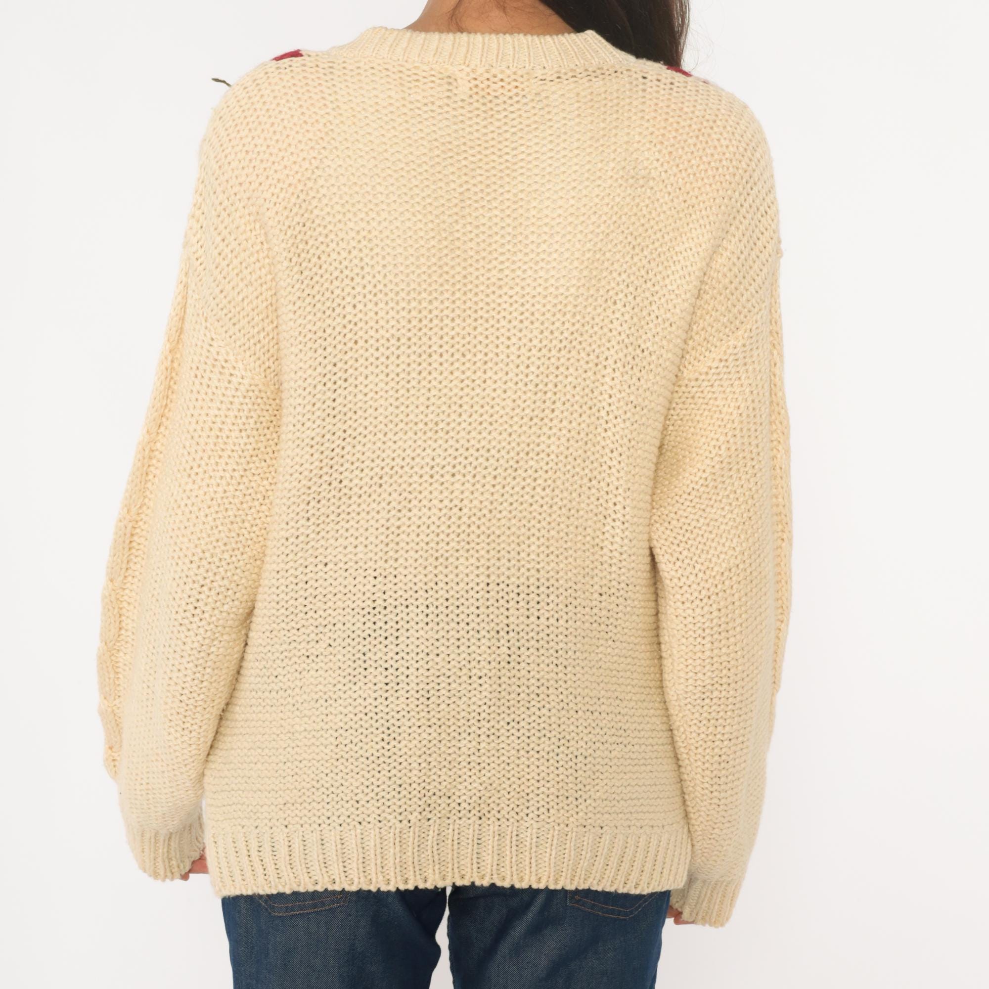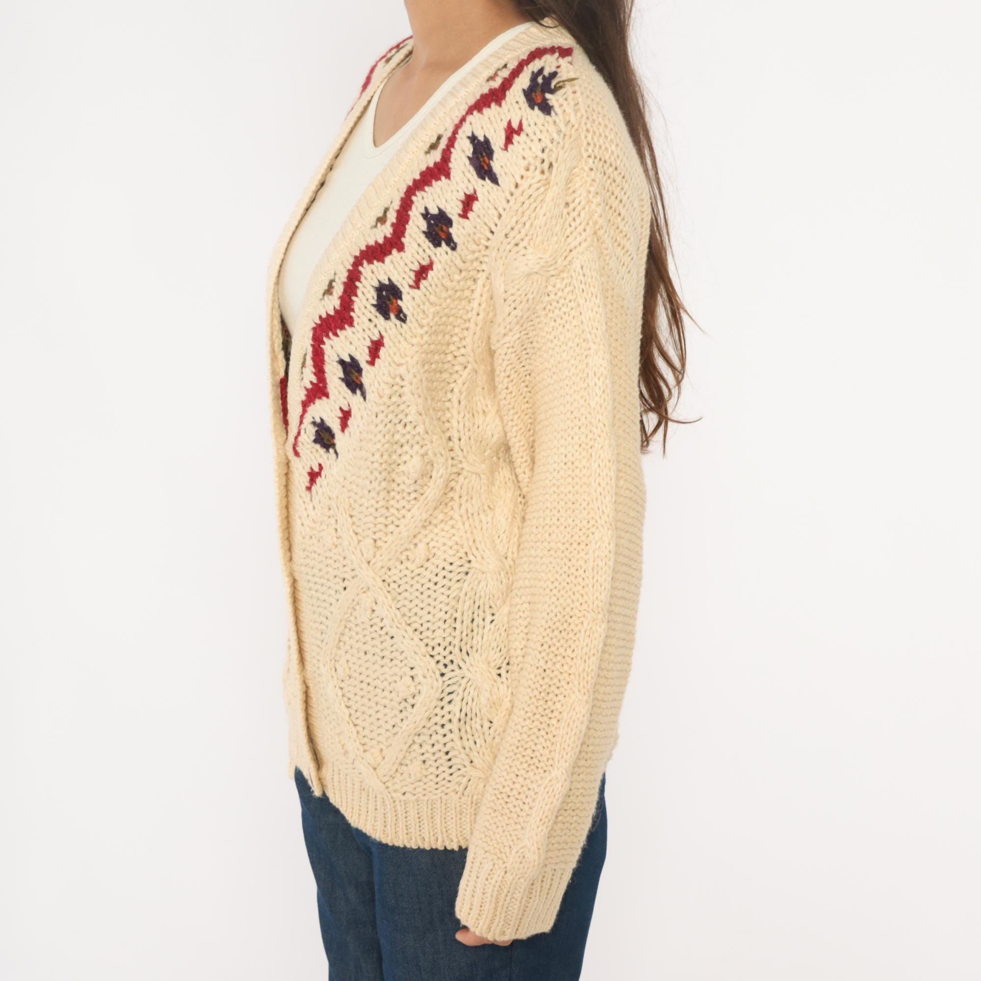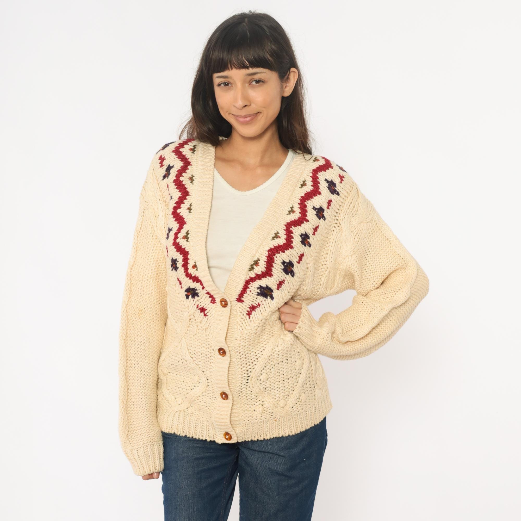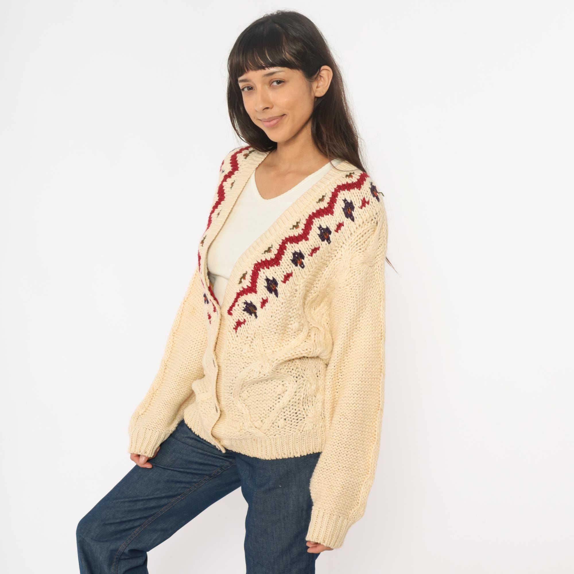 90s cream cardigan with Fair Isle zigzag pattern in red, navy, and brown across the neckline and shoulders. Button front closure with brown buttons, cable knit panels on bodice, long sleeves with ribbed cuffs and hem.