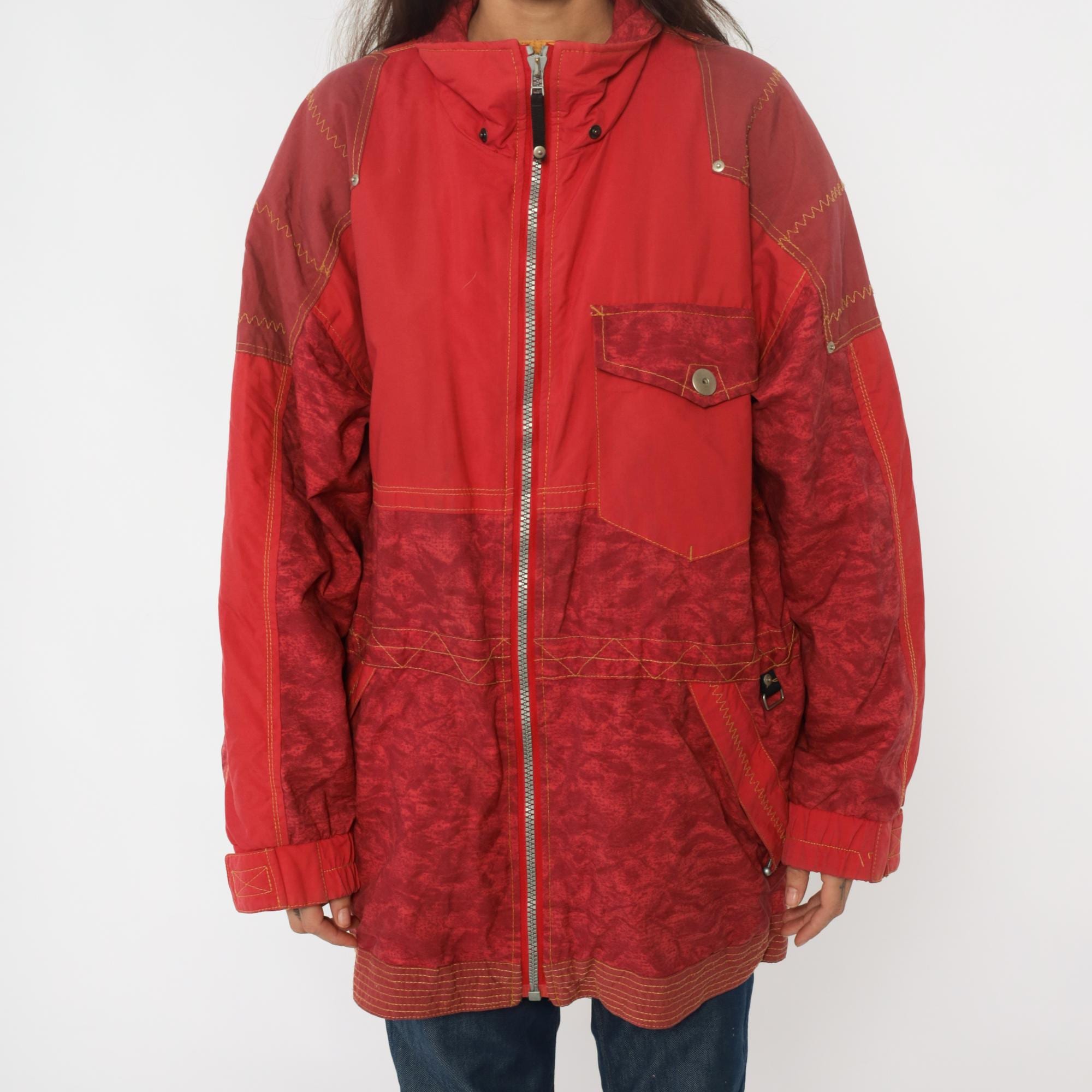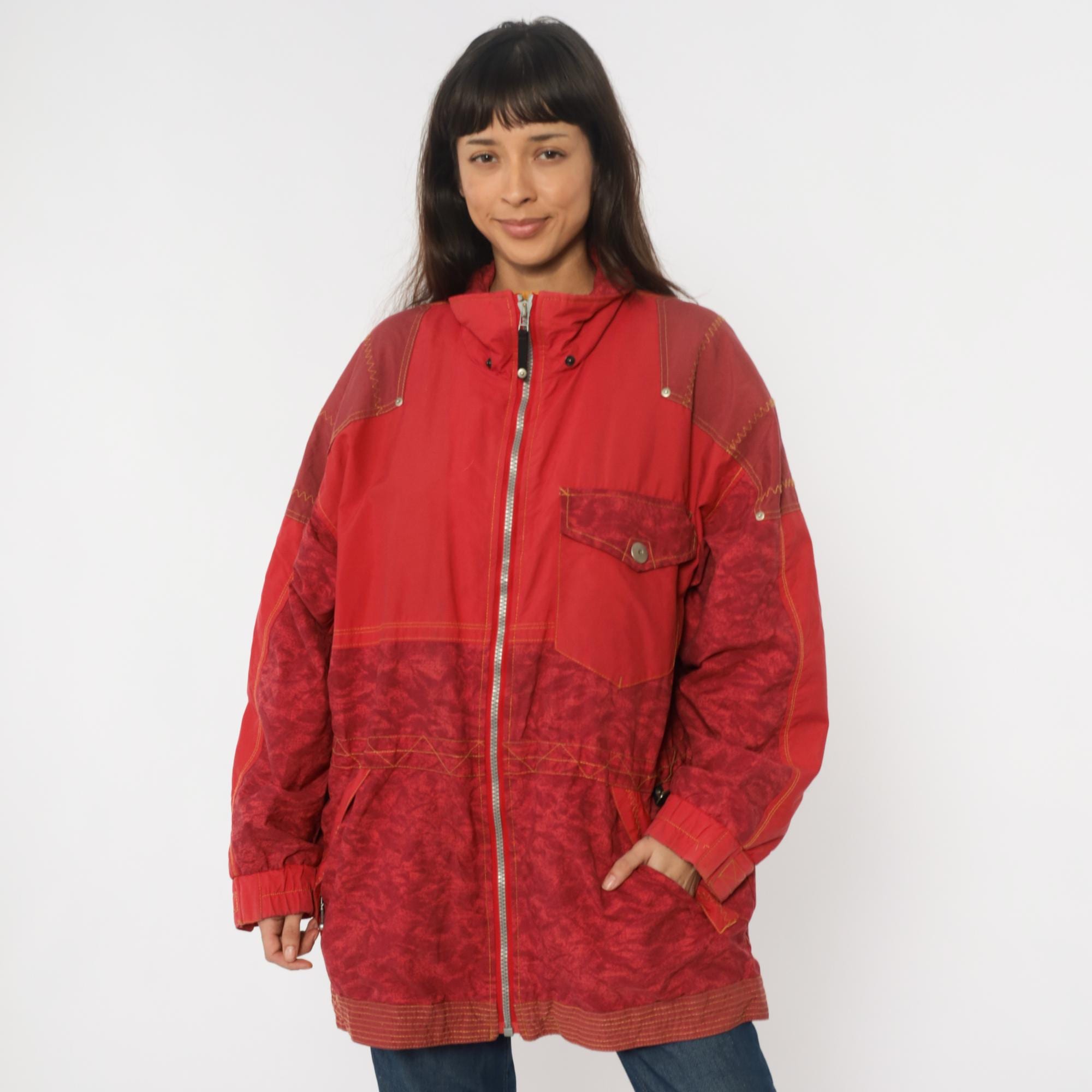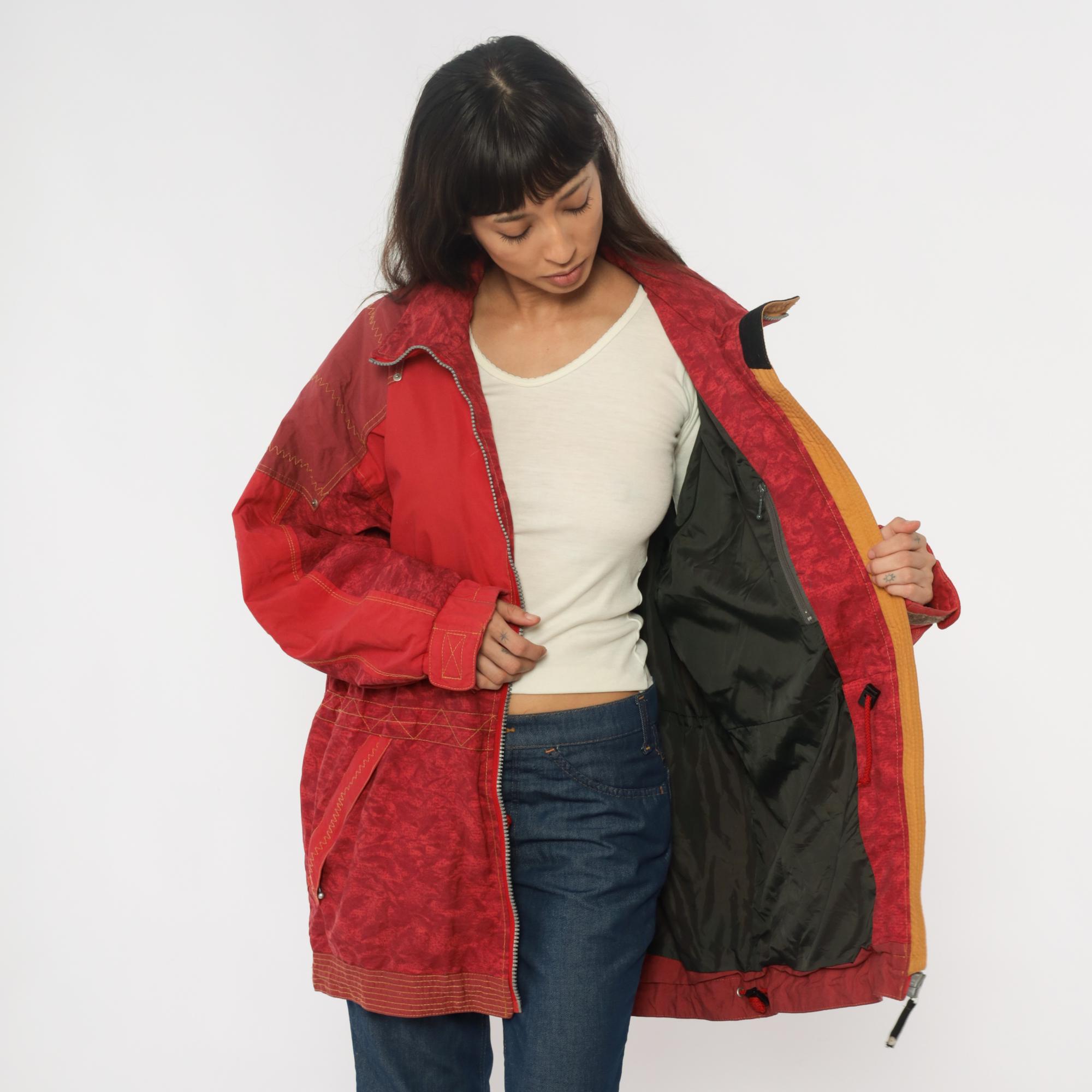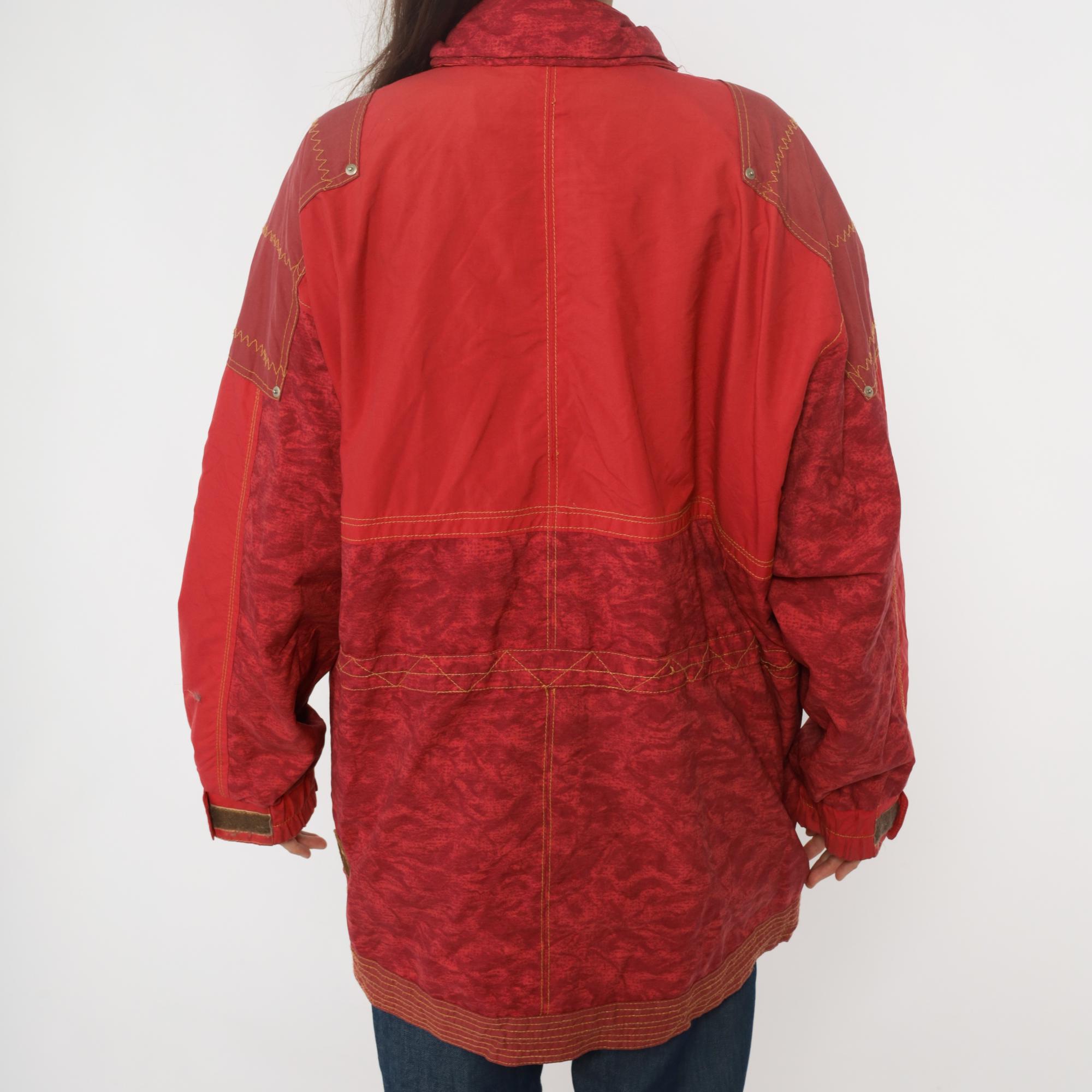 80s red nylon jacket from obermeyer with two-tone colorblocking, mixing solid coral-red panels with darker mottled red textured fabric. Decorative zig-zag contrast stitching in mustard thread throughout the body, sleeves, and hem. Zip front closure, snap collar, chest pocket with snap closure, and lower pockets with button closures.