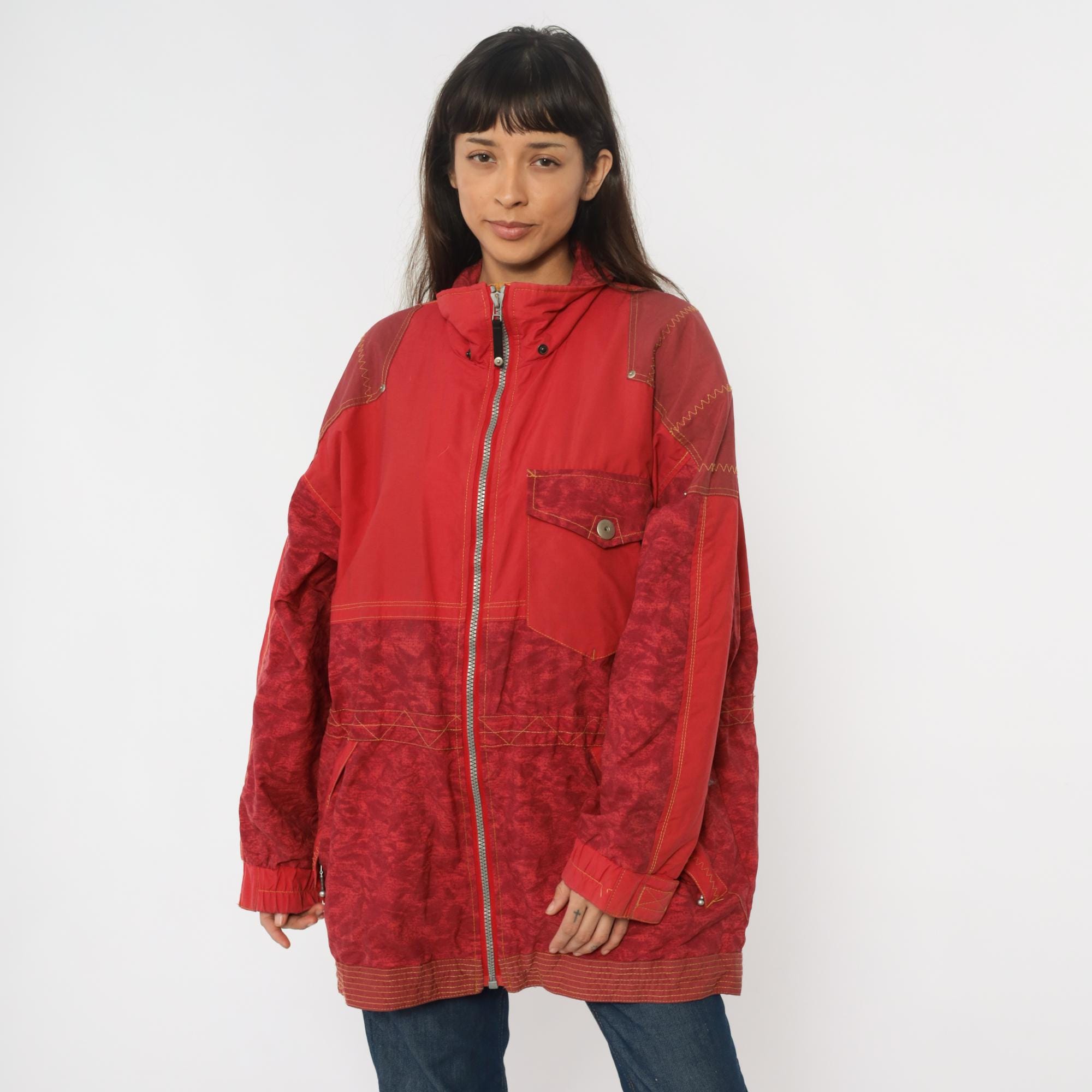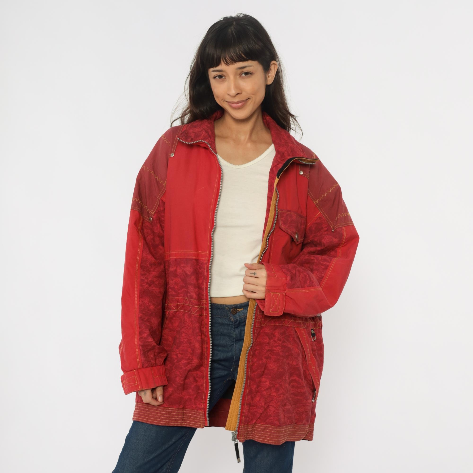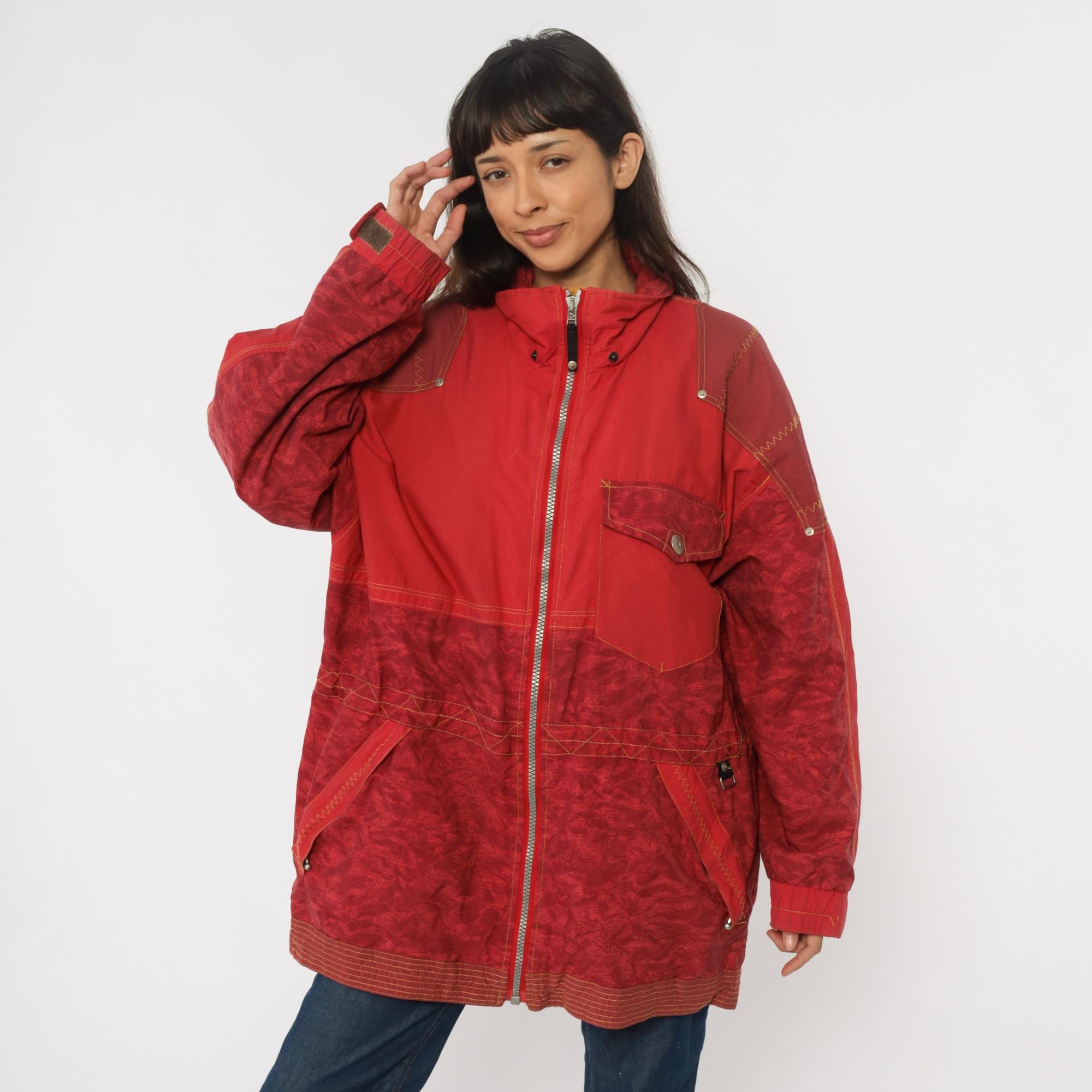 80s red nylon jacket from obermeyer with two-tone colorblocking, mixing solid coral-red panels with darker mottled red textured fabric. Decorative zig-zag contrast stitching in mustard thread throughout the body, sleeves, and hem. Zip front closure, snap collar, chest pocket with snap closure, and lower pockets with button closures.