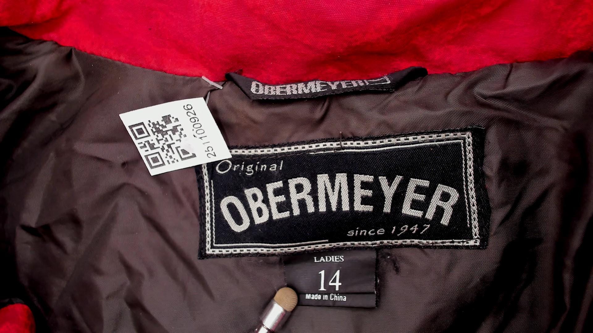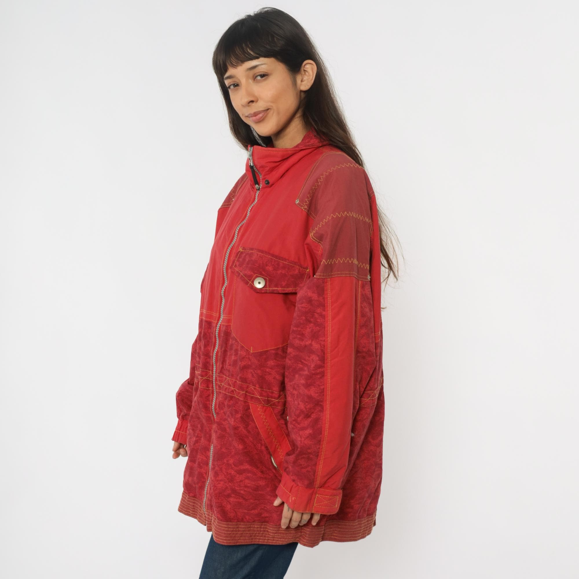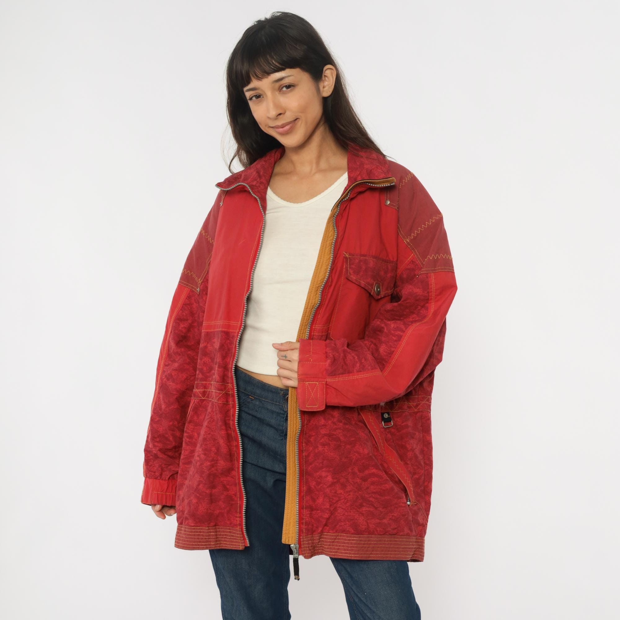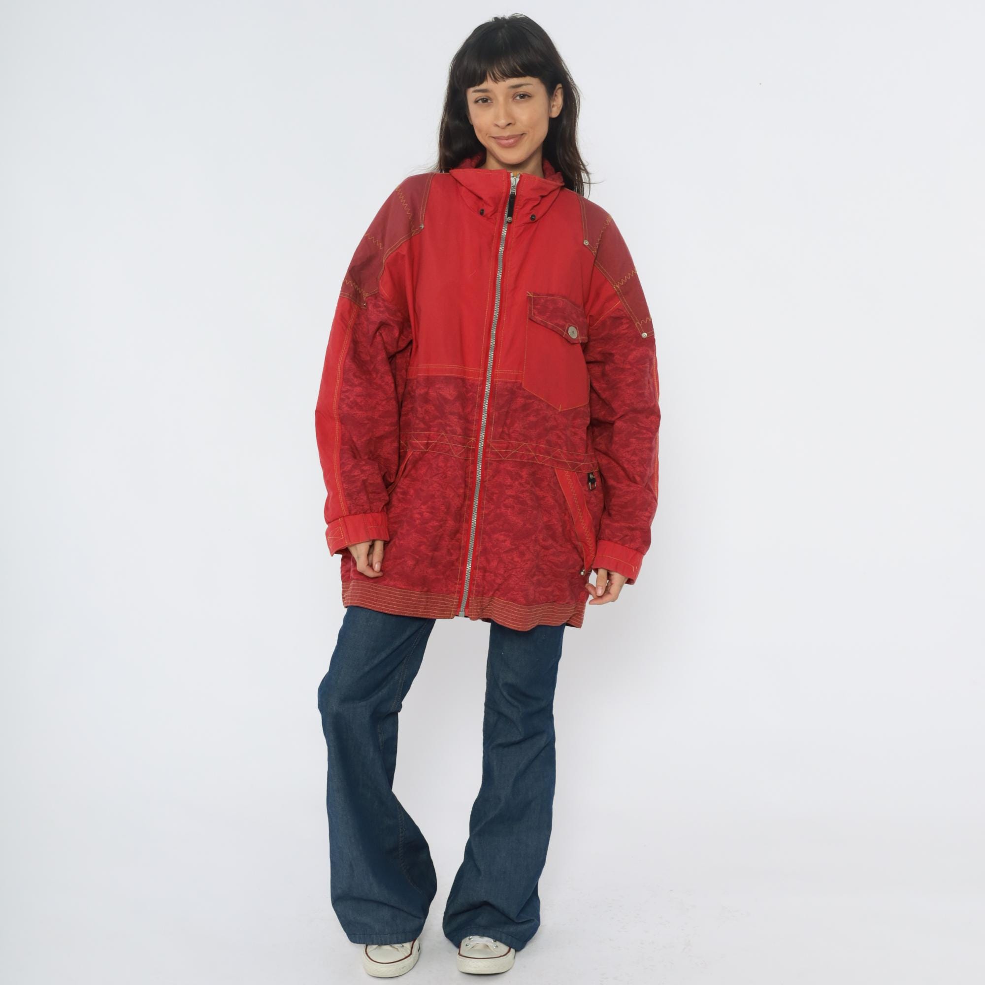 80s red nylon jacket from obermeyer with two-tone colorblocking, mixing solid coral-red panels with darker mottled red textured fabric. Decorative zig-zag contrast stitching in mustard thread throughout the body, sleeves, and hem. Zip front closure, snap collar, chest pocket with snap closure, and lower pockets with button closures.