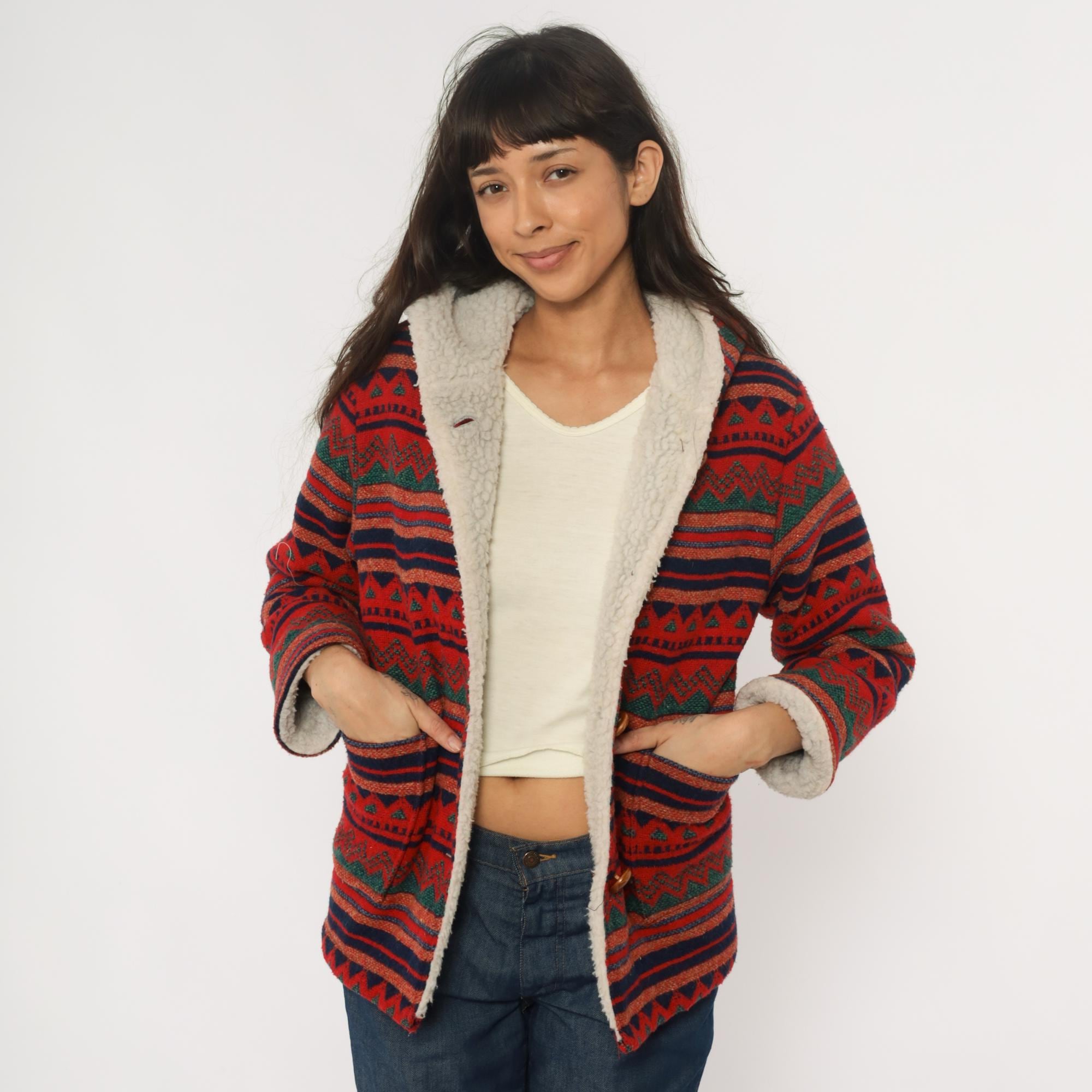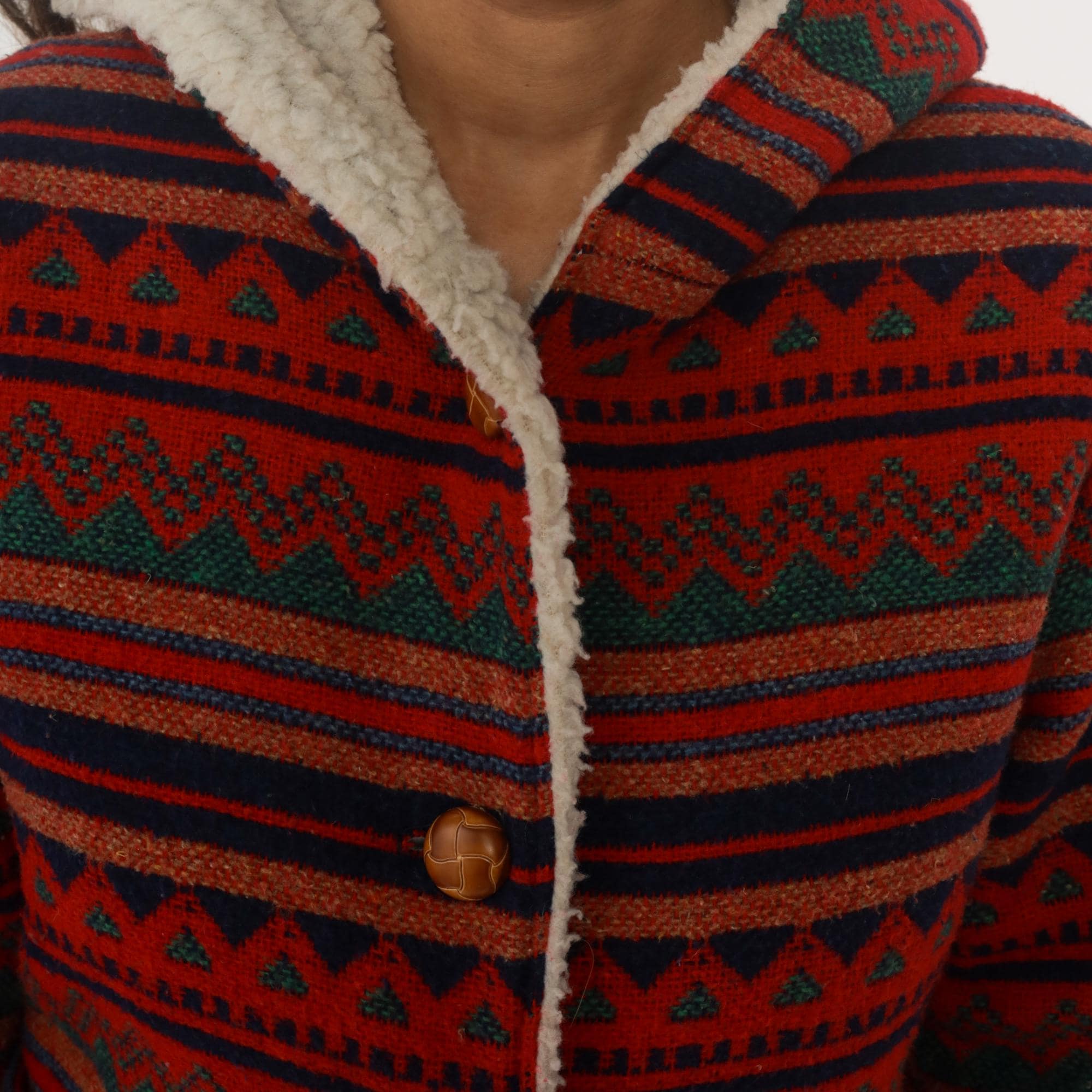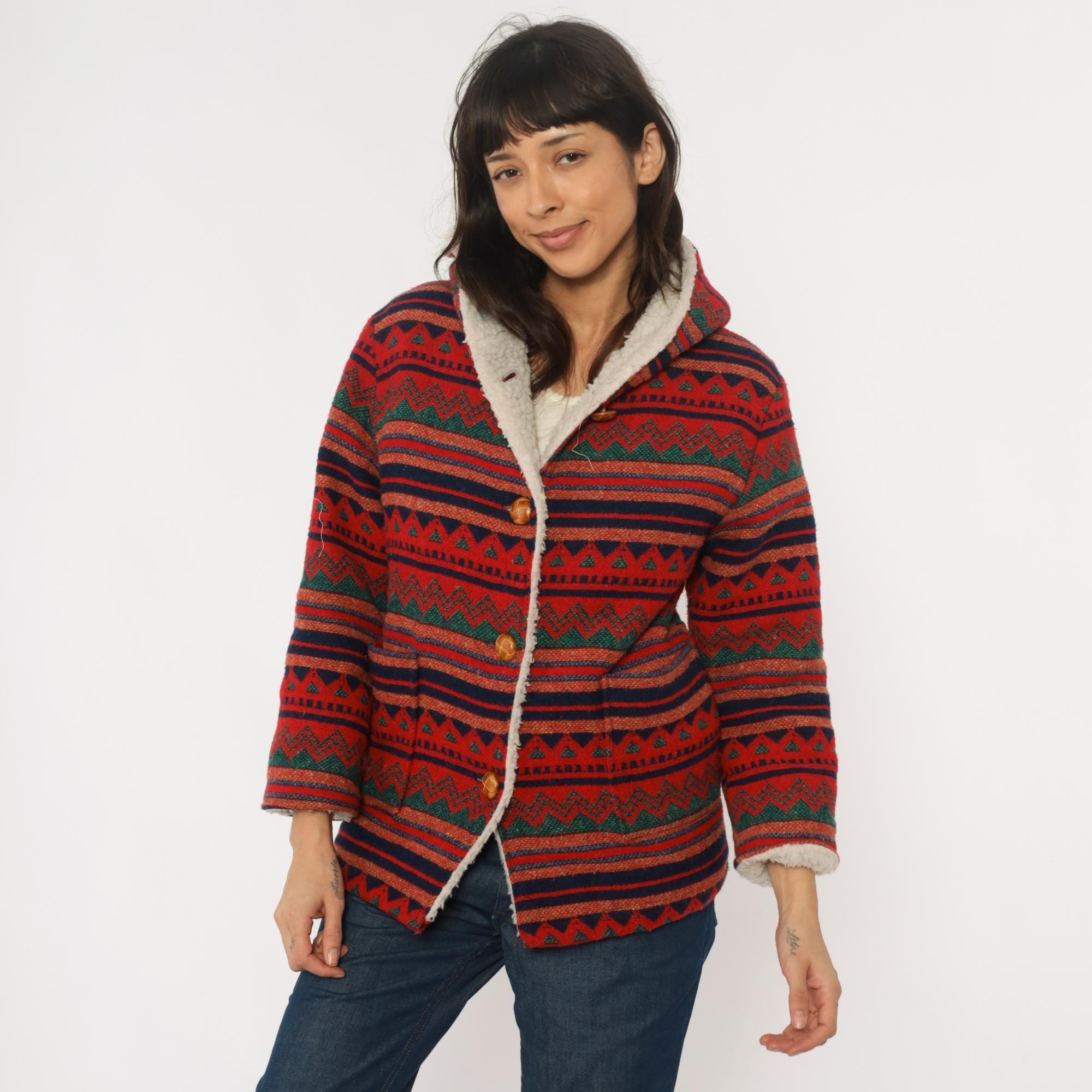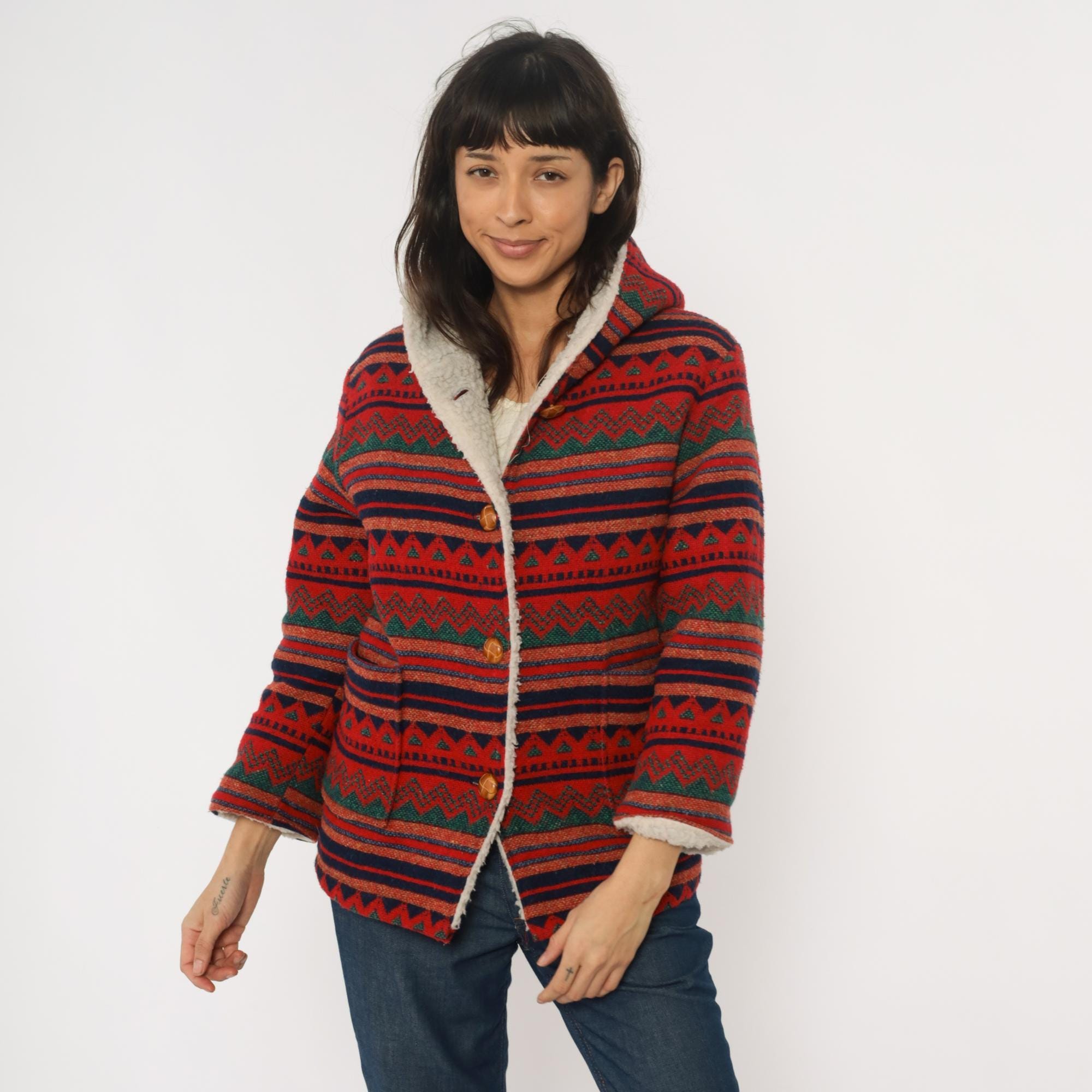 70s red hooded jacket with Aztec geometric pattern in horizontal bands of navy, orange, green, and black. Button front closure with wooden buttons, sherpa lining at hood and front edges. Long sleeves with pattern continuing throughout.