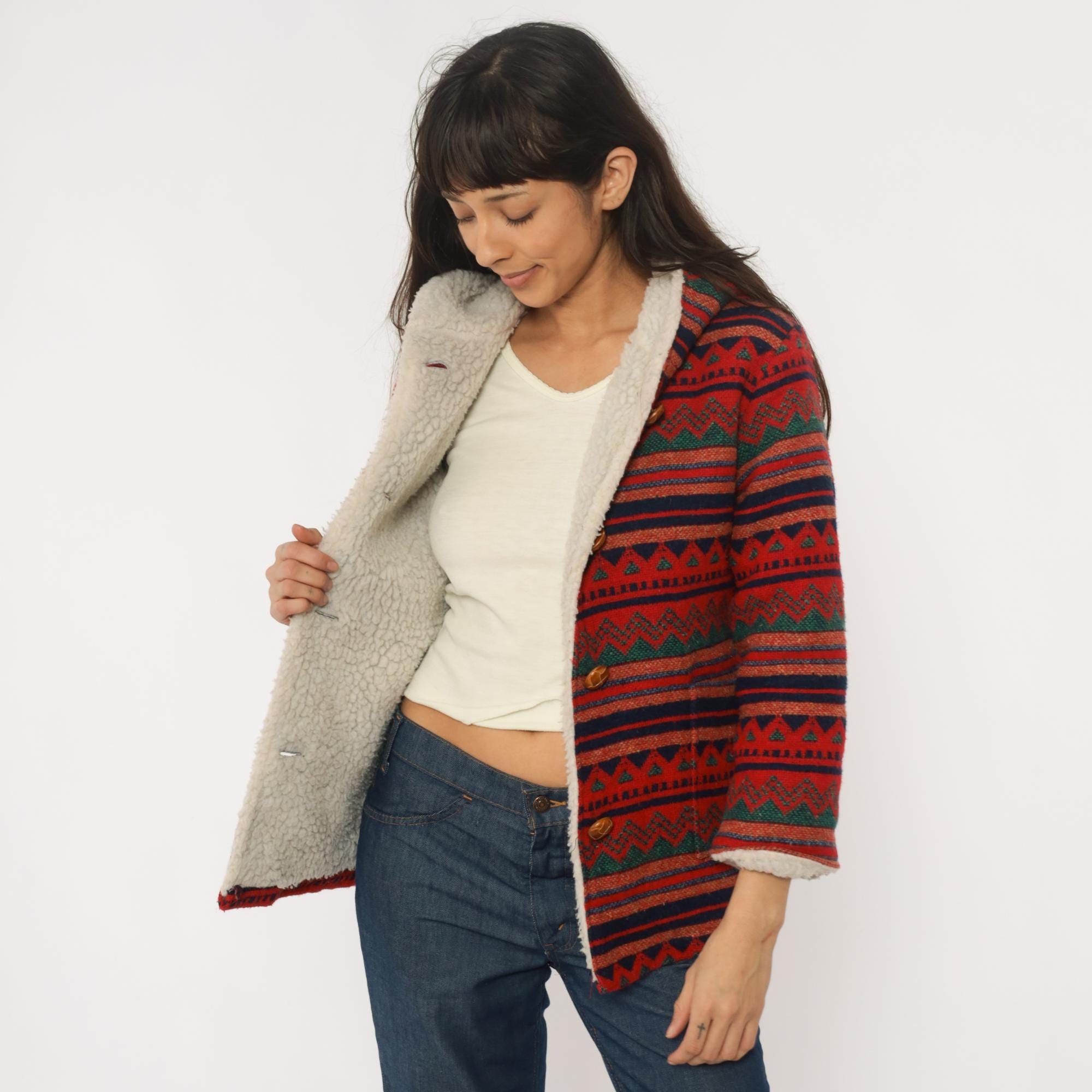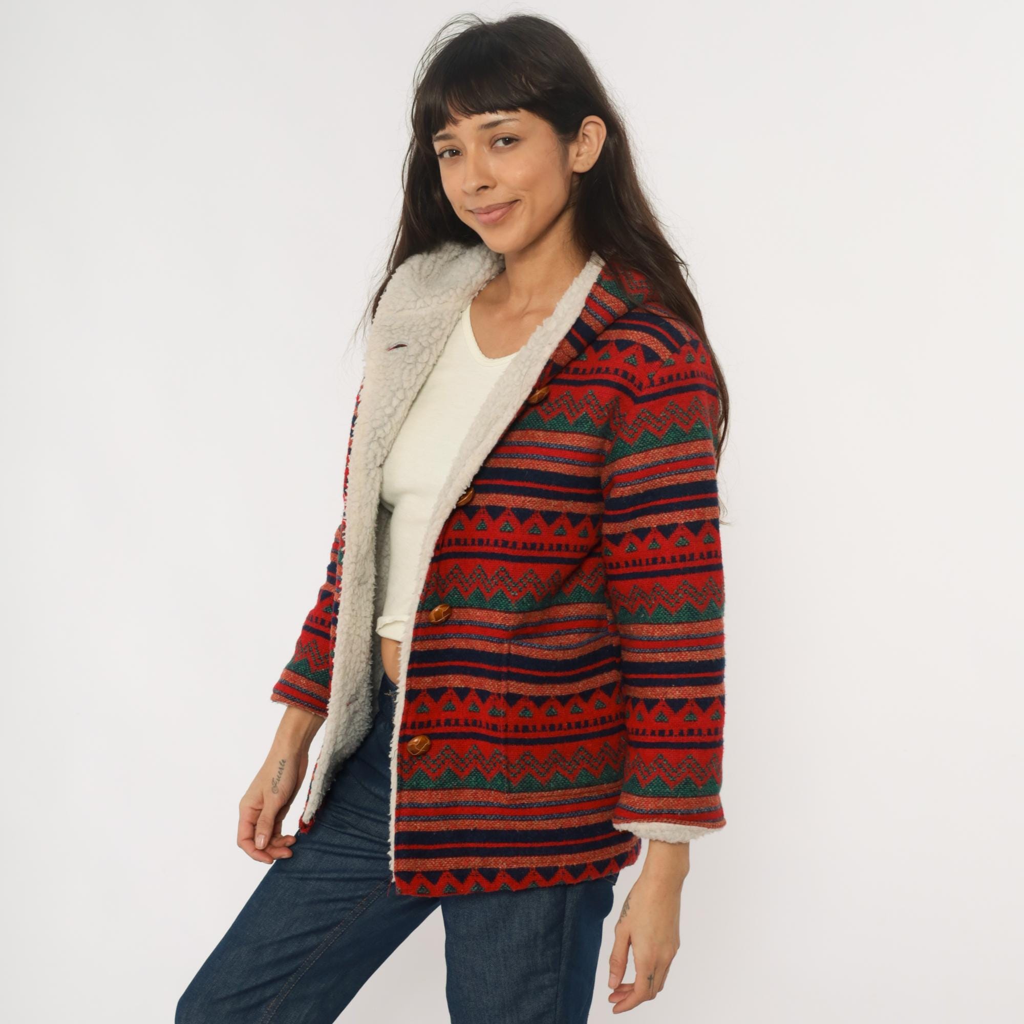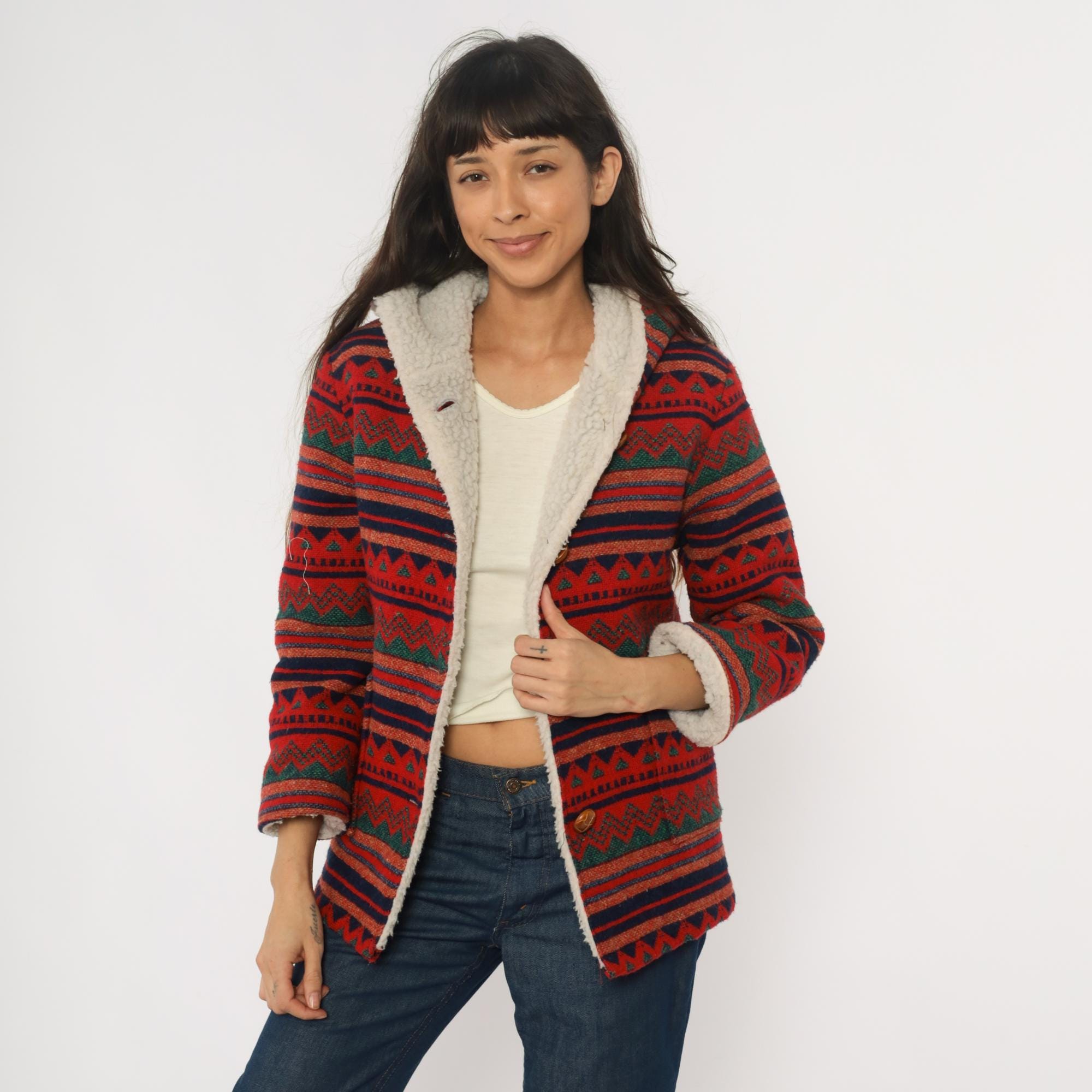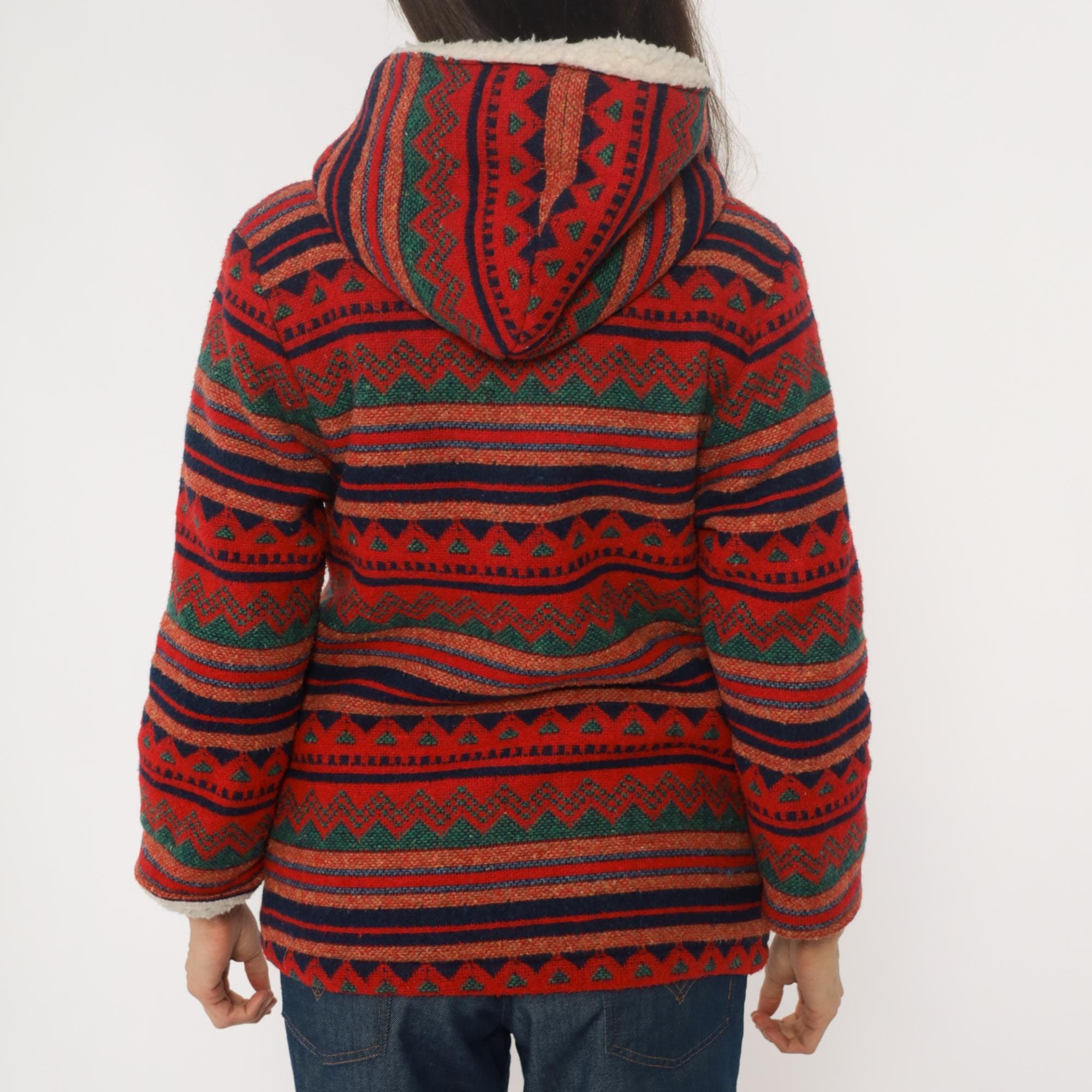 70s red hooded jacket with Aztec geometric pattern in horizontal bands of navy, orange, green, and black. Button front closure with wooden buttons, sherpa lining at hood and front edges. Long sleeves with pattern continuing throughout.