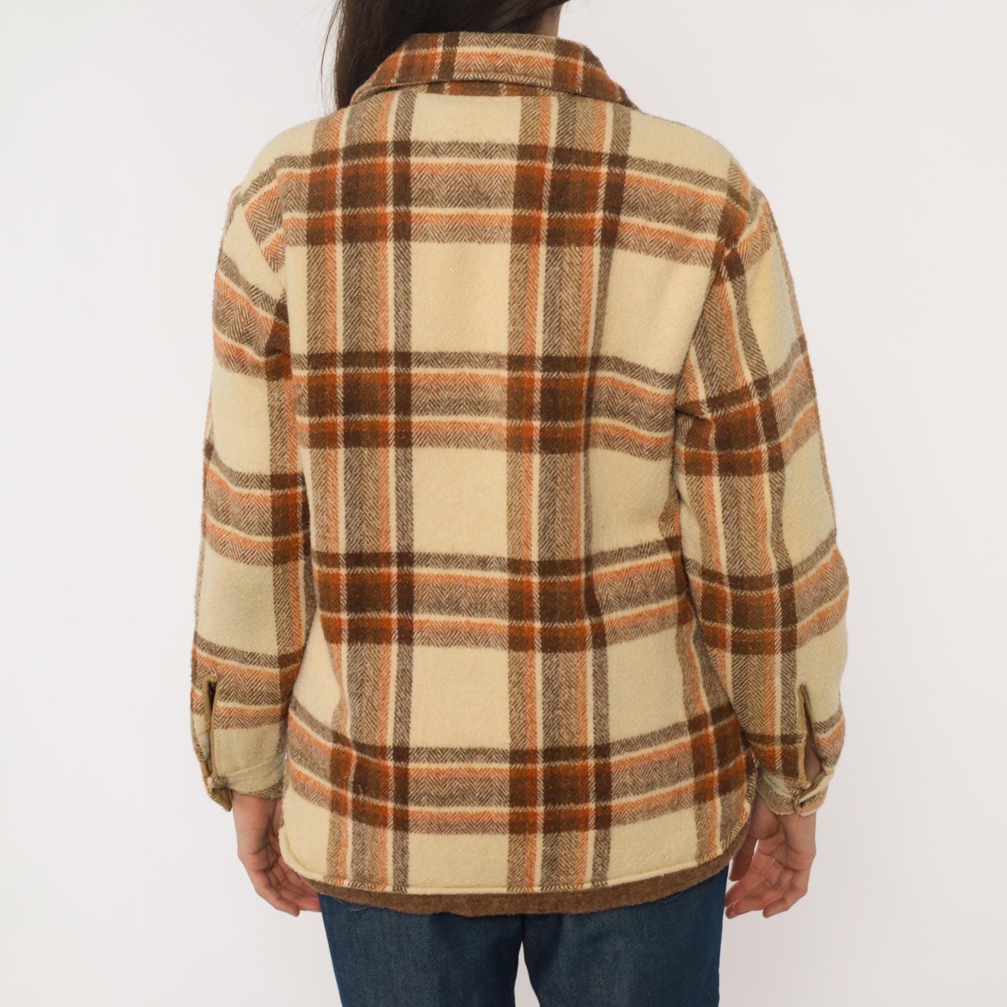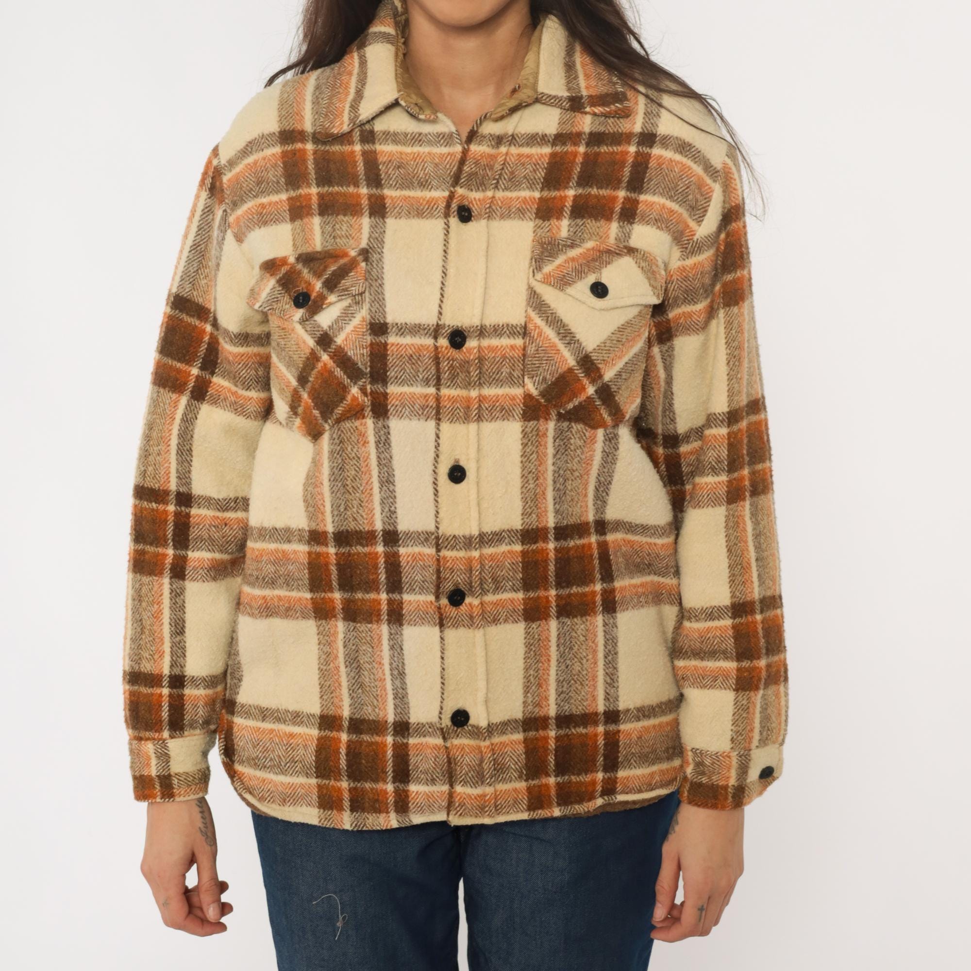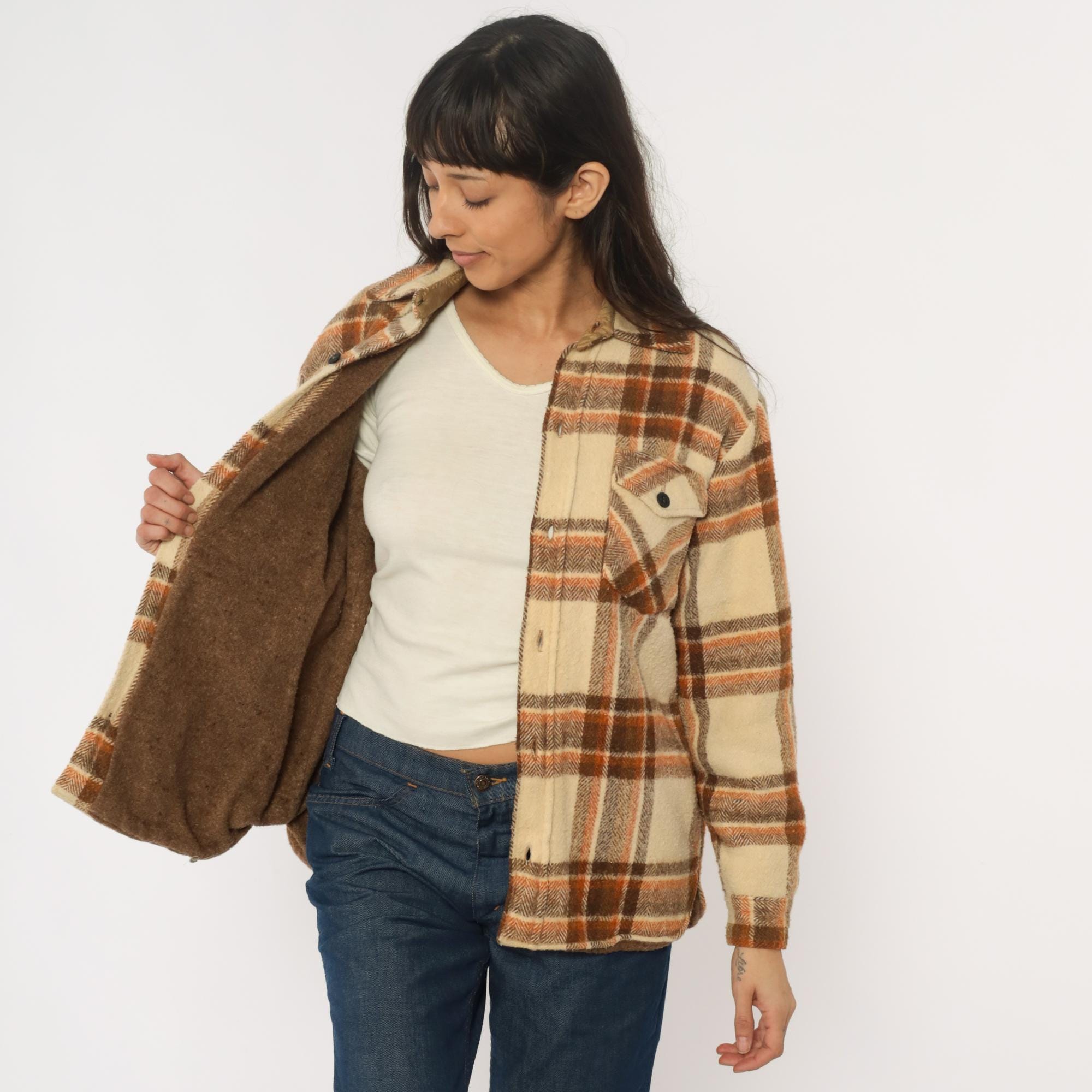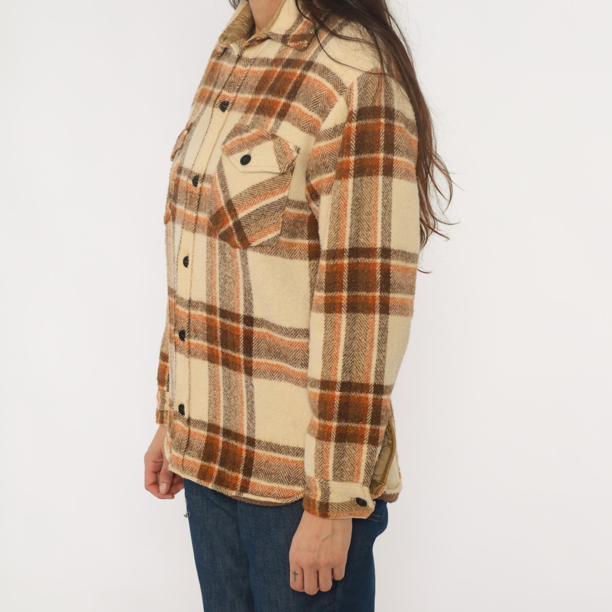 70s cream and brown plaid flannel shirt jacket from Briarcliff with long sleeves, button front closure, and pointed collar. Two chest pockets with button-down flaps, black buttons throughout. Cotton blend with fleece lining.