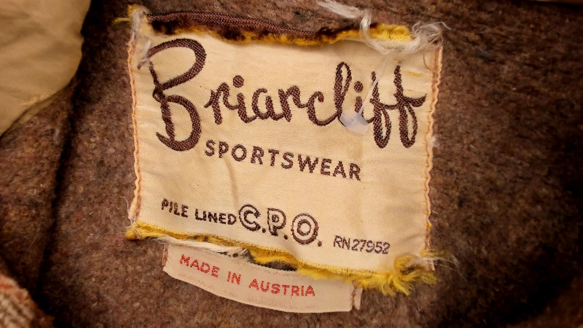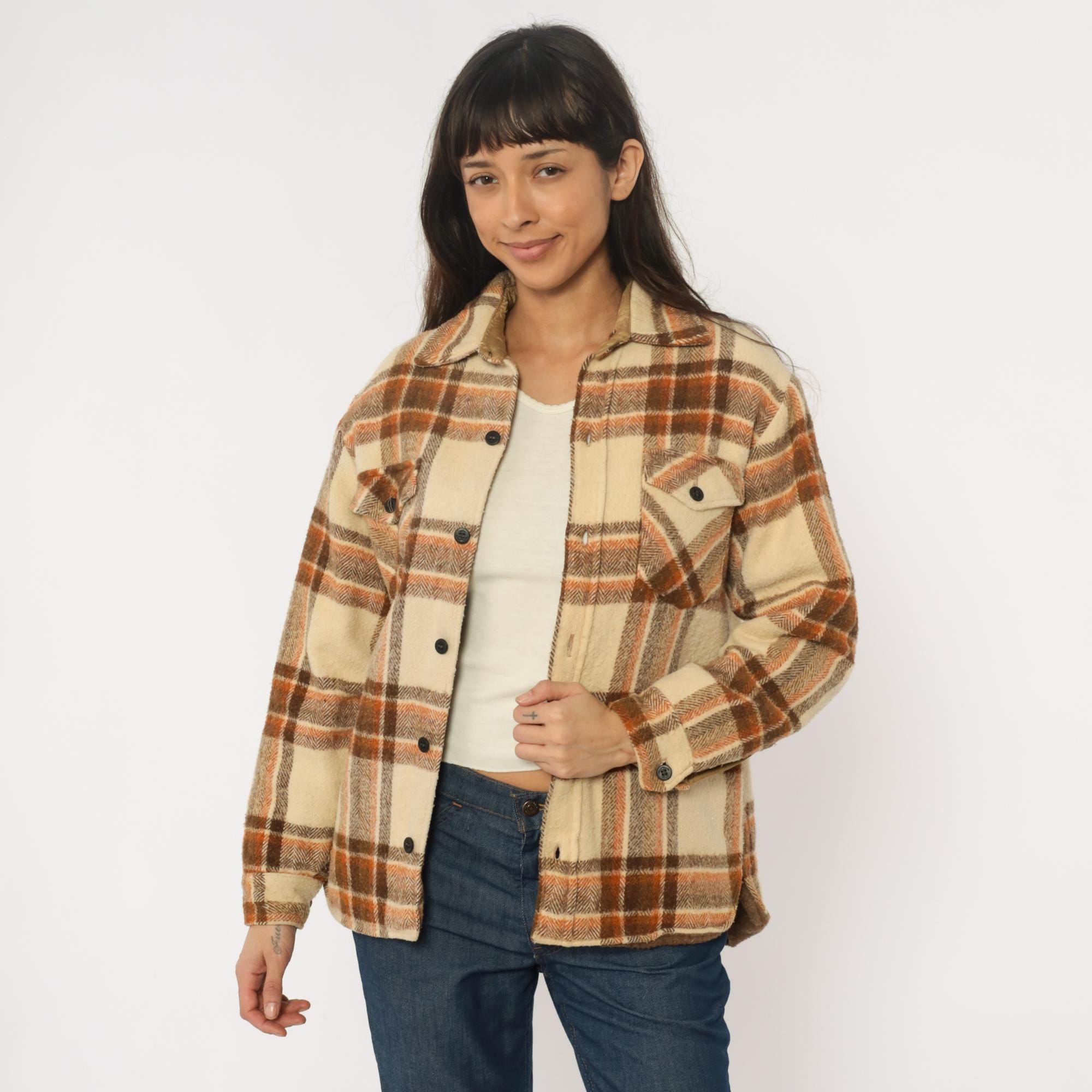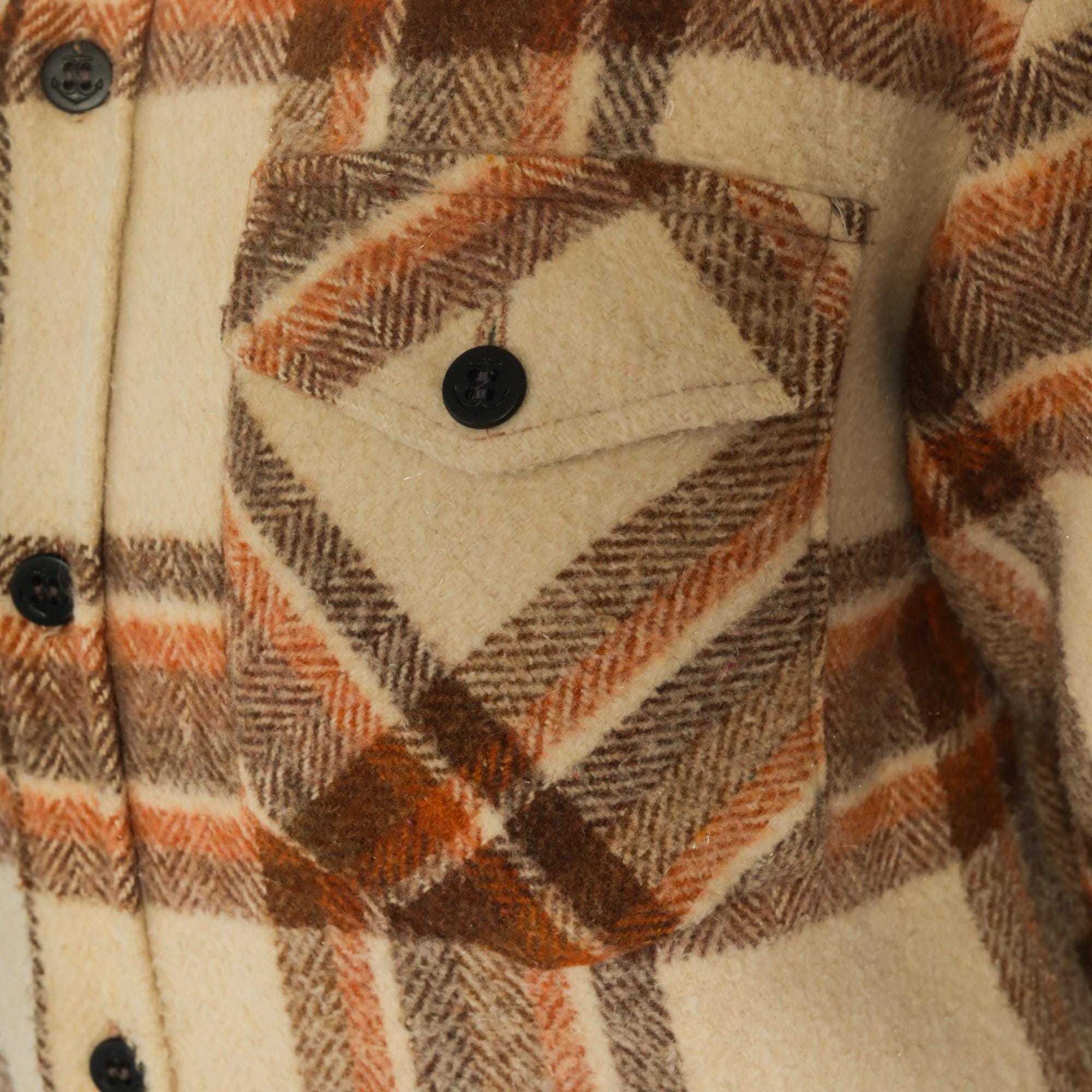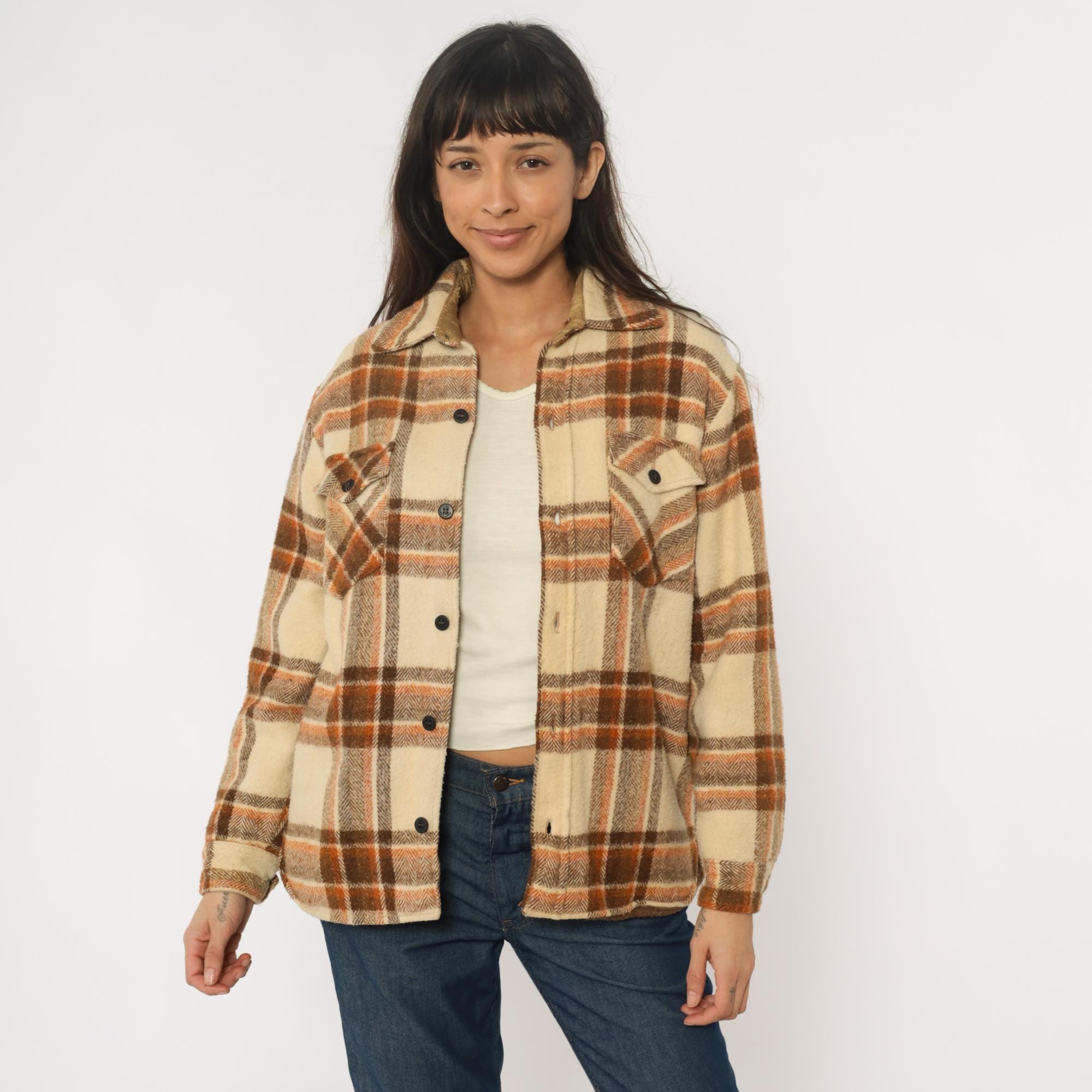 70s cream and brown plaid flannel shirt jacket from Briarcliff with long sleeves, button front closure, and pointed collar. Two chest pockets with button-down flaps, black buttons throughout. Cotton blend with fleece lining.