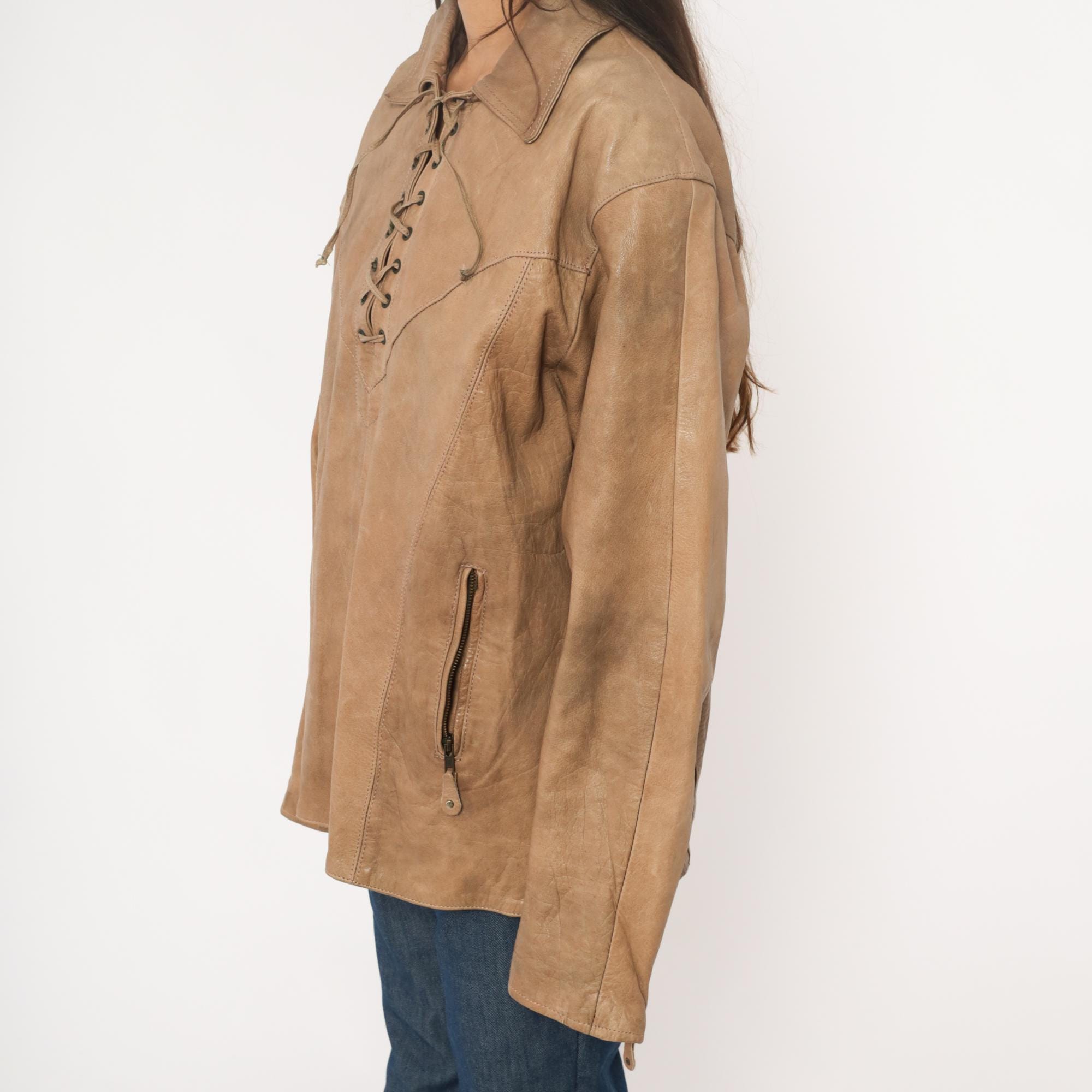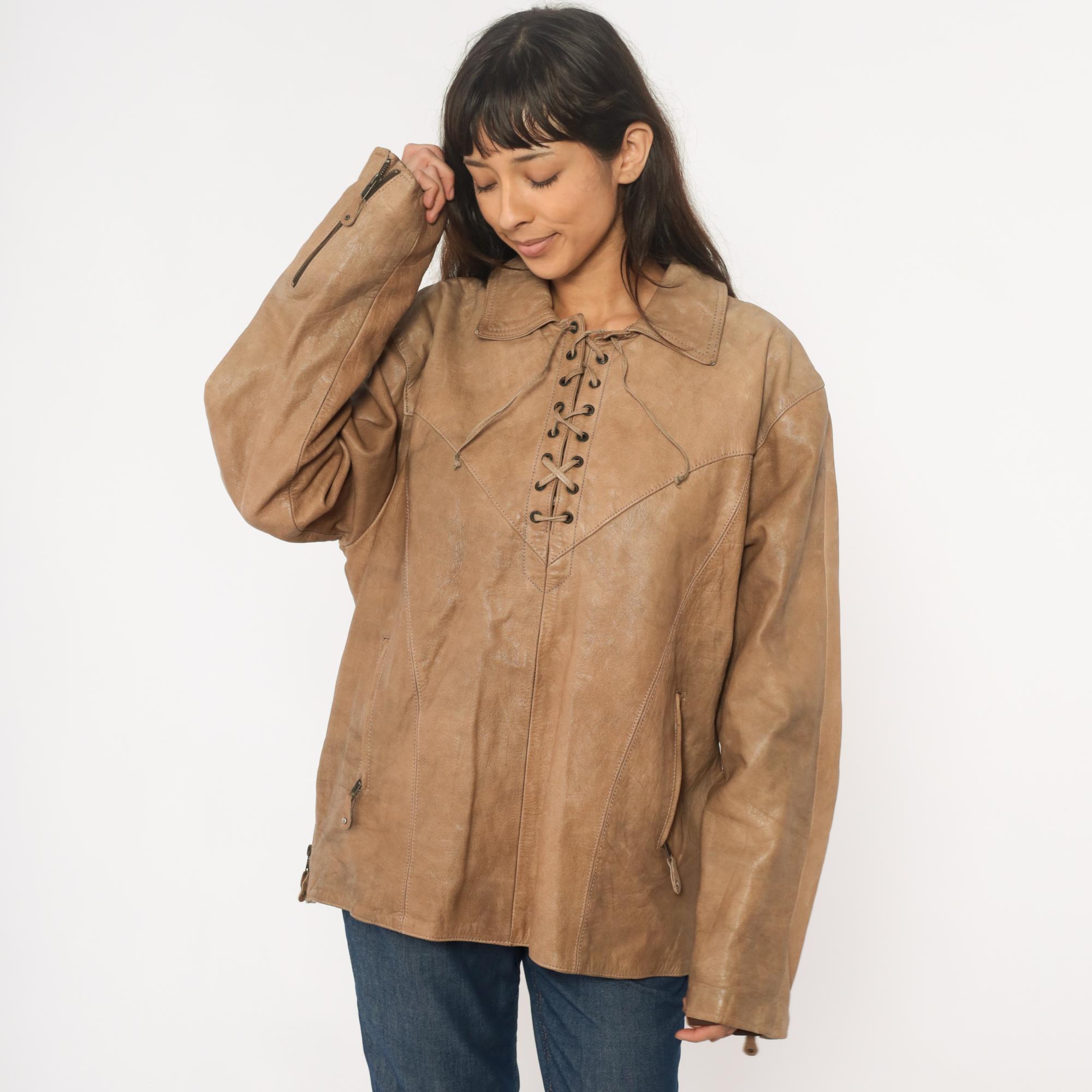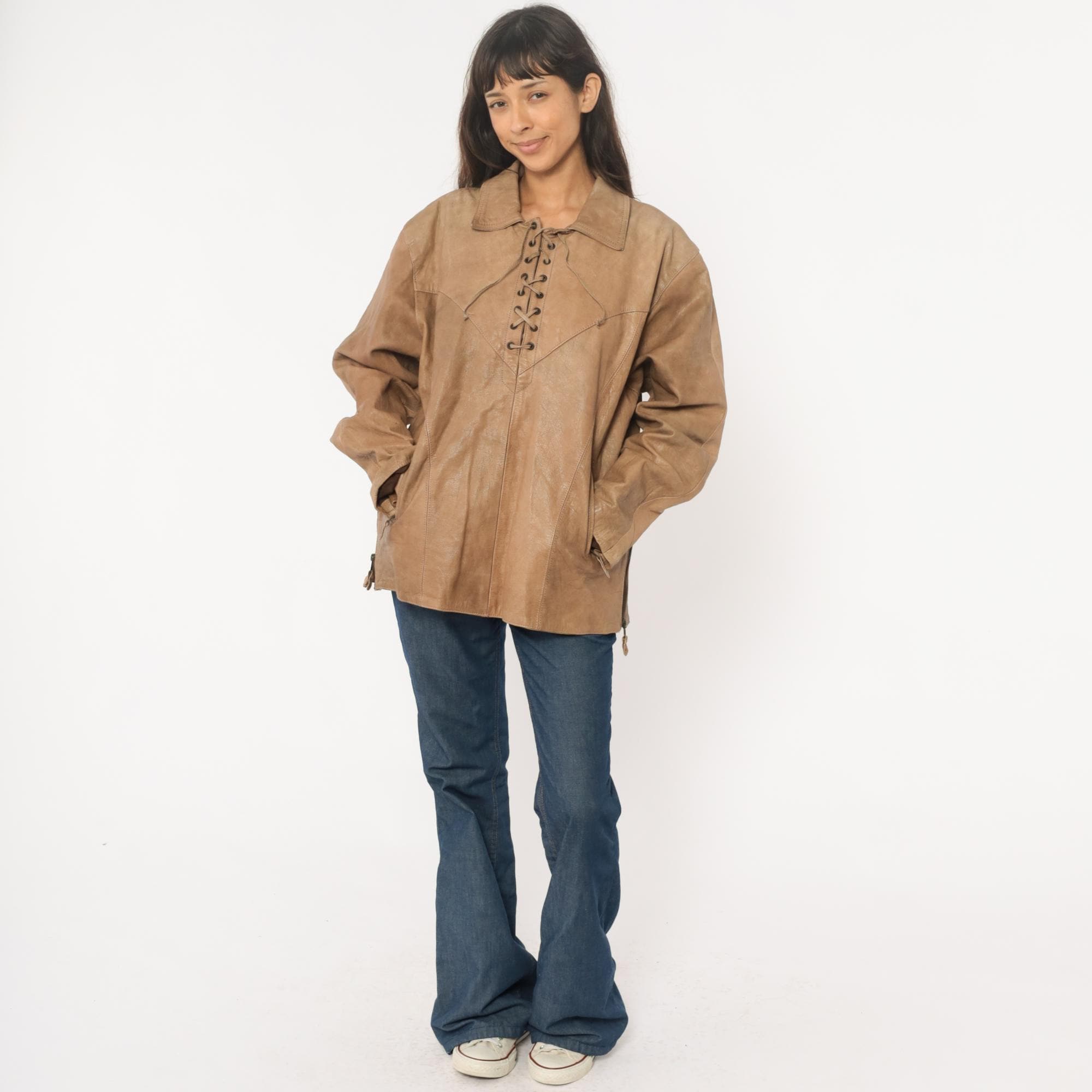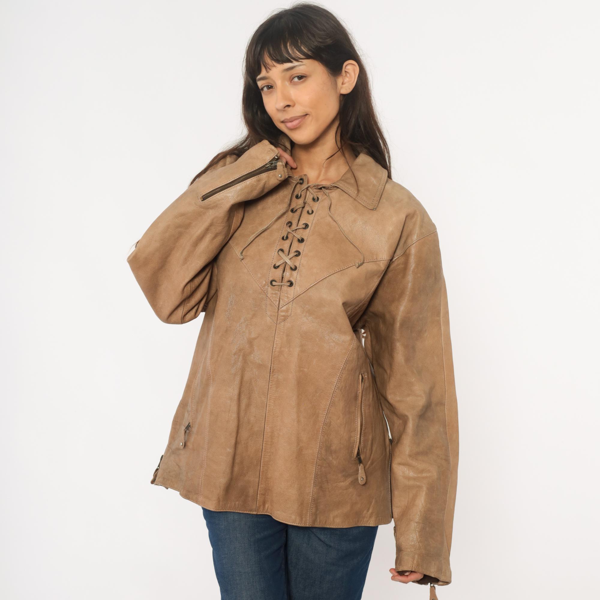 70s tan leather jacket from Yukon Jack Leather with front lace-up closure through grommets and pointed collar. Long sleeves with zipper cuffs, side zipper pockets, paneled construction with visible seaming throughout the camel-colored leather.