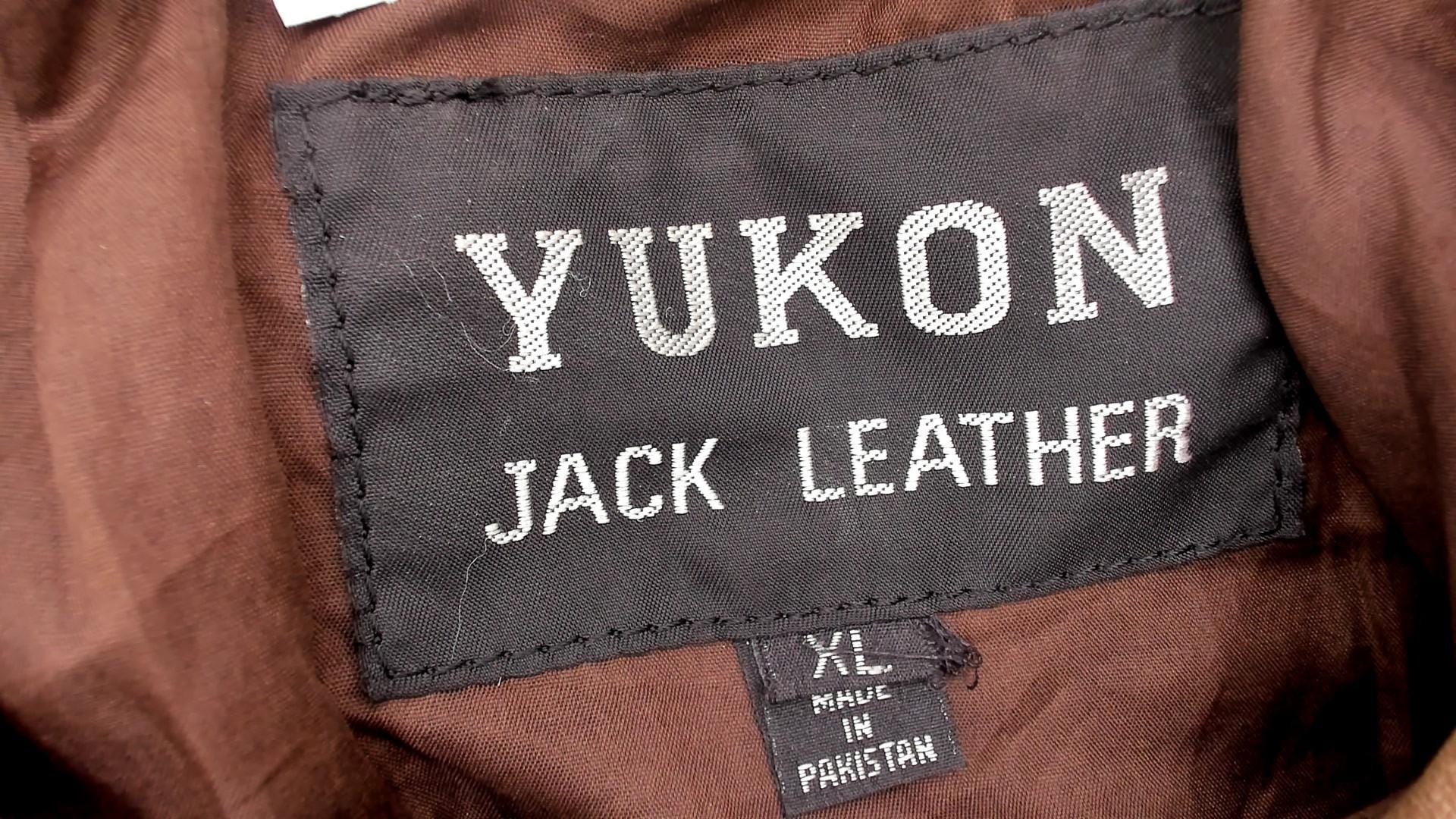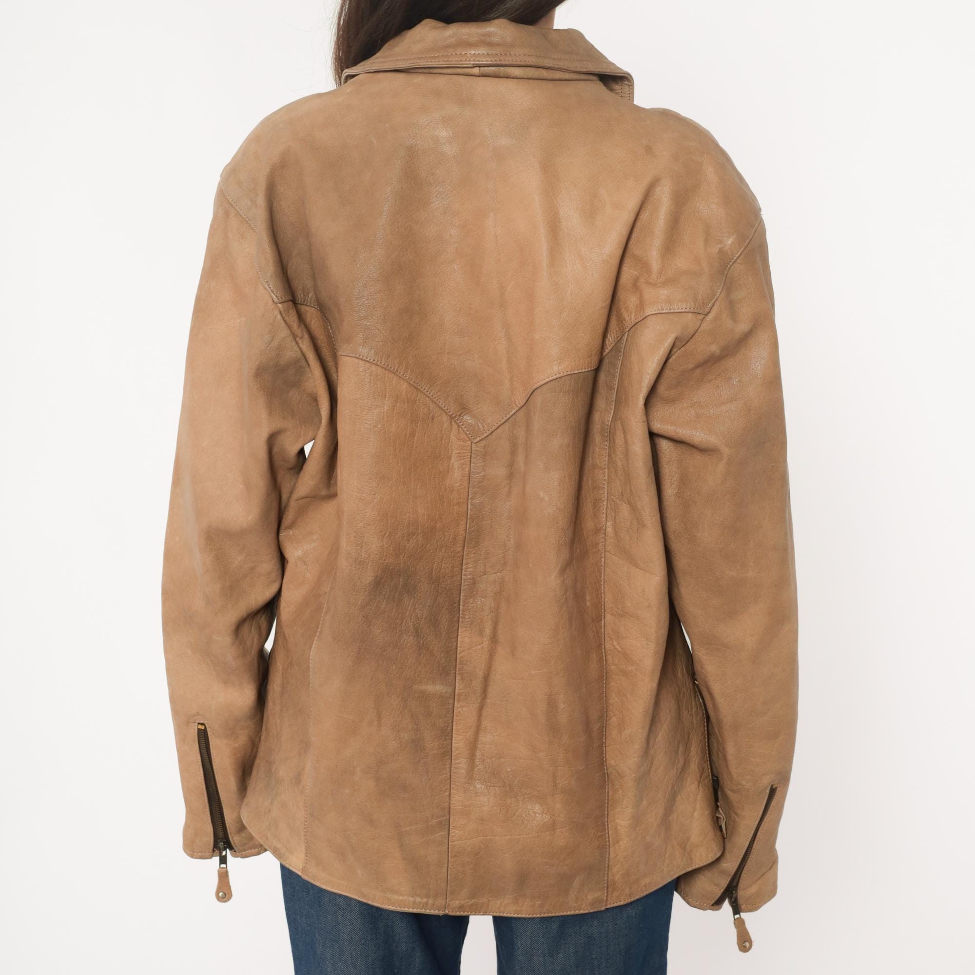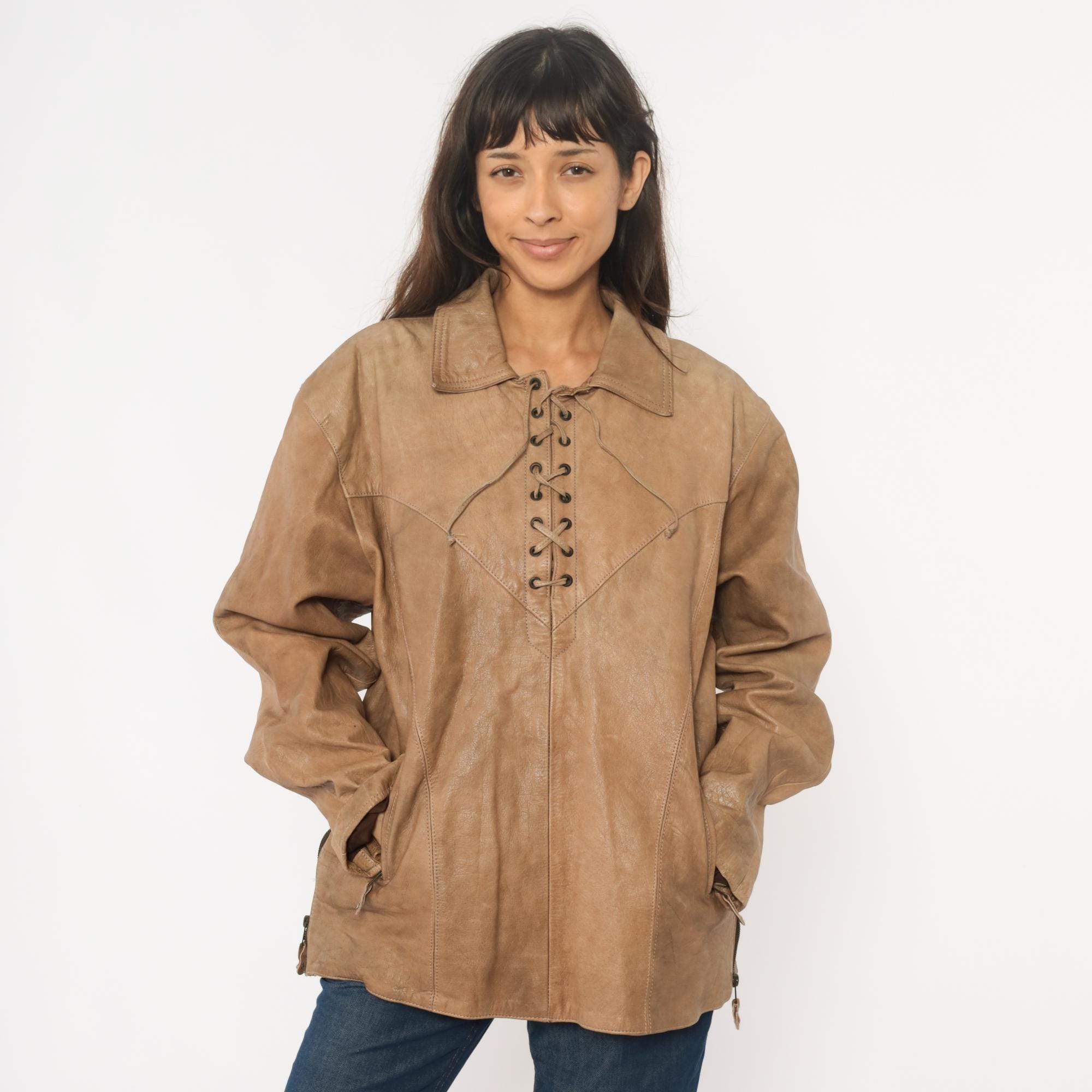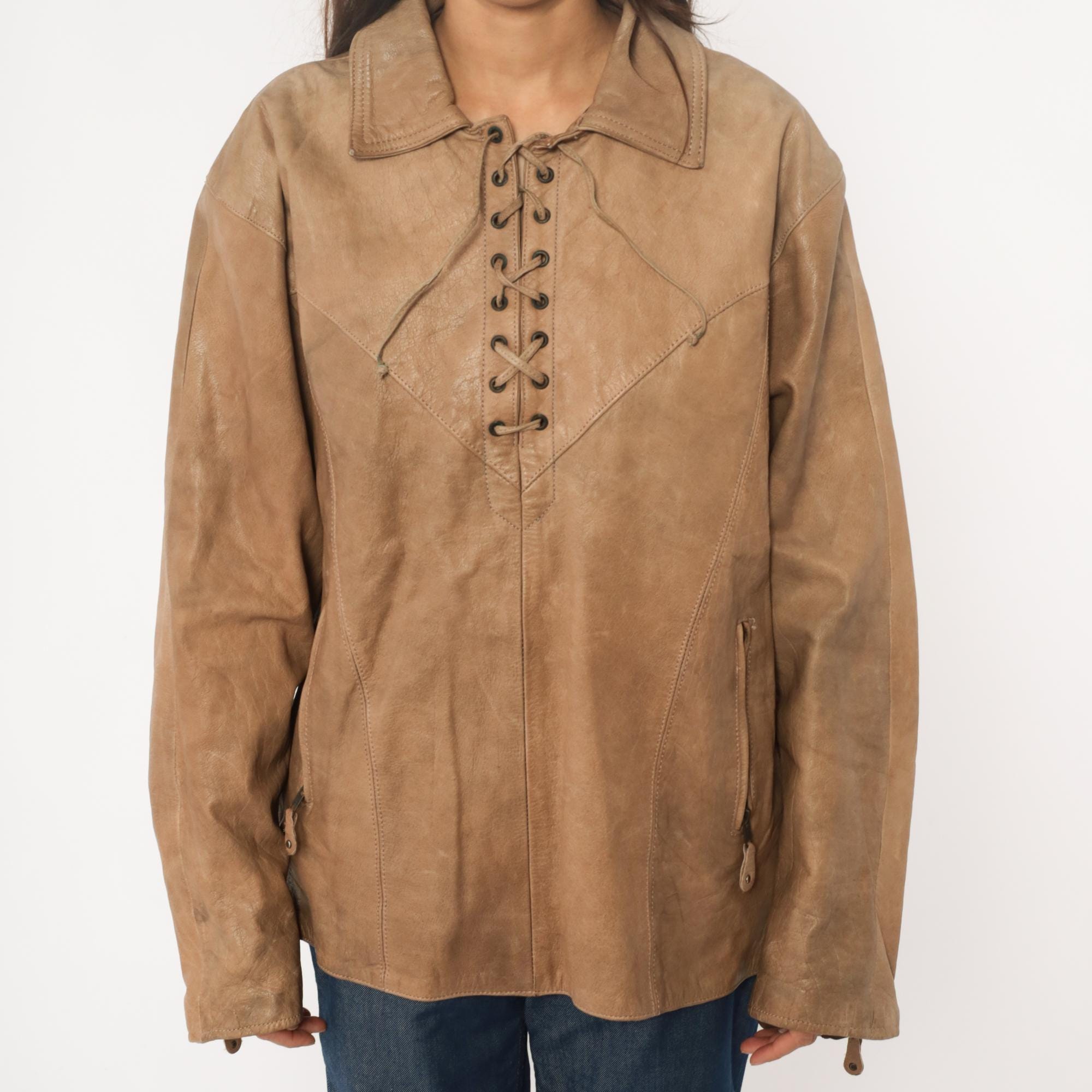 70s tan leather jacket from Yukon Jack Leather with front lace-up closure through grommets and pointed collar. Long sleeves with zipper cuffs, side zipper pockets, paneled construction with visible seaming throughout the camel-colored leather.