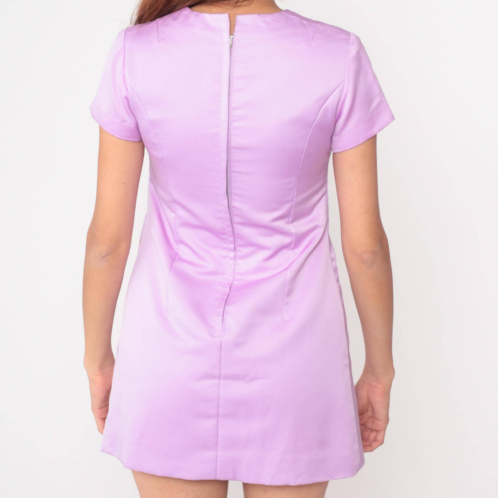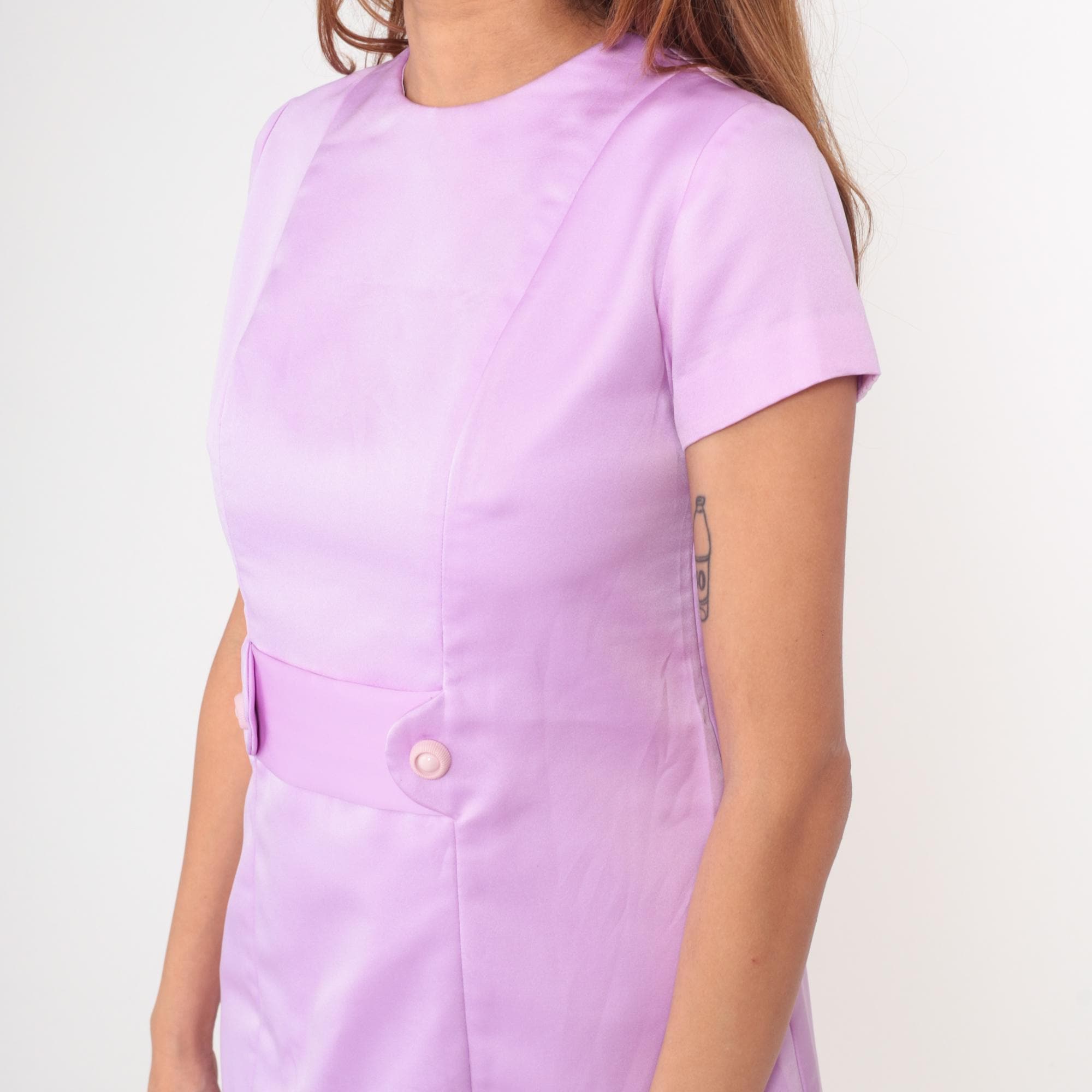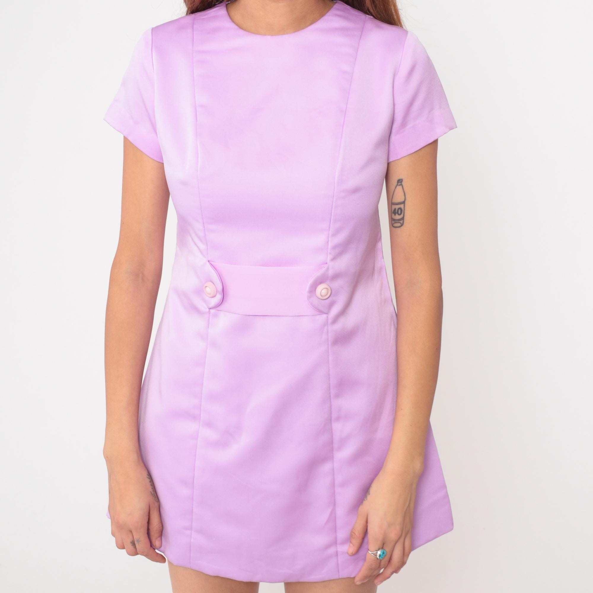 60s lavender mini dress in shift silhouette with crew neckline and short sleeves. Two decorative white buttons positioned at the natural waist on each side. Seaming detail through bodice and skirt.