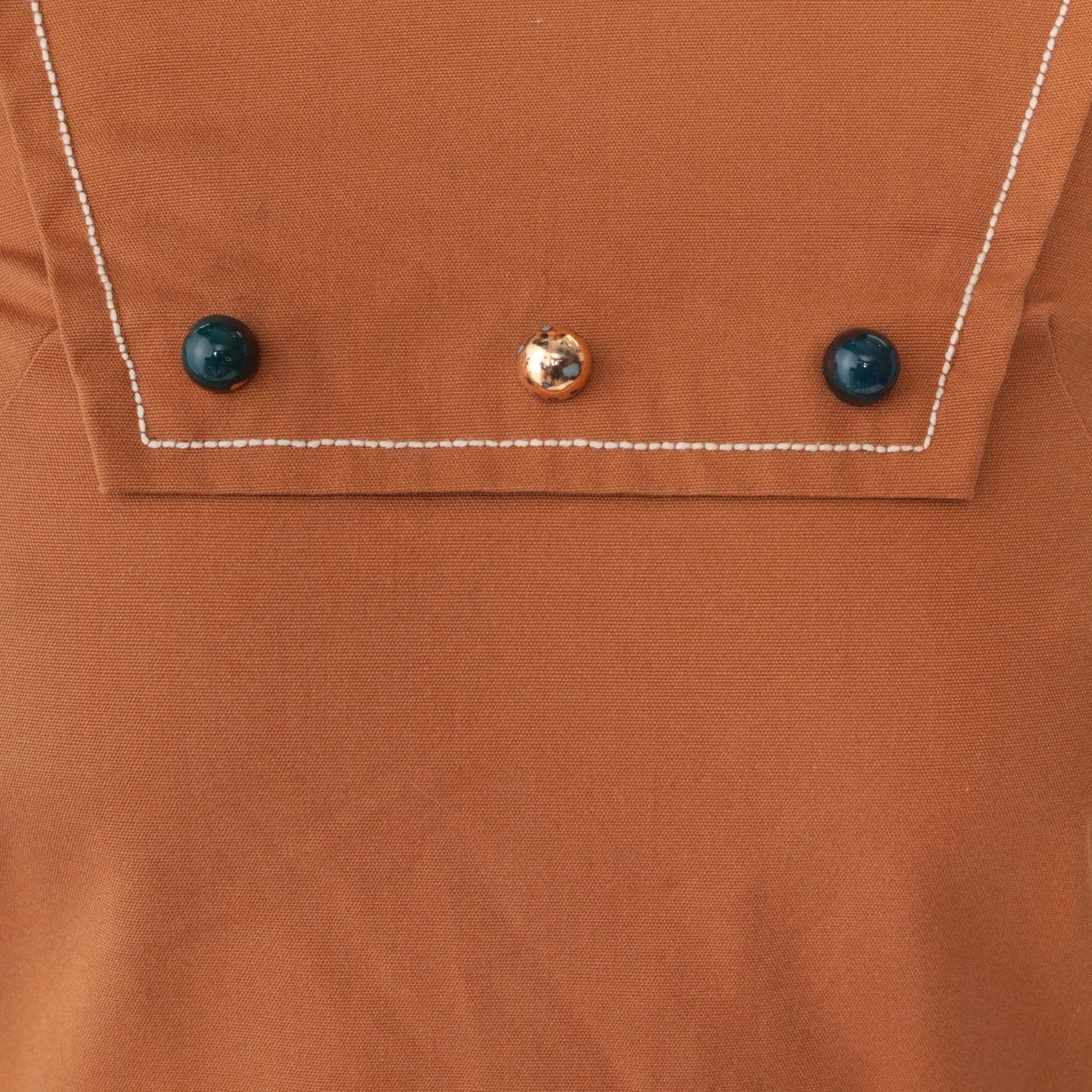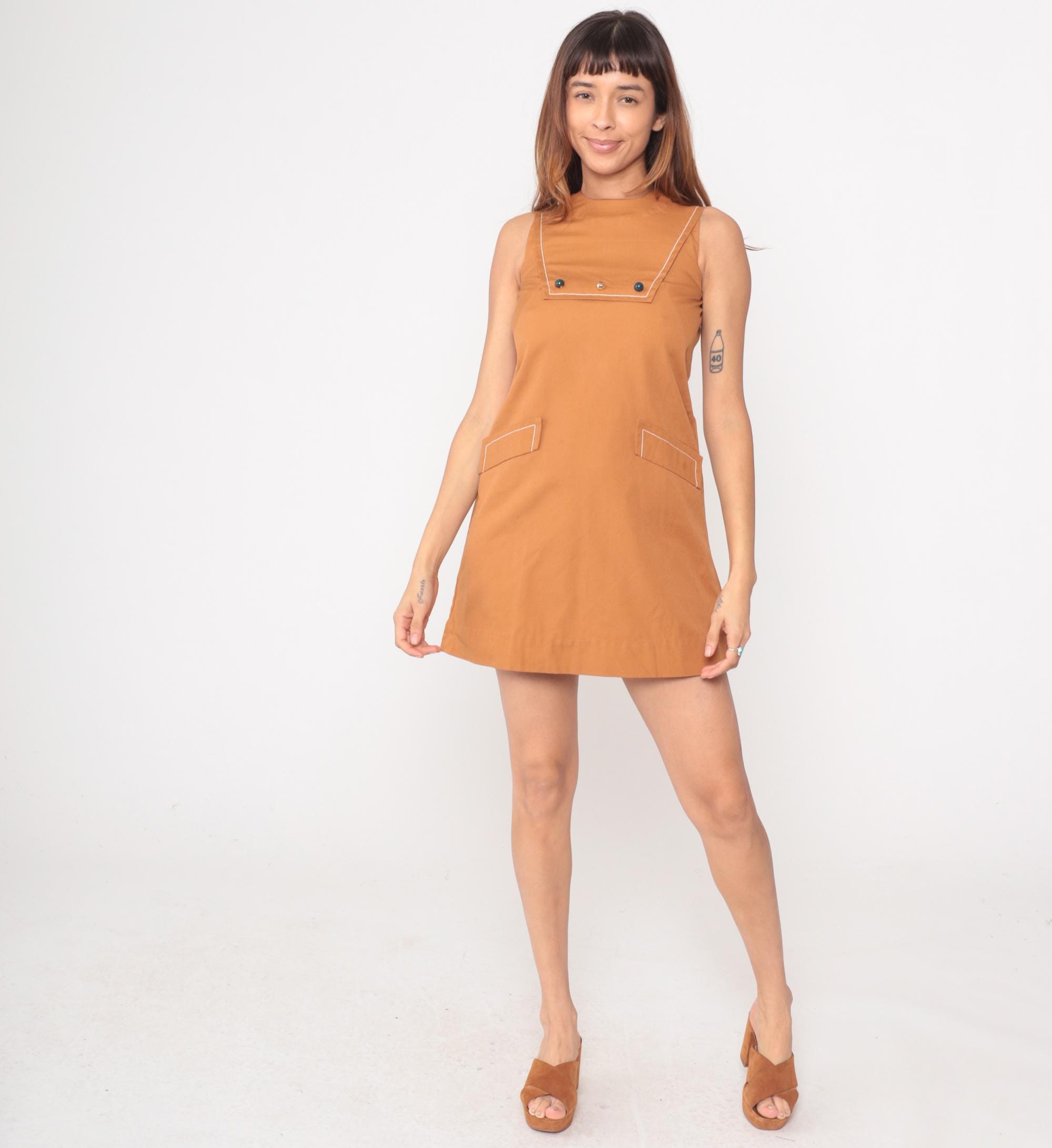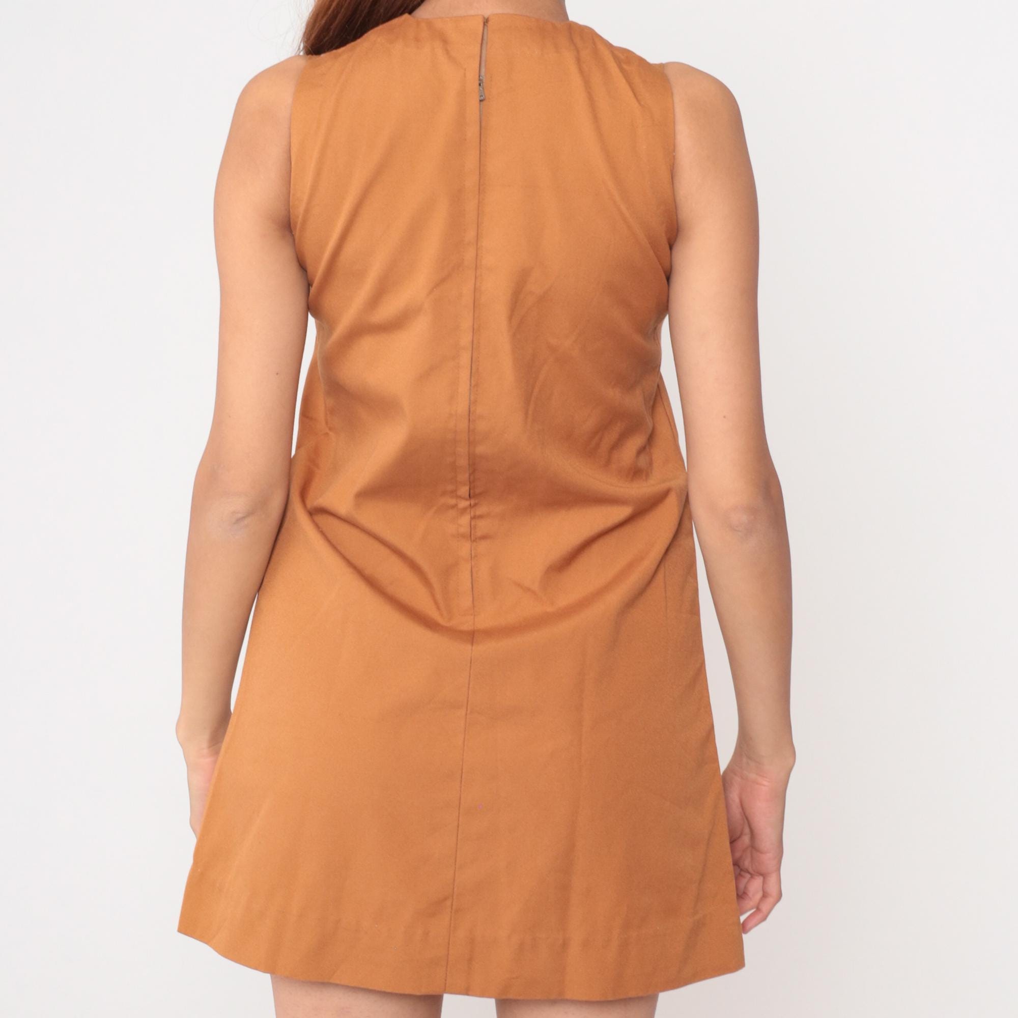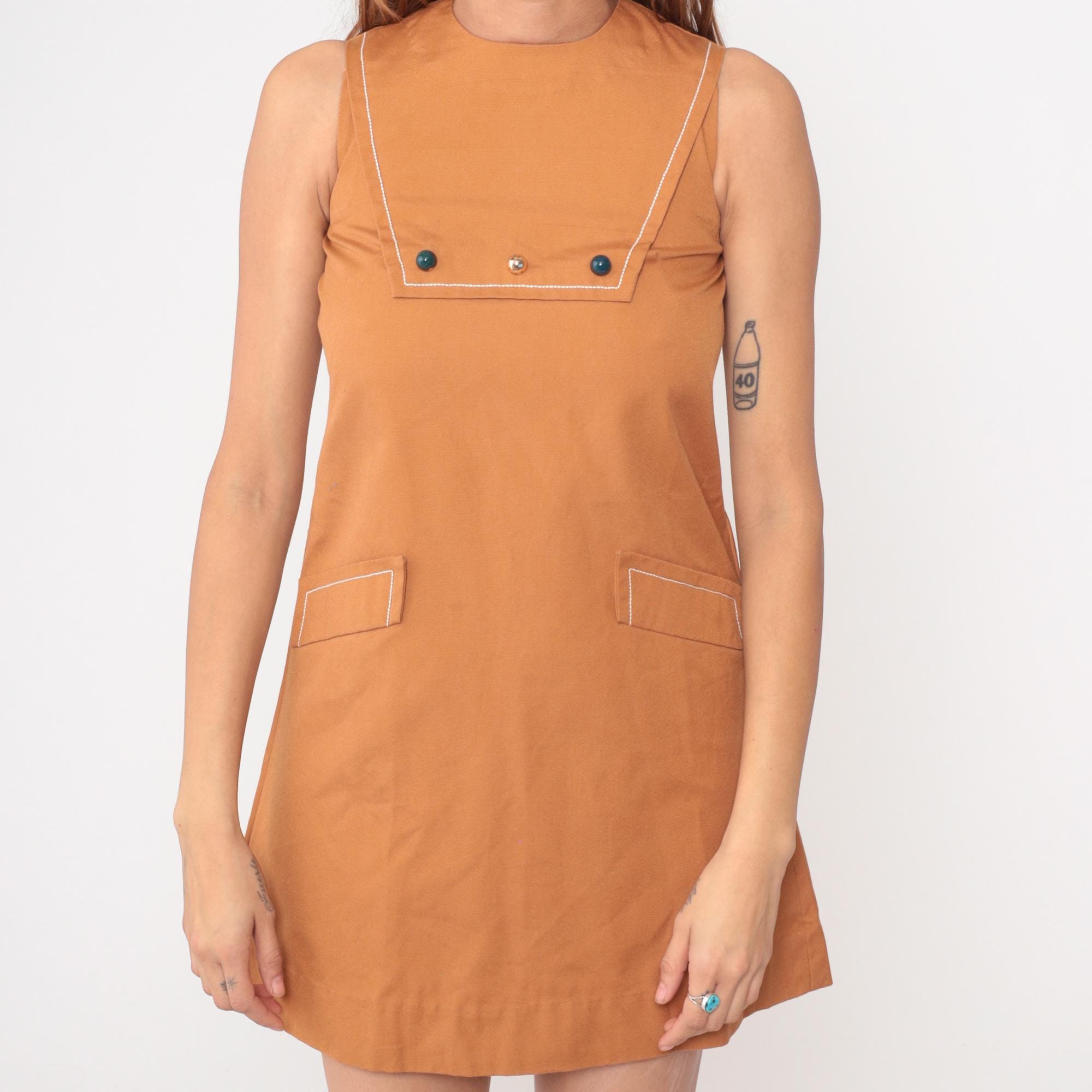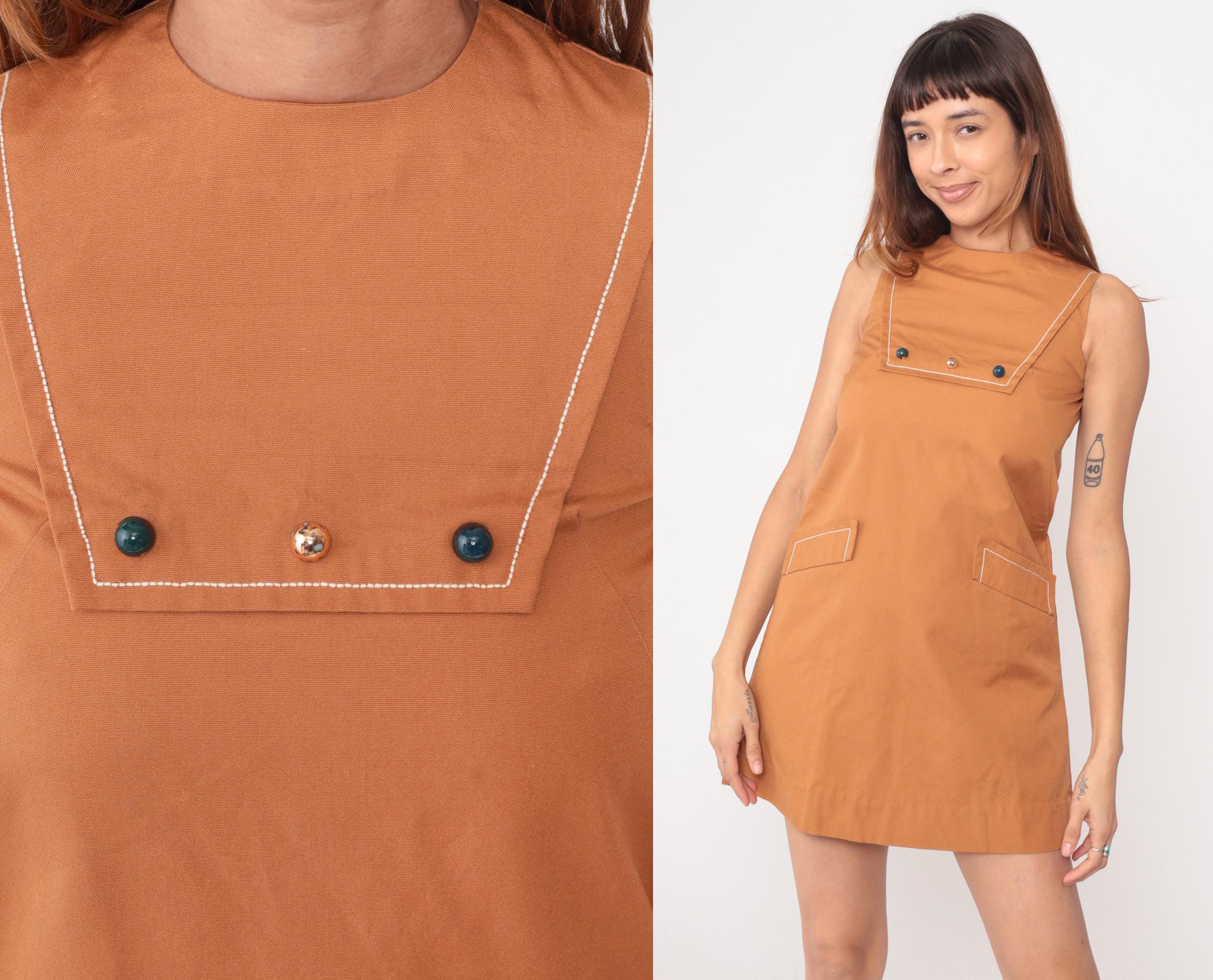 Camel brown 60s mod shift dress from Bela's with cream contrast piping along neckline, armholes, chest pocket, and hip pockets. Sleeveless with high round neck and A-line silhouette. Chest pocket features two dark buttons and one center rhinestone button, two outlined hip pockets, back zipper closure.