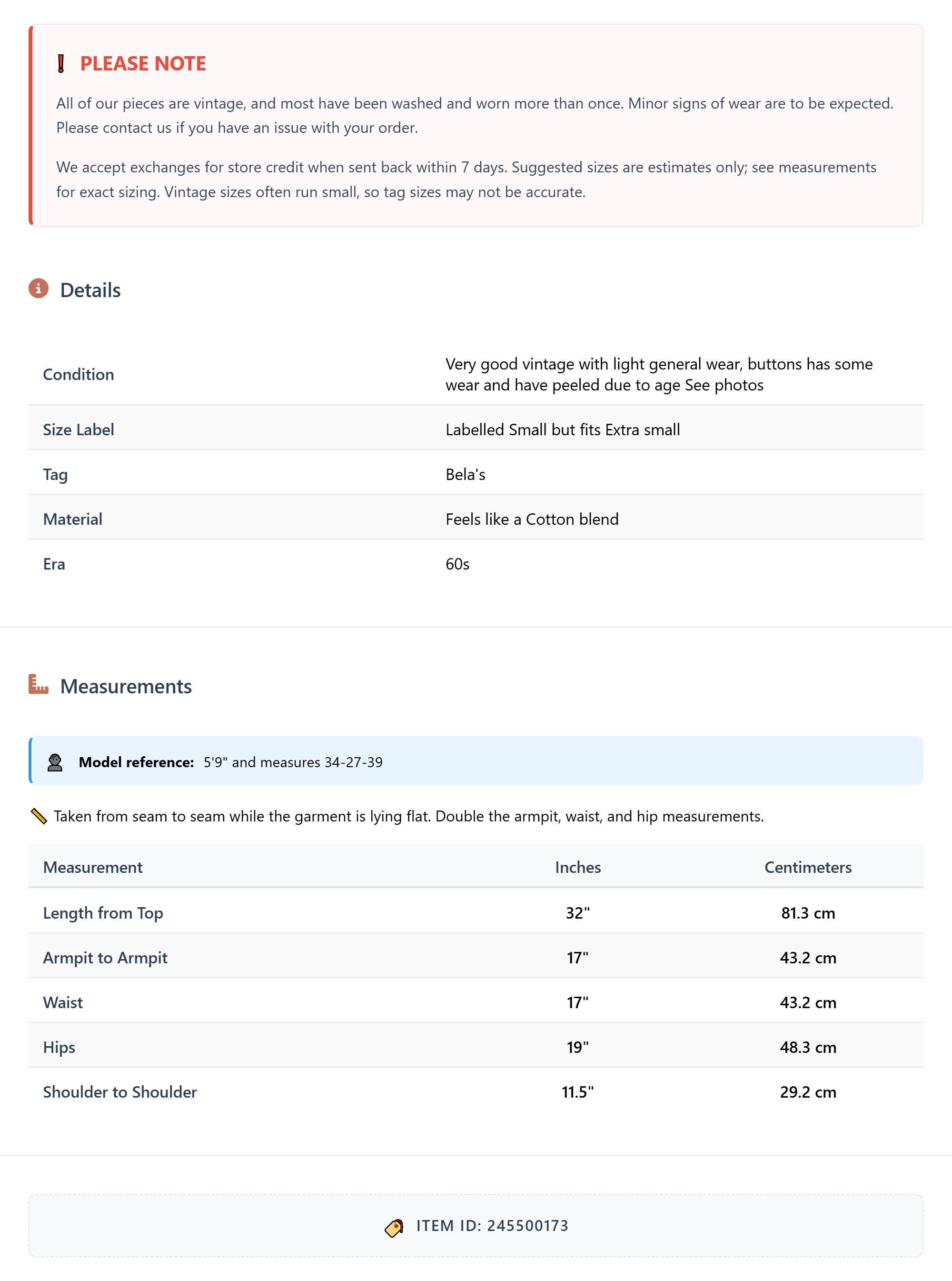 All of our pieces are vintage, and most have been washed and worn more than once. Minor signs of wear are to be expected. Please contact us if you have an issue with your order. We accept exchanges for store credit when sent back within 7 days.