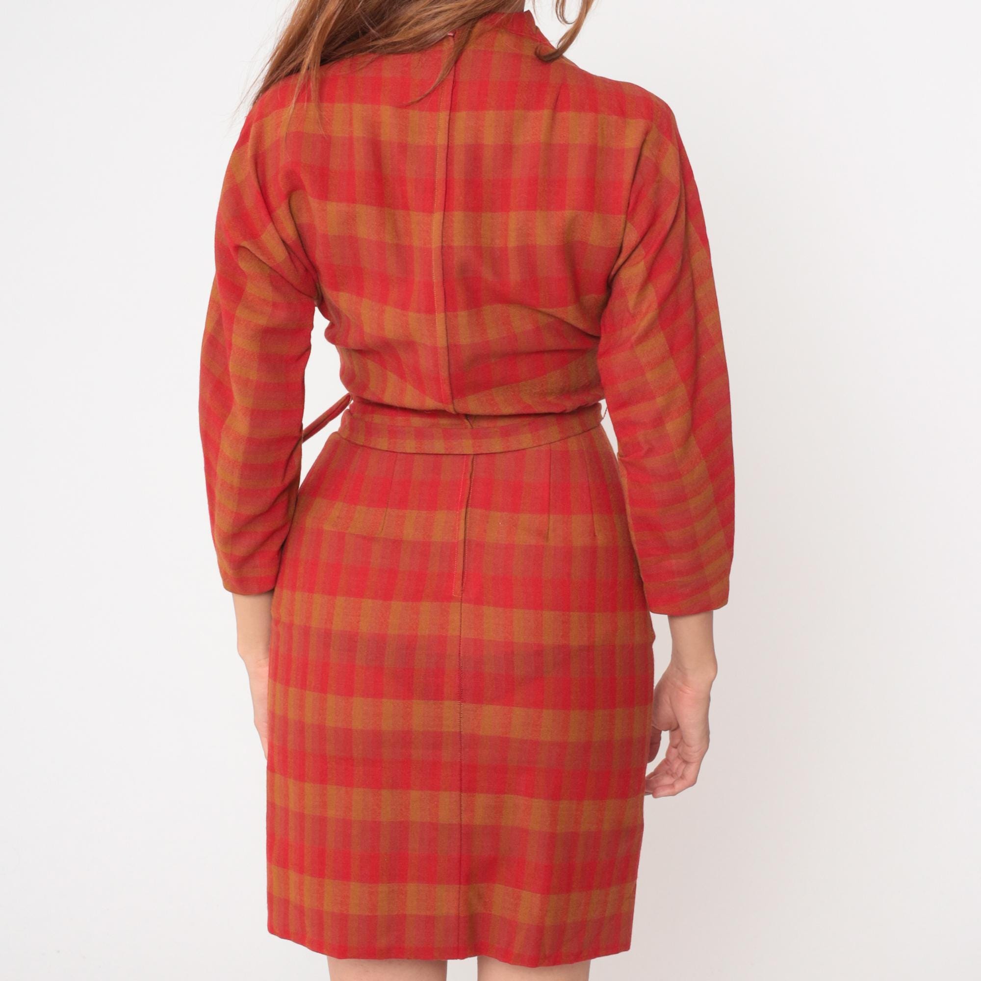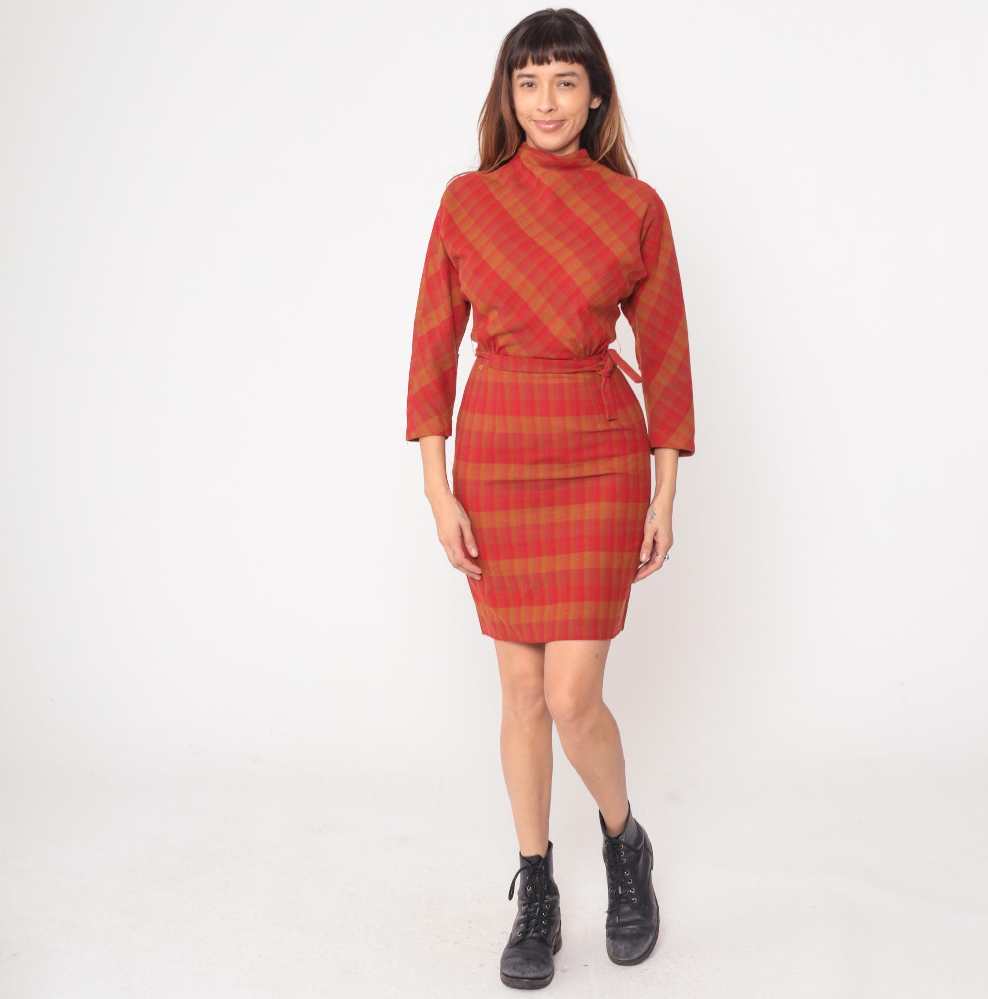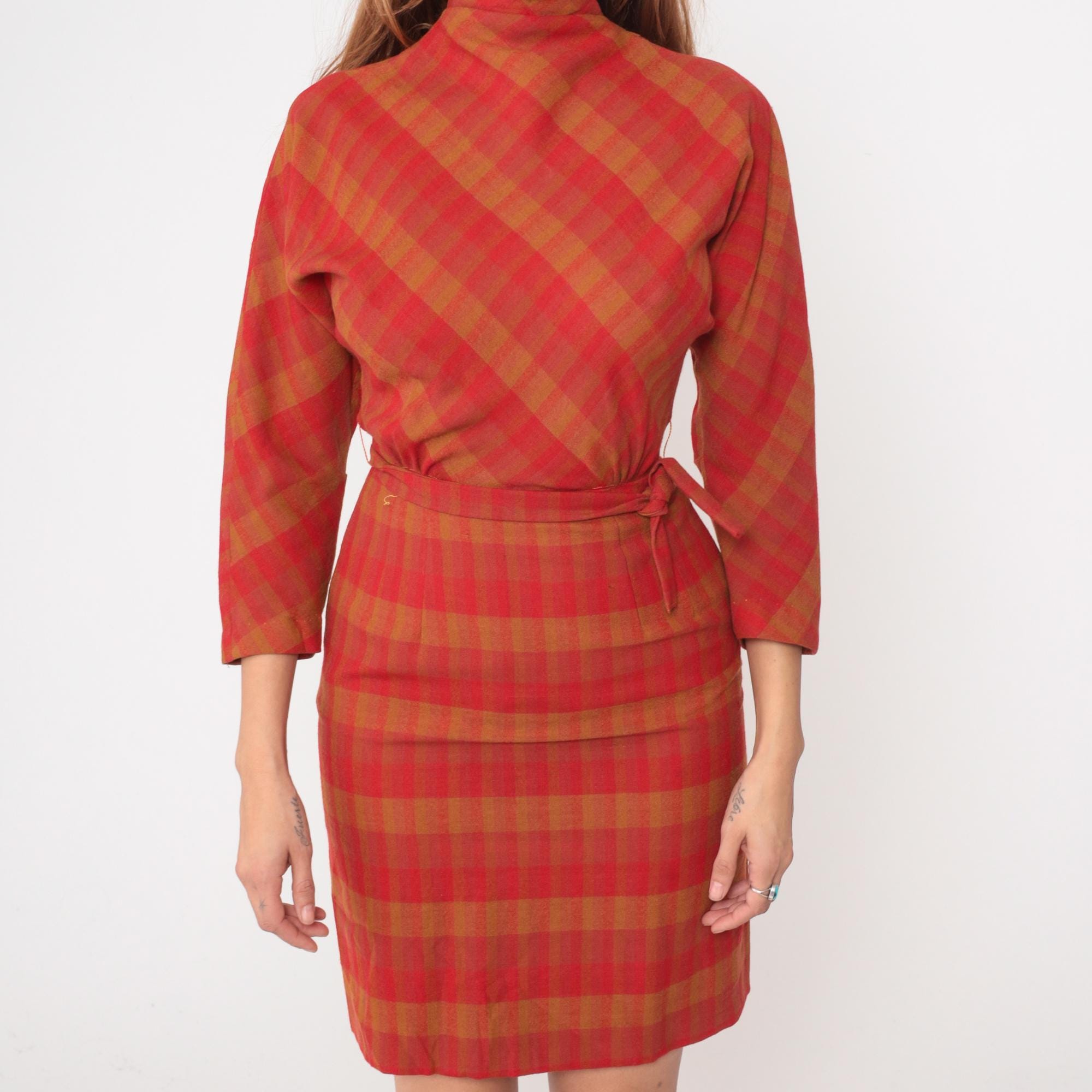60s red and orange buffalo check dress from Mr Mort with high mock neck collar and long sleeves. Wrap-style bodice with tie belt at waist, straight skirt with side seam pockets.