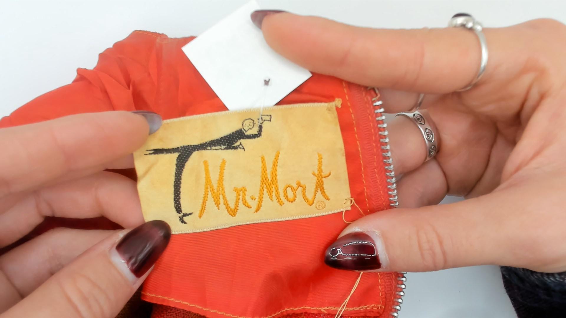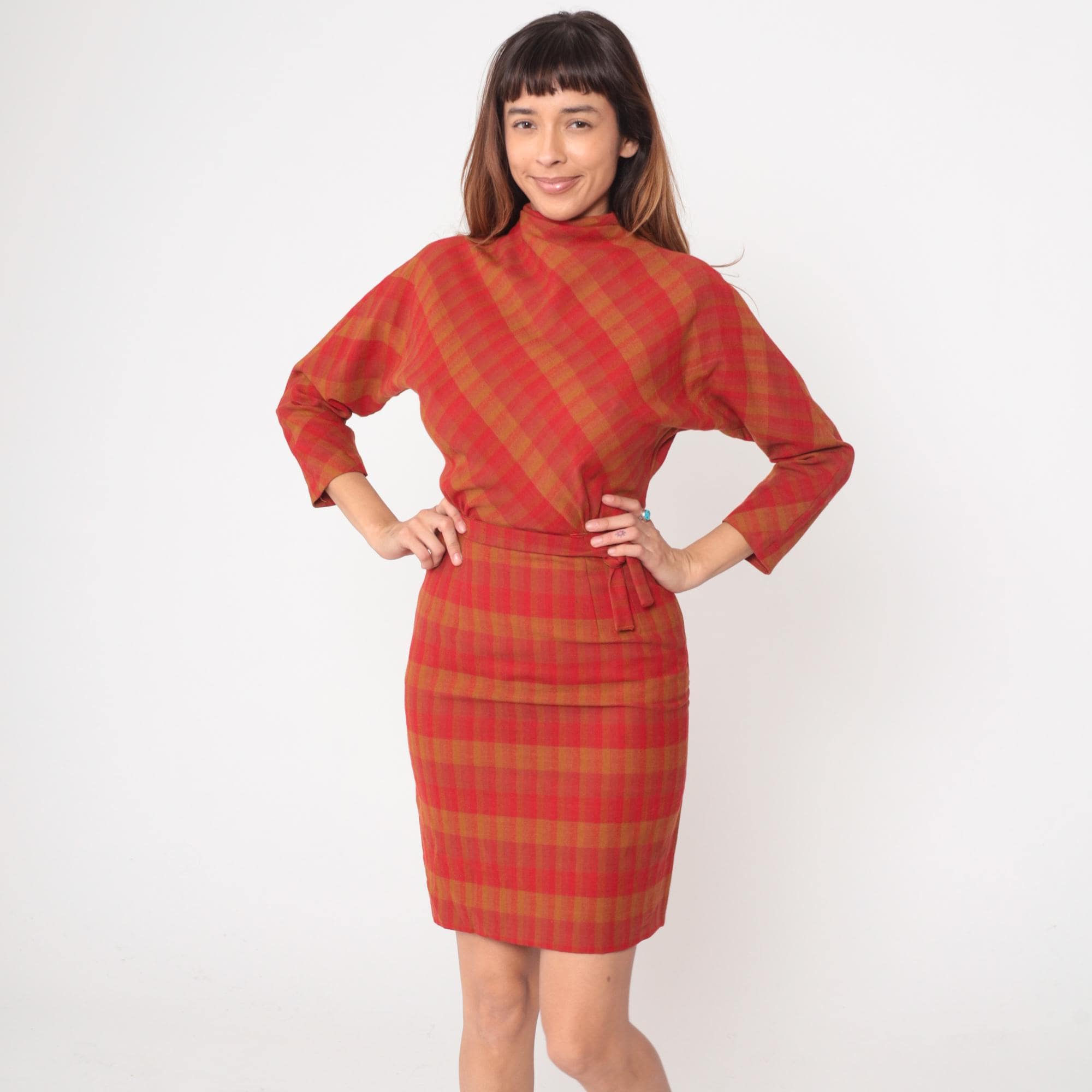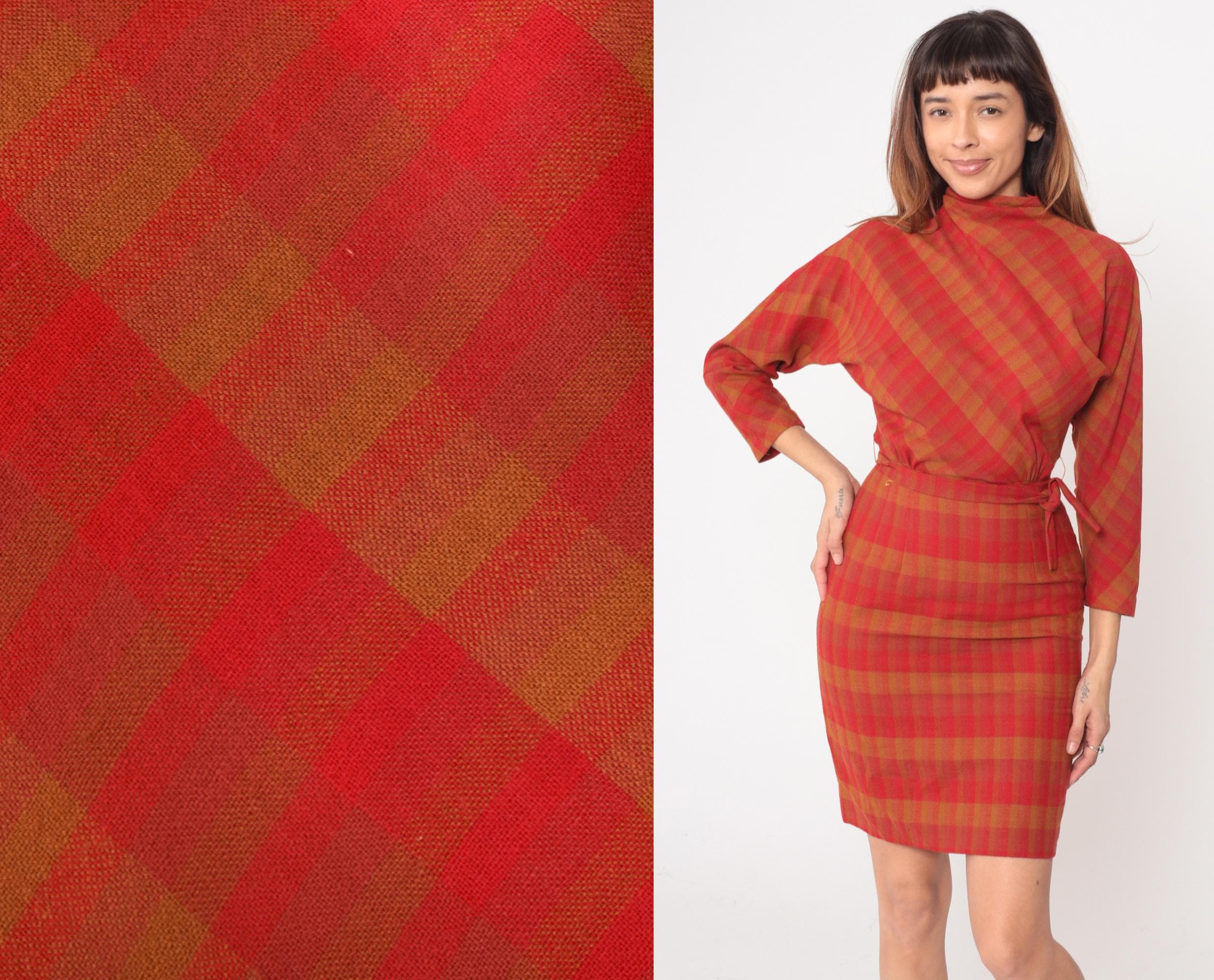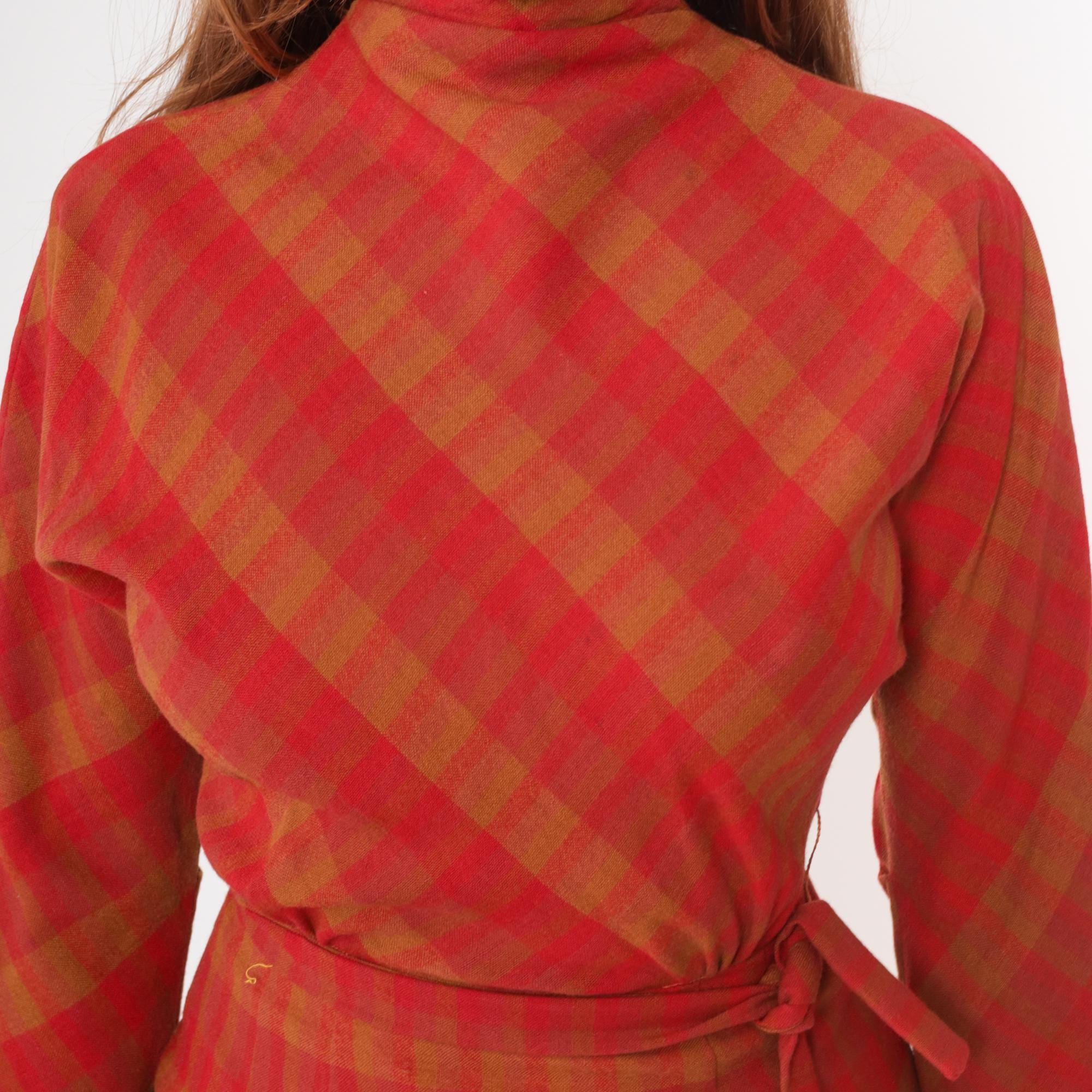 60s red and orange buffalo check dress from Mr Mort with high mock neck collar and long sleeves. Wrap-style bodice with tie belt at waist, straight skirt with side seam pockets.