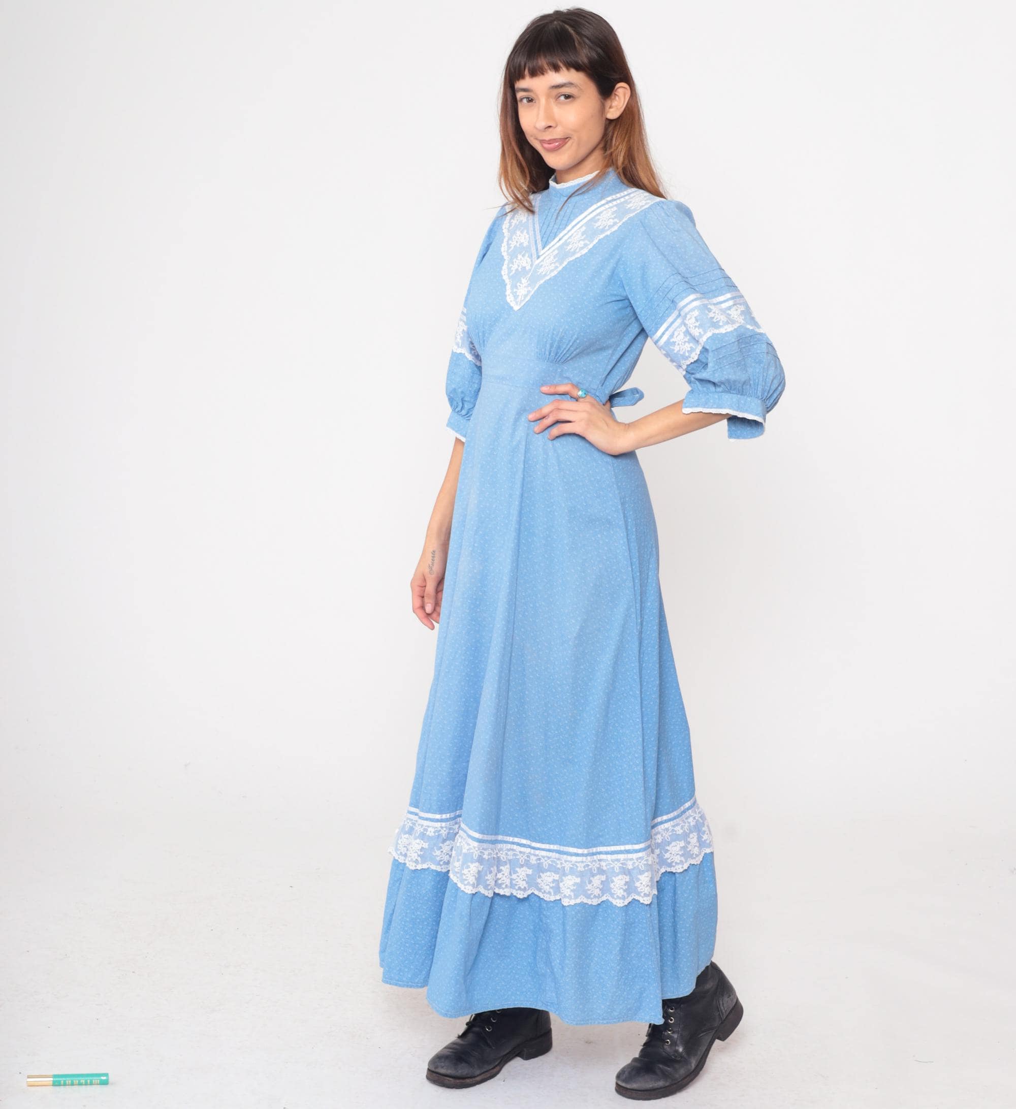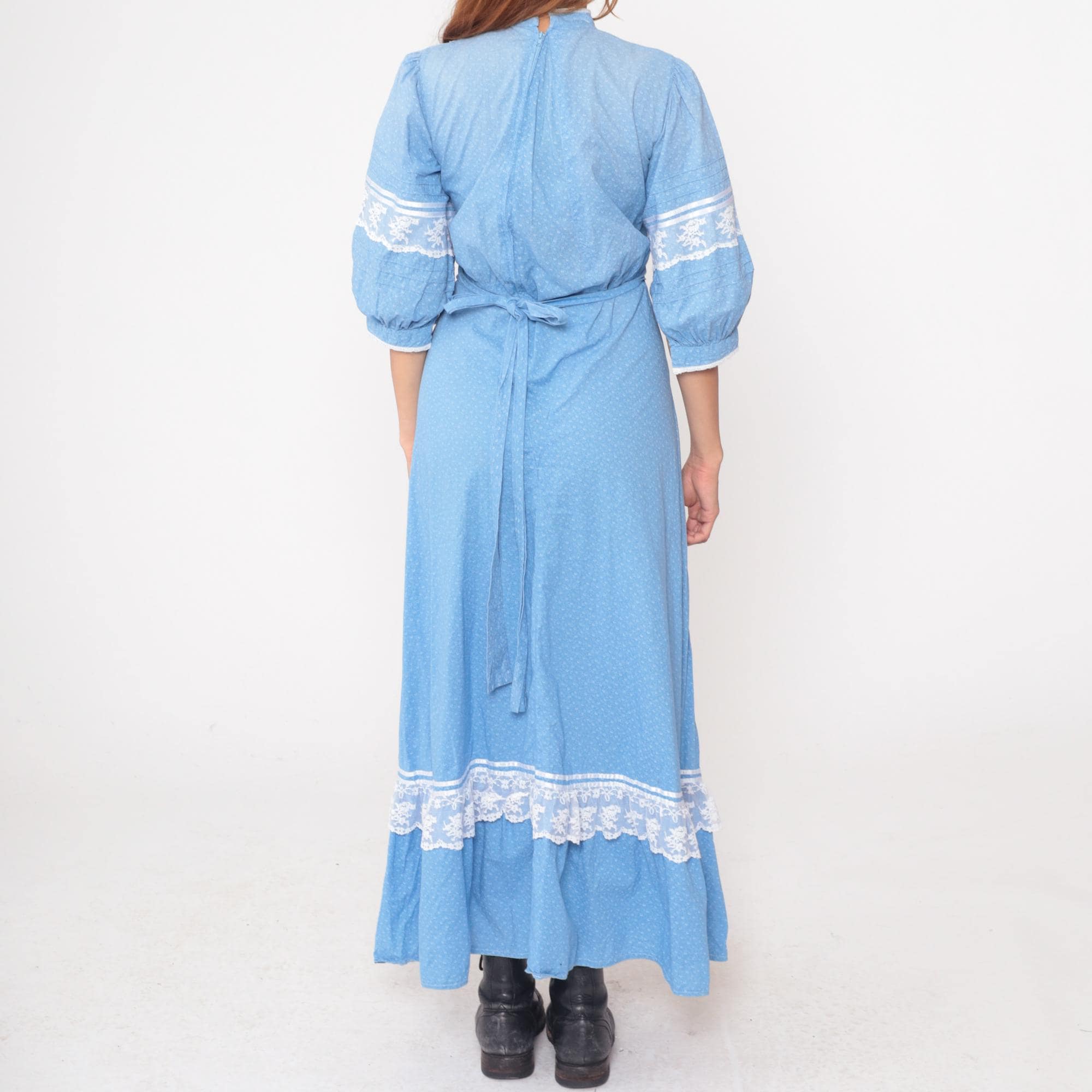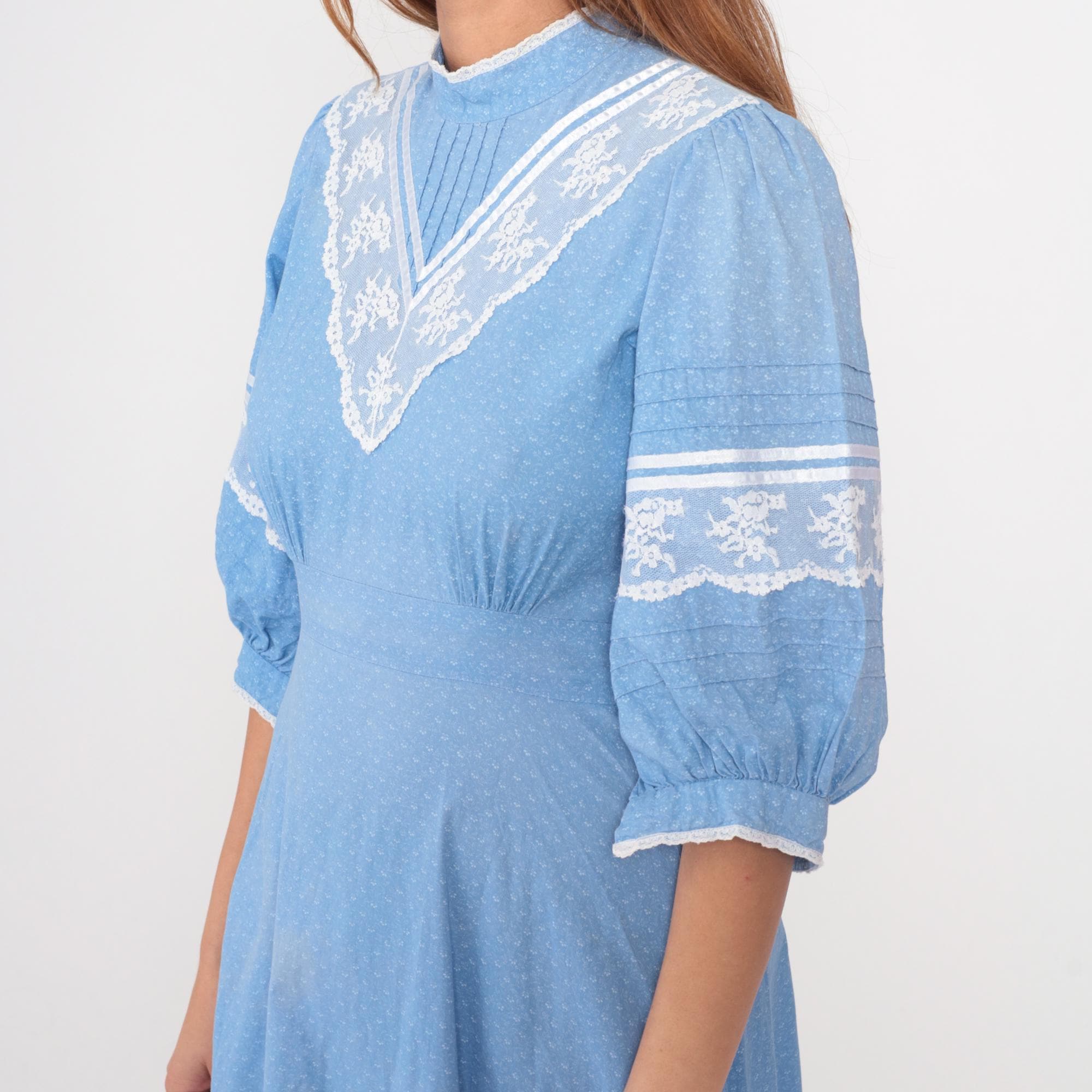 70s light blue prairie maxi dress with white lace trim throughout. High Victorian-style collar, white lace V-shaped yoke across chest and shoulders, white lace bands on three-quarter length puff sleeves. All-over small dot pattern, back tie closure, white lace trim and ruffle at hem.