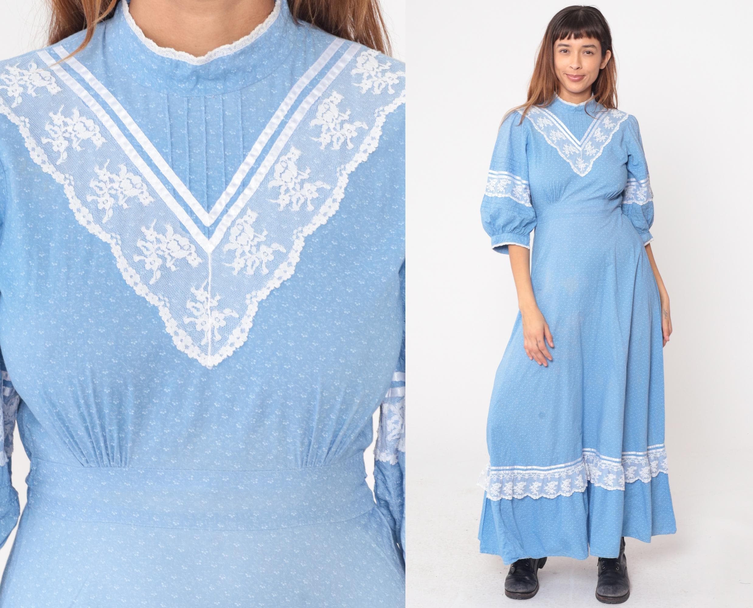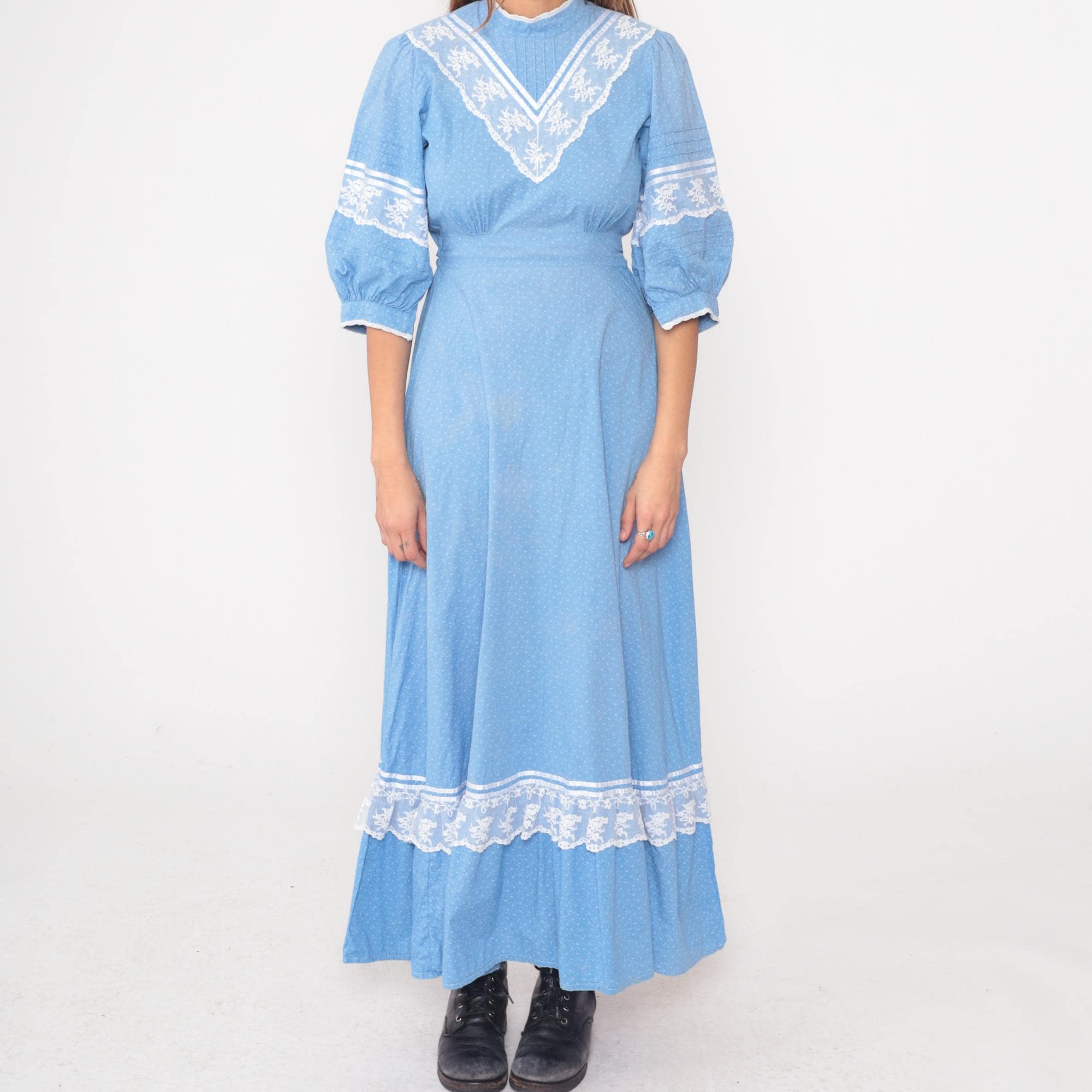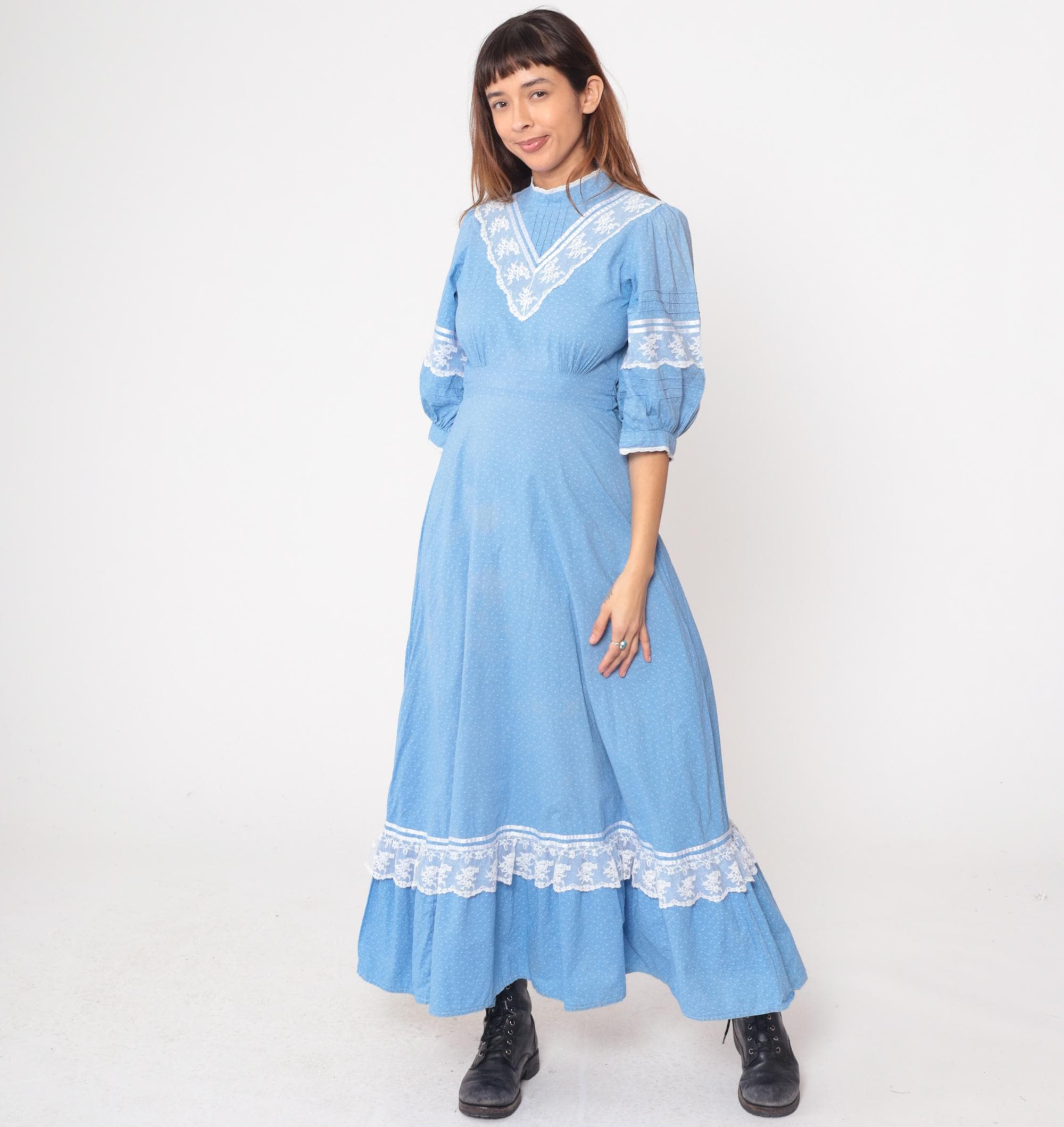 70s light blue prairie maxi dress with white lace trim throughout. High Victorian-style collar, white lace V-shaped yoke across chest and shoulders, white lace bands on three-quarter length puff sleeves. All-over small dot pattern, back tie closure, white lace trim and ruffle at hem.