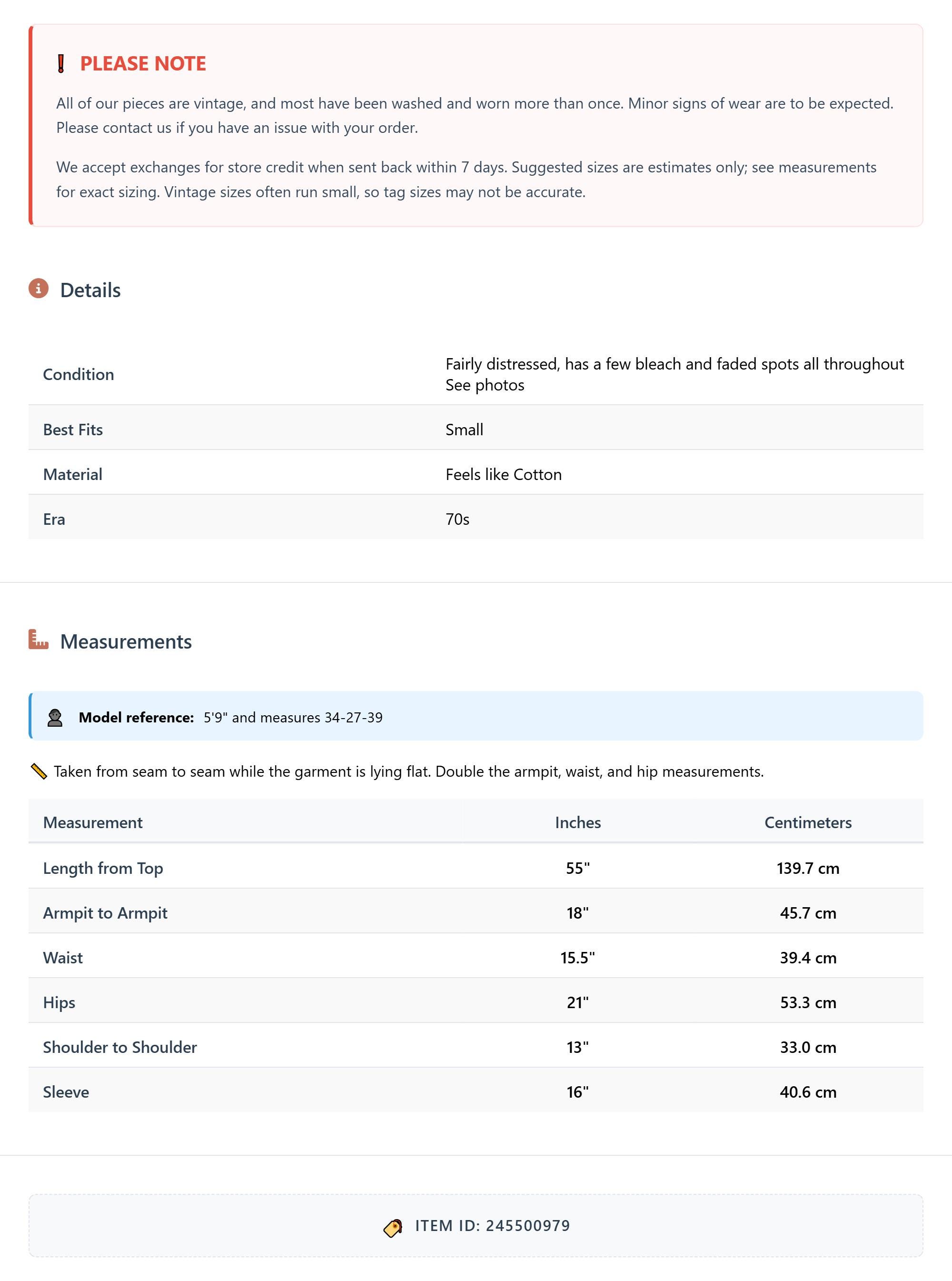 All of our pieces are vintage, and most have been washed and worn more than once. Minor signs of wear are to be expected. Please contact us if you have an issue with your order. We accept exchanges for store credit when sent back within 7 days.