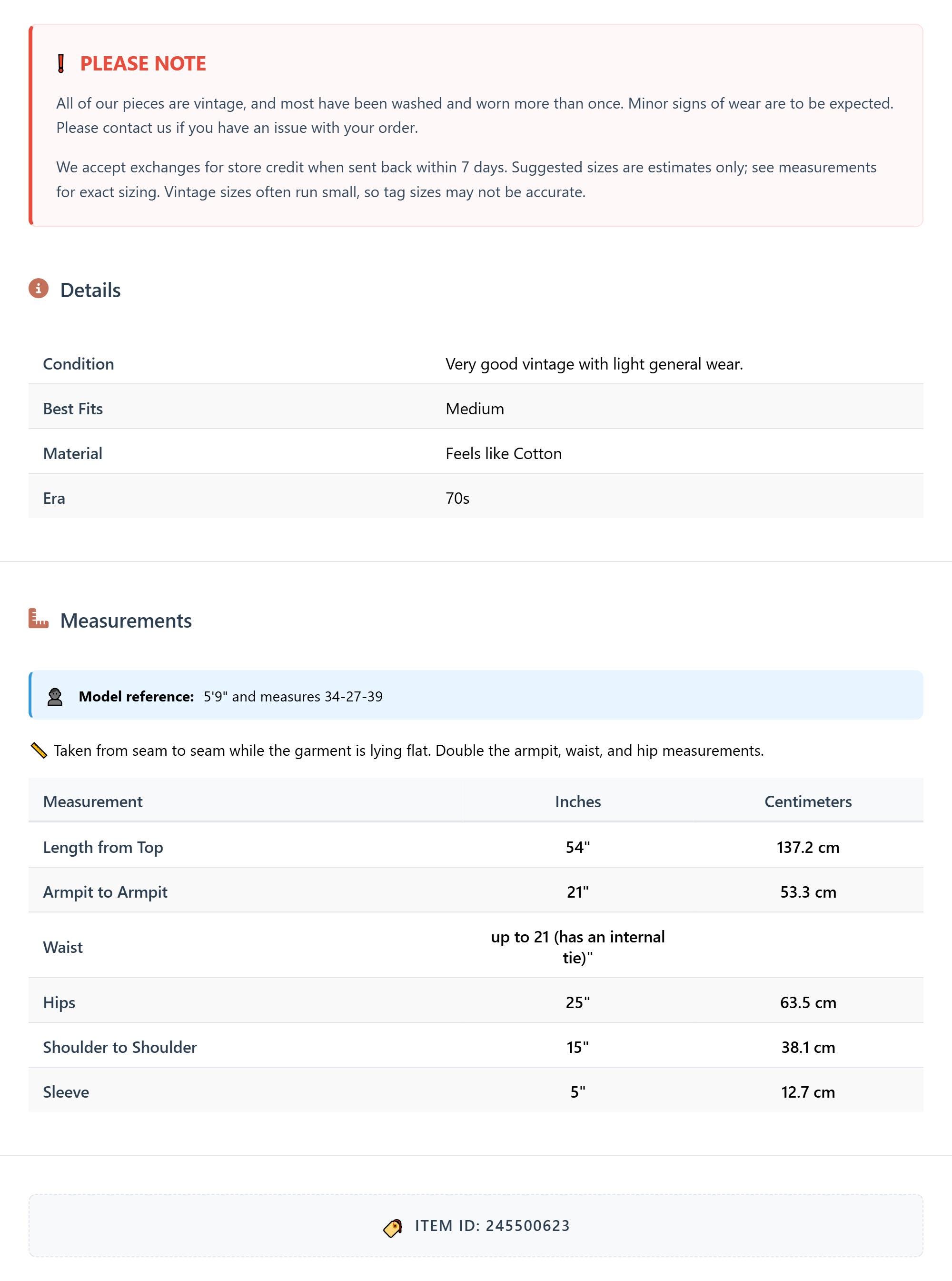 All of our pieces are vintage, and most have been washed and worn more than once. Minor signs of wear are to be expected. Please contact us if you have an issue with your order. We accept exchanges for store credit when sent back within 7 days.