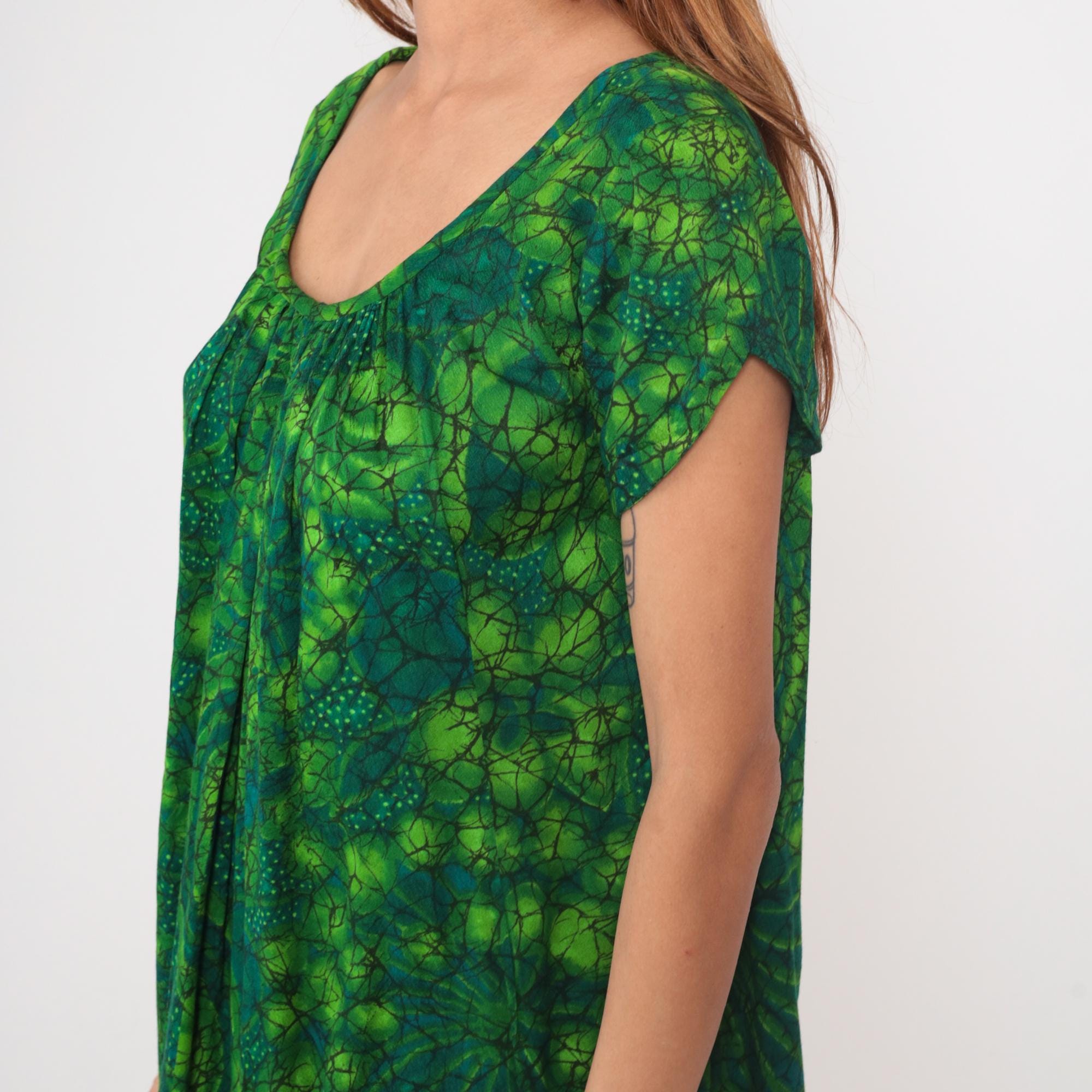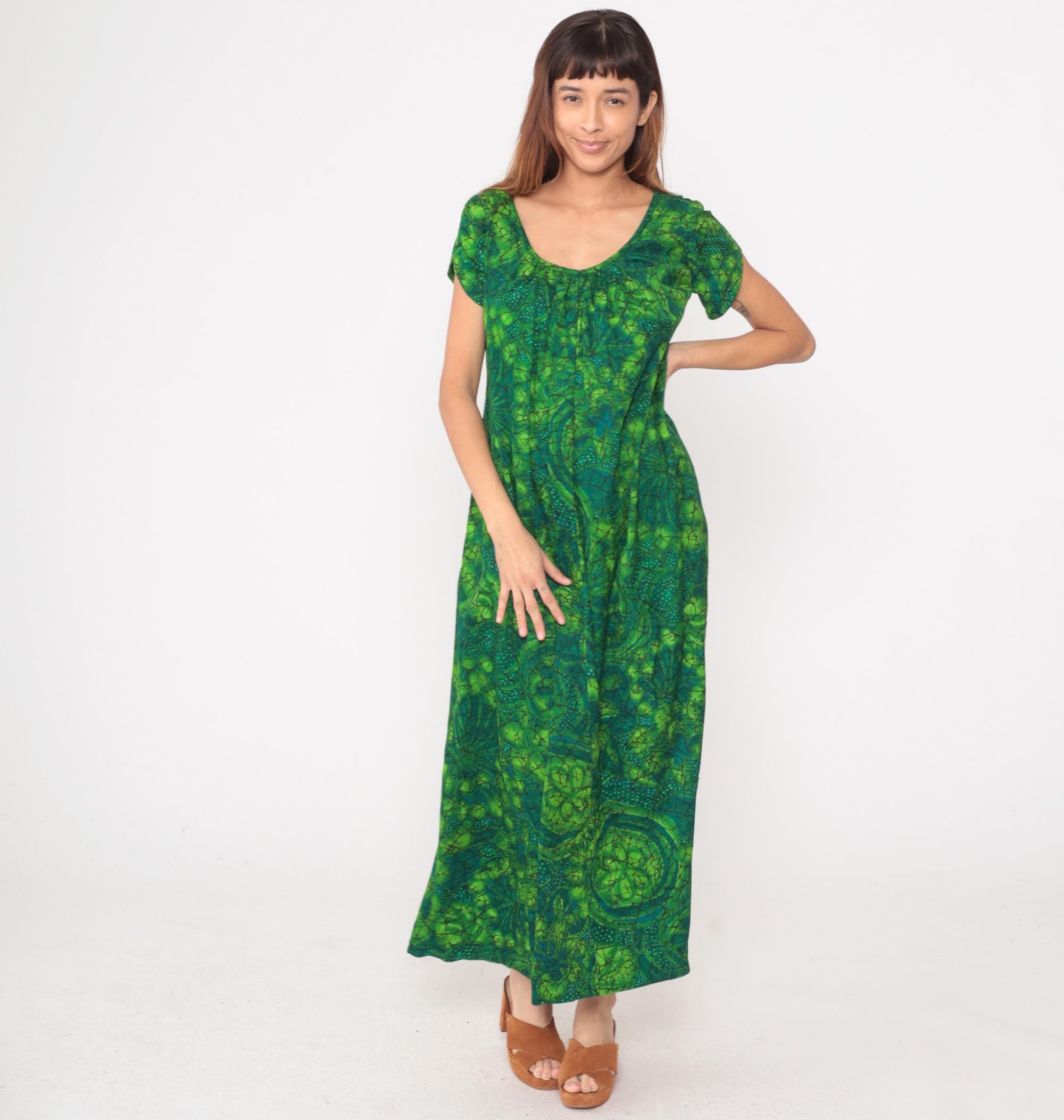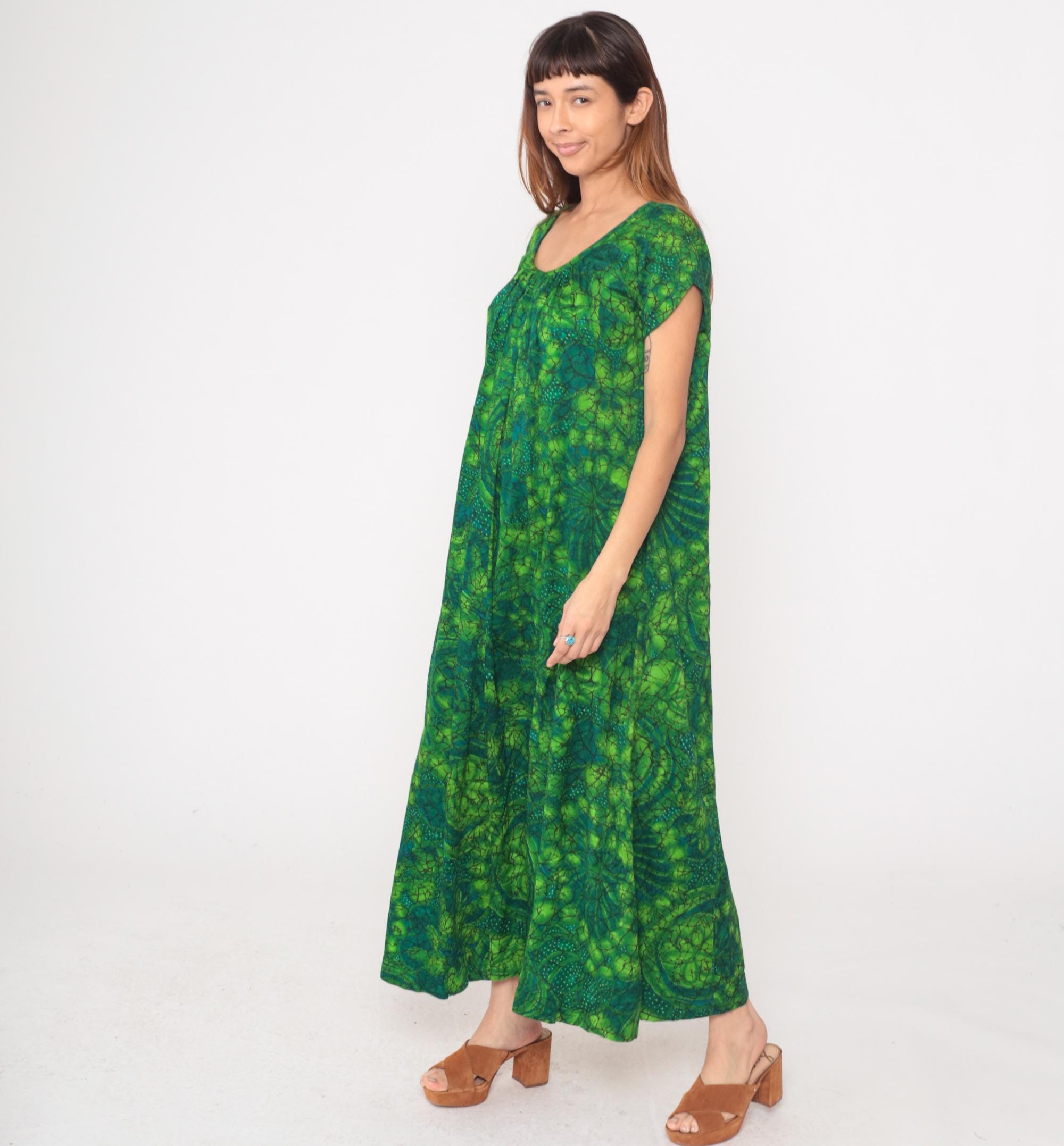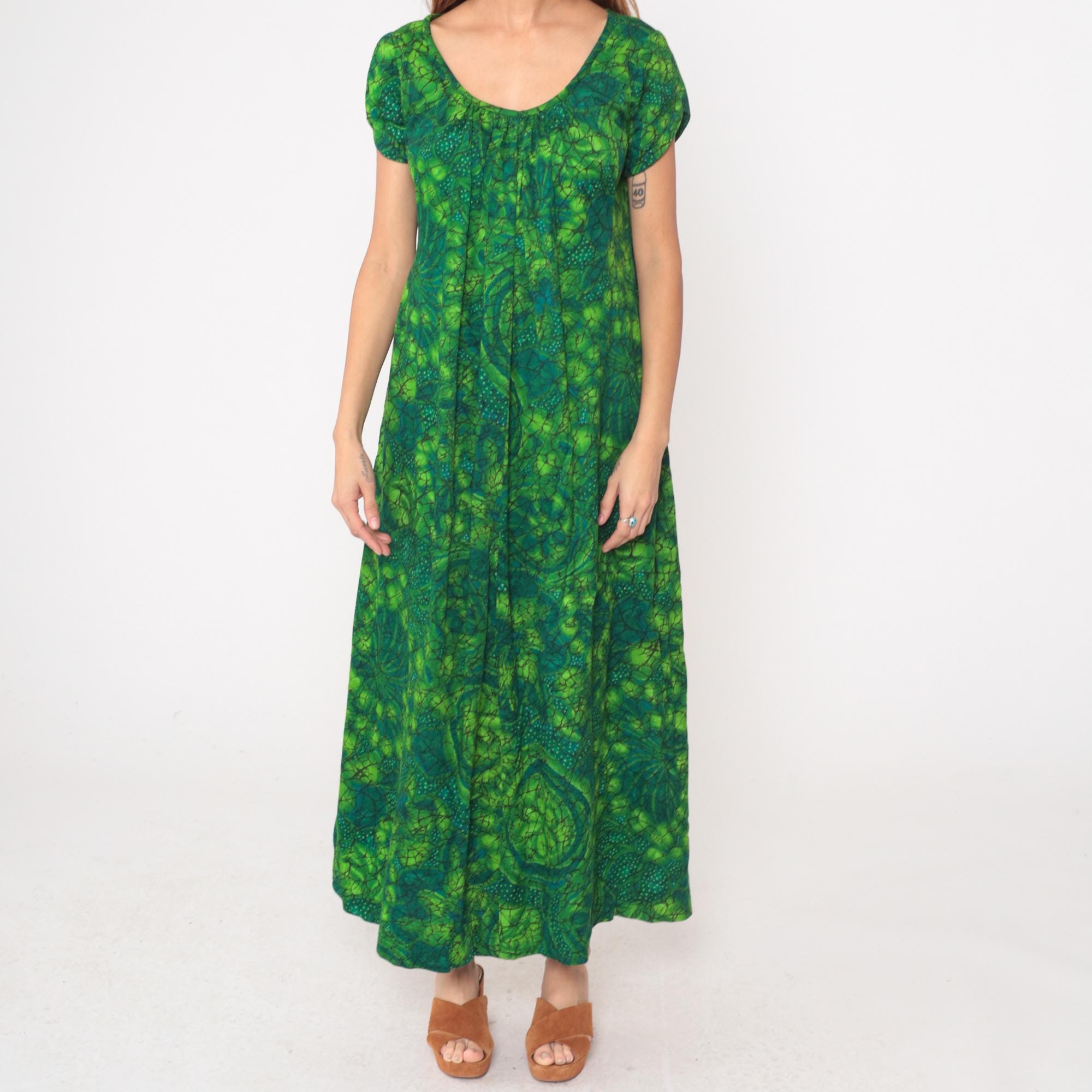 70s green maxi dress with abstract batik-style paisley print in lime, forest, emerald, and teal tones. Scoop neckline with gathered detail below the bust, short cap sleeves, empire waist with A-line maxi skirt.