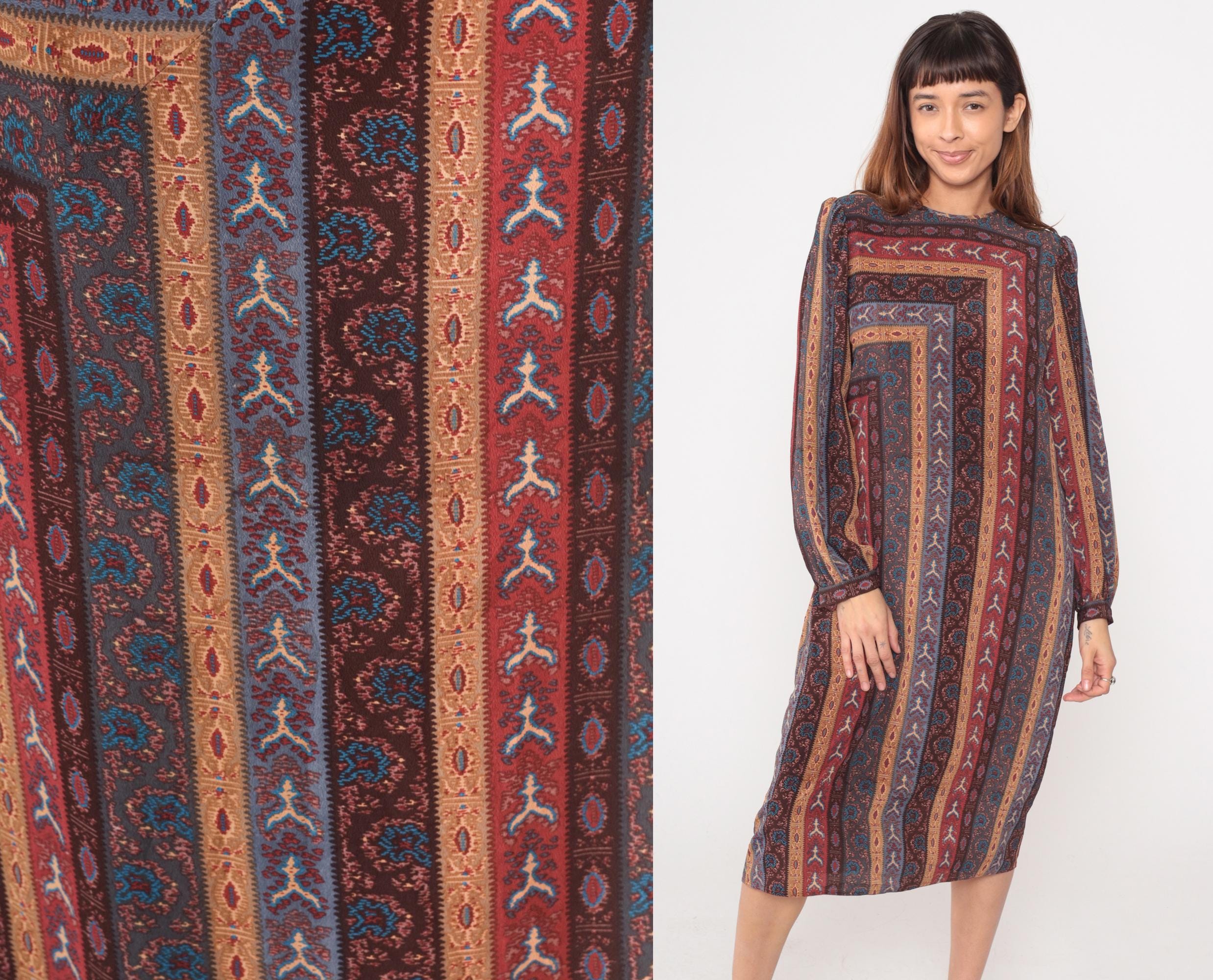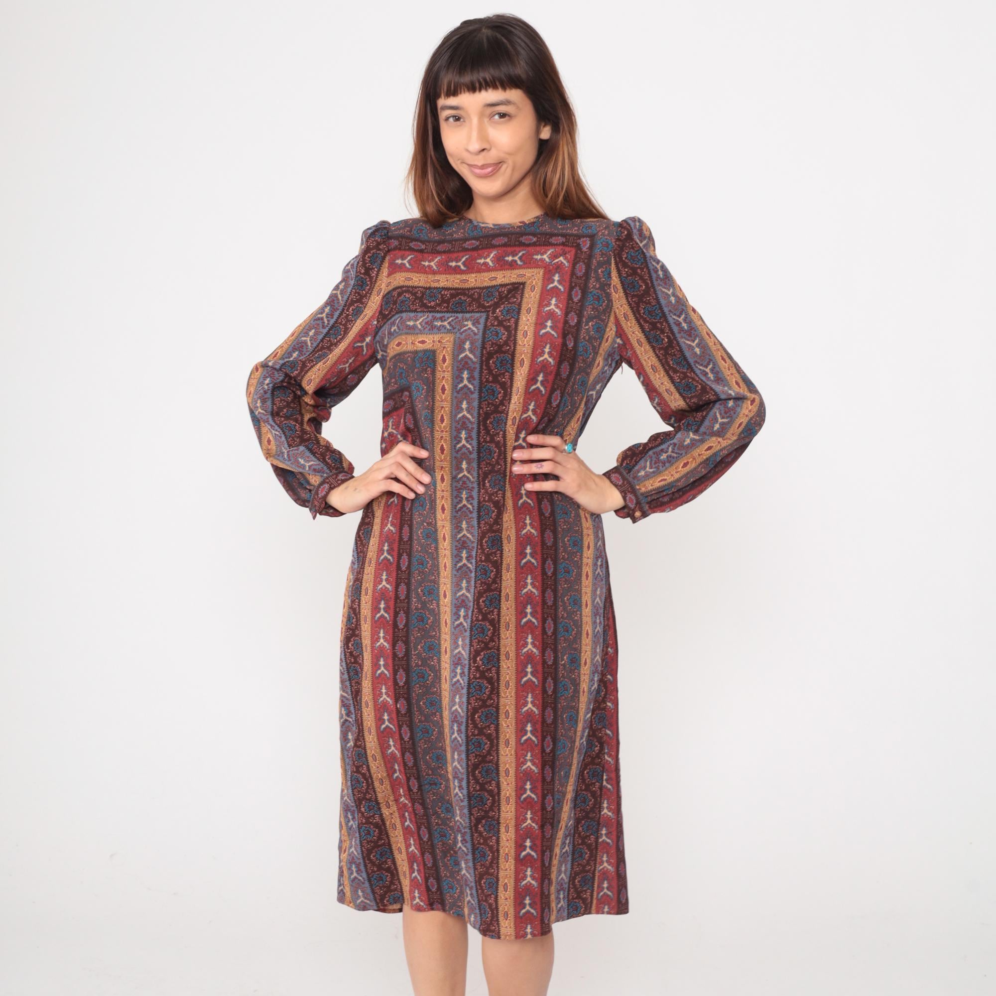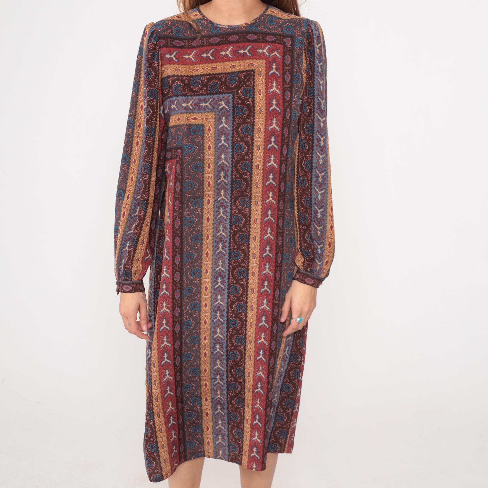 80s midi dress from Leslie Fay with geometric striped pattern in burgundy, rust, blue, brown, and tan forming concentric rectangles across the fabric. Long sleeves with gathered elastic cuffs, crew neckline, and relaxed shift silhouette.