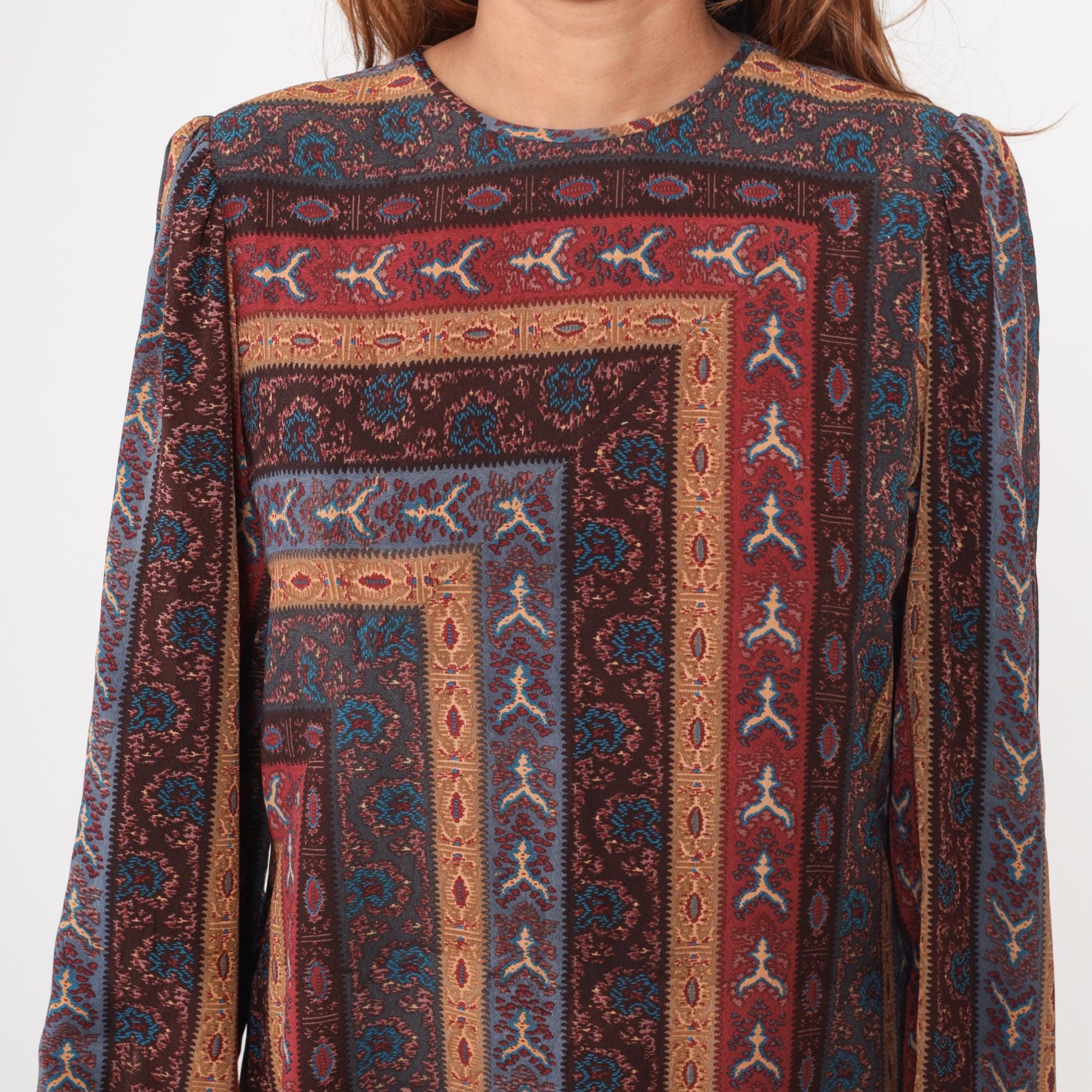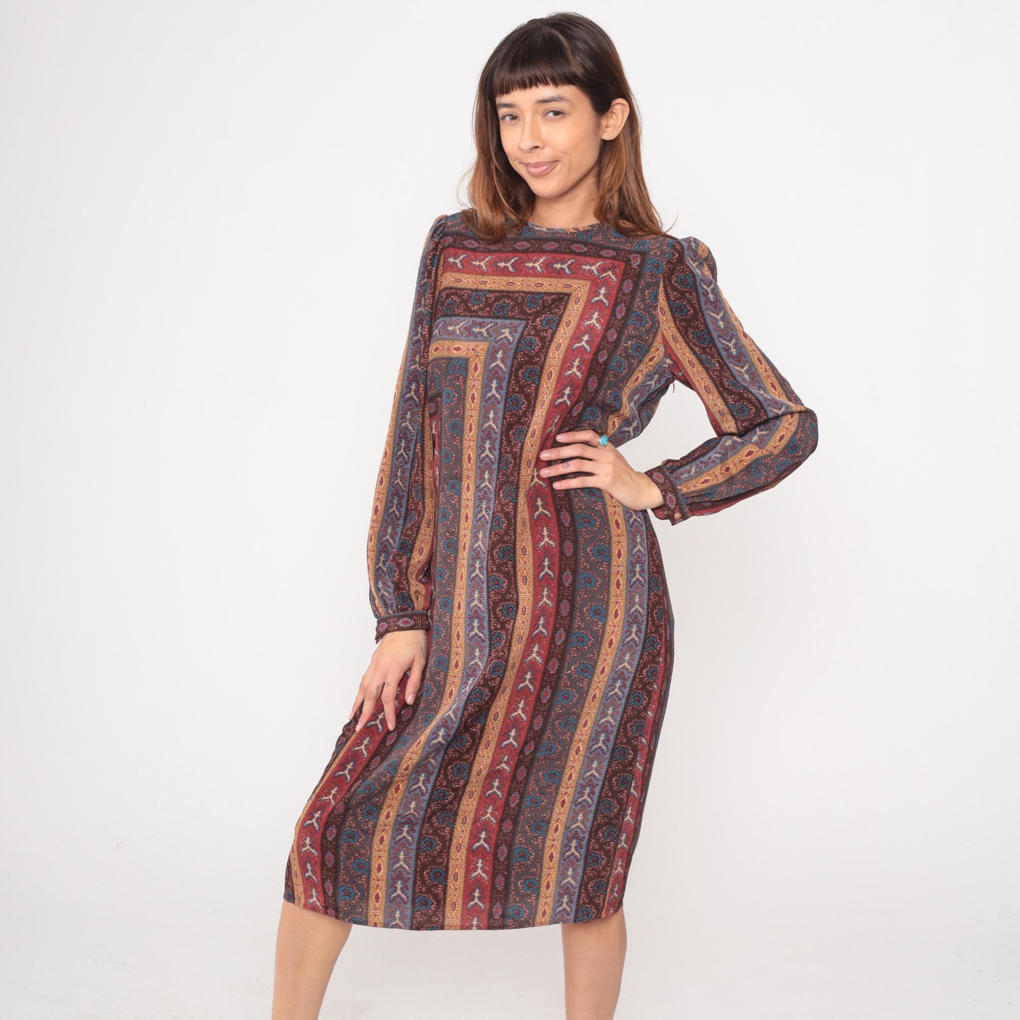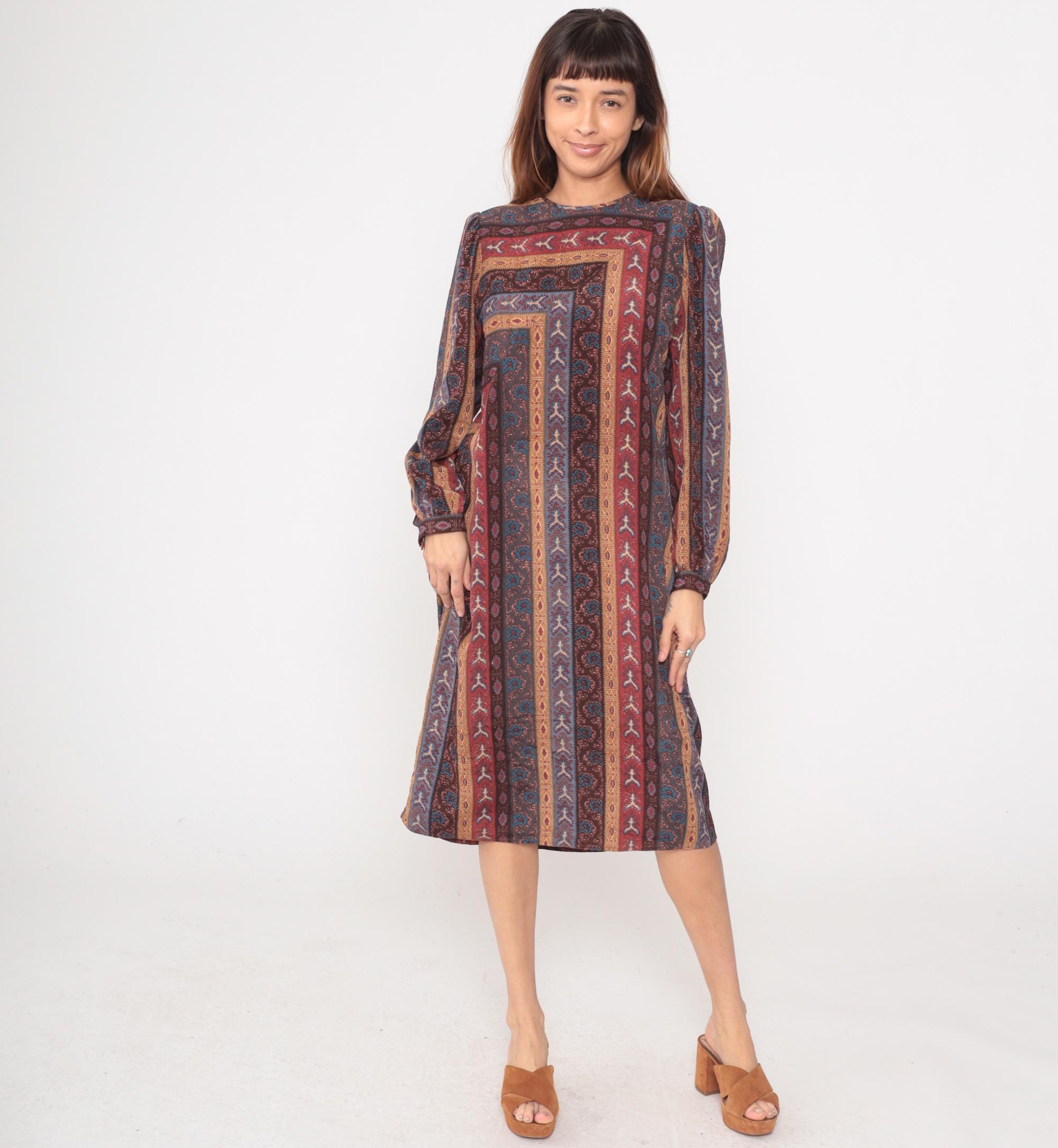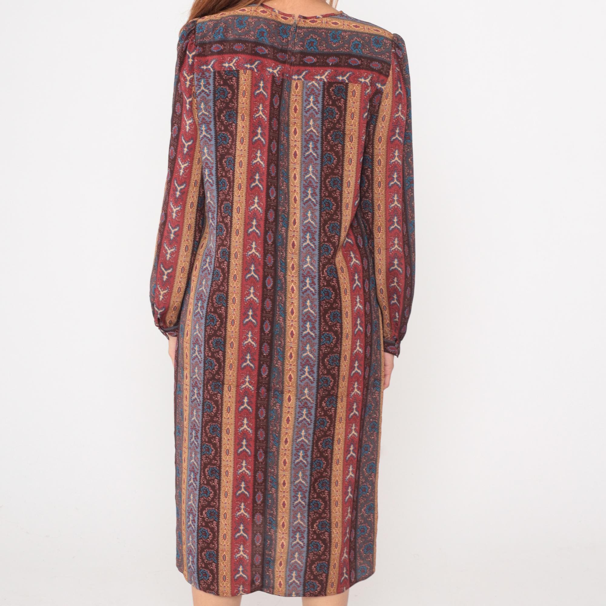 80s midi dress from Leslie Fay with geometric striped pattern in burgundy, rust, blue, brown, and tan forming concentric rectangles across the fabric. Long sleeves with gathered elastic cuffs, crew neckline, and relaxed shift silhouette.