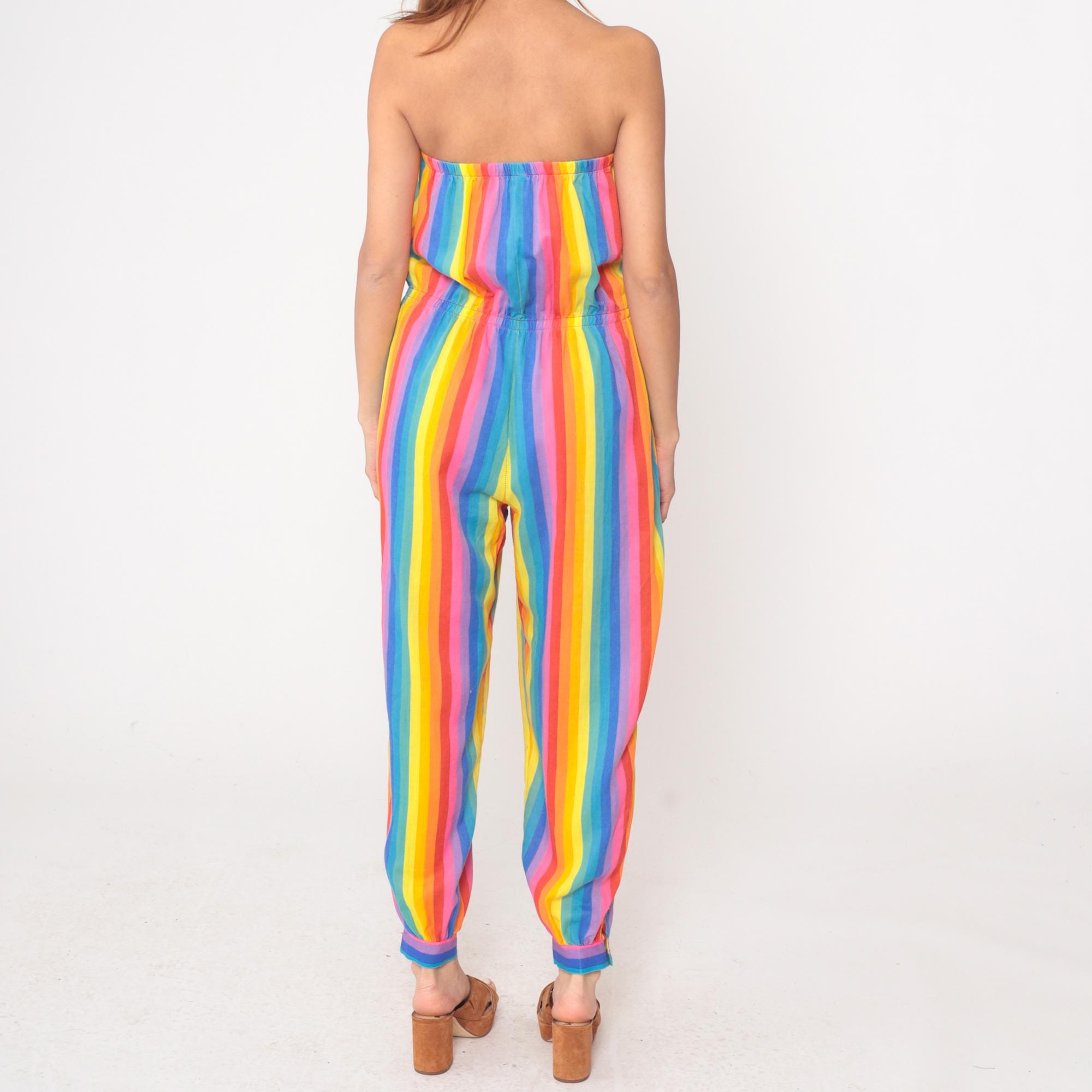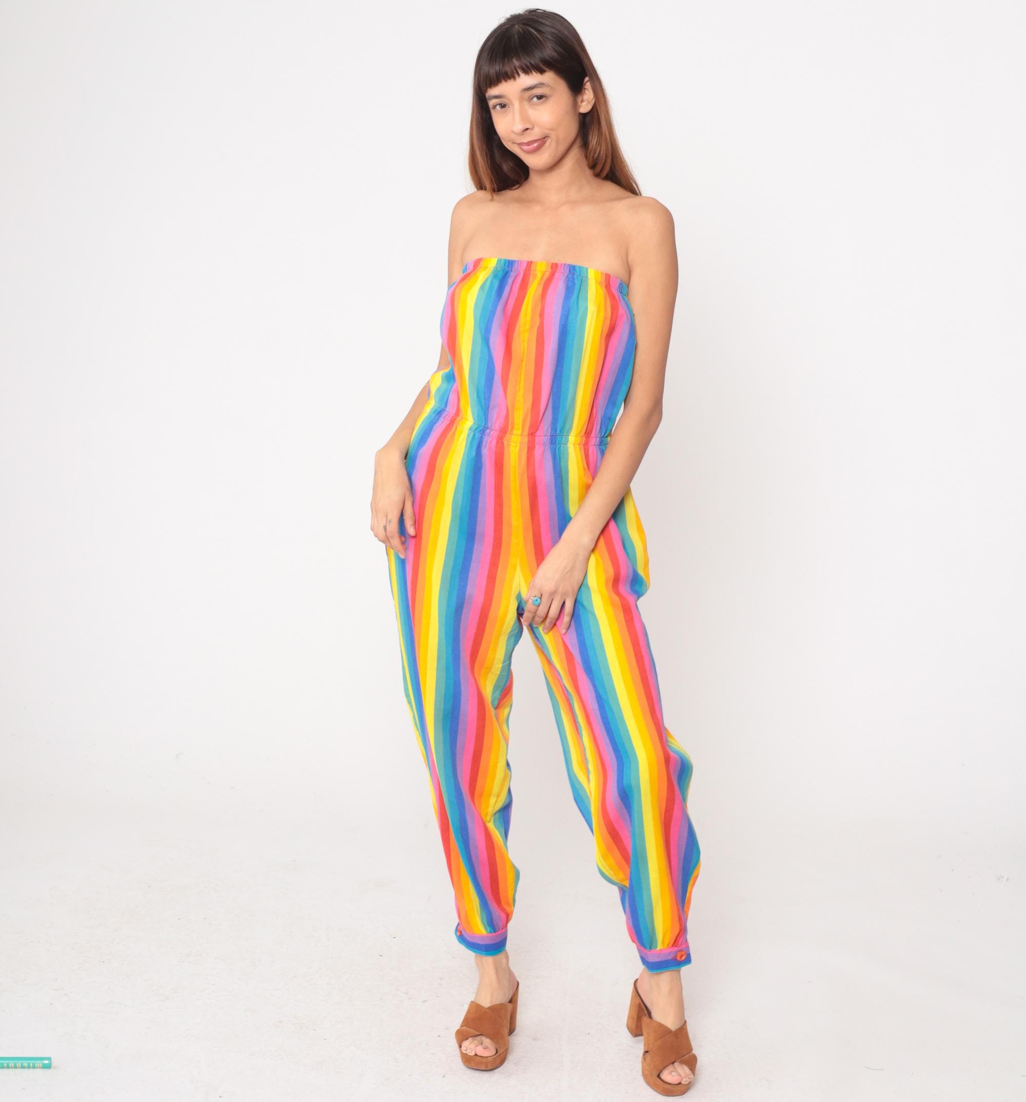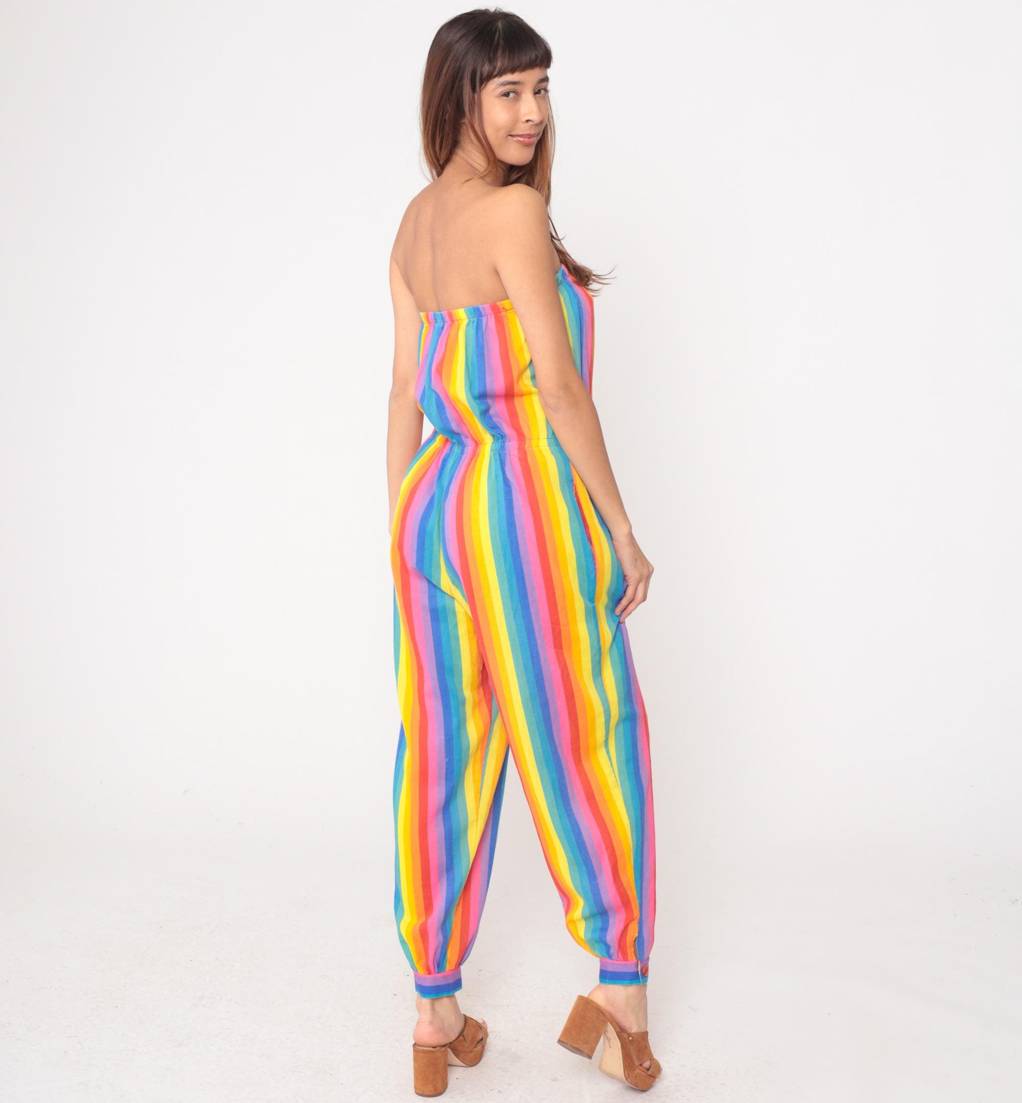 80s rainbow striped strapless jumpsuit with vertical stripes in pink, purple, blue, yellow, orange, and red. Tube top bodice with elastic at top edge, elastic waistband, tapered legs with blue ribbed cuffs at ankles.