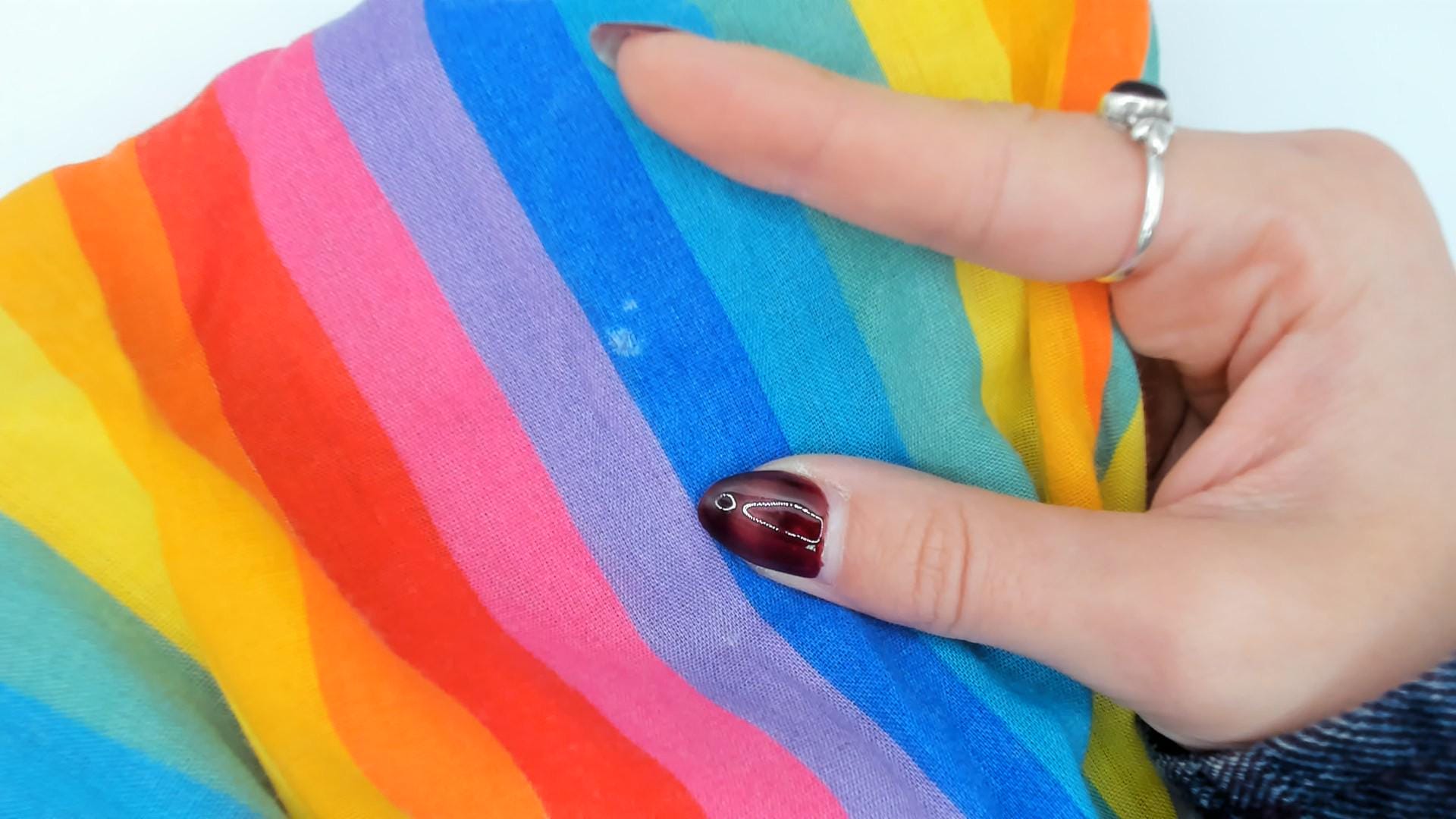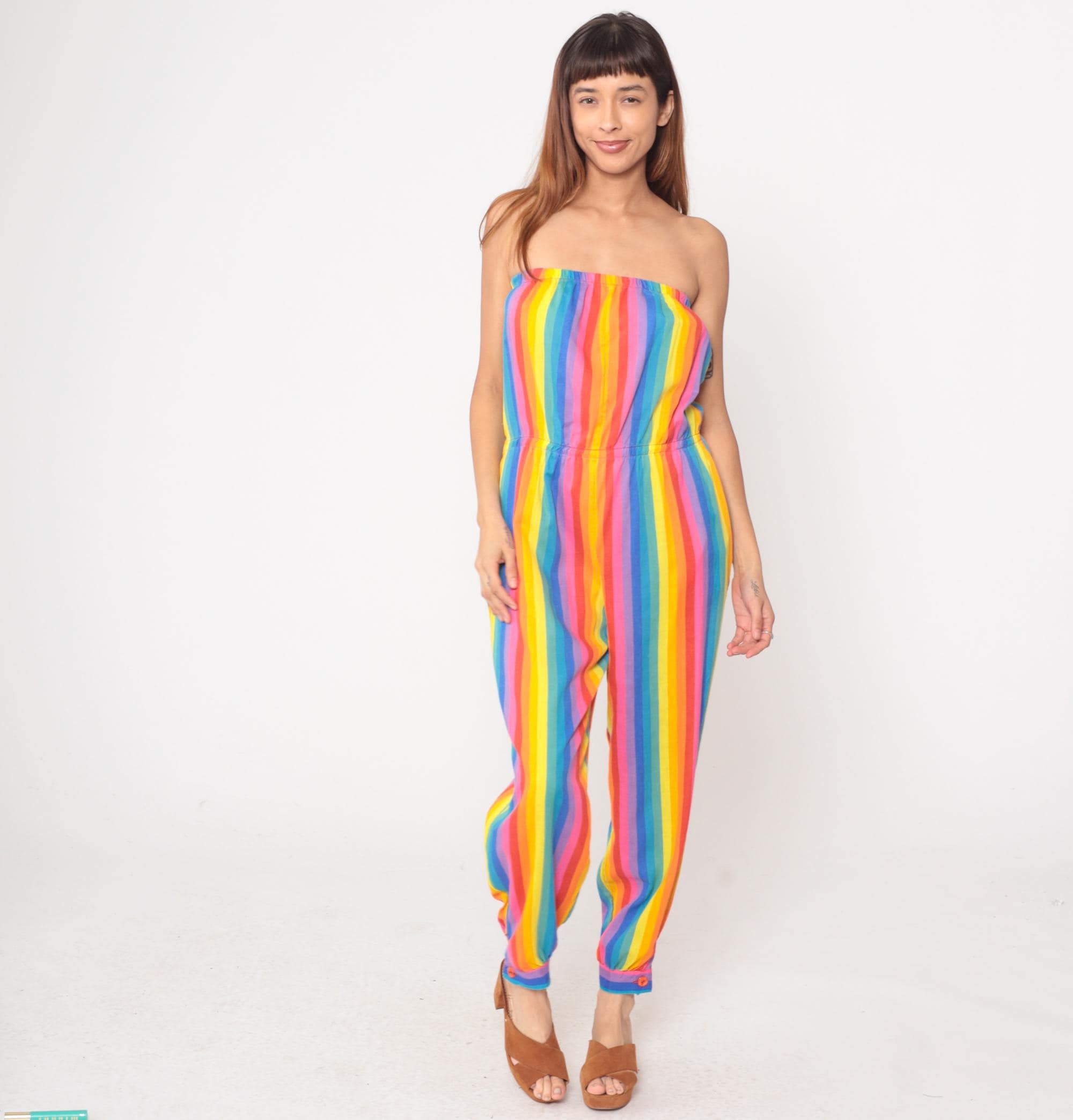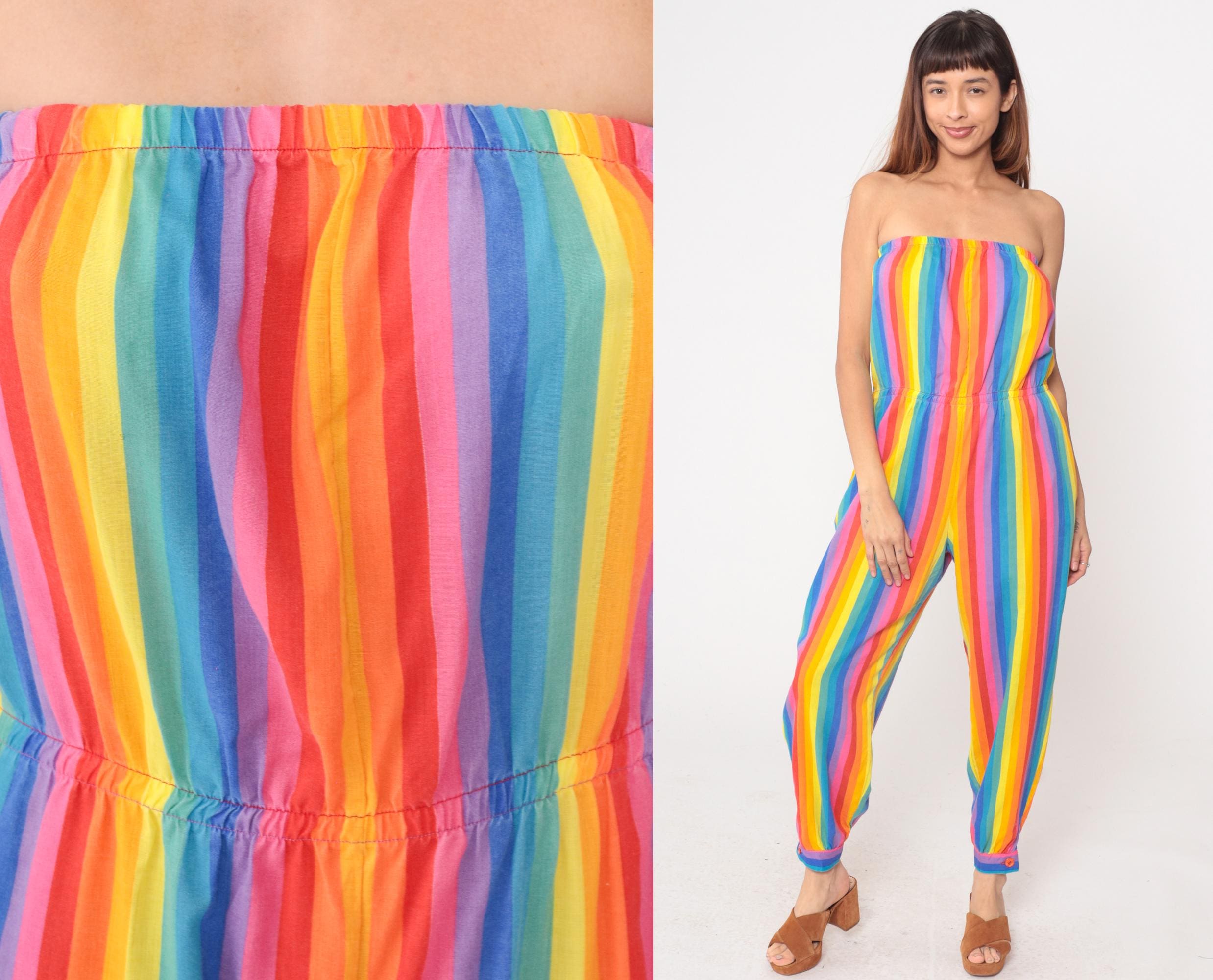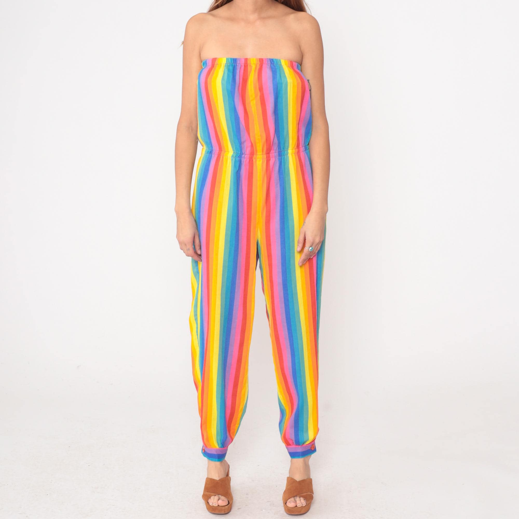 80s rainbow striped strapless jumpsuit with vertical stripes in pink, purple, blue, yellow, orange, and red. Tube top bodice with elastic at top edge, elastic waistband, tapered legs with blue ribbed cuffs at ankles.