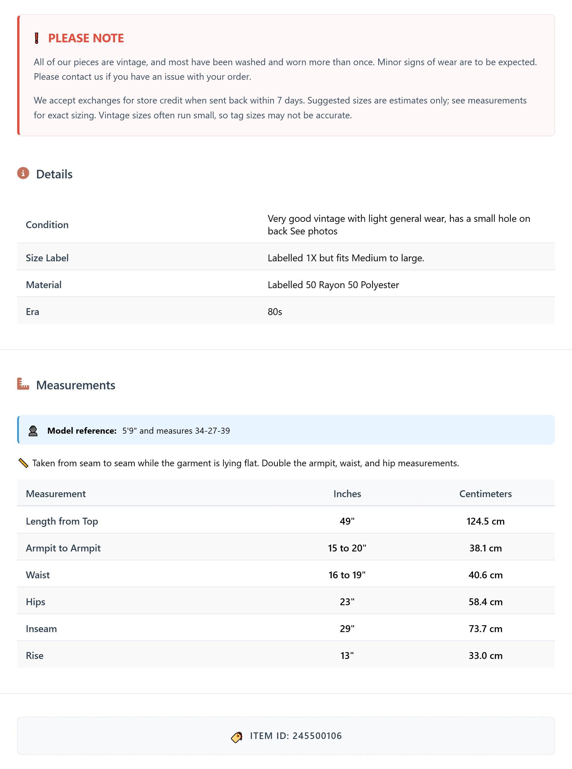 Suggested sizes are estimates only; see measurements for exact sizing. Vintage sizes often run small, so tag sizes may not be accurate.