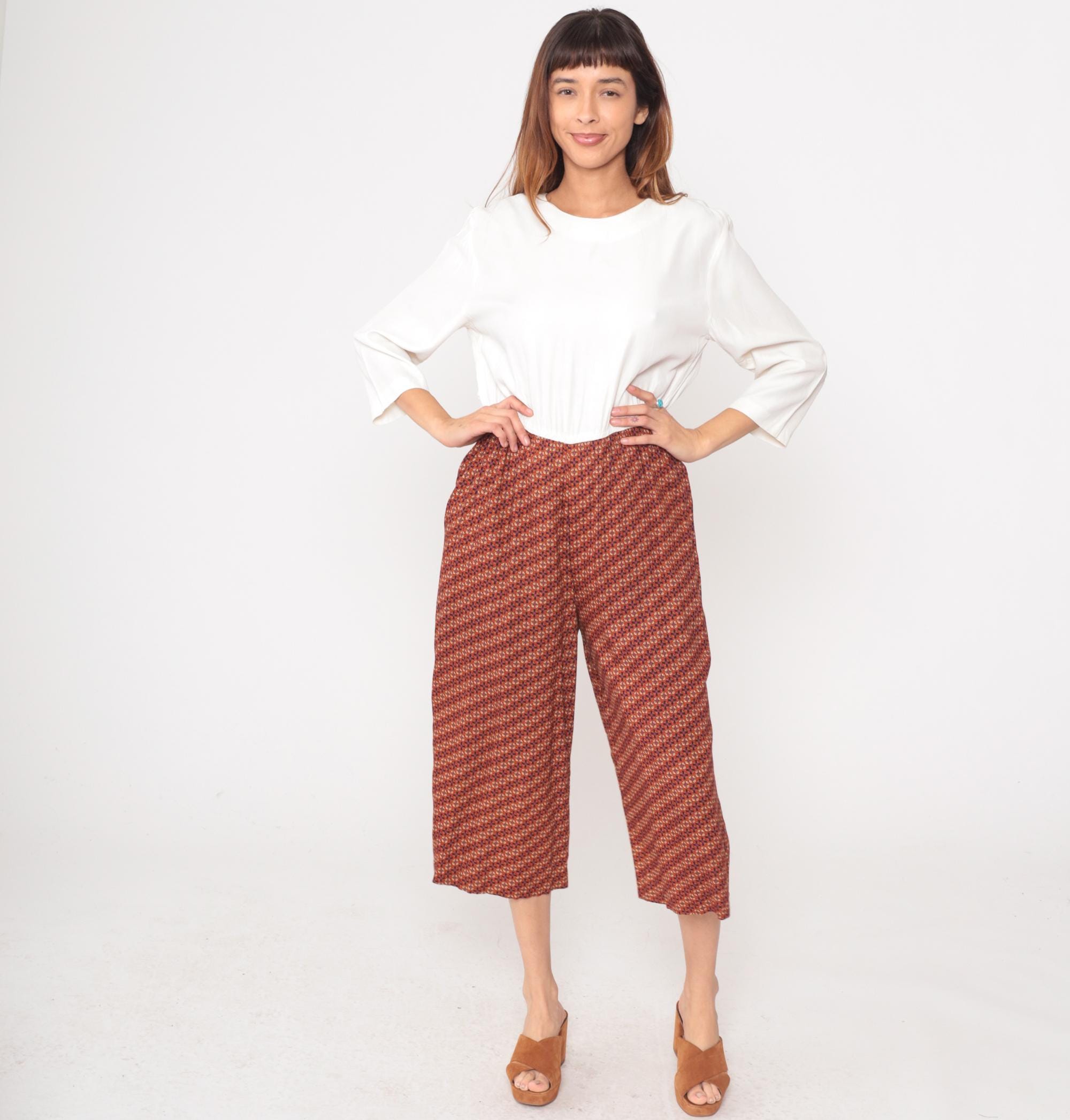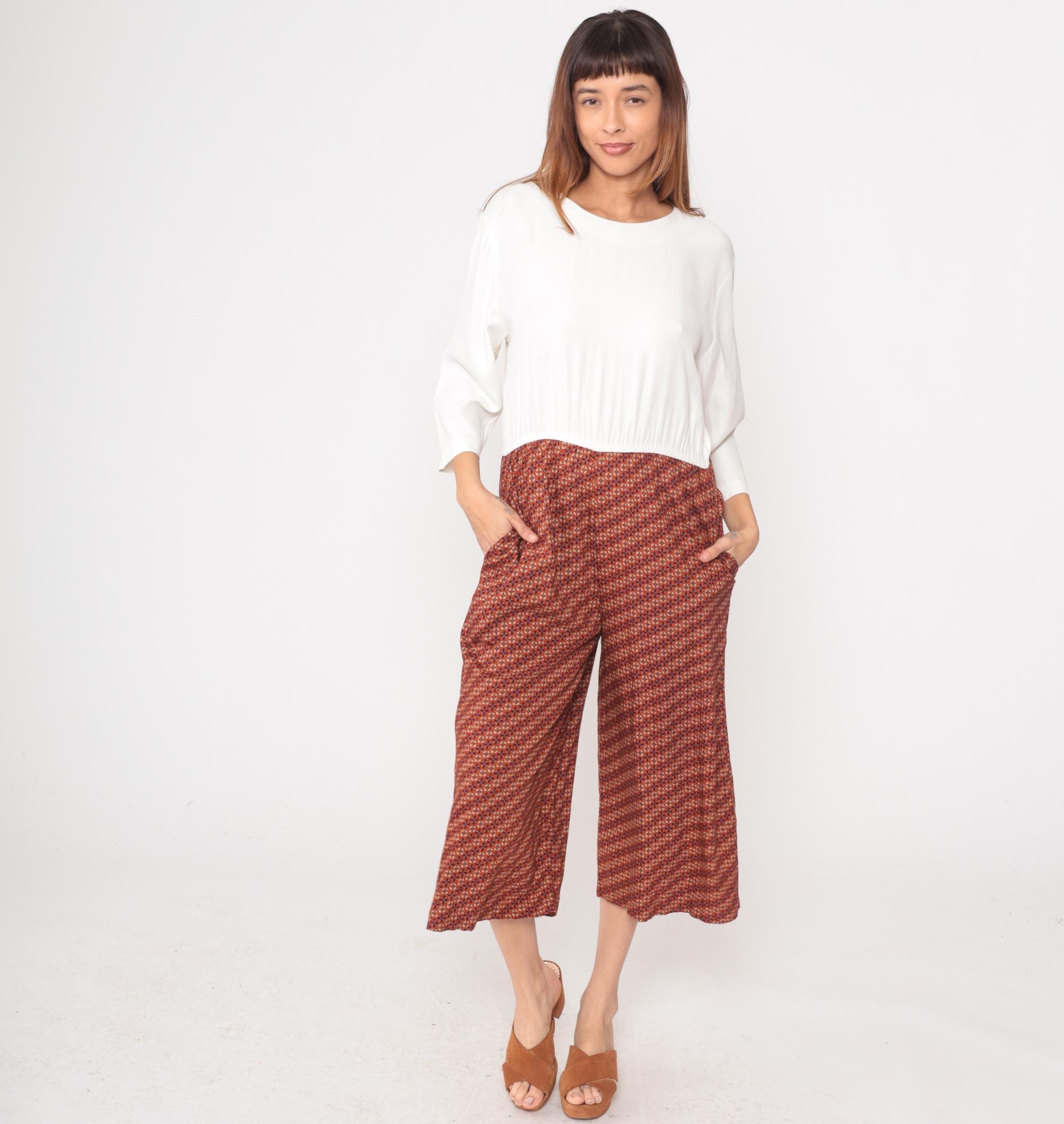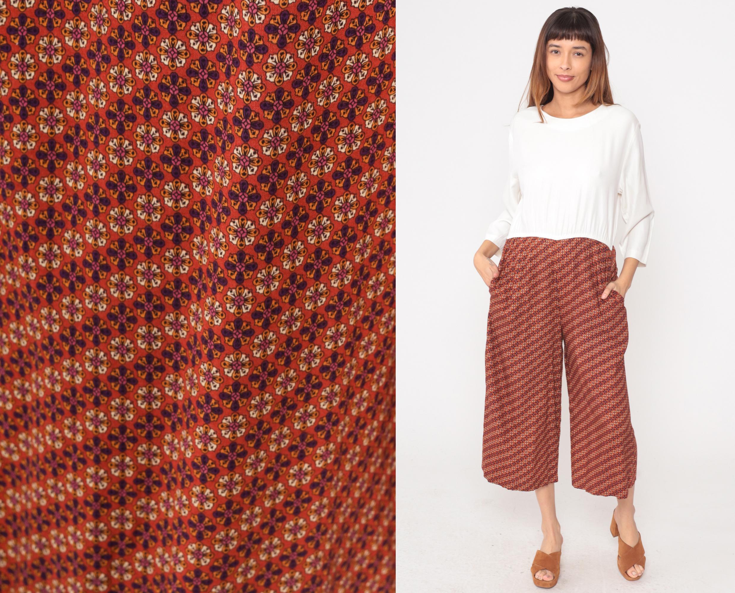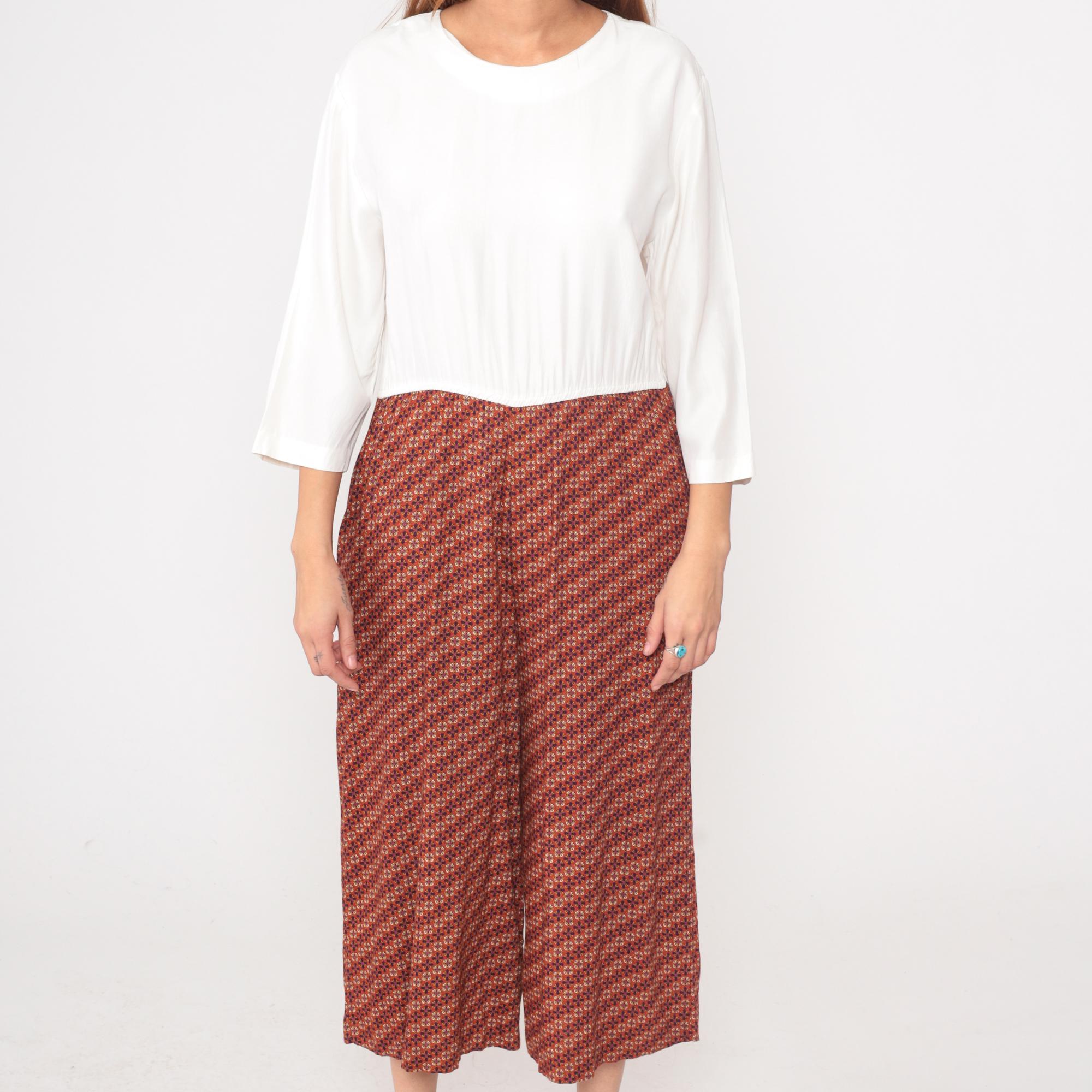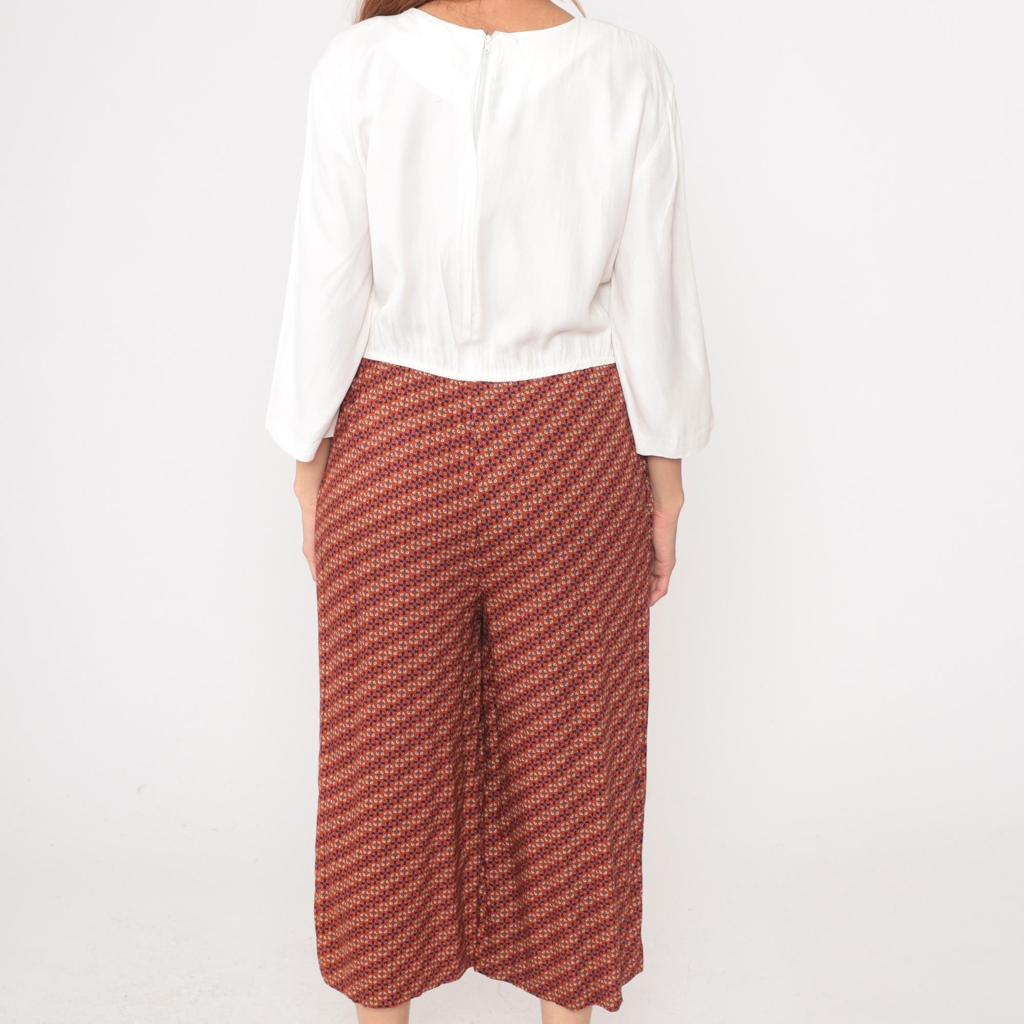 80s one-piece jumpsuit from Dawn Joy Fashions with white blouse bodice and orange floral wide-leg culottes. Long sleeves with elastic cuffs, elastic waist, back zipper closure. Cropped wide-leg pants in rust orange with small scattered floral pattern in red, yellow, and purple.