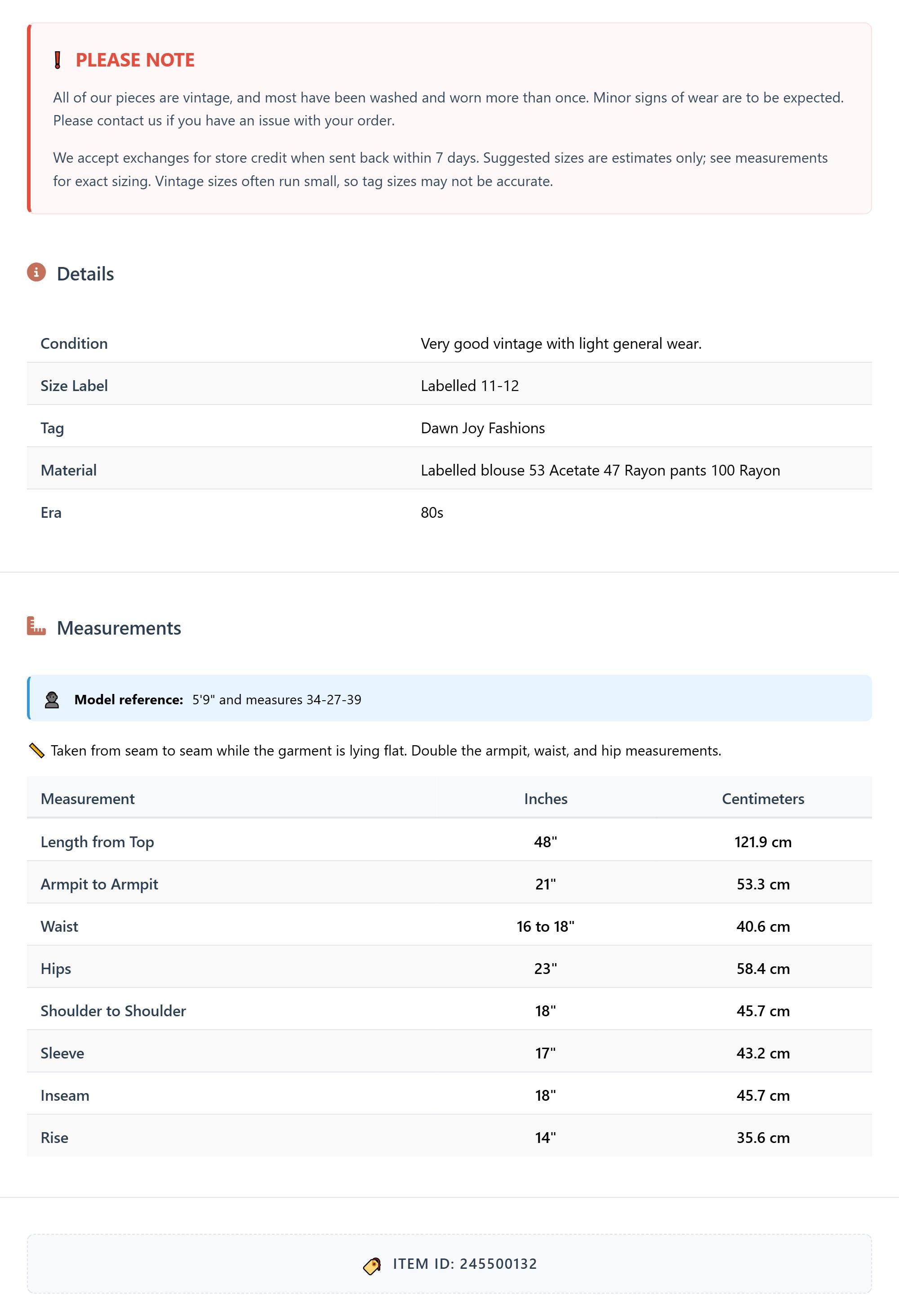 Suggested sizes are estimates only; see measurements for exact sizing. Vintage sizes often run small, so tag sizes may not be accurate.