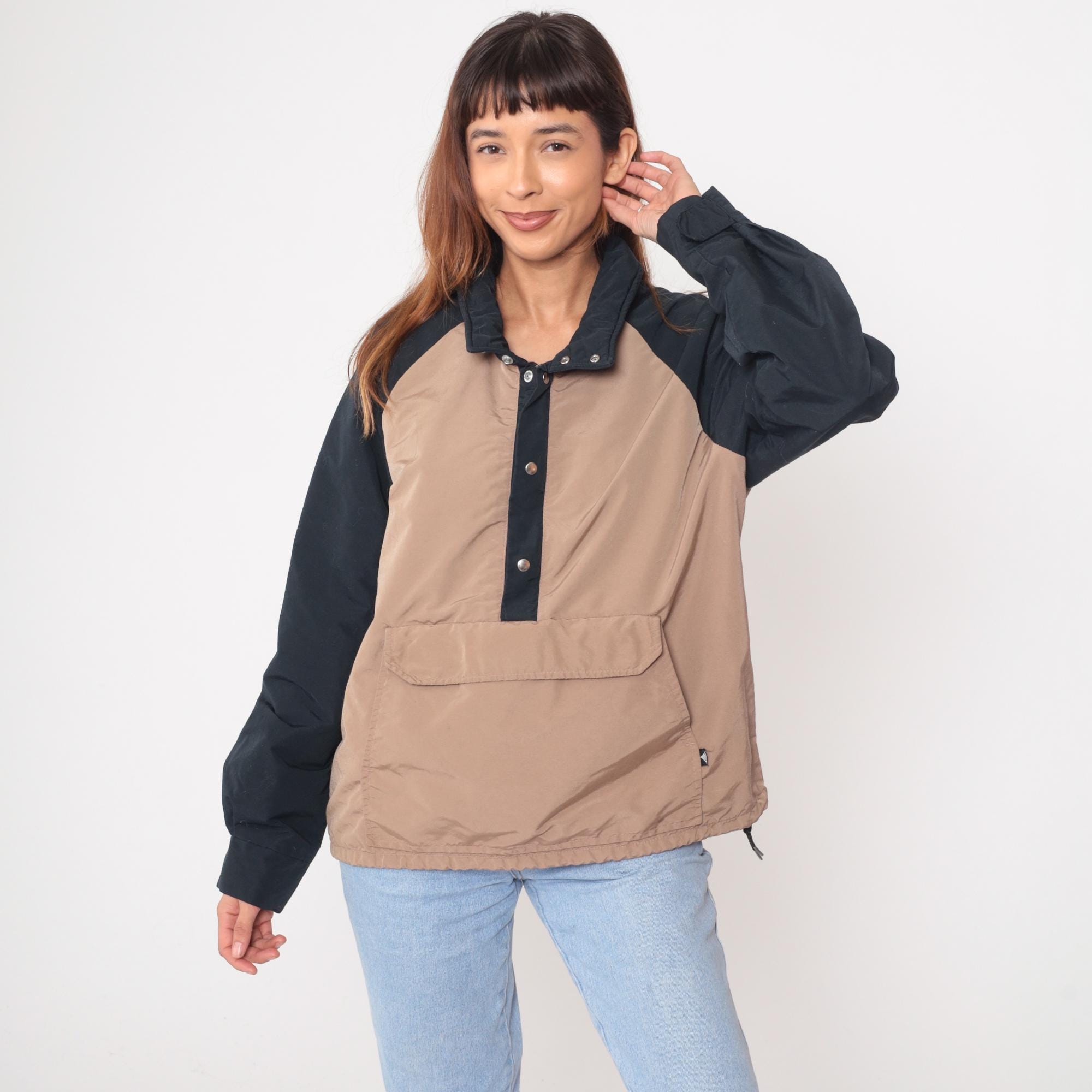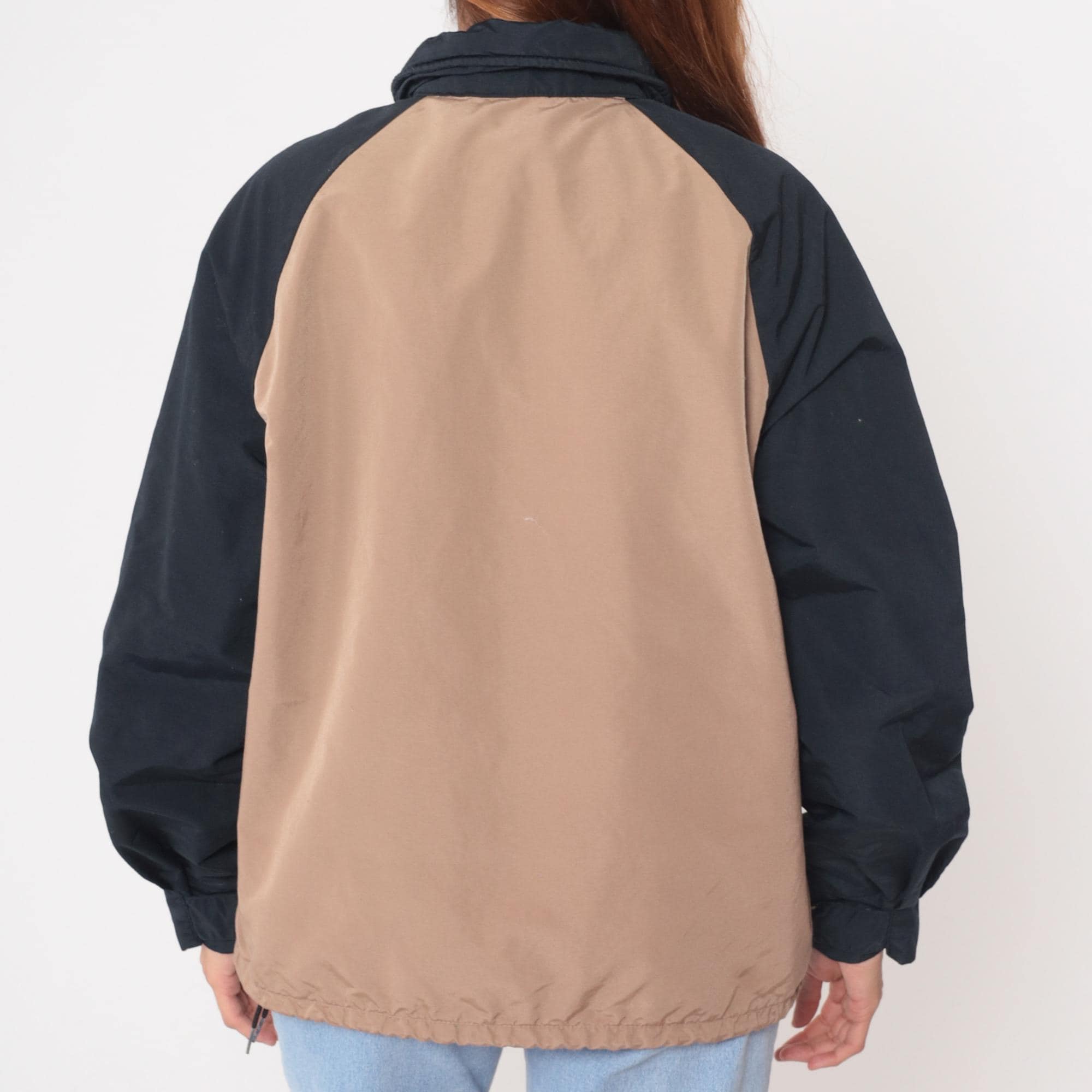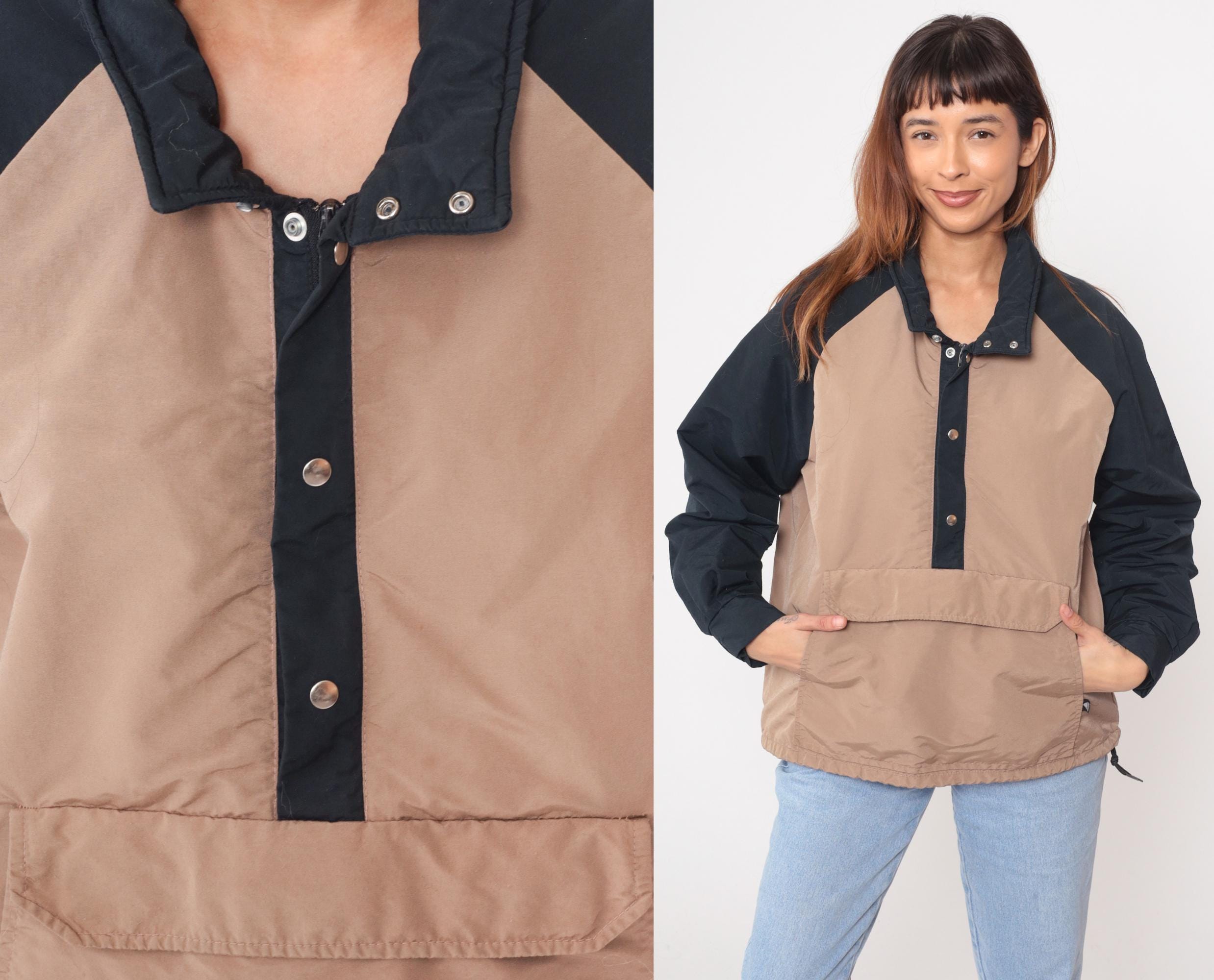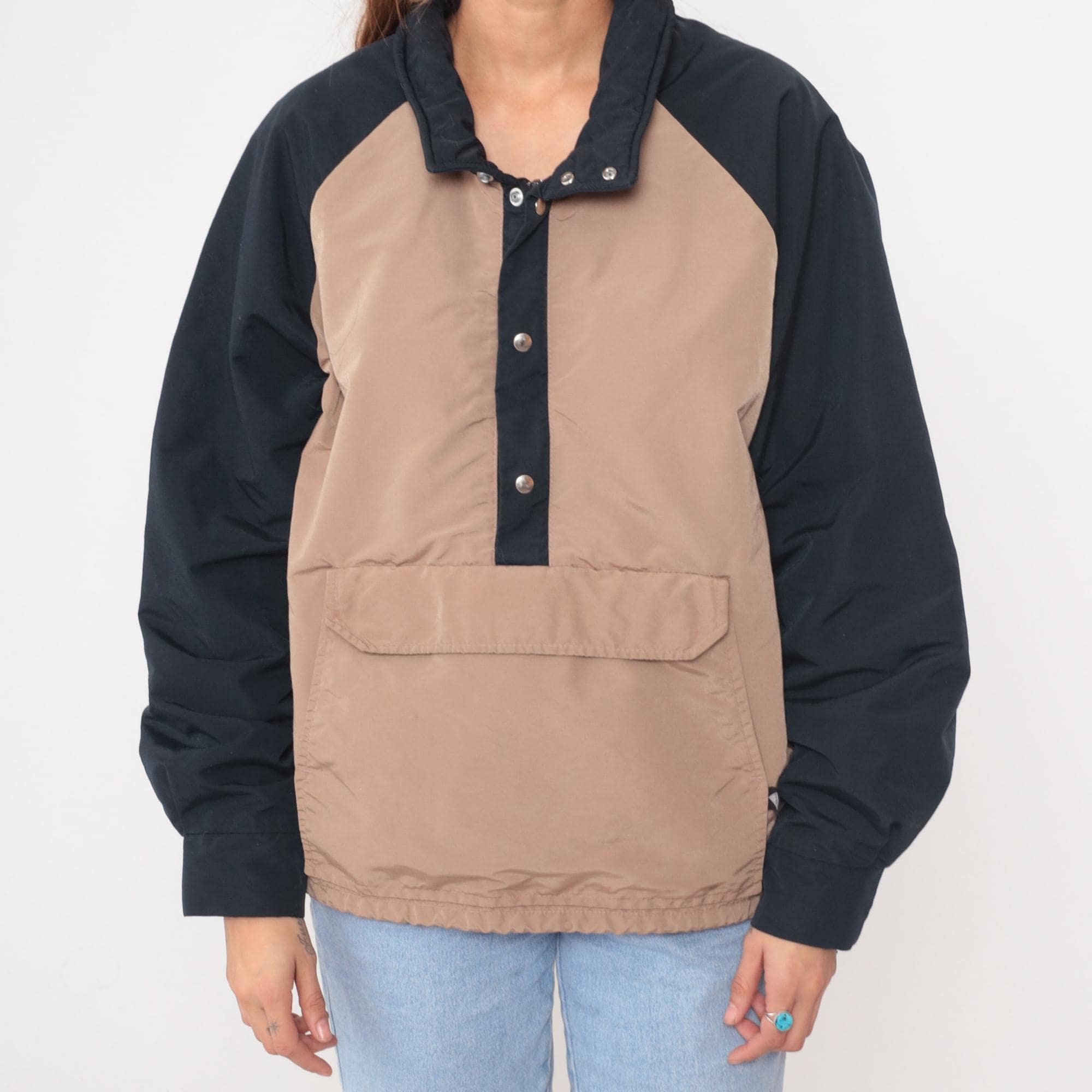 80s tan and black colorblock pullover jacket from Jardi with raglan sleeves and partial snap button front closure. Black collar, sleeves, and center placket contrast with beige body, front kangaroo pocket, elastic cuffs and hem.