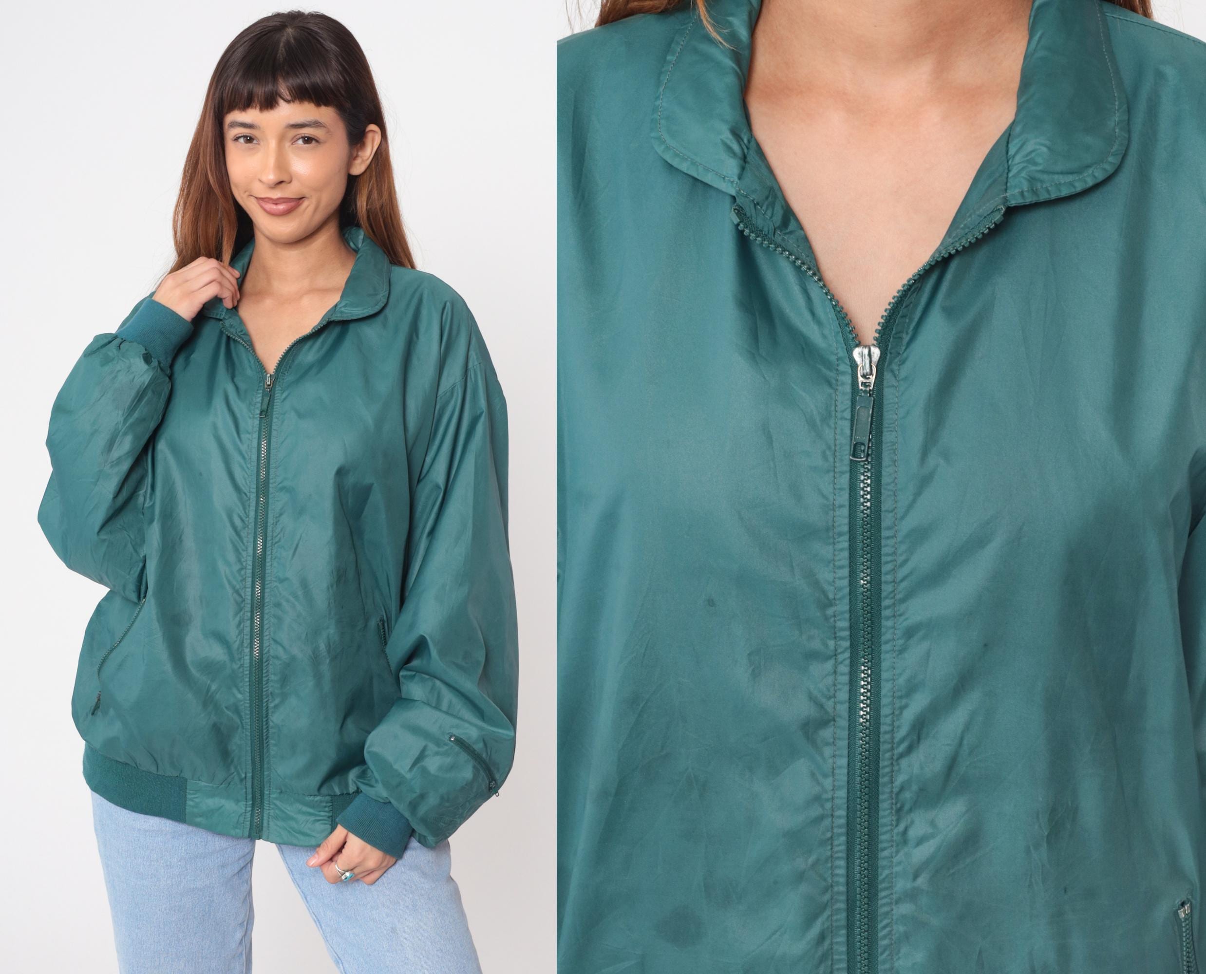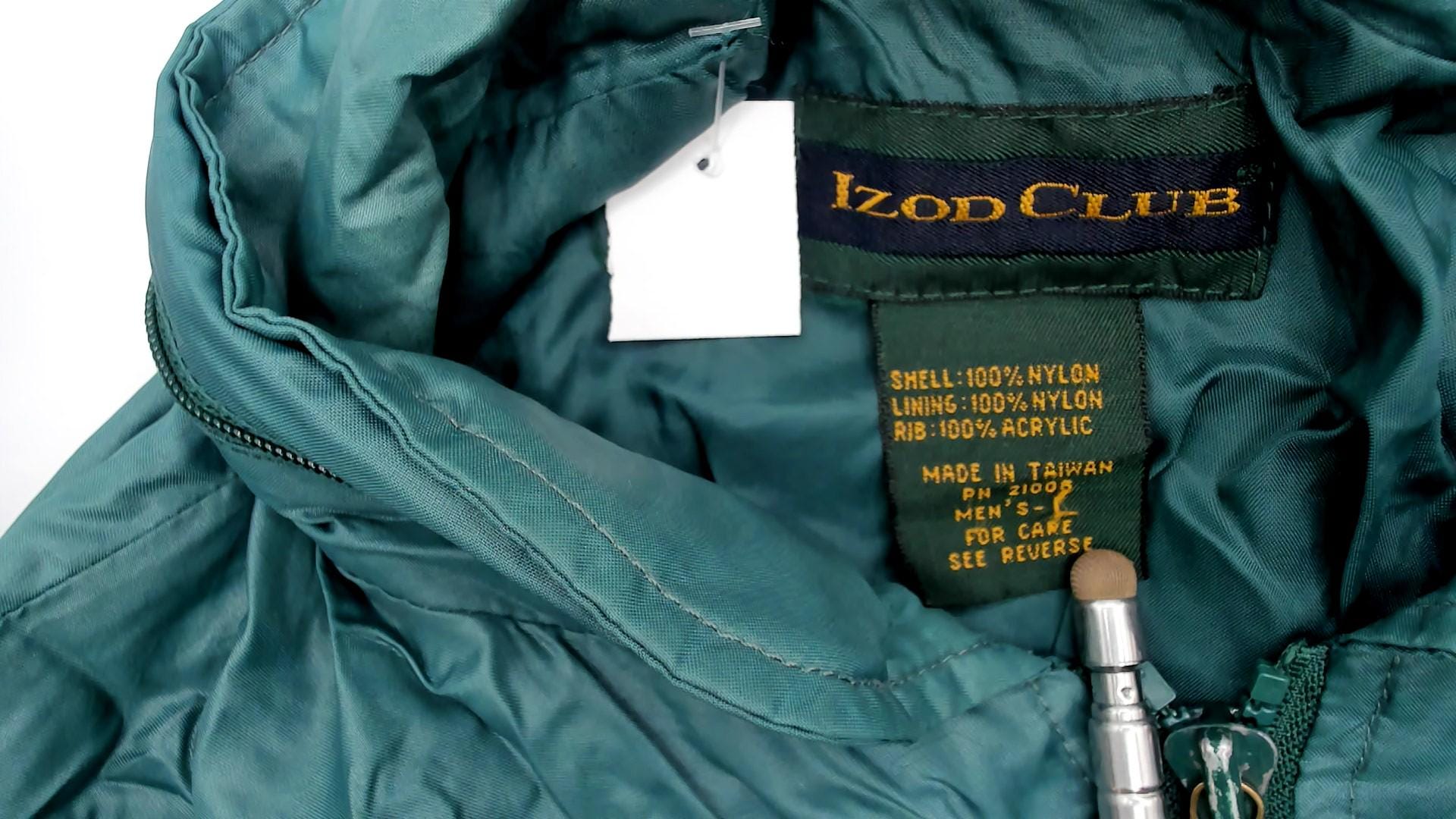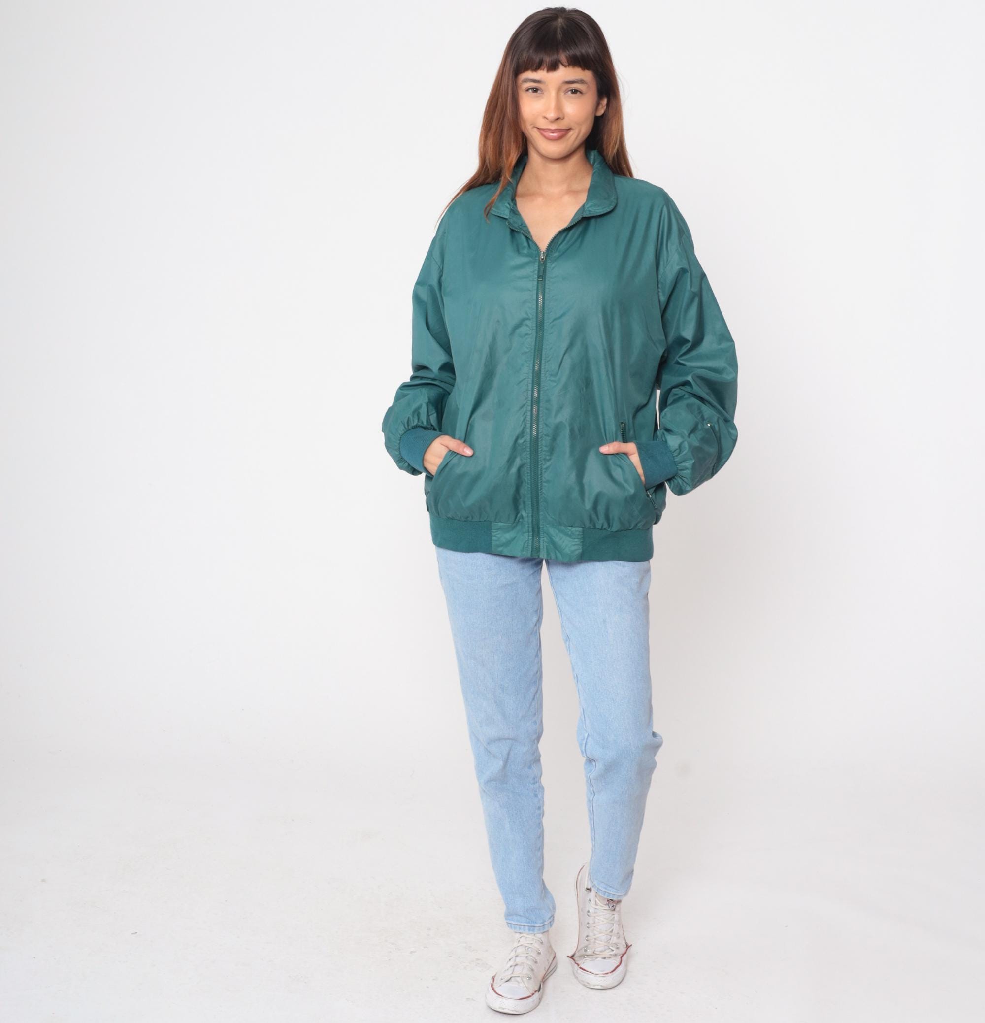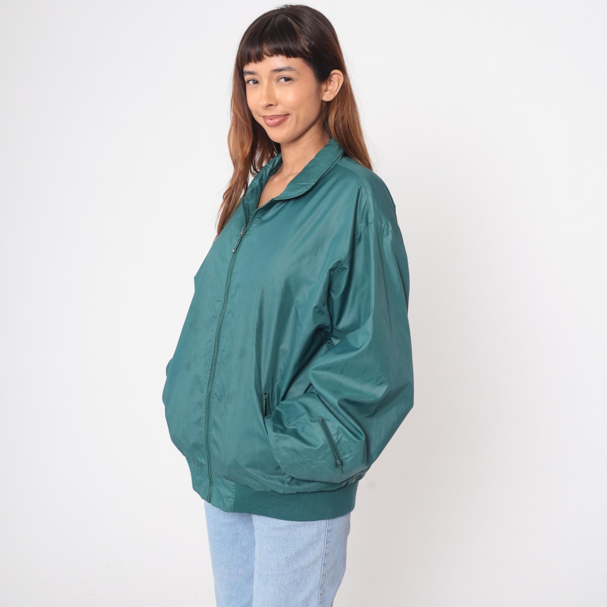 90s teal windbreaker jacket from izod club with full front zipper closure and ribbed knit collar, cuffs, and hem. Side zip pockets, oversized silhouette.