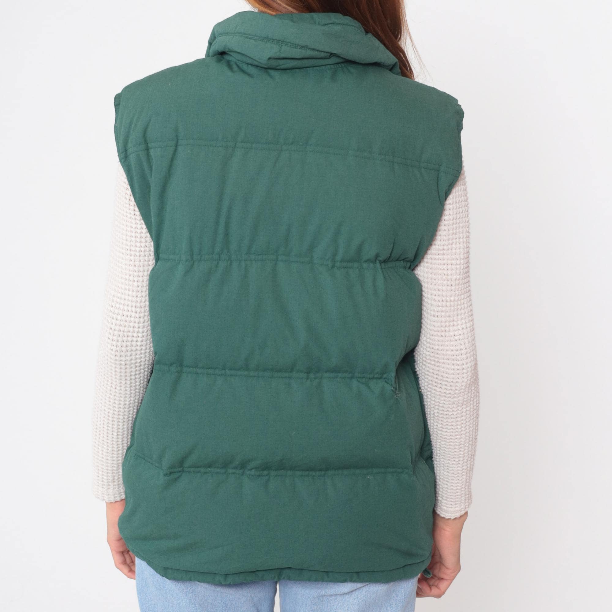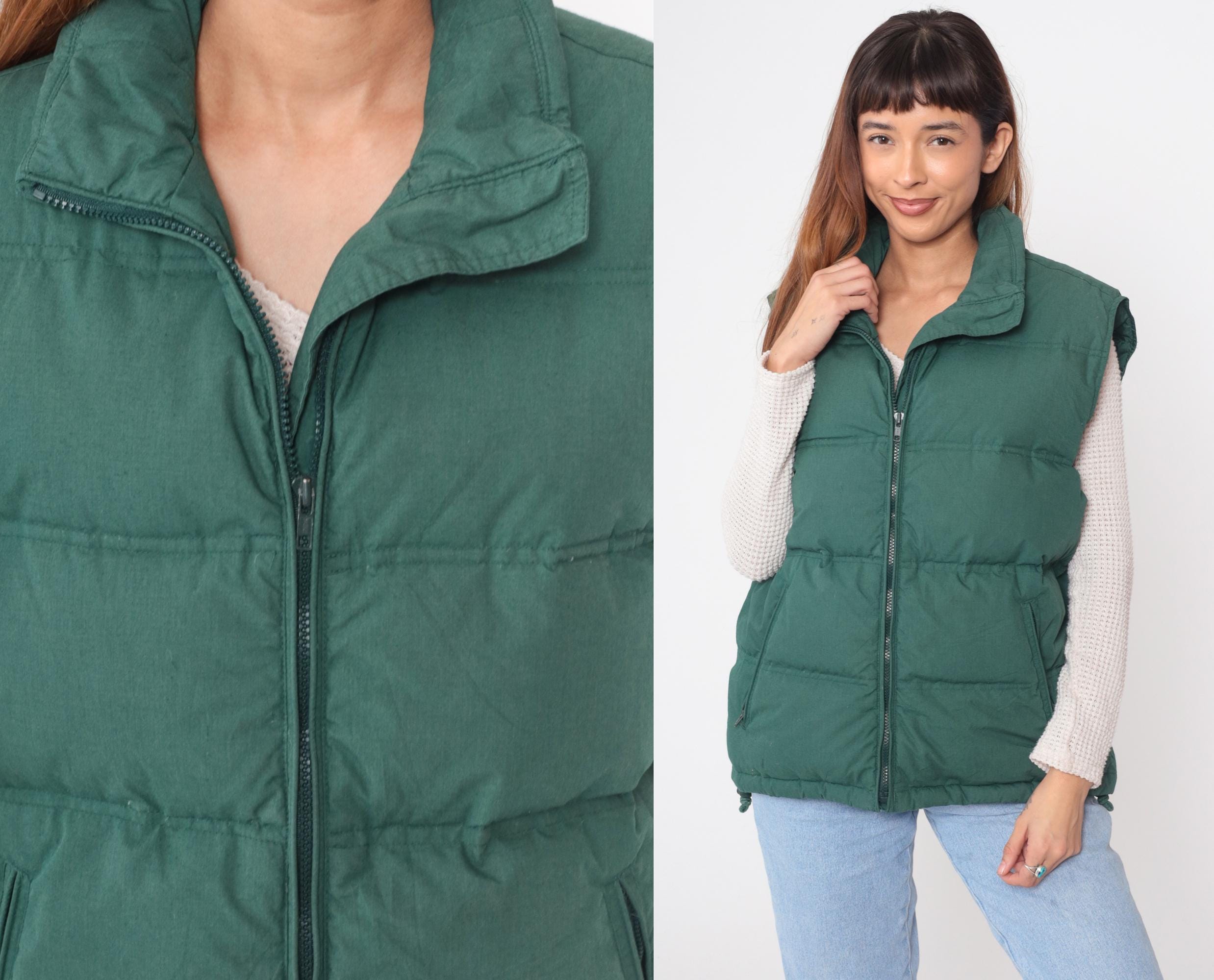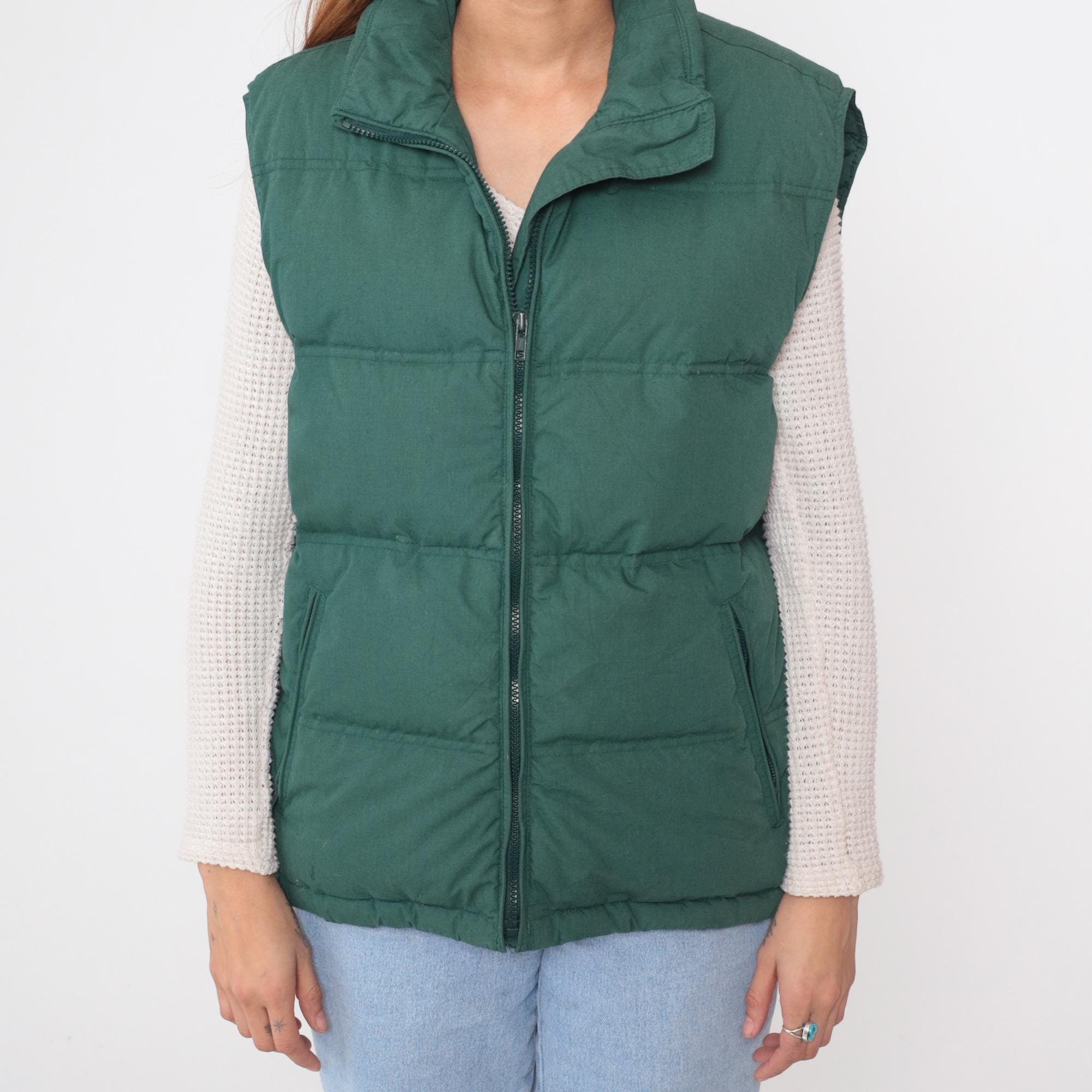 90s teal green puffer vest from Northwest Territory with quilted construction throughout, full front zipper, and fold-over collar. Two lower diagonal zip pockets and elastic hem. Nylon shell with down fill.