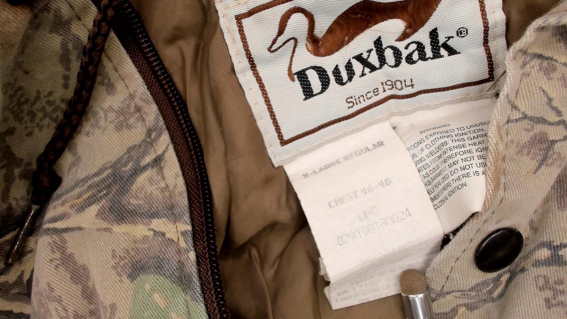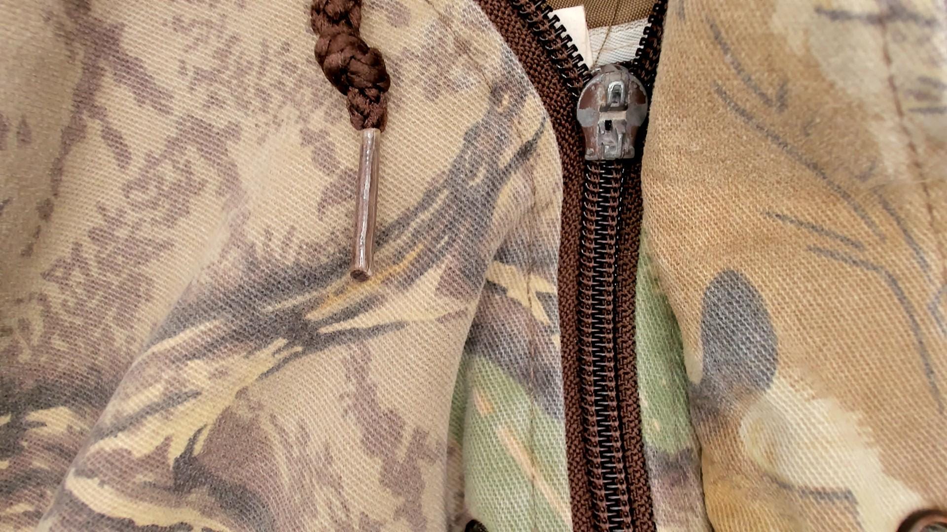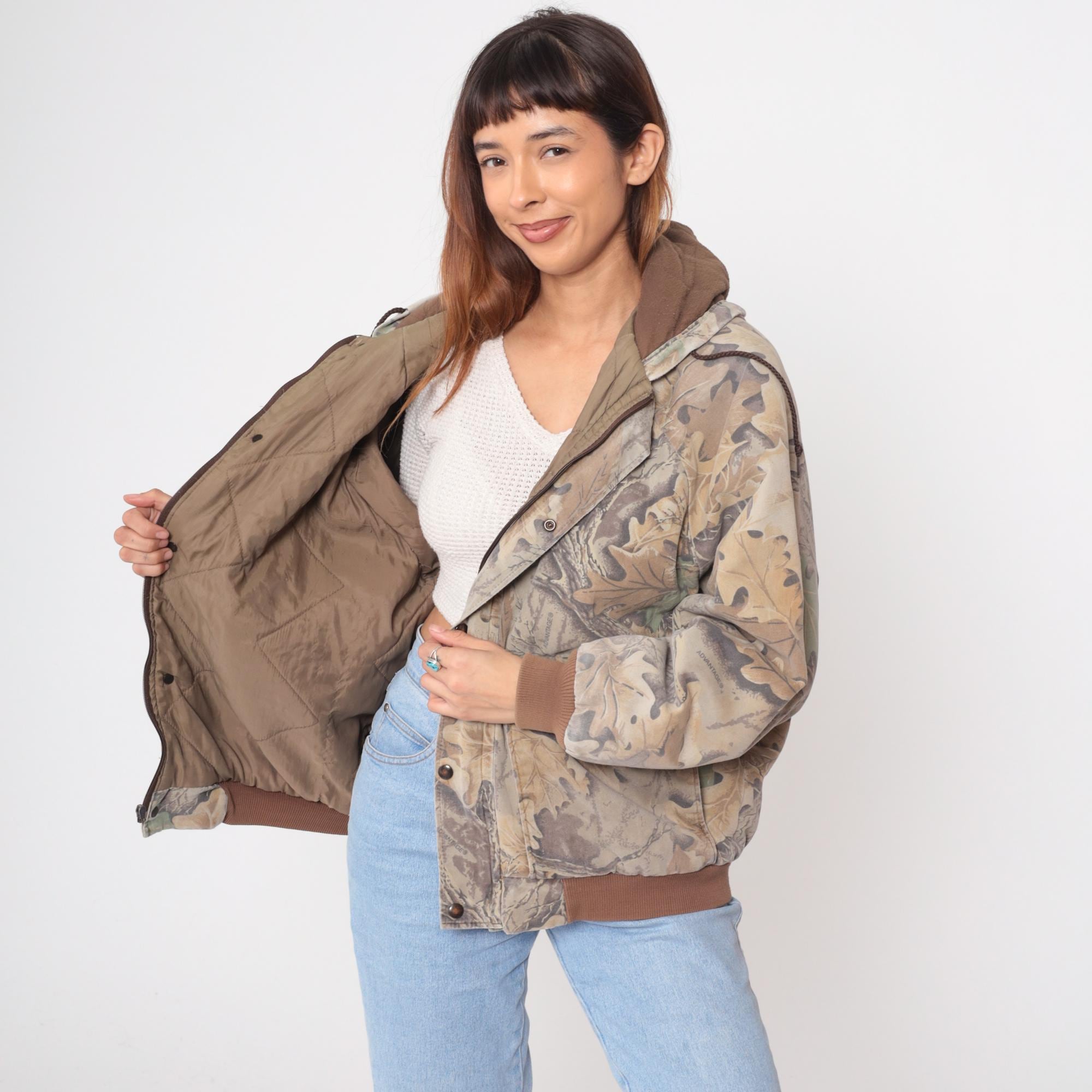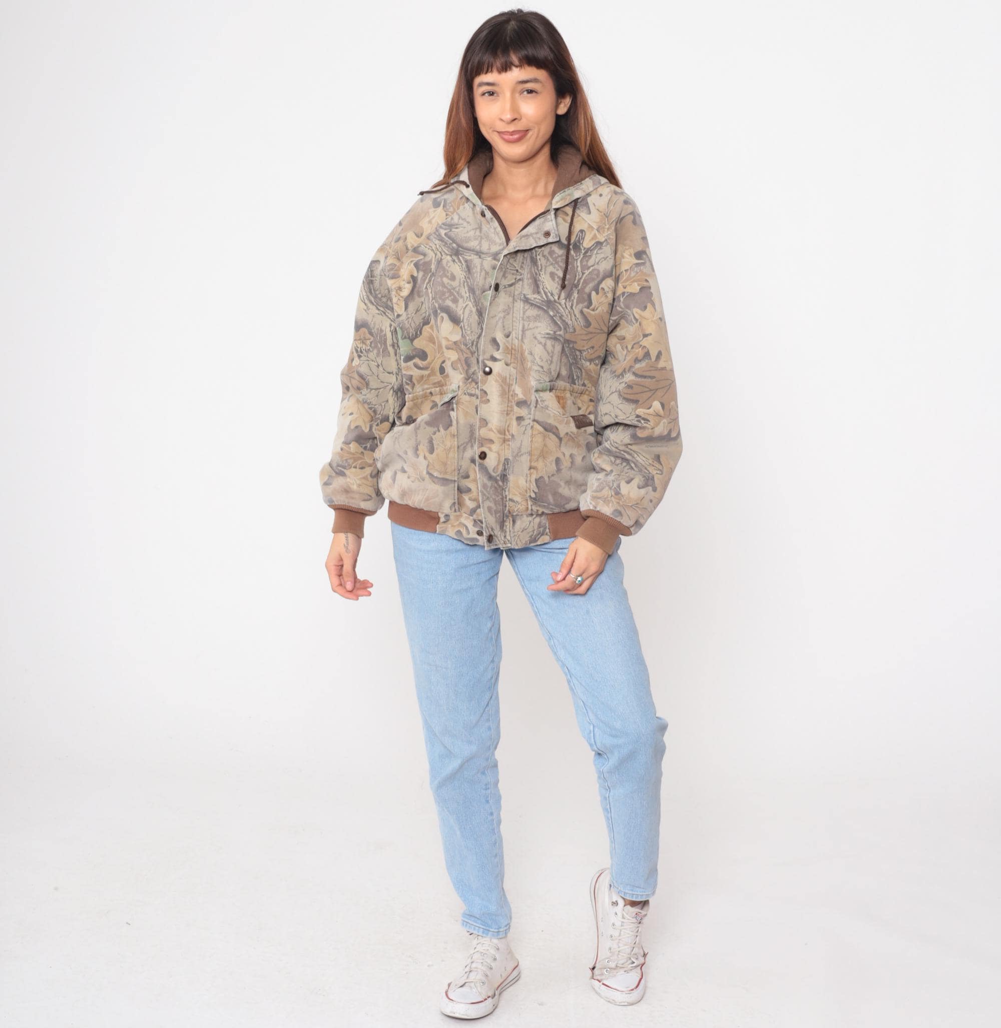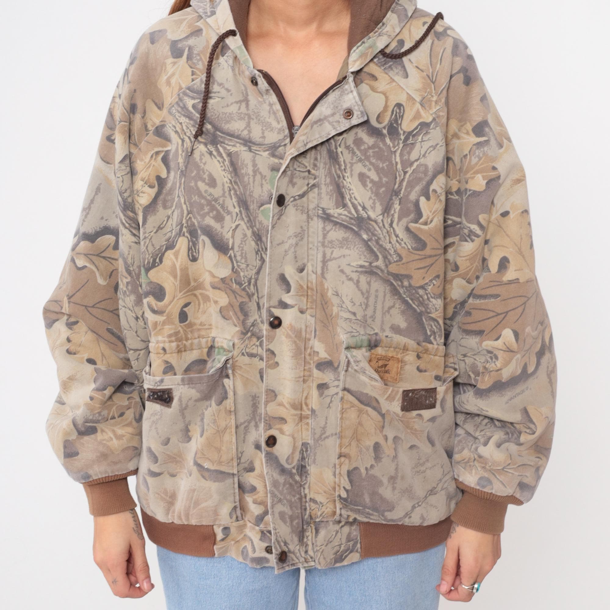 90s camouflage hooded jacket from duxbak in oak leaf pattern with beige, tan, brown, and green tones across the fabric. Zip front closure with brown drawstring hood, multiple front pockets with snap closures, and brown ribbed knit cuffs and waistband.