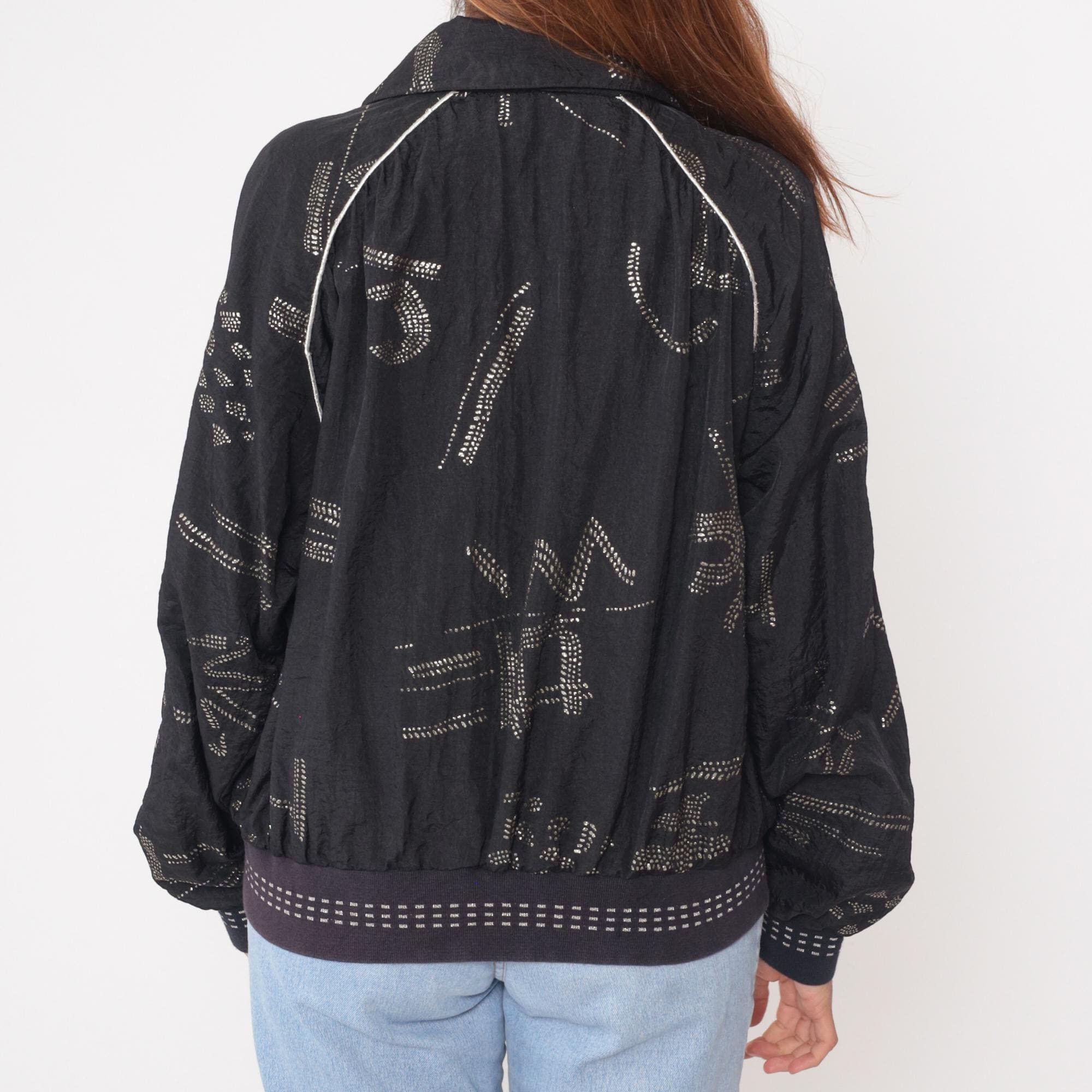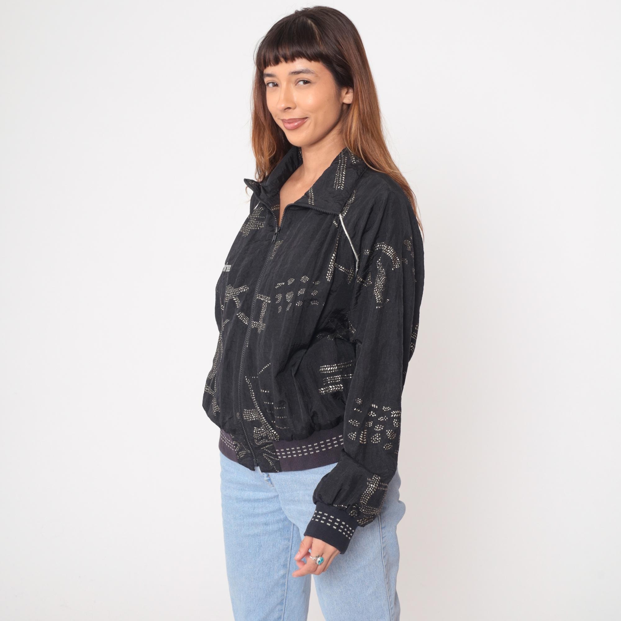 90s black nylon jacket with designs in silver glitter across the entire garment, from Lily's of Beverly Hills. Zip front closure, ribbed collar, cuffs, and hem with white striped detail on the ribbing. Some glitter missing due to age and wear.