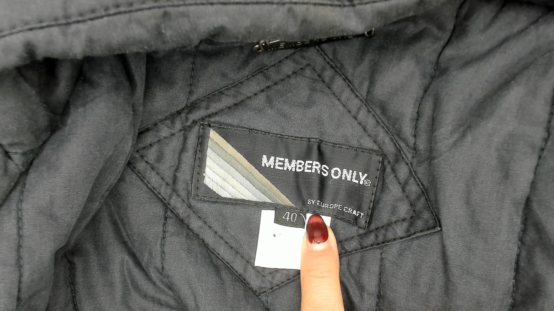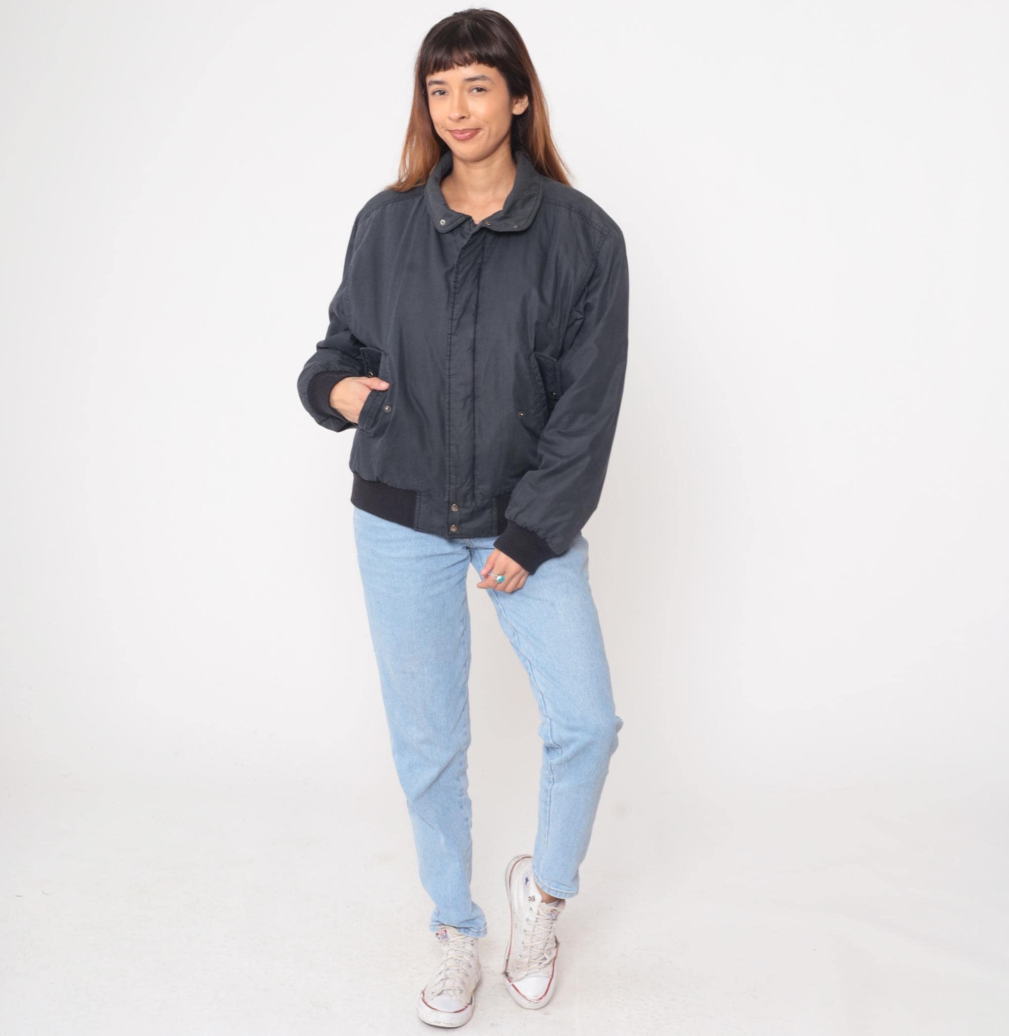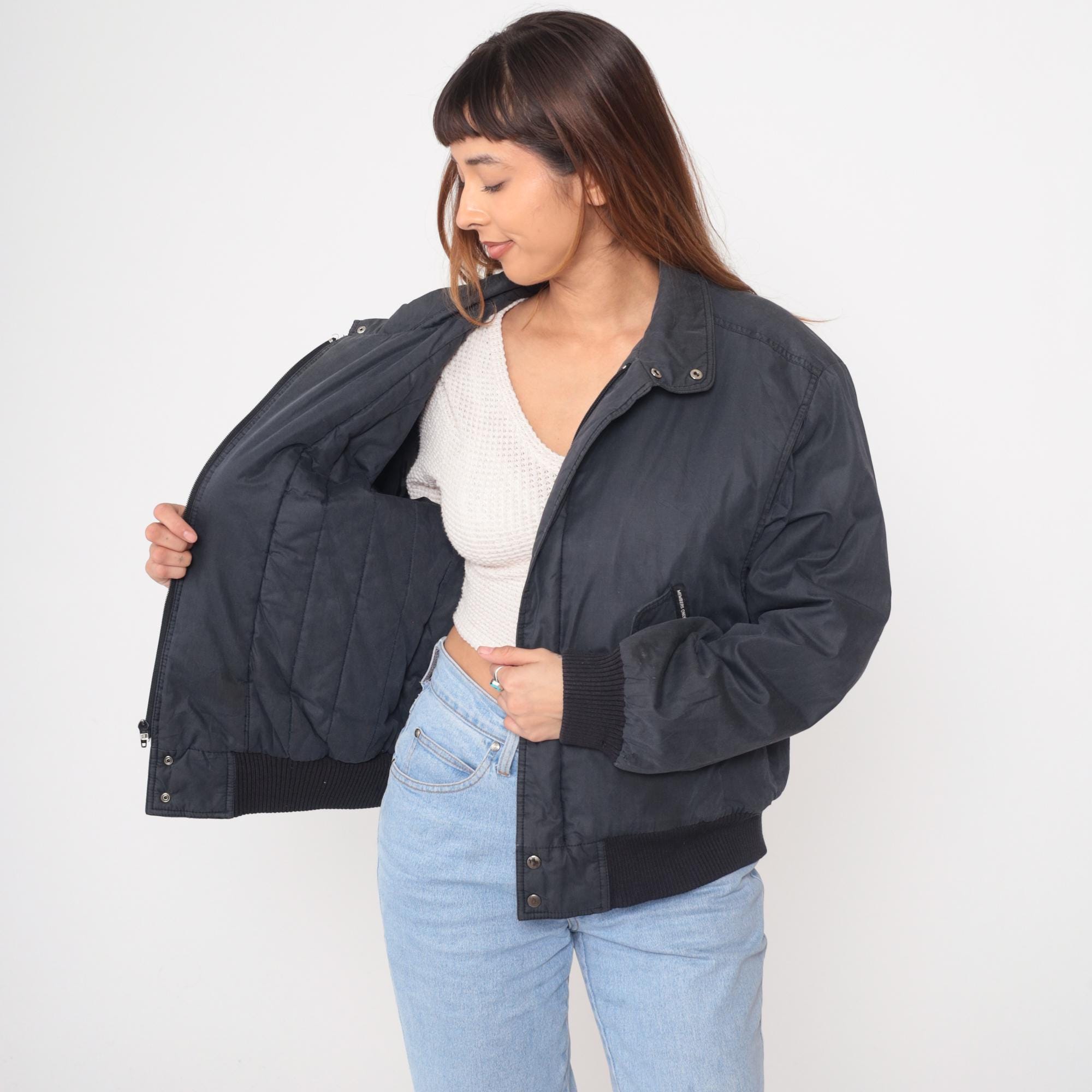 80s black bomber jacket from Members Only with snap front closure and raglan sleeves. Ribbed knit collar, cuffs, and hem in black. Two front pockets with snap closures and Members Only branded tabs.