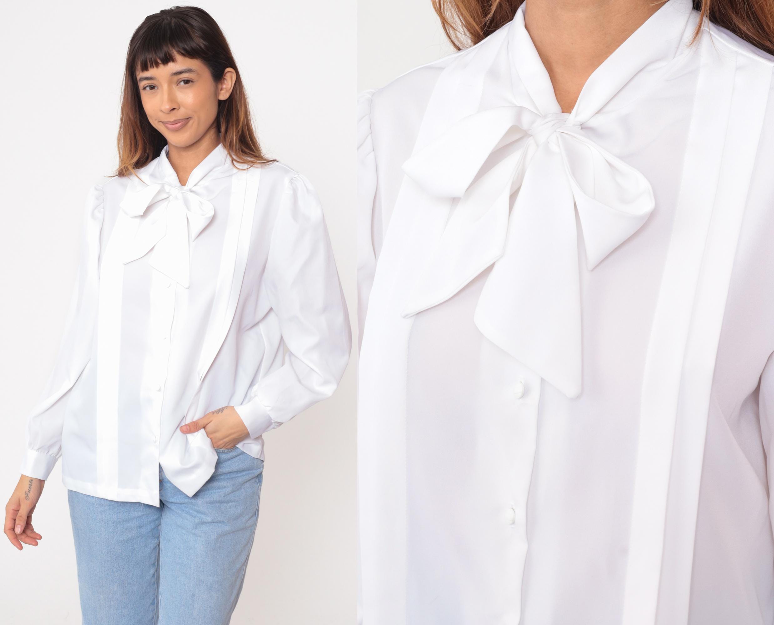 90s white blouse from blair with neck tie bow detail and button front closure. Pointed collar with long tie strands that form a bow at the neck. Long sleeves with elasticized cuffs and gathered shoulders creating volume at the sleeve cap.