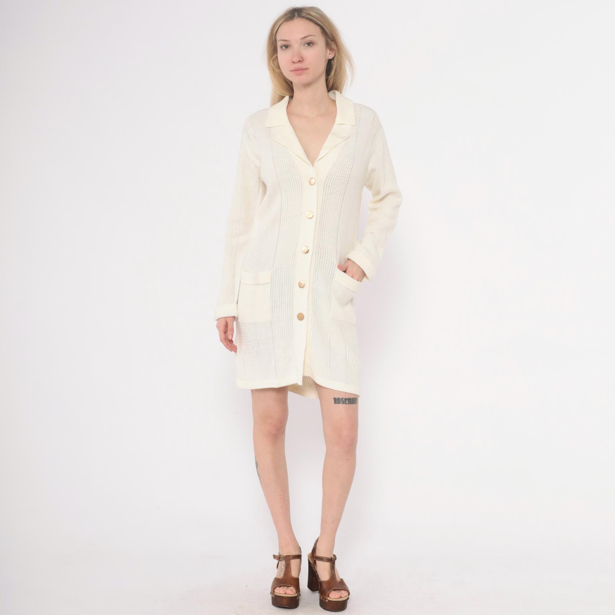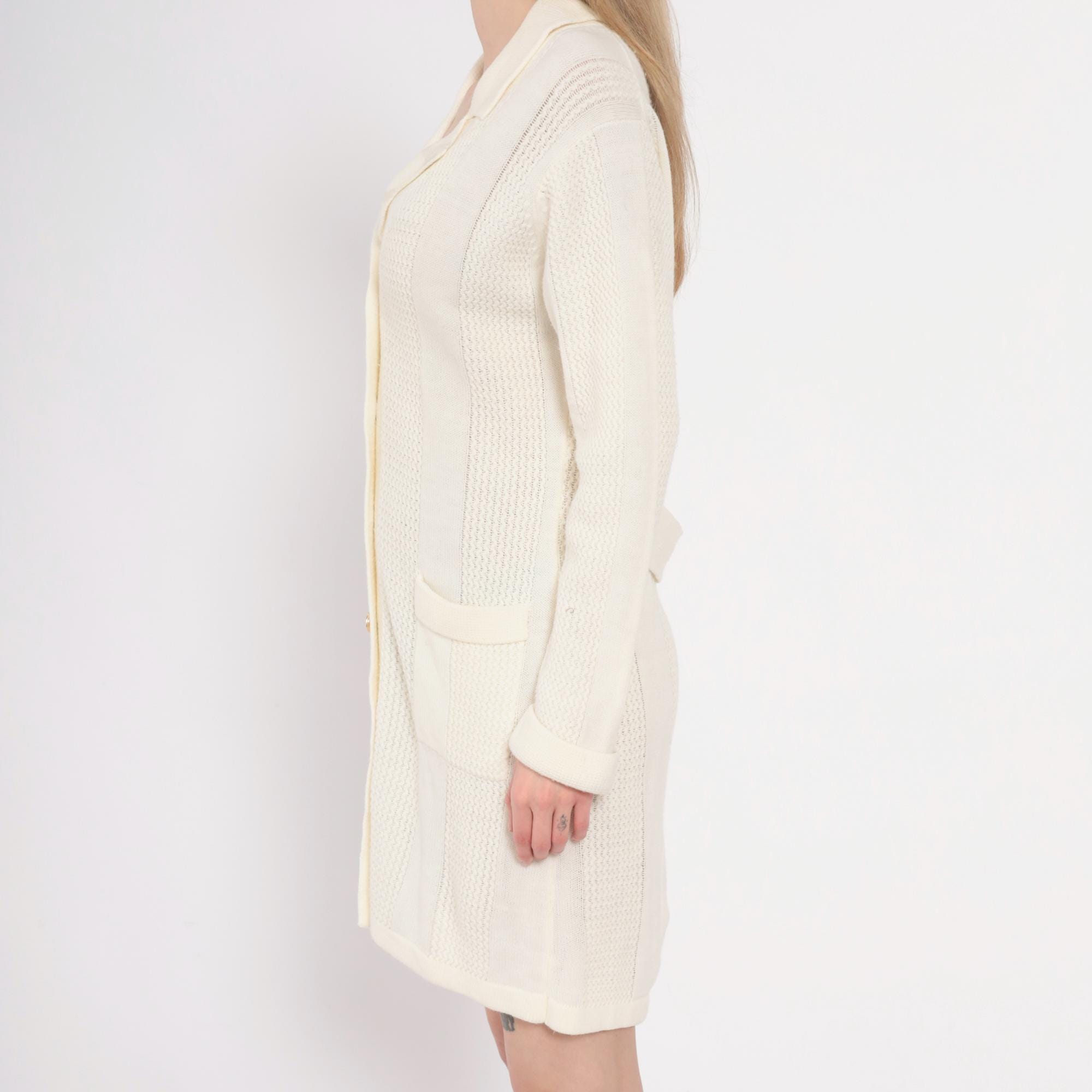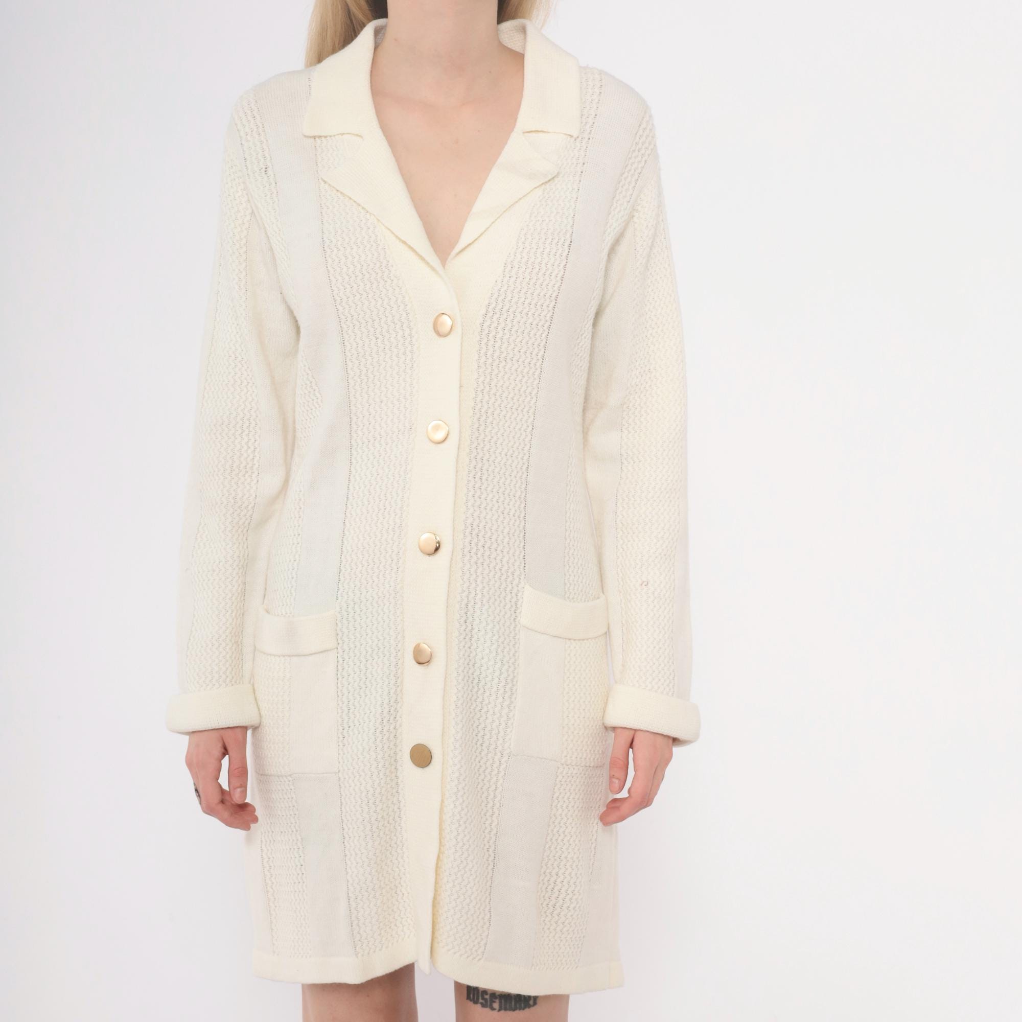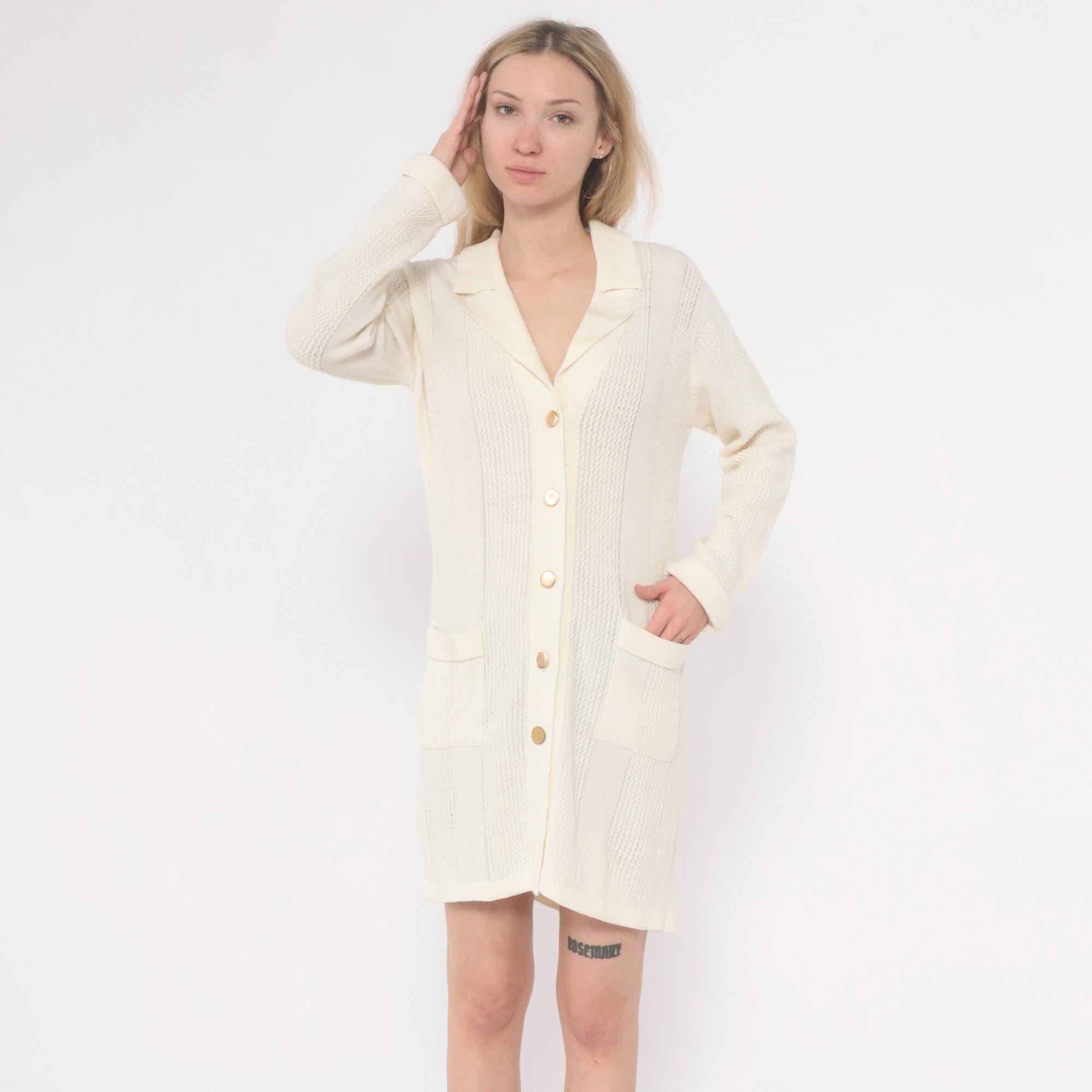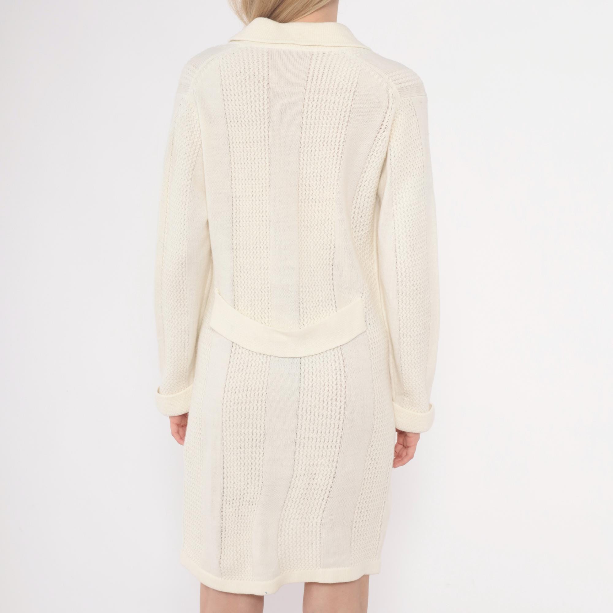 70s cream cardigan dress in ribbed and cable knit with notched collar and button front closure. Vertical panels of textured cable knit alternate with smooth ribbed knit sections, long sleeves, two patch pockets at hips.