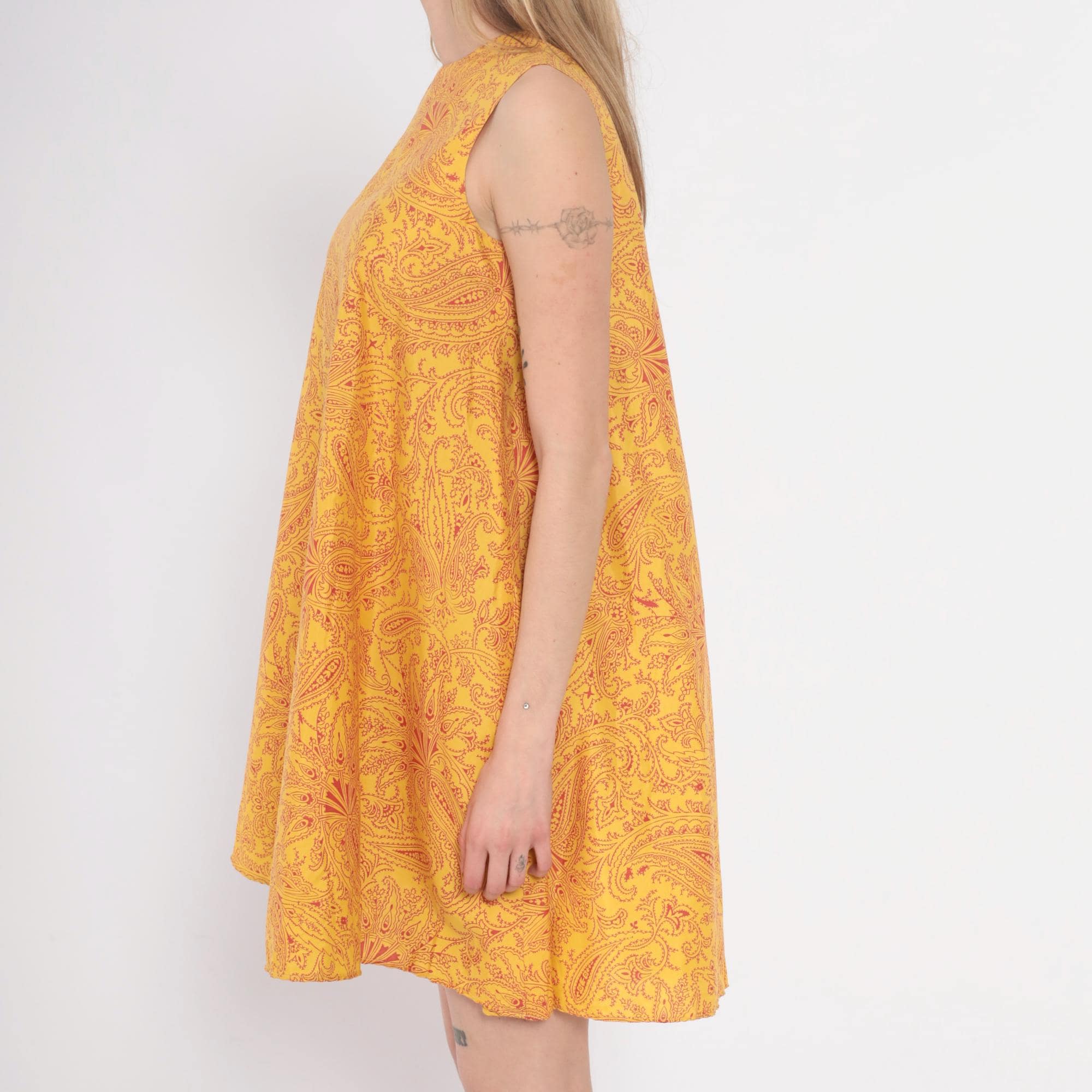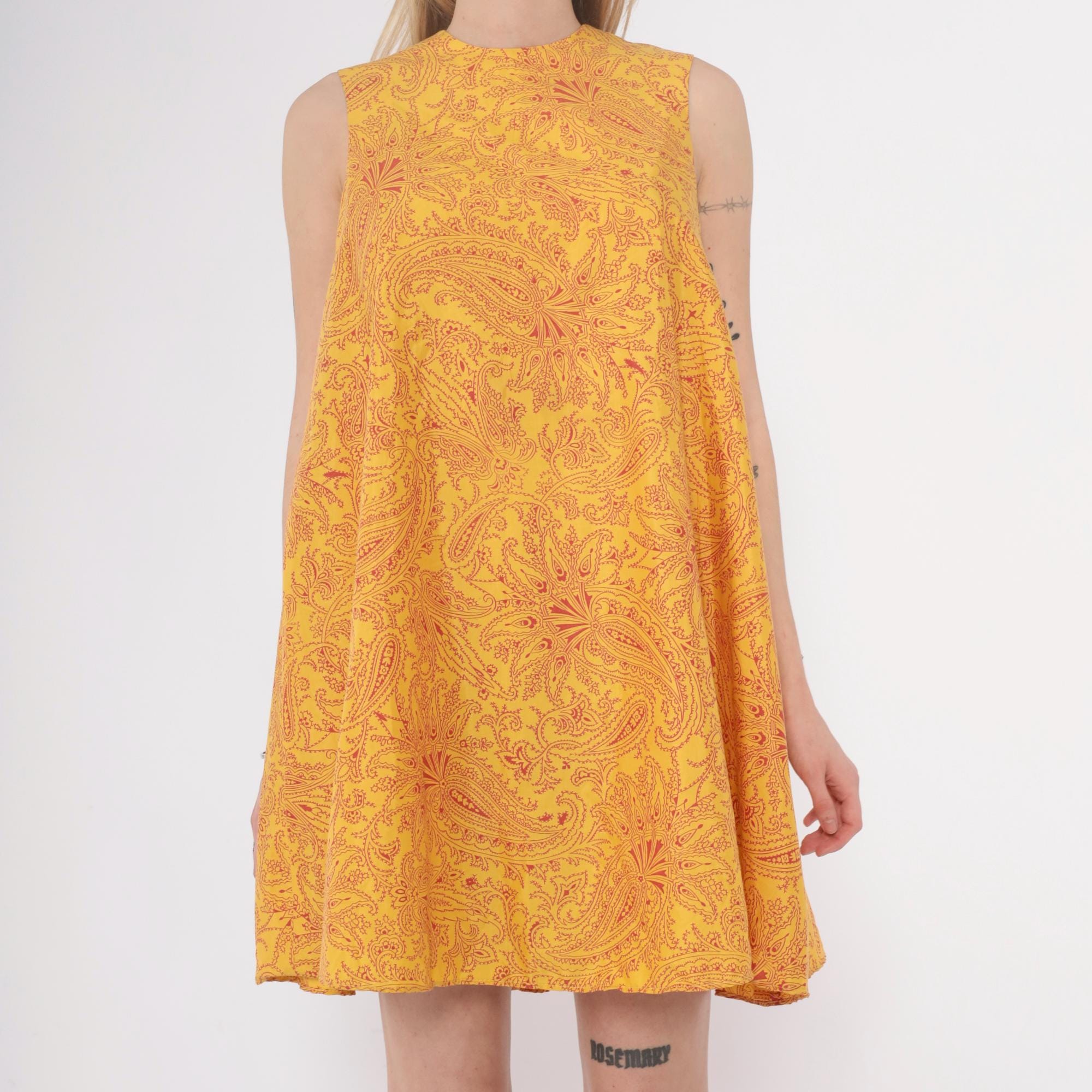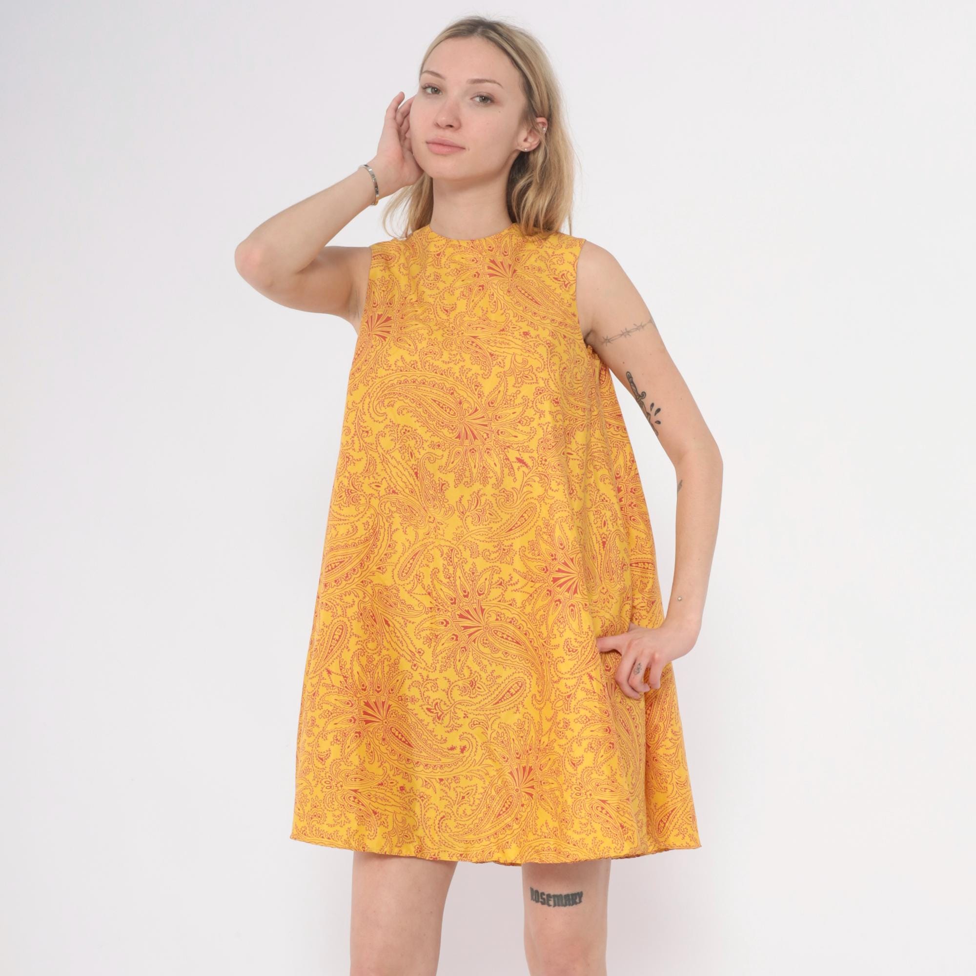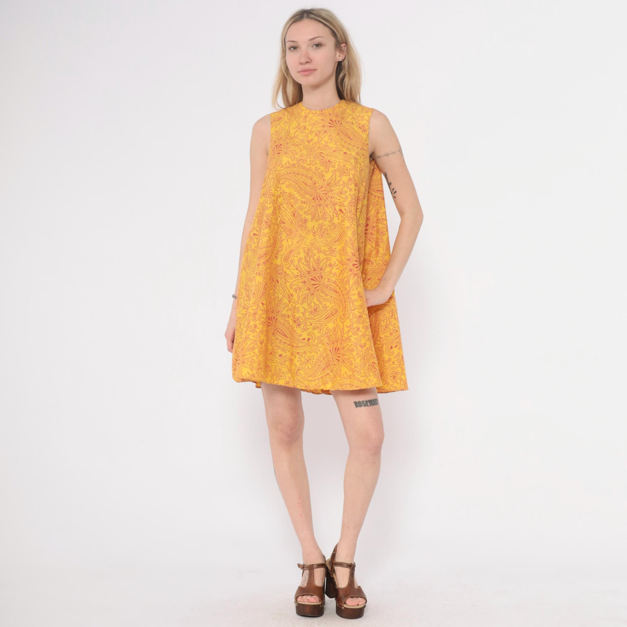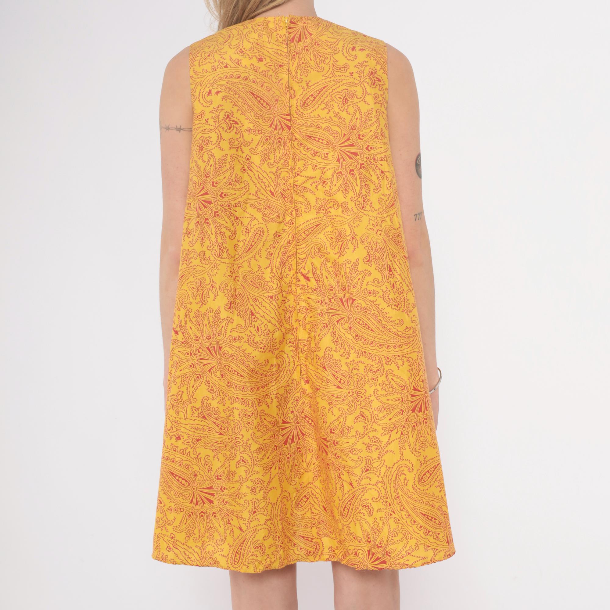 60s golden yellow shift dress from Gay Gibson with red paisley pattern across the fabric. Sleeveless with crew neckline and A-line silhouette.