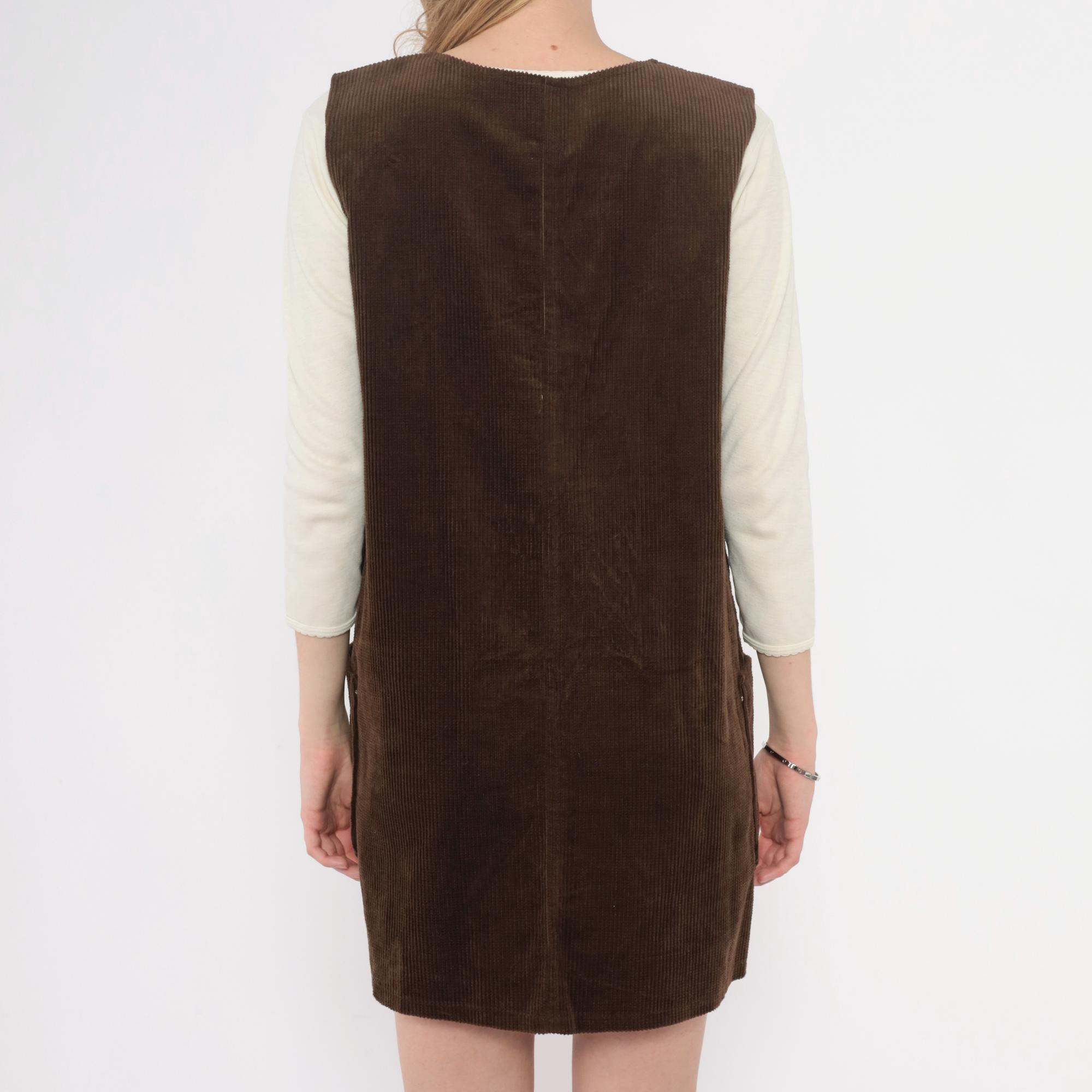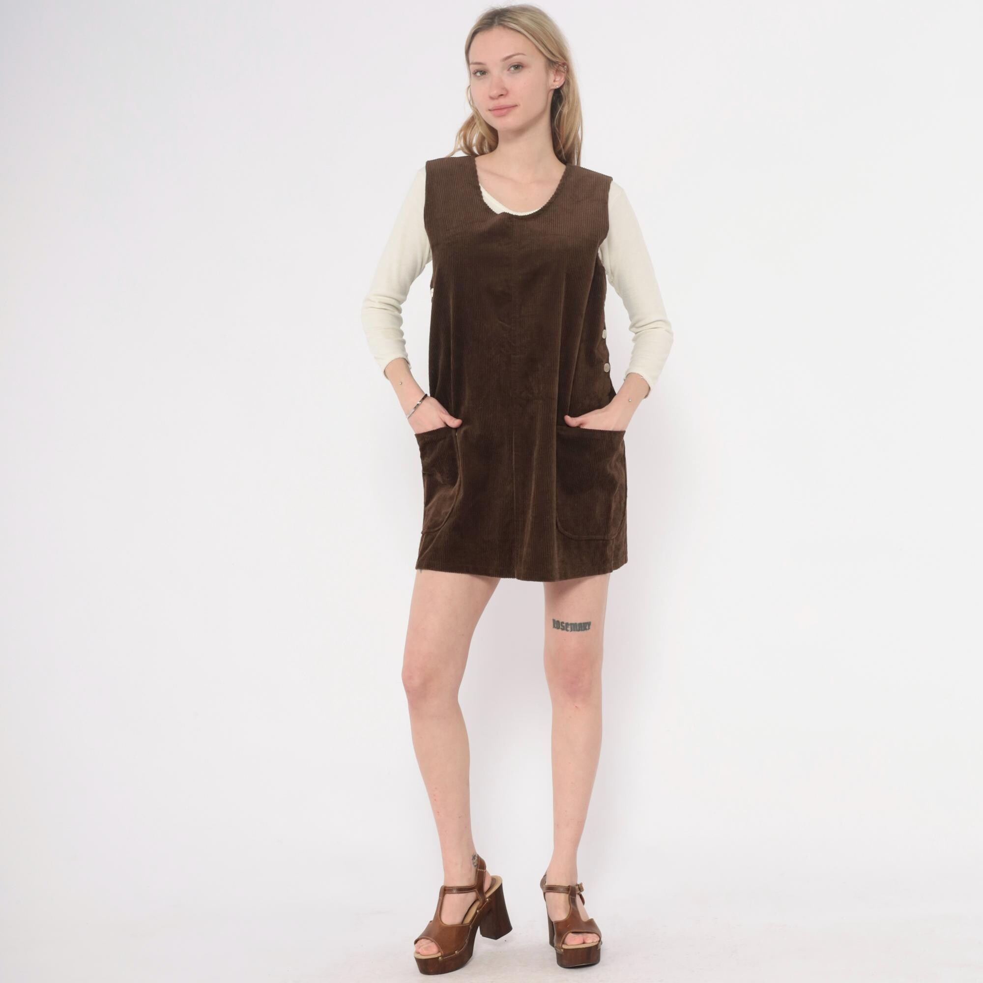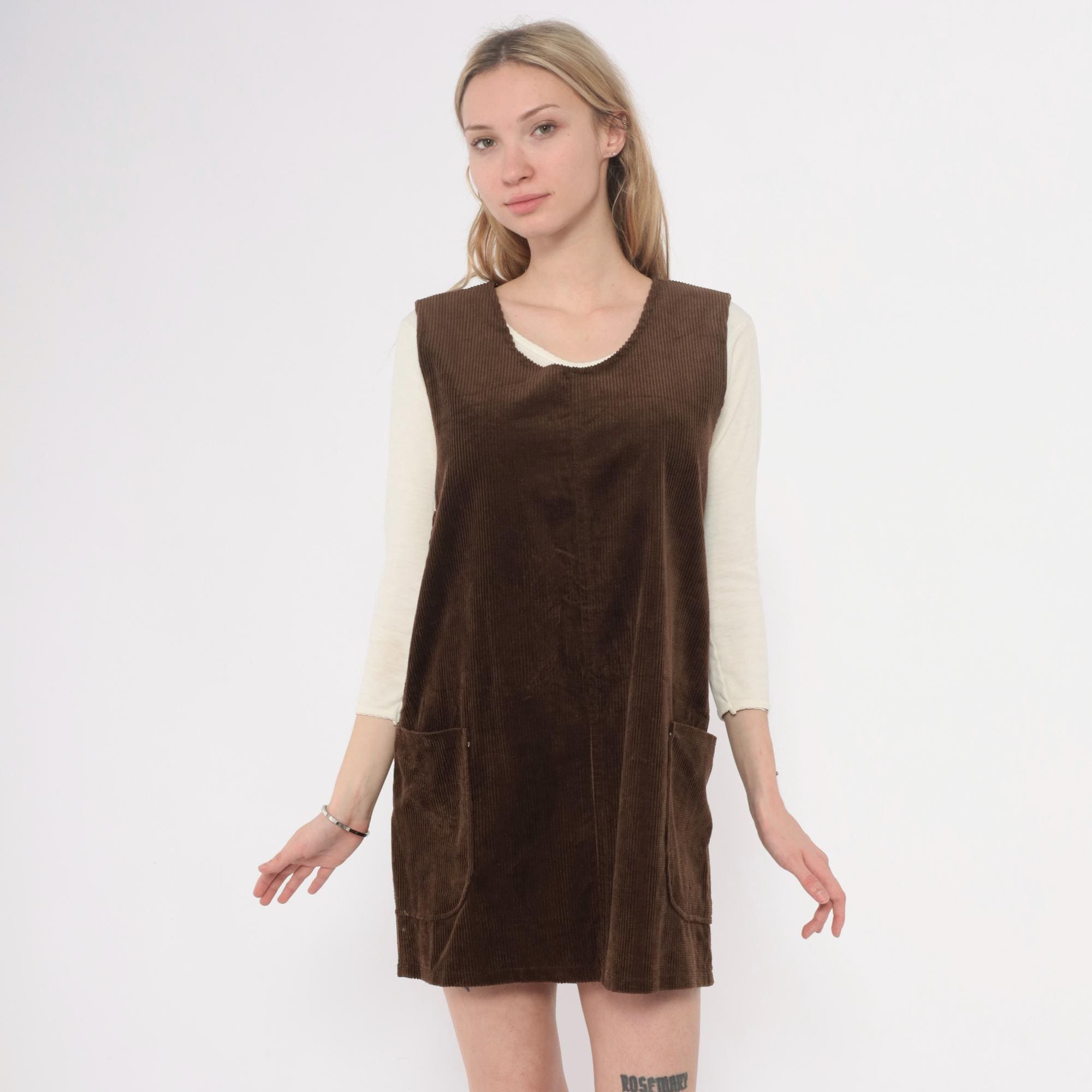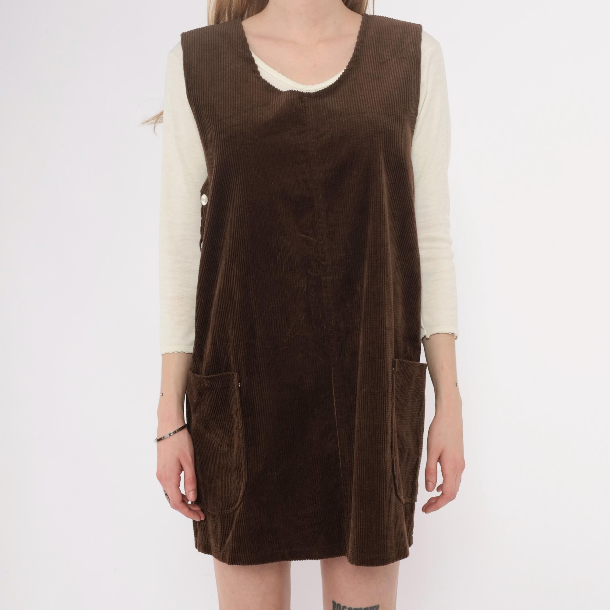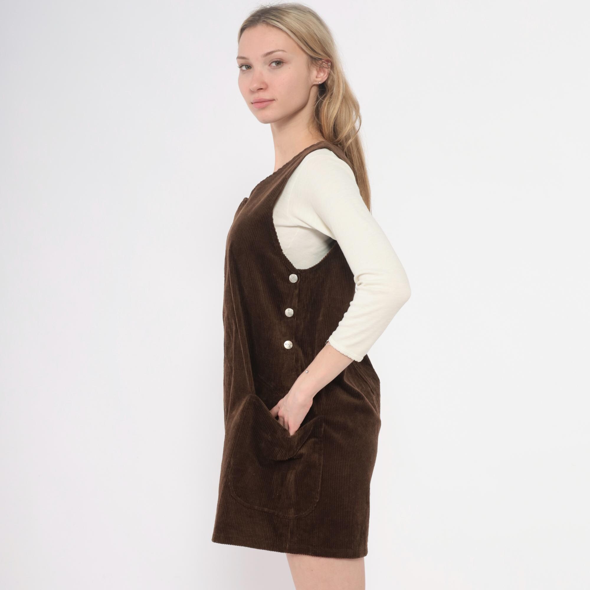 90s brown corduroy jumper dress from beast with scoop neckline and sleeveless design. Three decorative buttons on the left front side, two front patch pockets, straight shift silhouette.