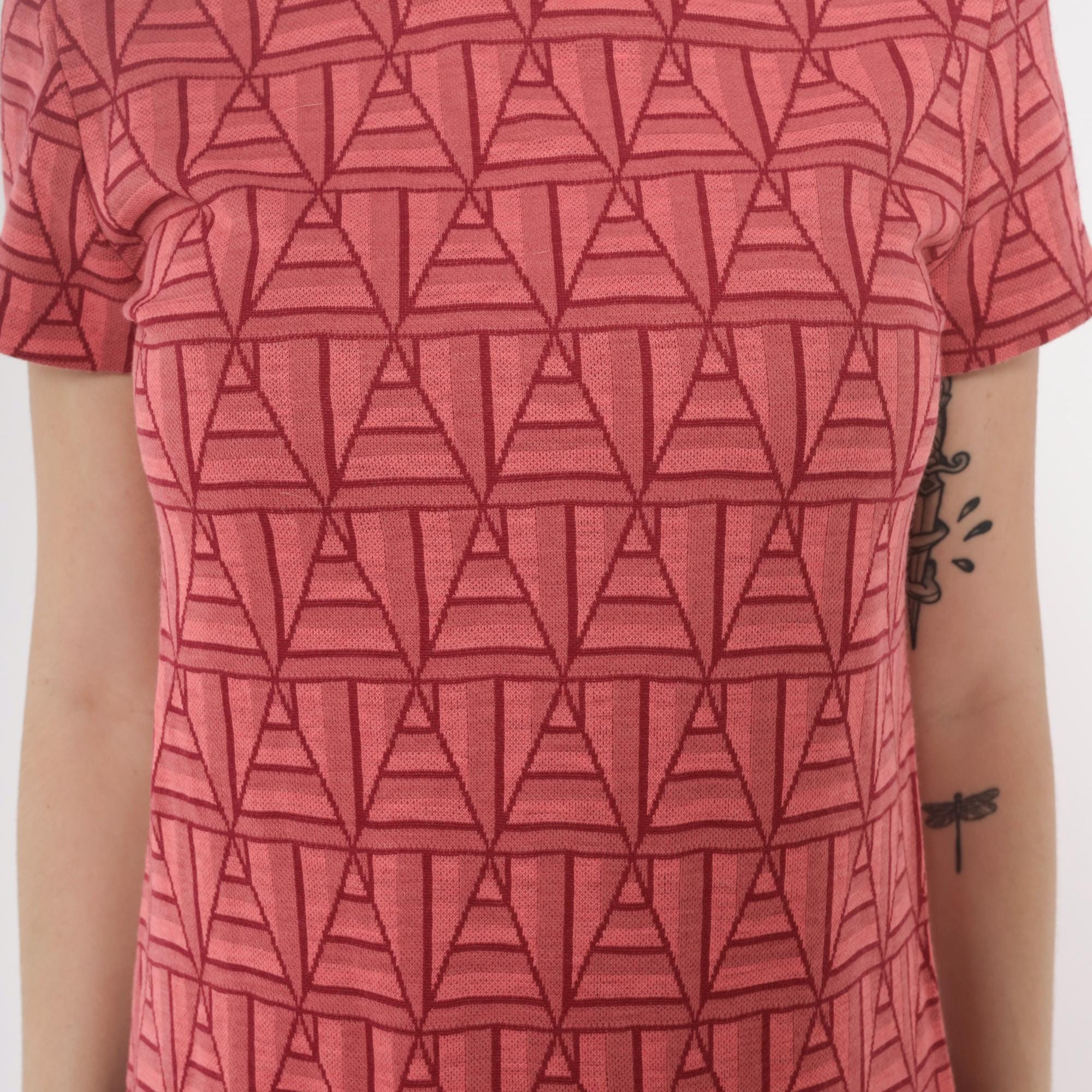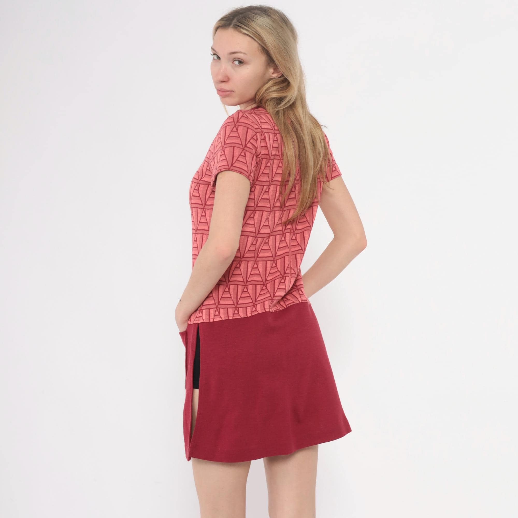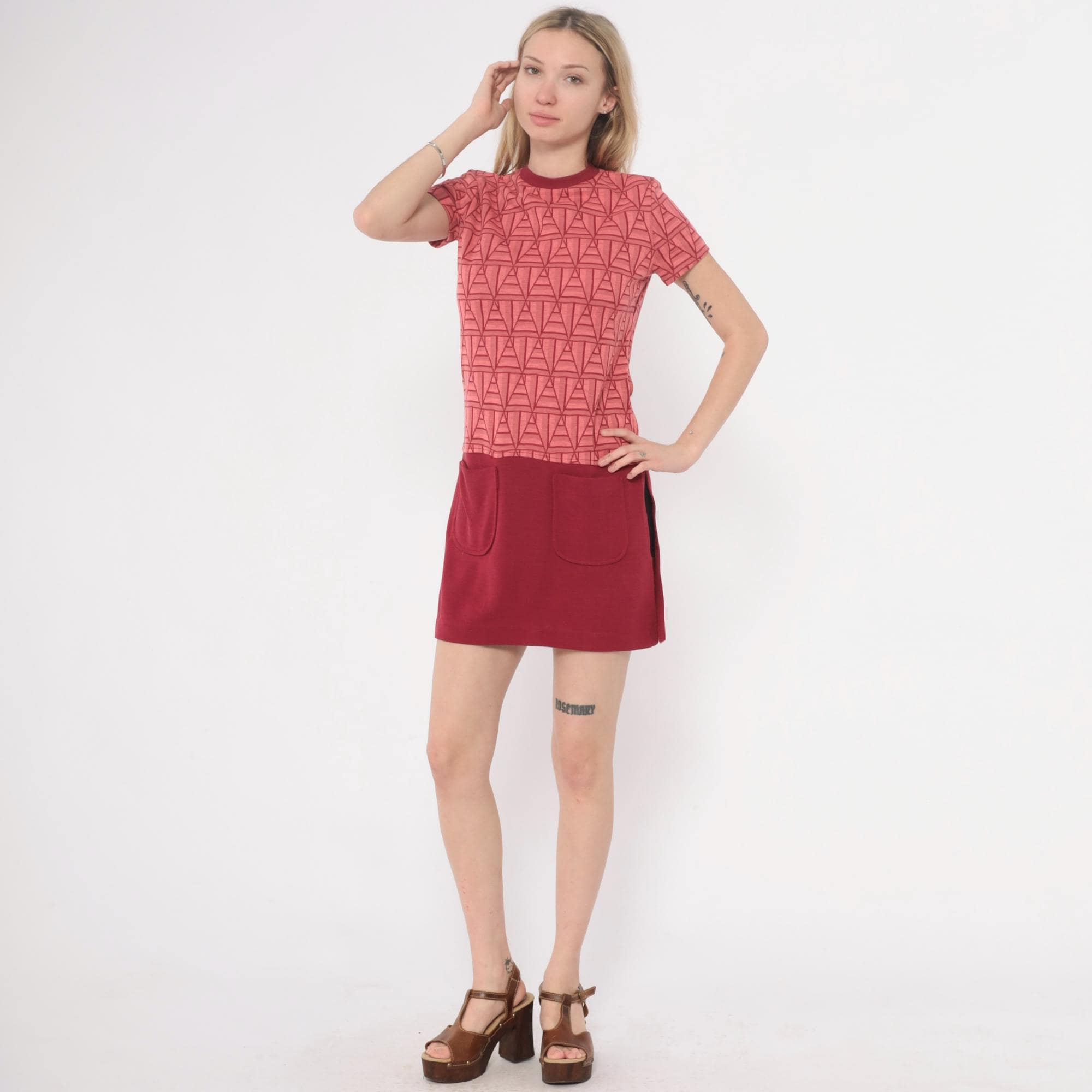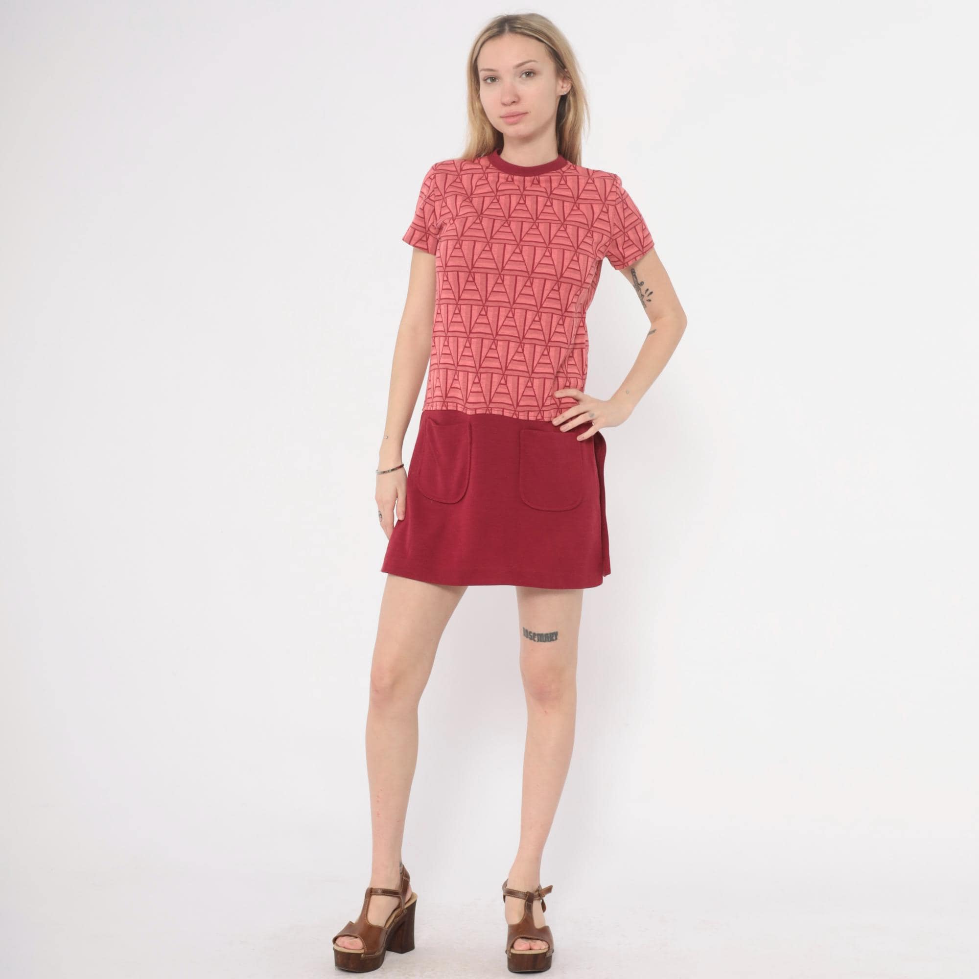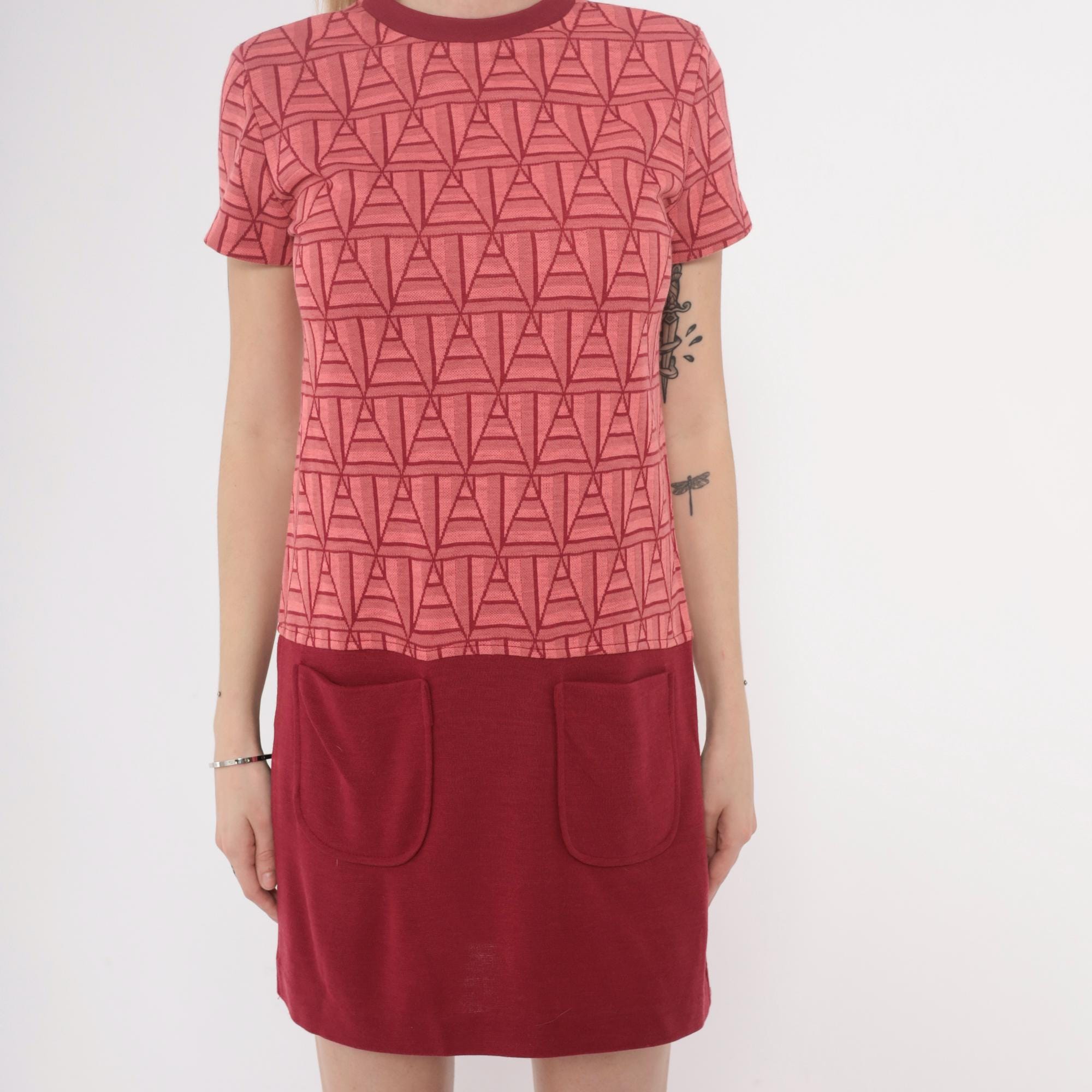 60s color-blocked shift dress in pink with burgundy geometric triangle print on bodice and solid wine-colored skirt section. Short sleeves with burgundy trim at neckline and sleeve edges. Two patch pockets on front of skirt.