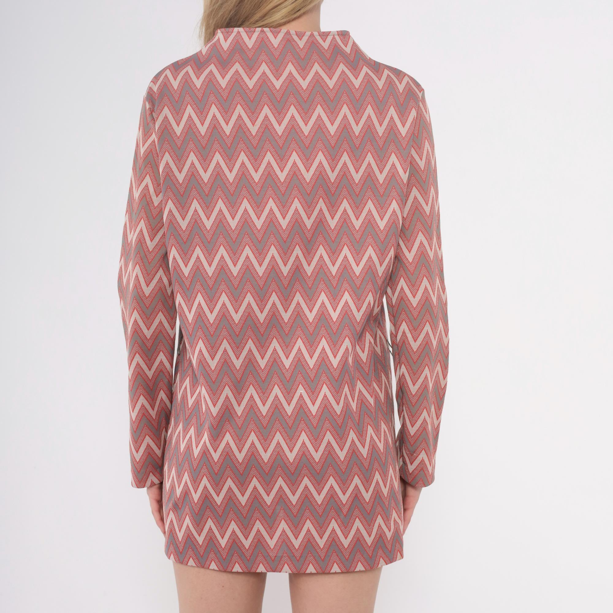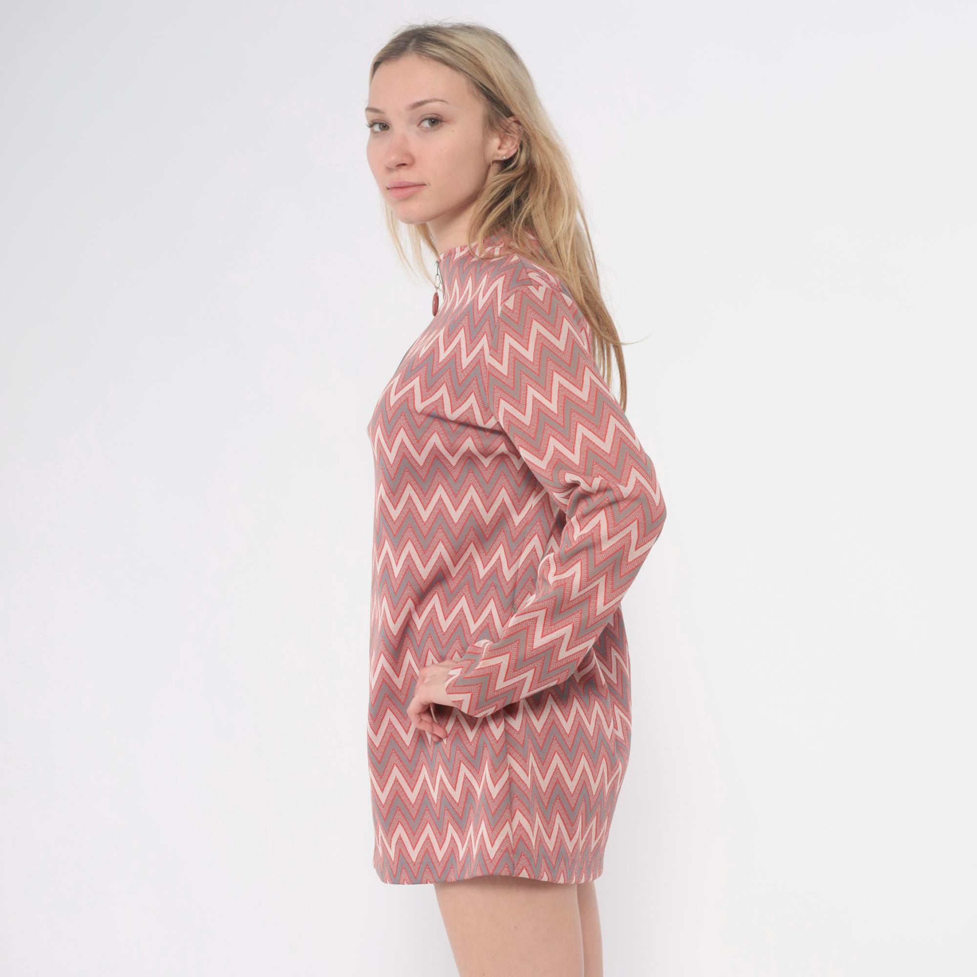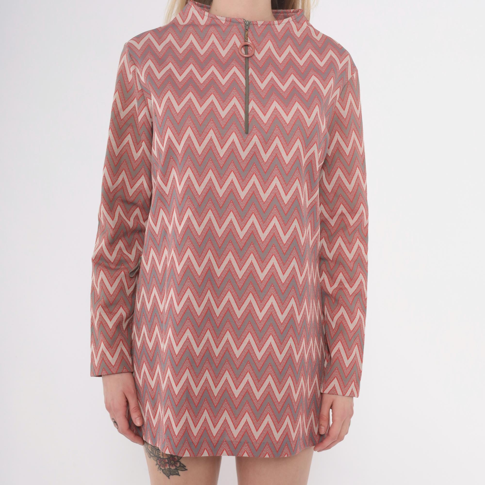 60s chevron print tunic dress with mock neck collar and back zip closure with ring pull. Pink, mauve, gray, and cream zigzag pattern across the fabric. Long sleeves, straight silhouette, mini length.