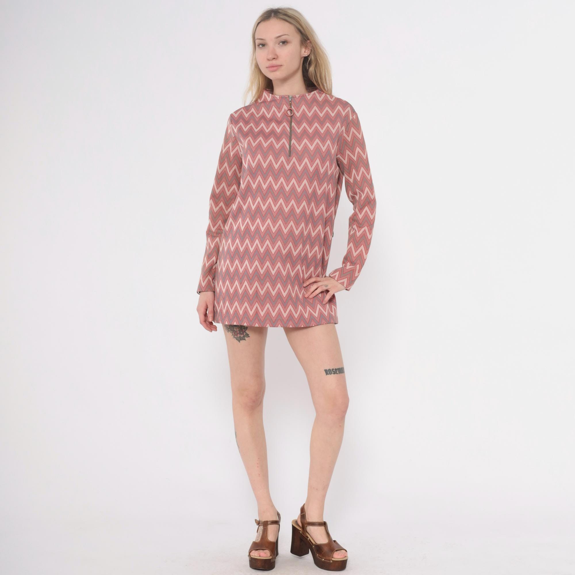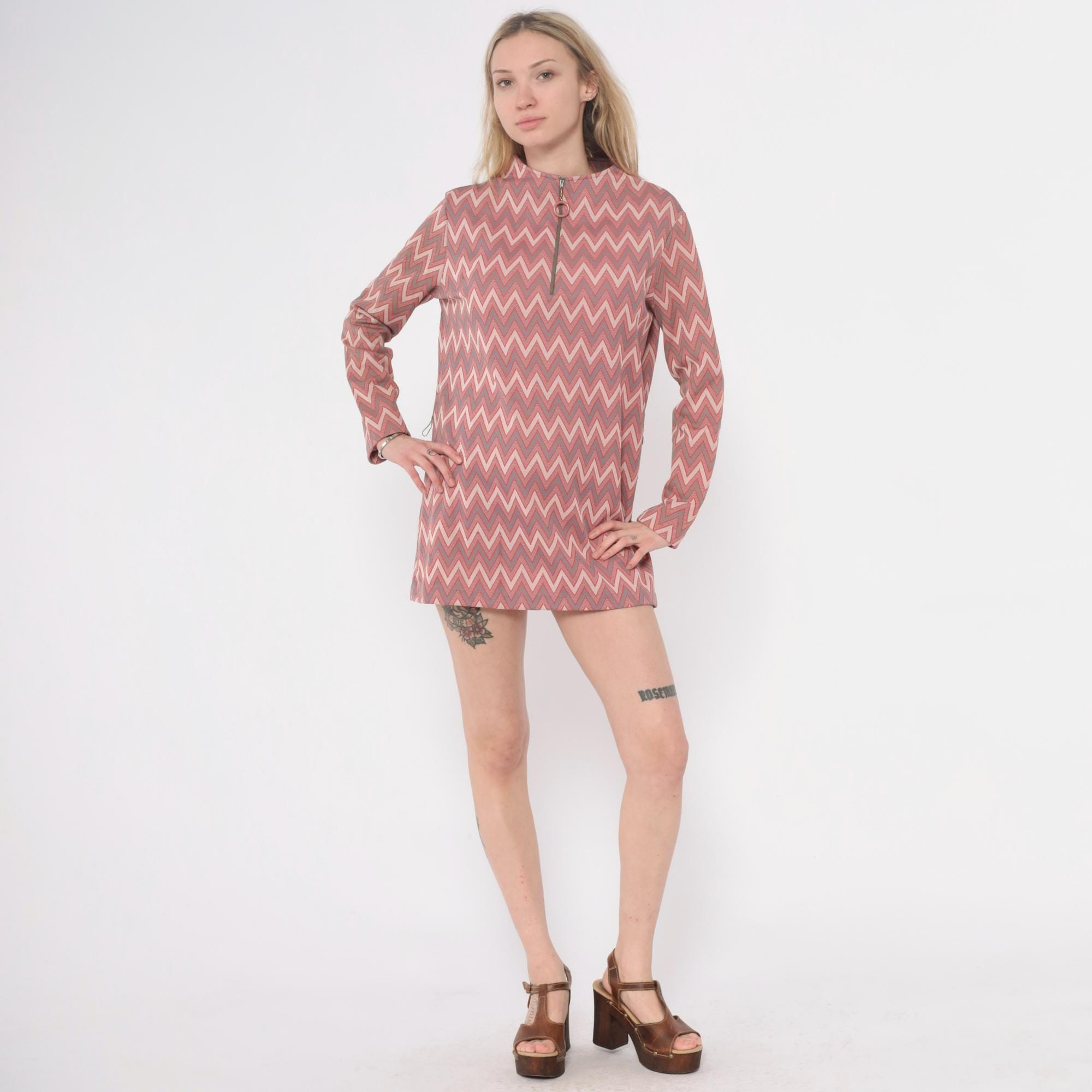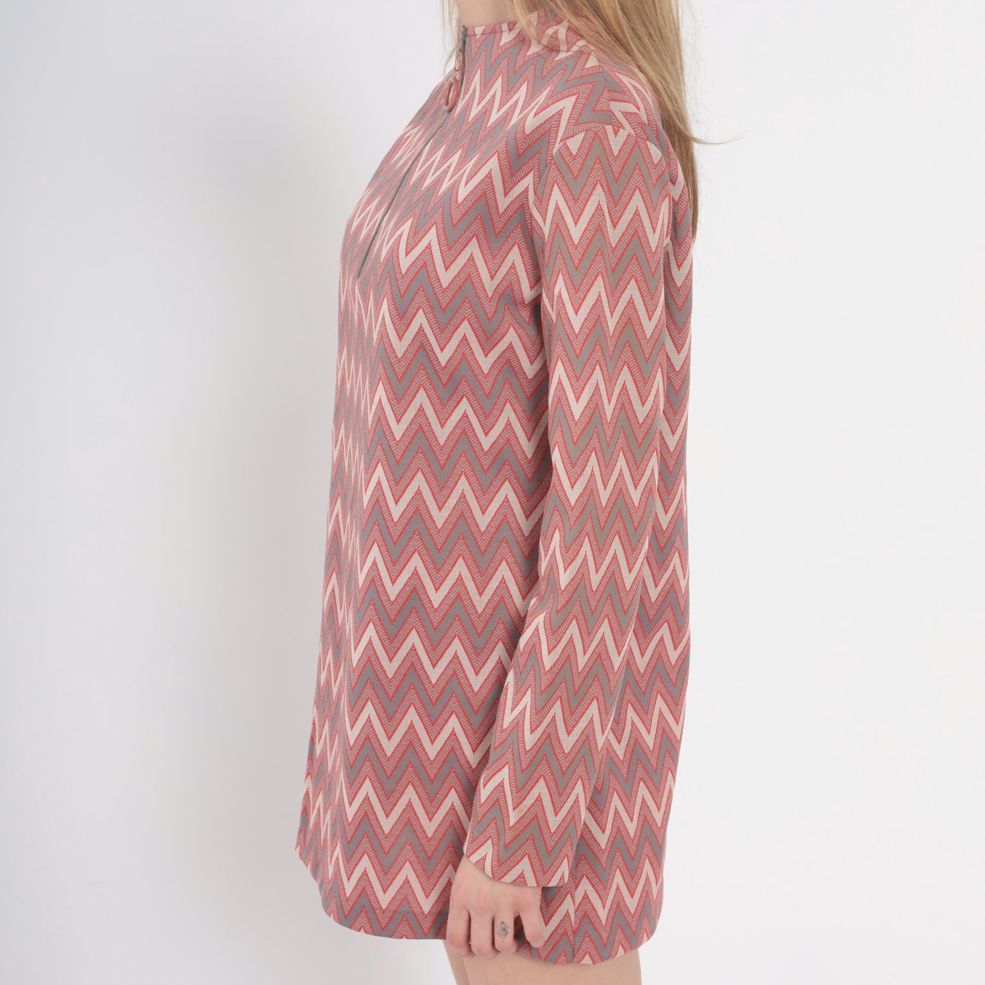 60s chevron print tunic dress with mock neck collar and back zip closure with ring pull. Pink, mauve, gray, and cream zigzag pattern across the fabric. Long sleeves, straight silhouette, mini length.