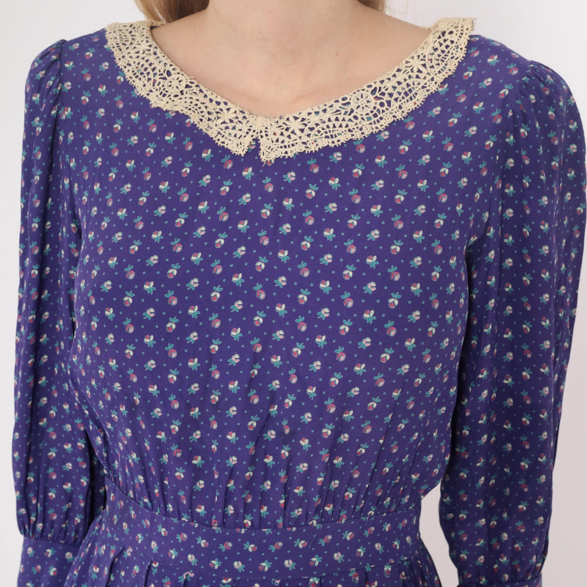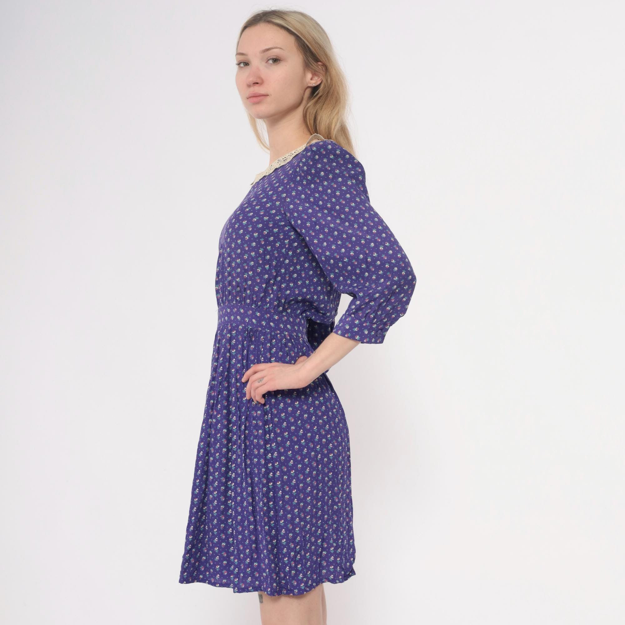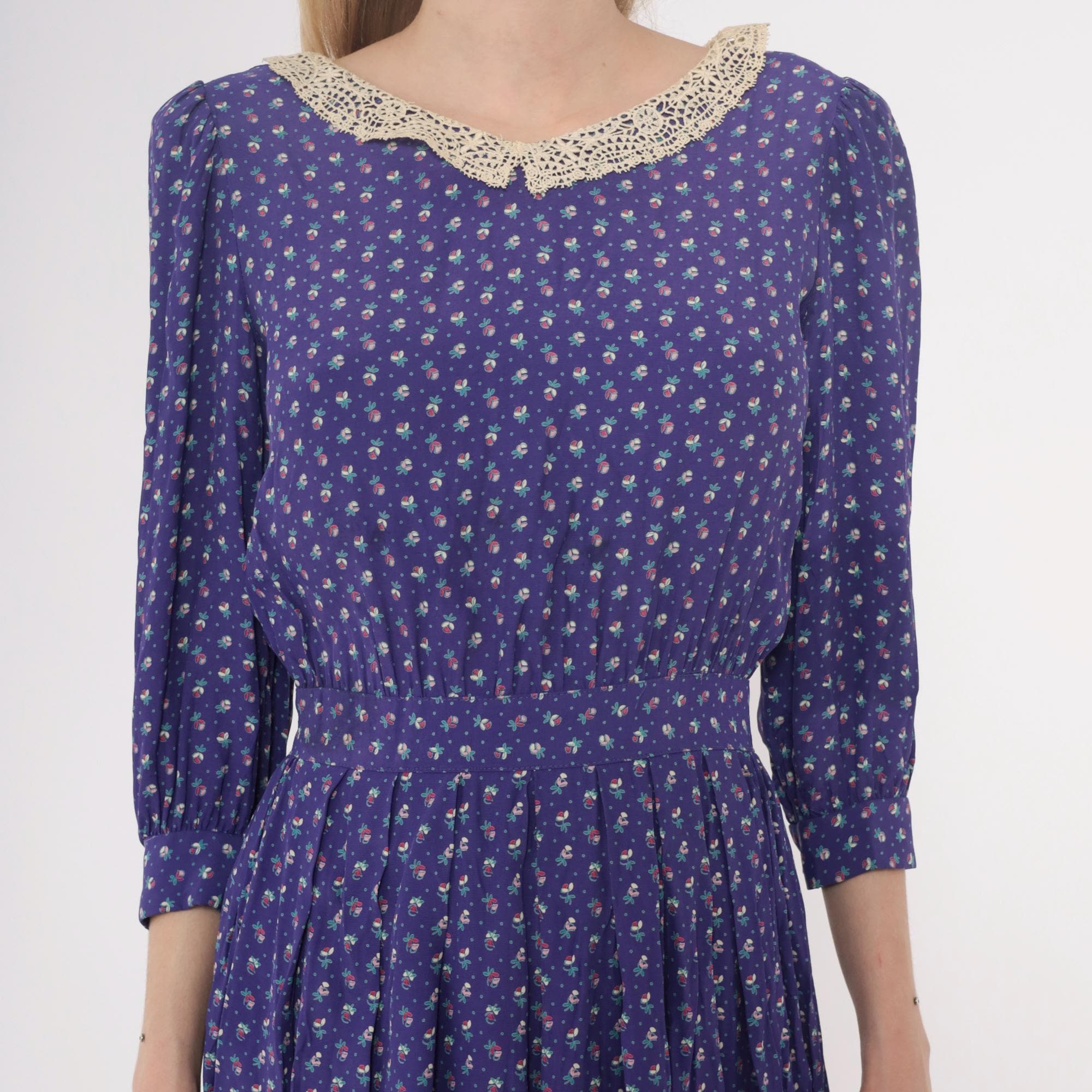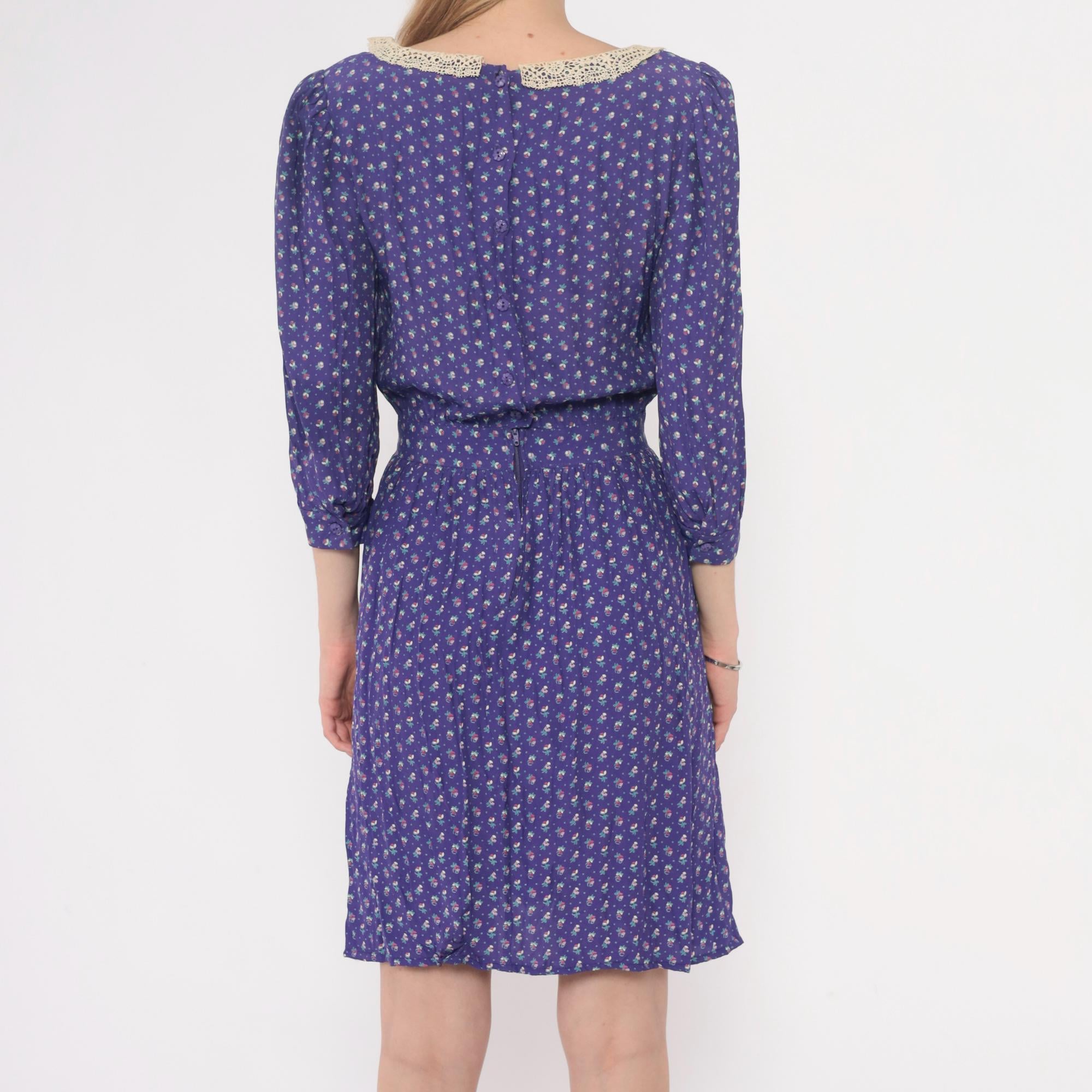 80s purple floral dress from cassidy with cream crochet lace Peter Pan collar and small flowers across the fabric in pink, blue, yellow, and green. Fitted elastic waist with gathered skirt, three-quarter length sleeves with elastic cuffs, knee-length hem.