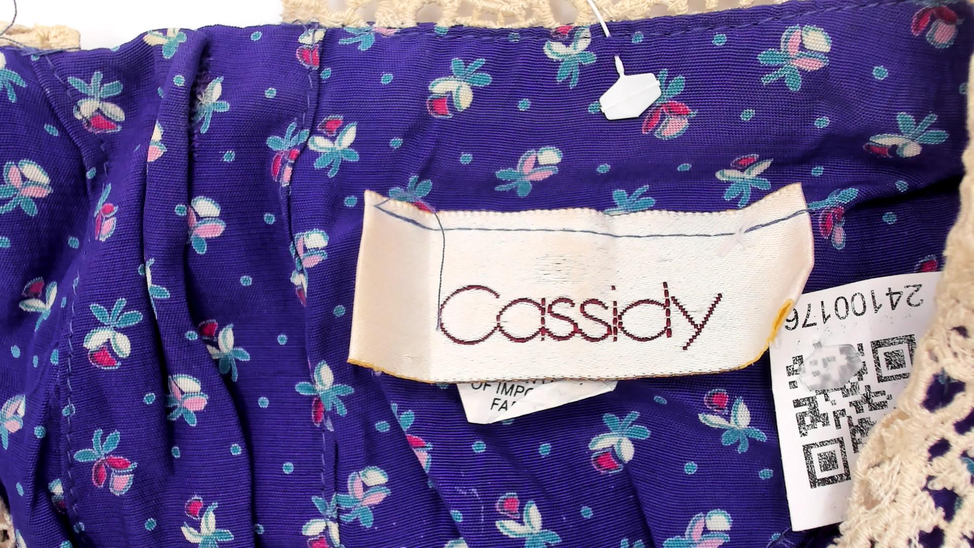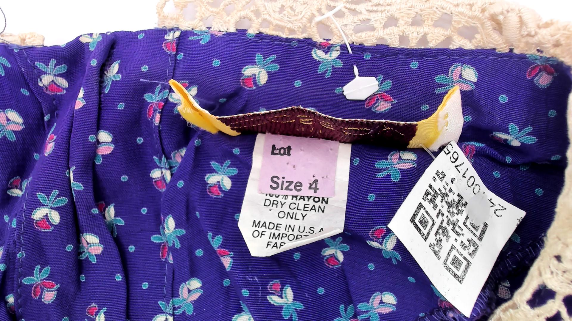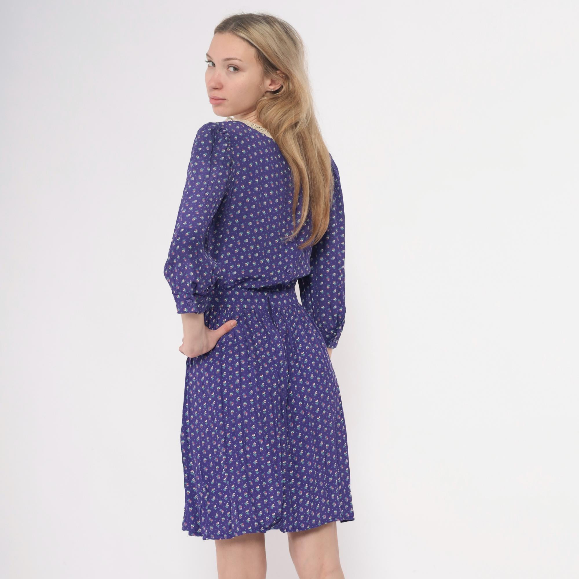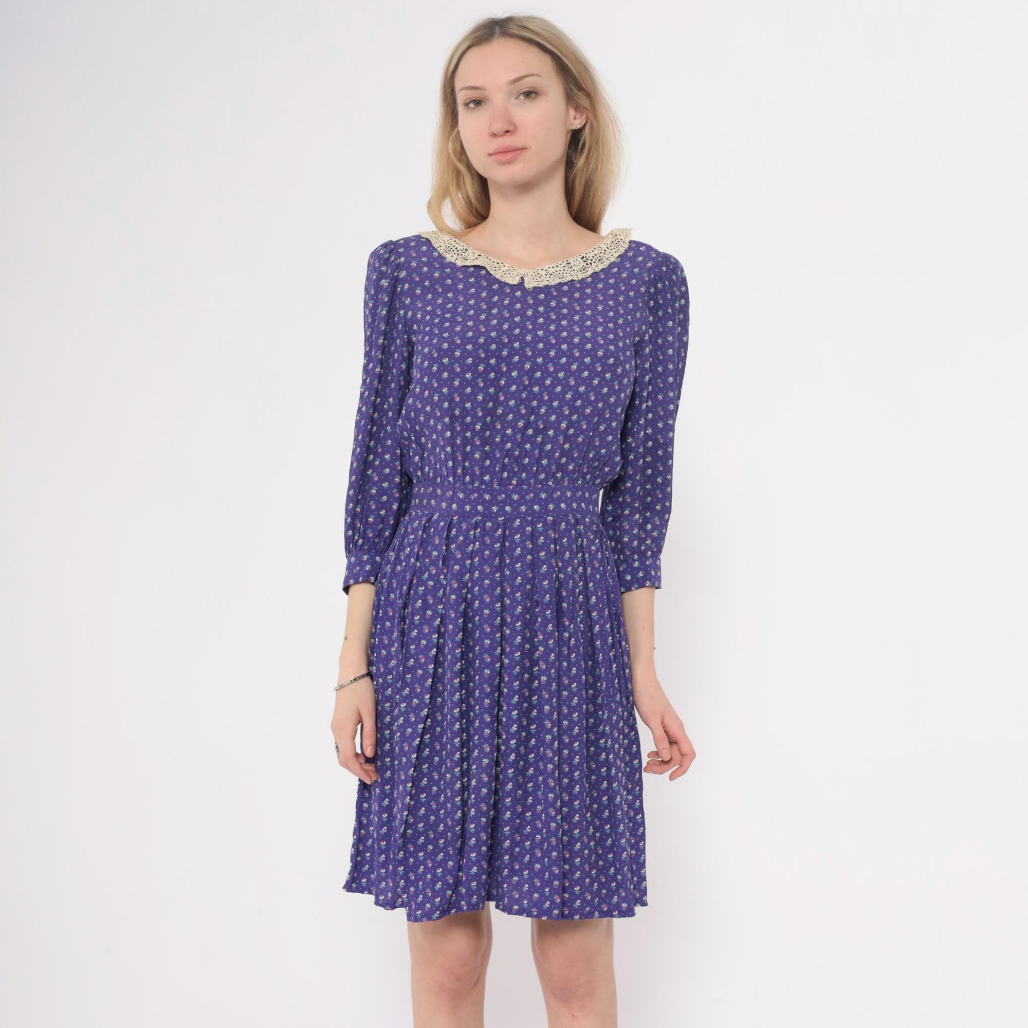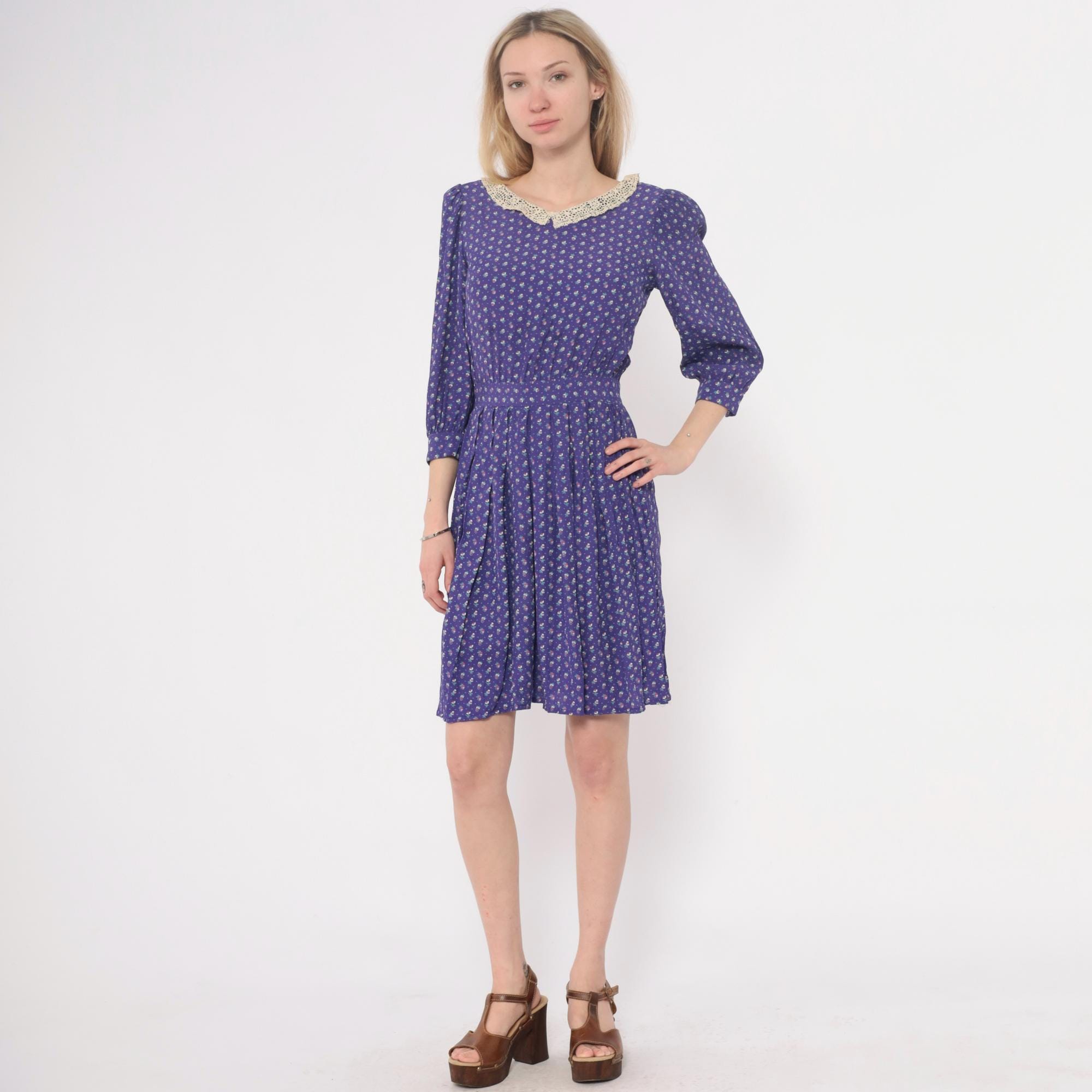 80s purple floral dress from cassidy with cream crochet lace Peter Pan collar and small flowers across the fabric in pink, blue, yellow, and green. Fitted elastic waist with gathered skirt, three-quarter length sleeves with elastic cuffs, knee-length hem.