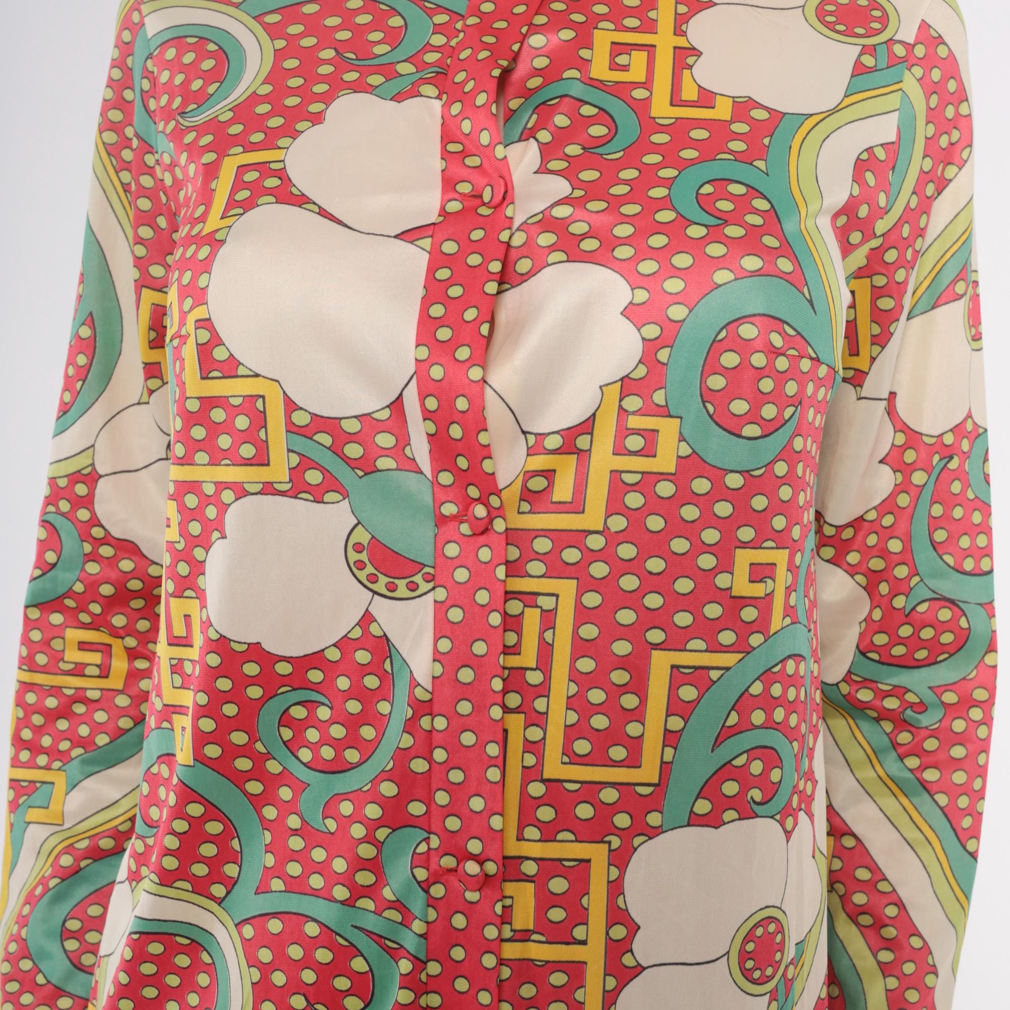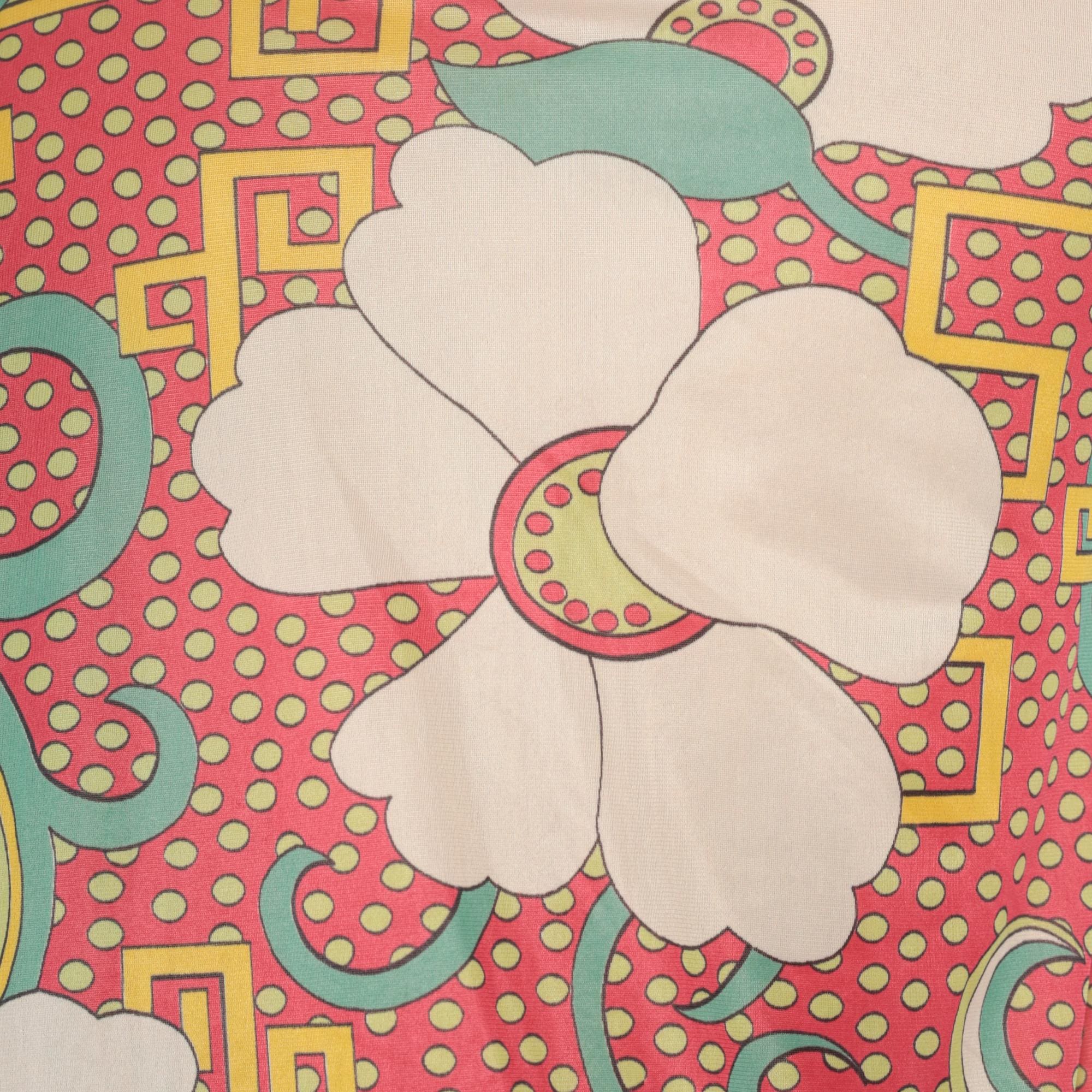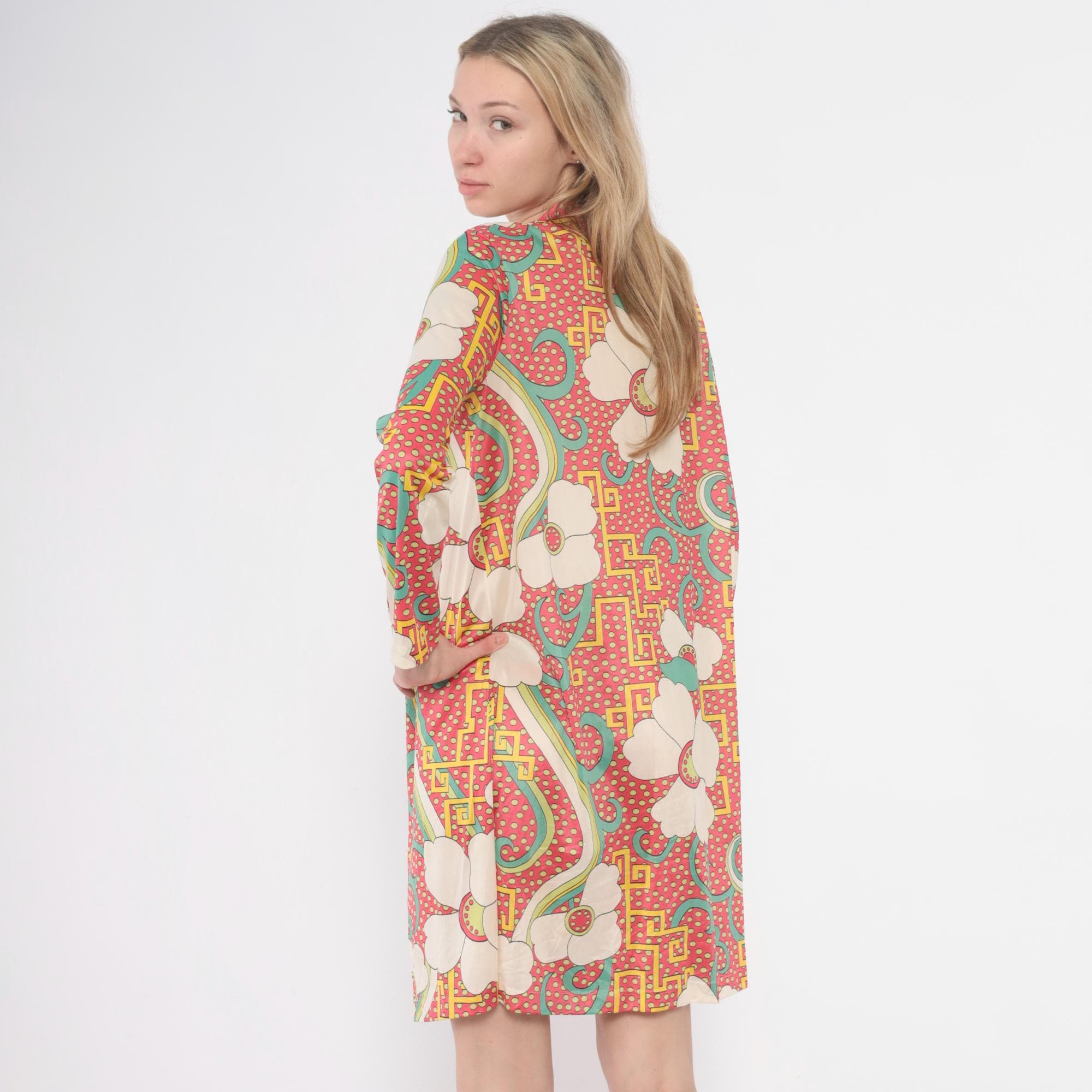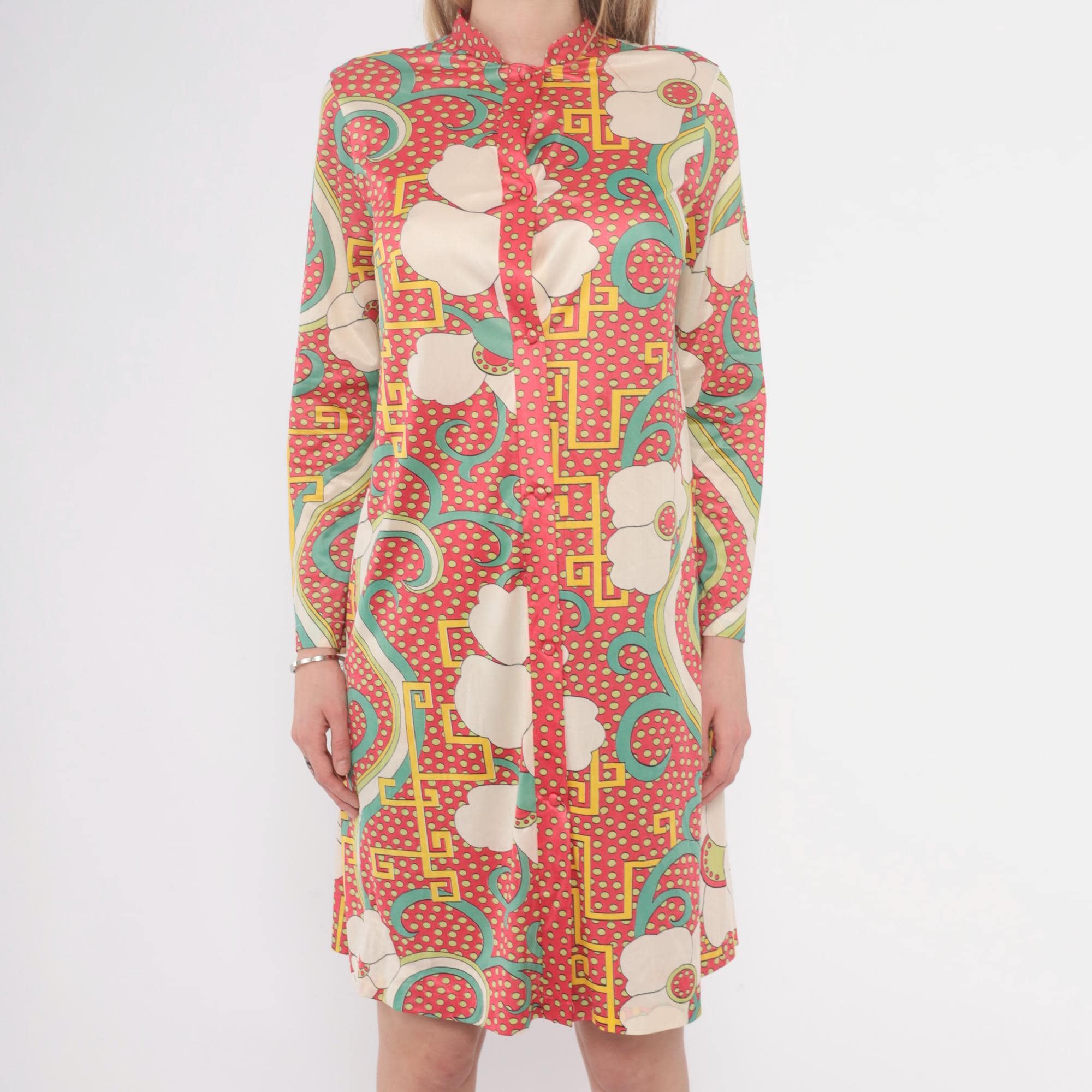 70s psychedelic print dress in coral pink with yellow polka dots, large cream abstract flowers, turquoise curved shapes, and yellow geometric Greek key patterns across the fabric. Pointed collar, long sleeves, and knee-length hemline.