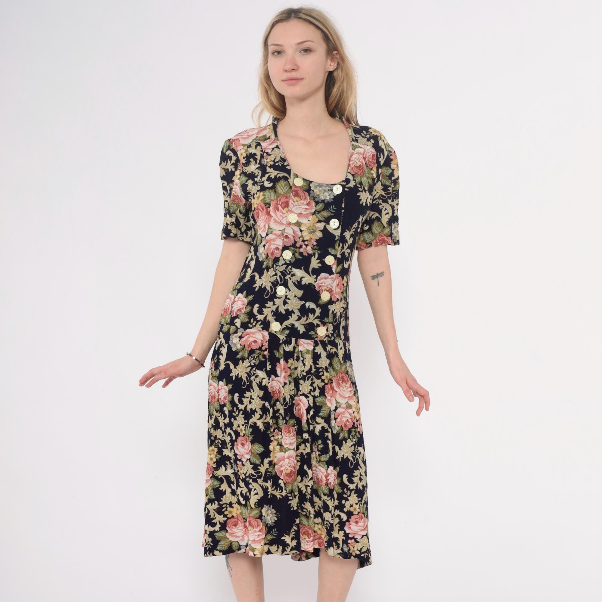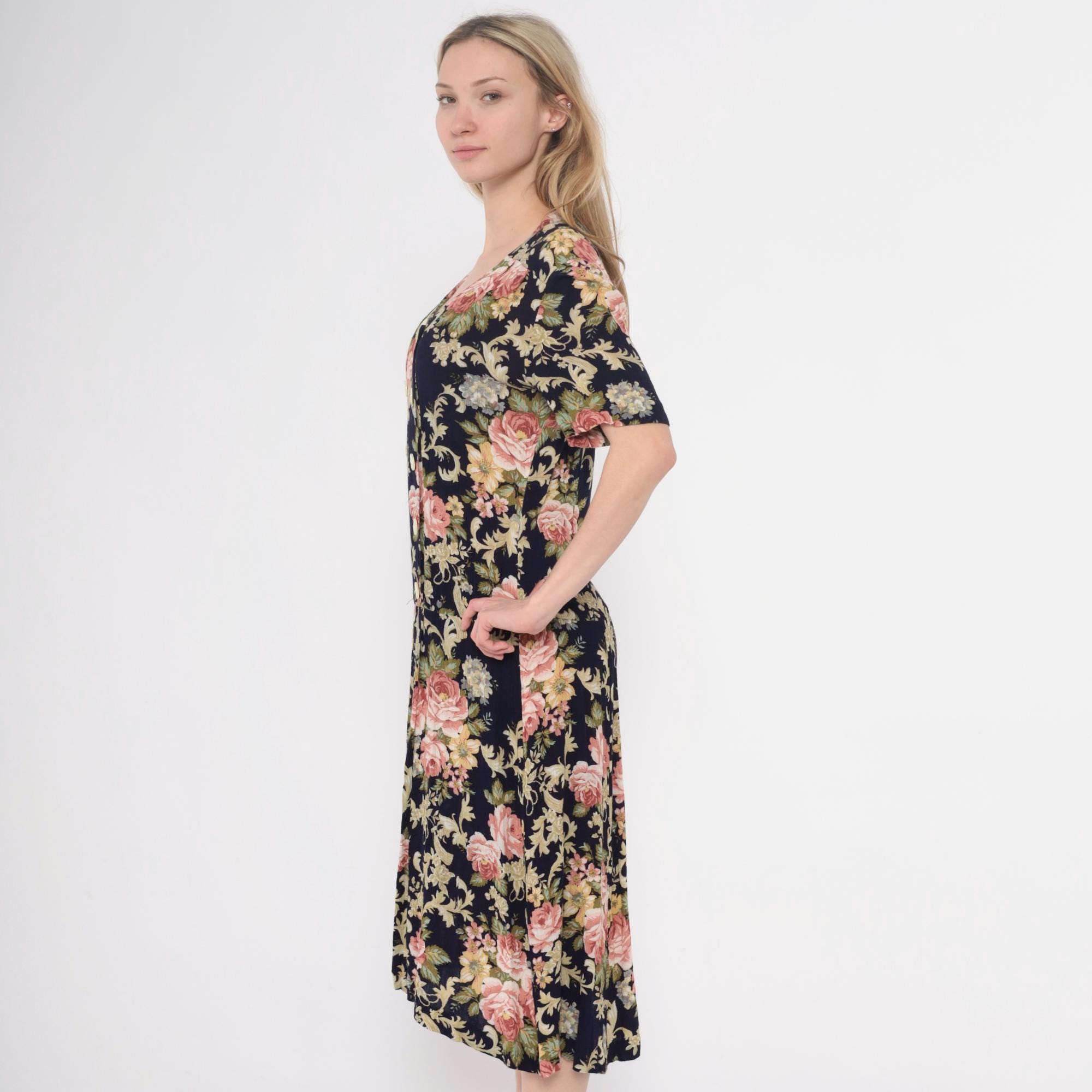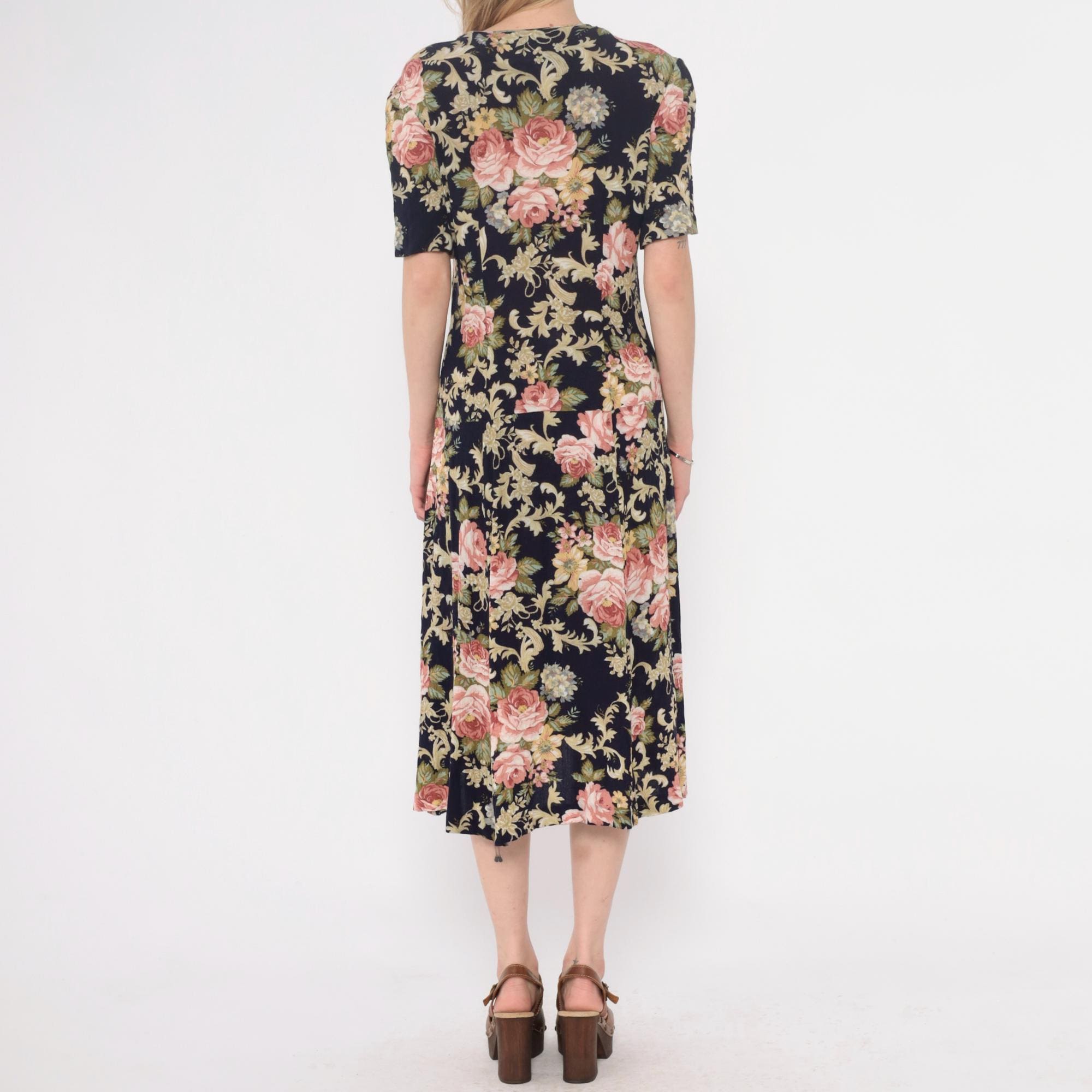 90s black floral midi dress from Leslie Fay with pink roses, yellow blooms, and beige scrollwork across the fabric. Scoop neckline with button front closure, short sleeves, gathered waist with fitted bodice.