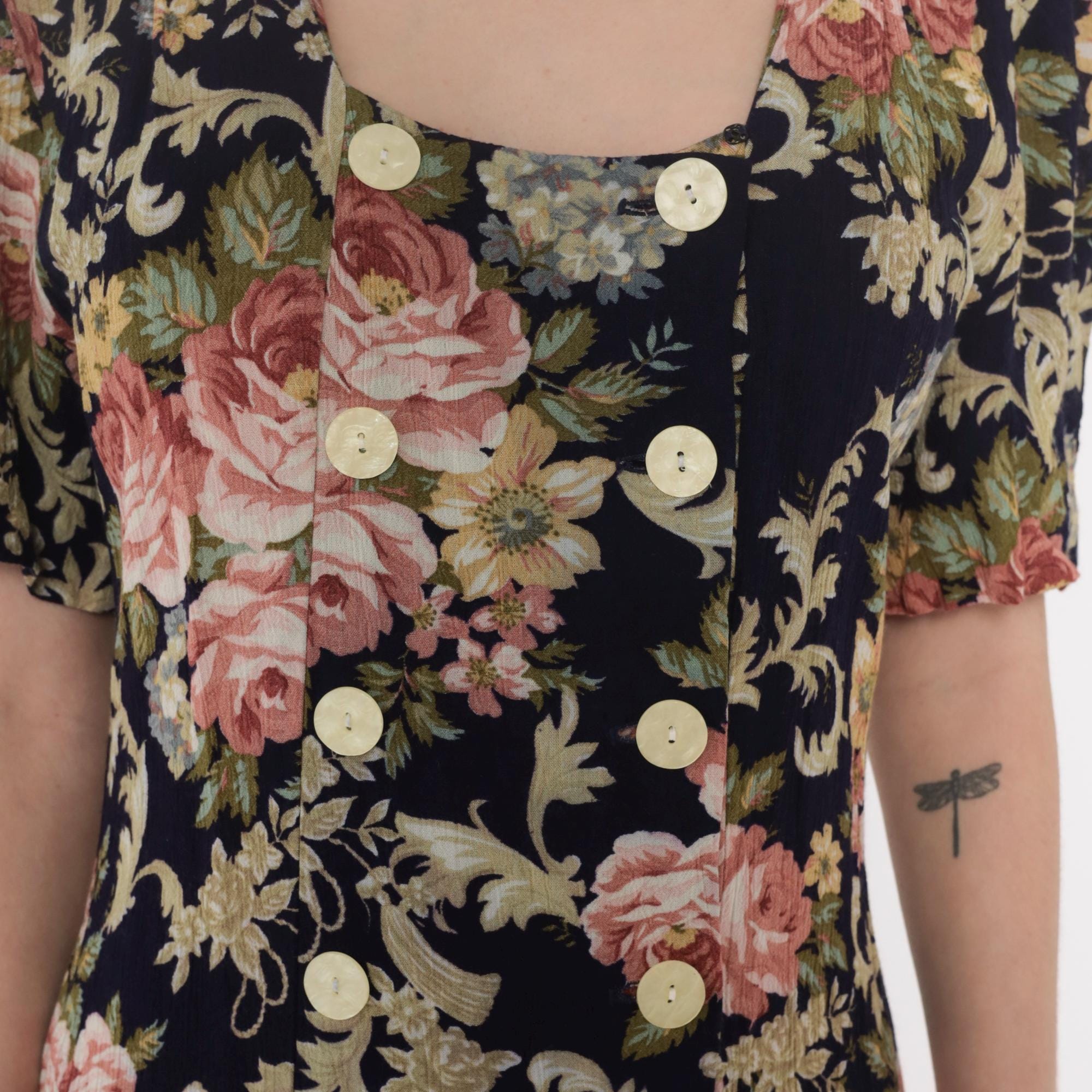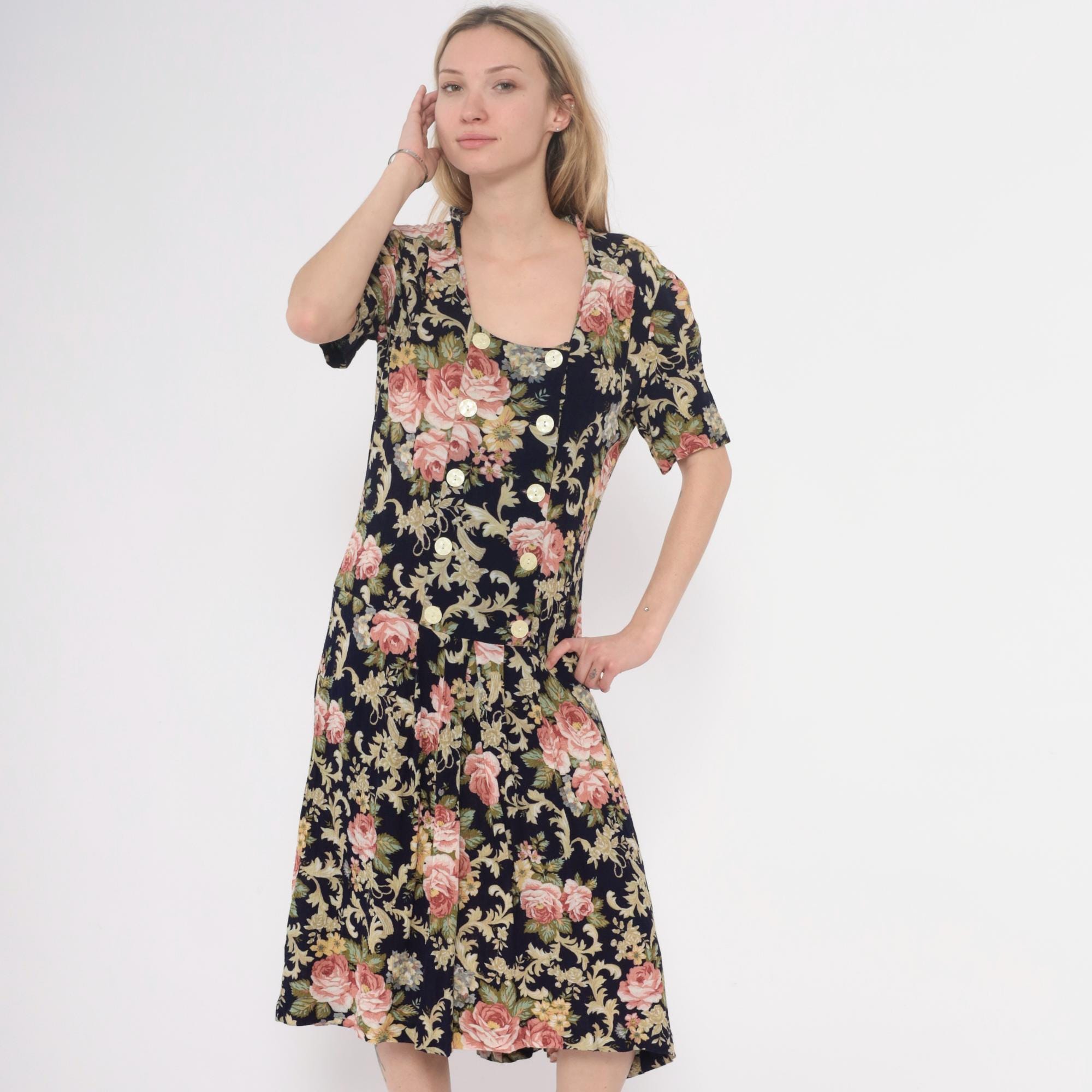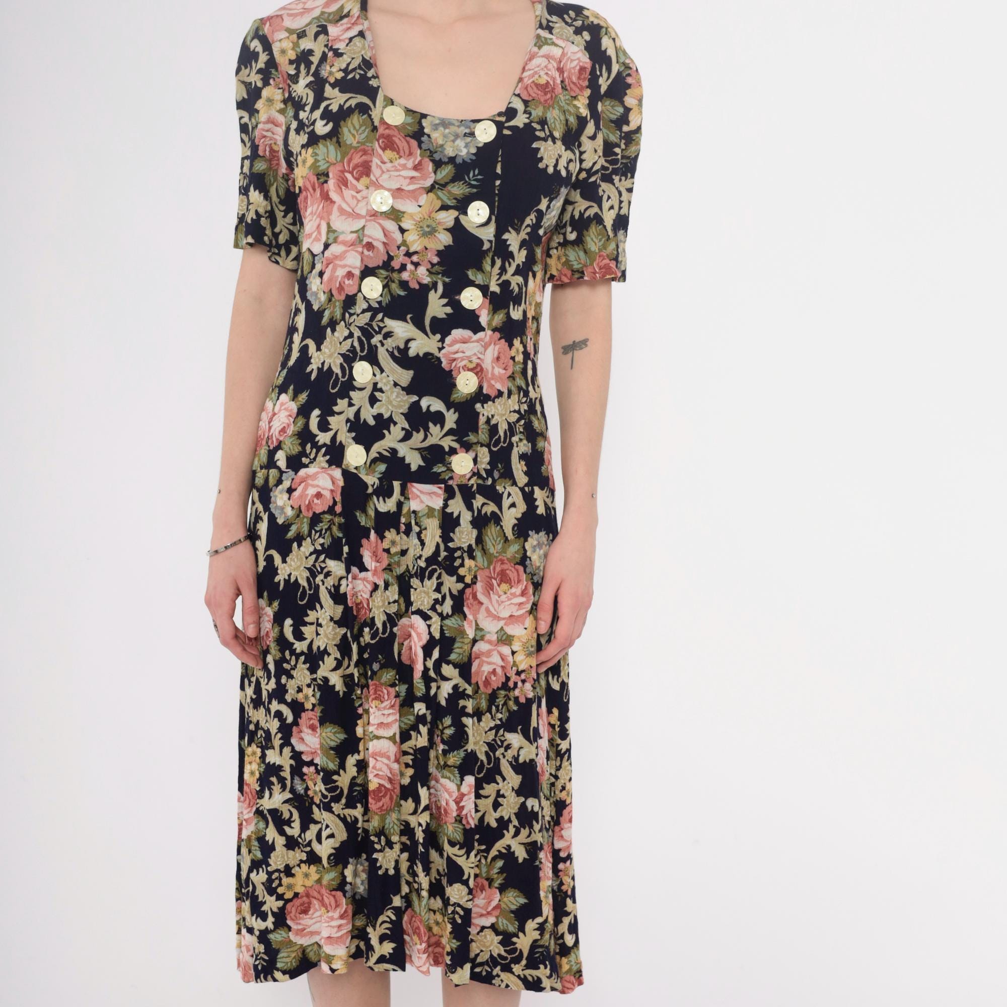 90s black floral midi dress from Leslie Fay with pink roses, yellow blooms, and beige scrollwork across the fabric. Scoop neckline with button front closure, short sleeves, gathered waist with fitted bodice.