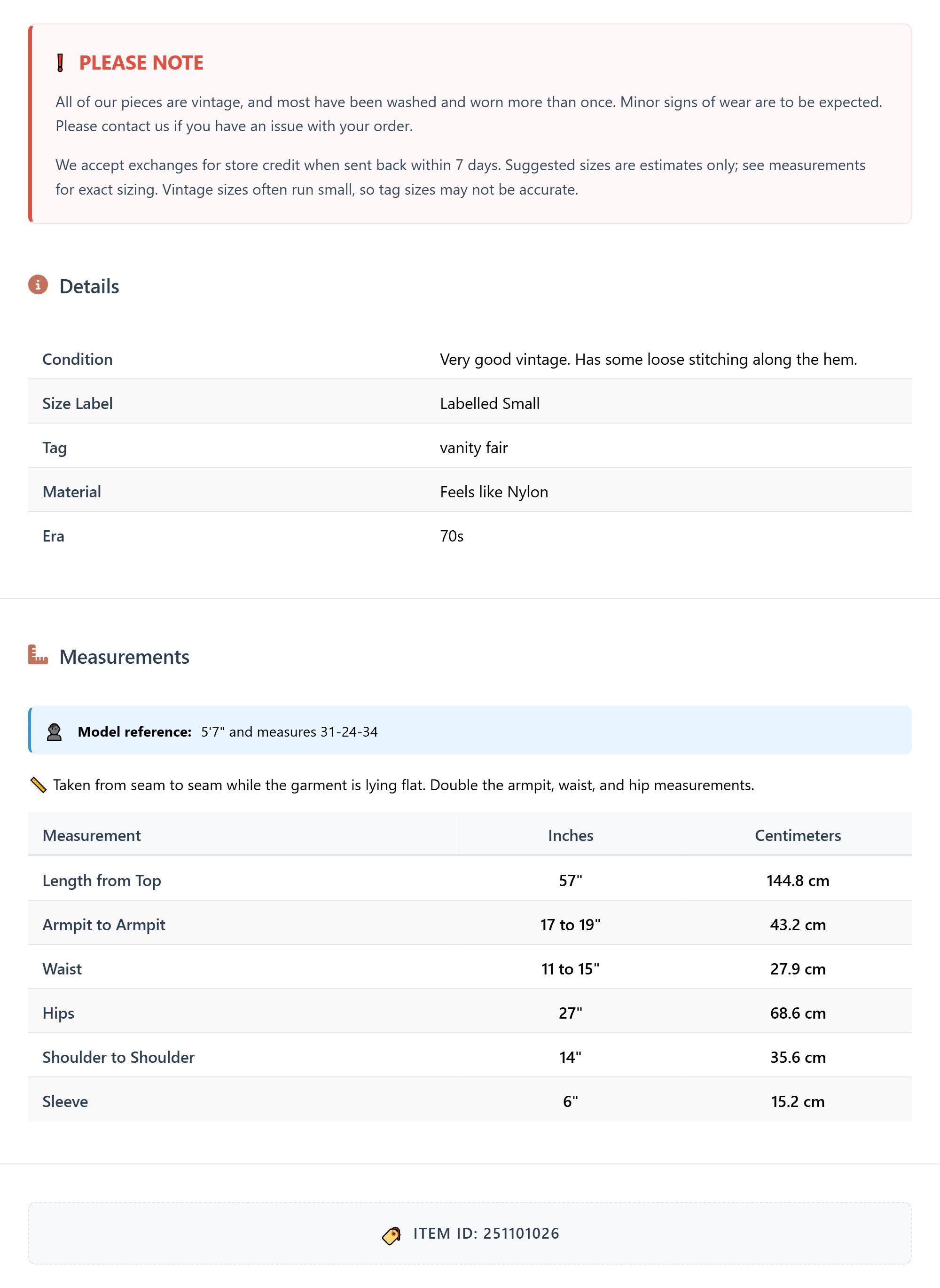 Condition: Very good vintage. Has some loose stitching along the hem.
